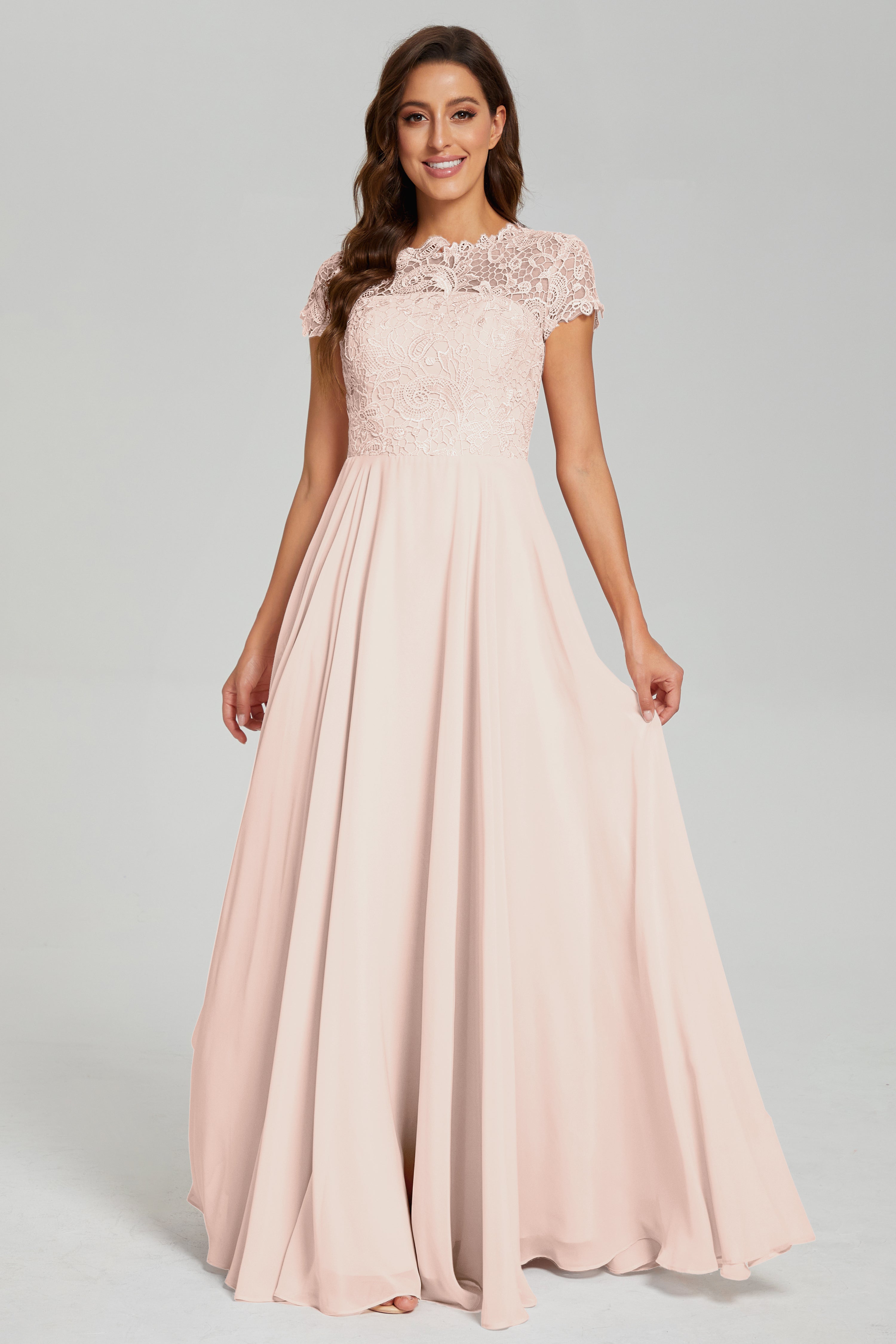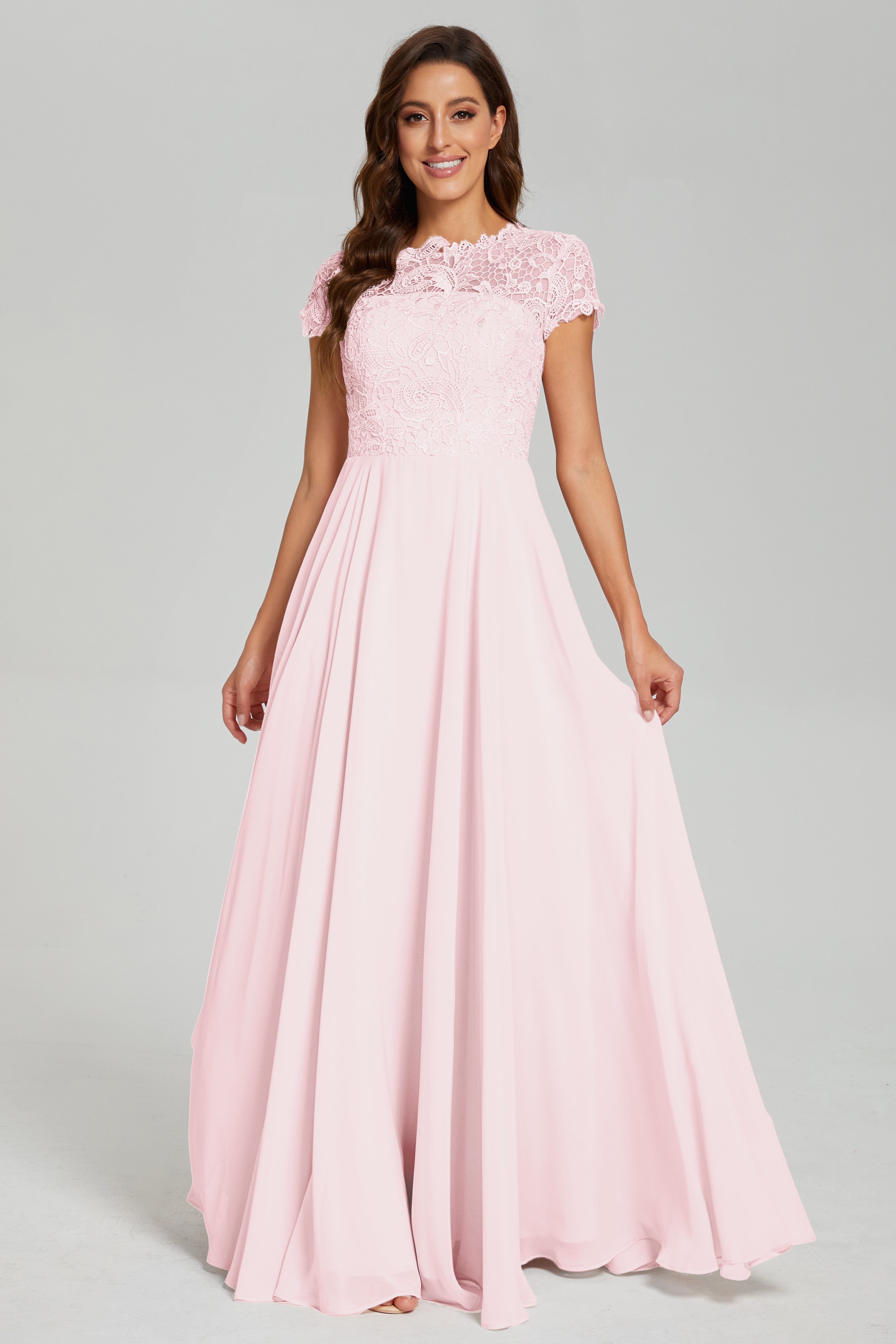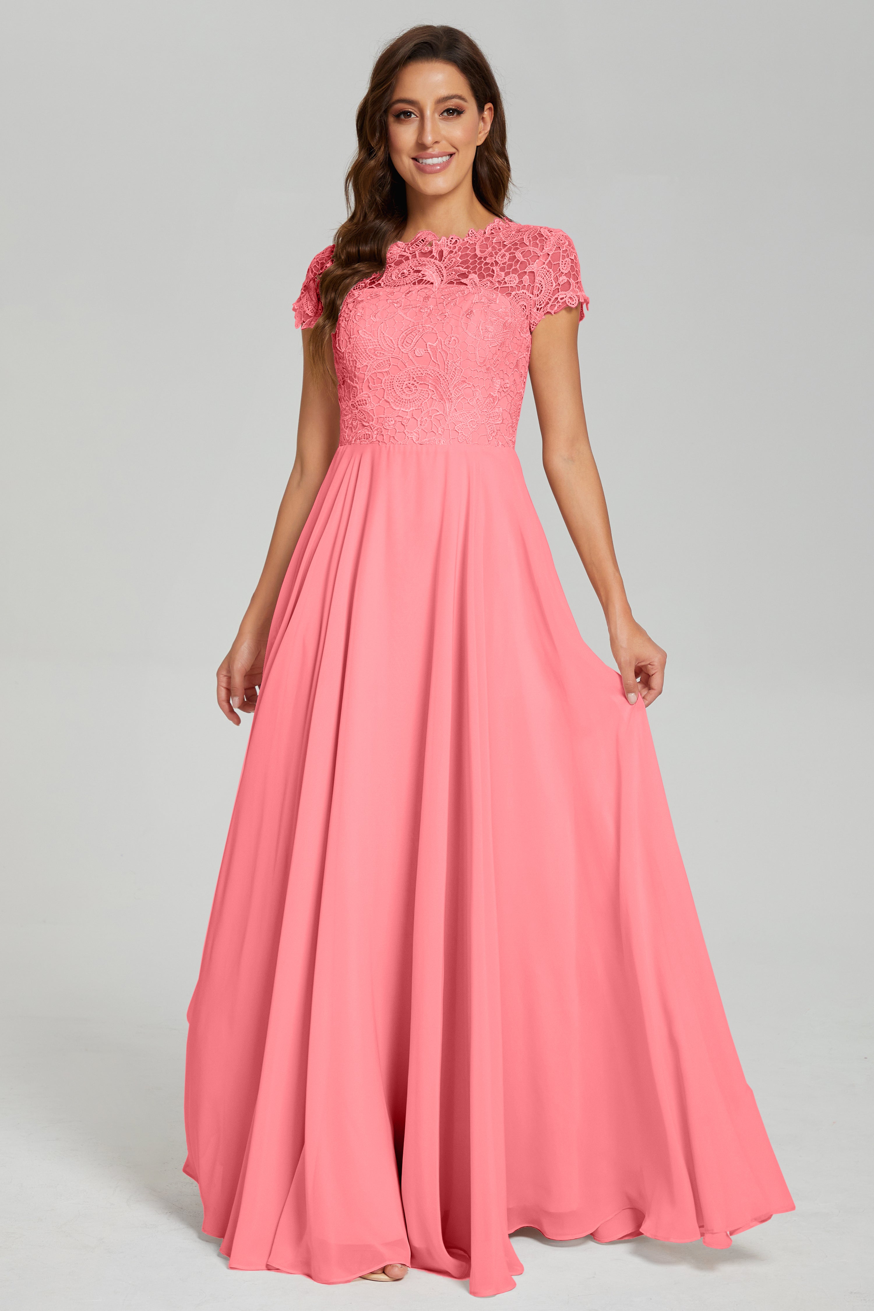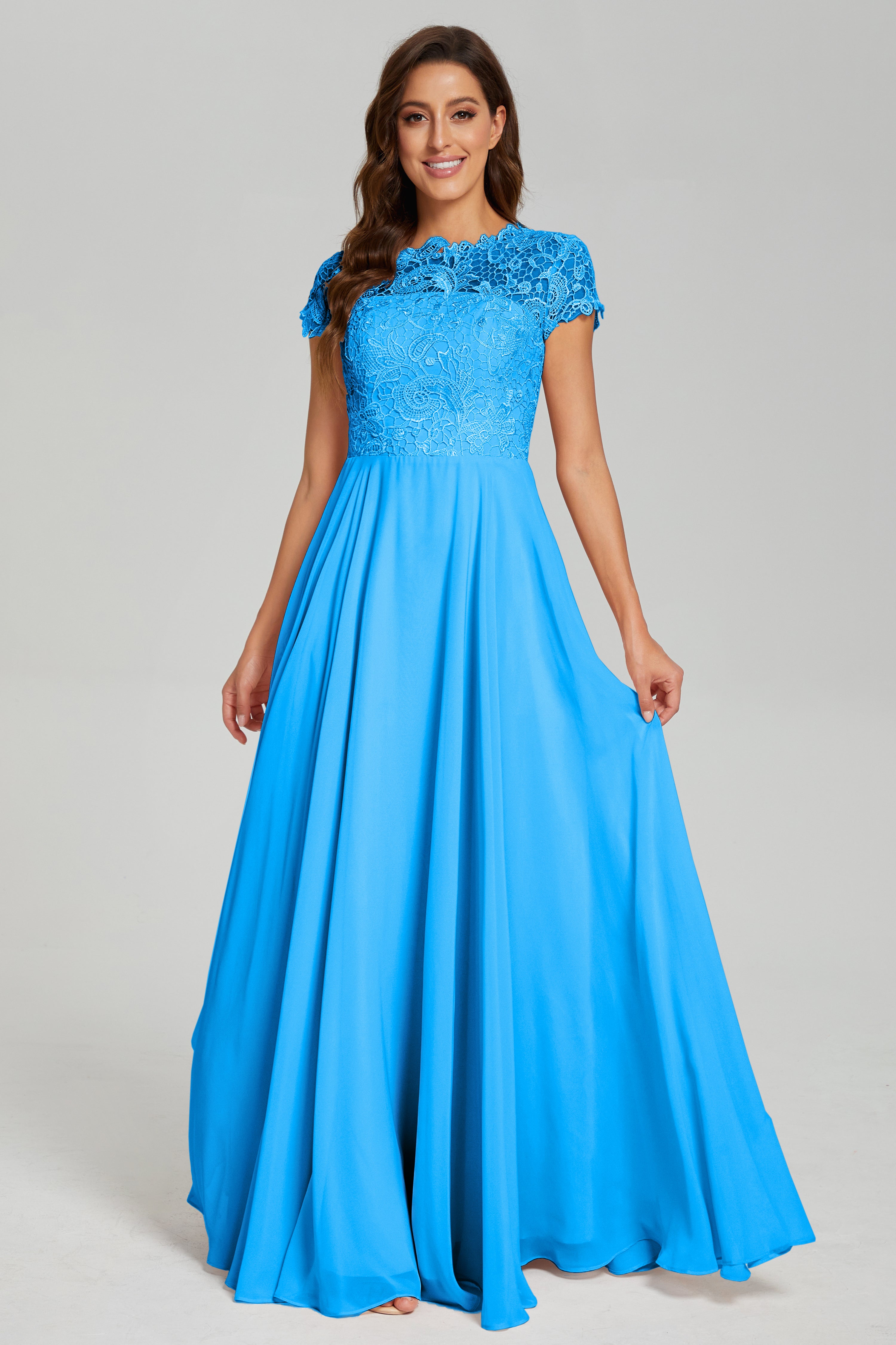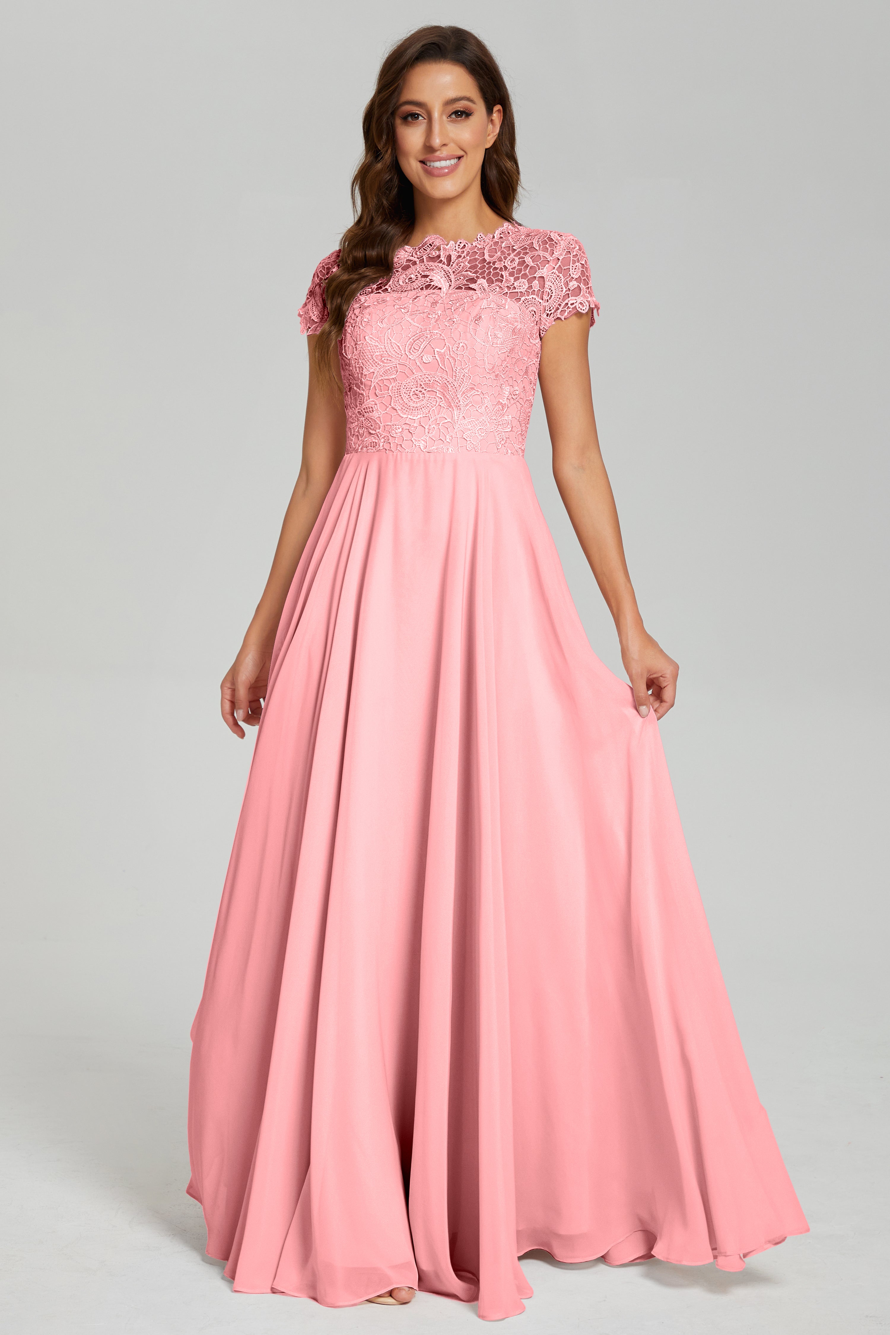 Short Sleeves Chiffon Lace Prom Dresses with Pockets