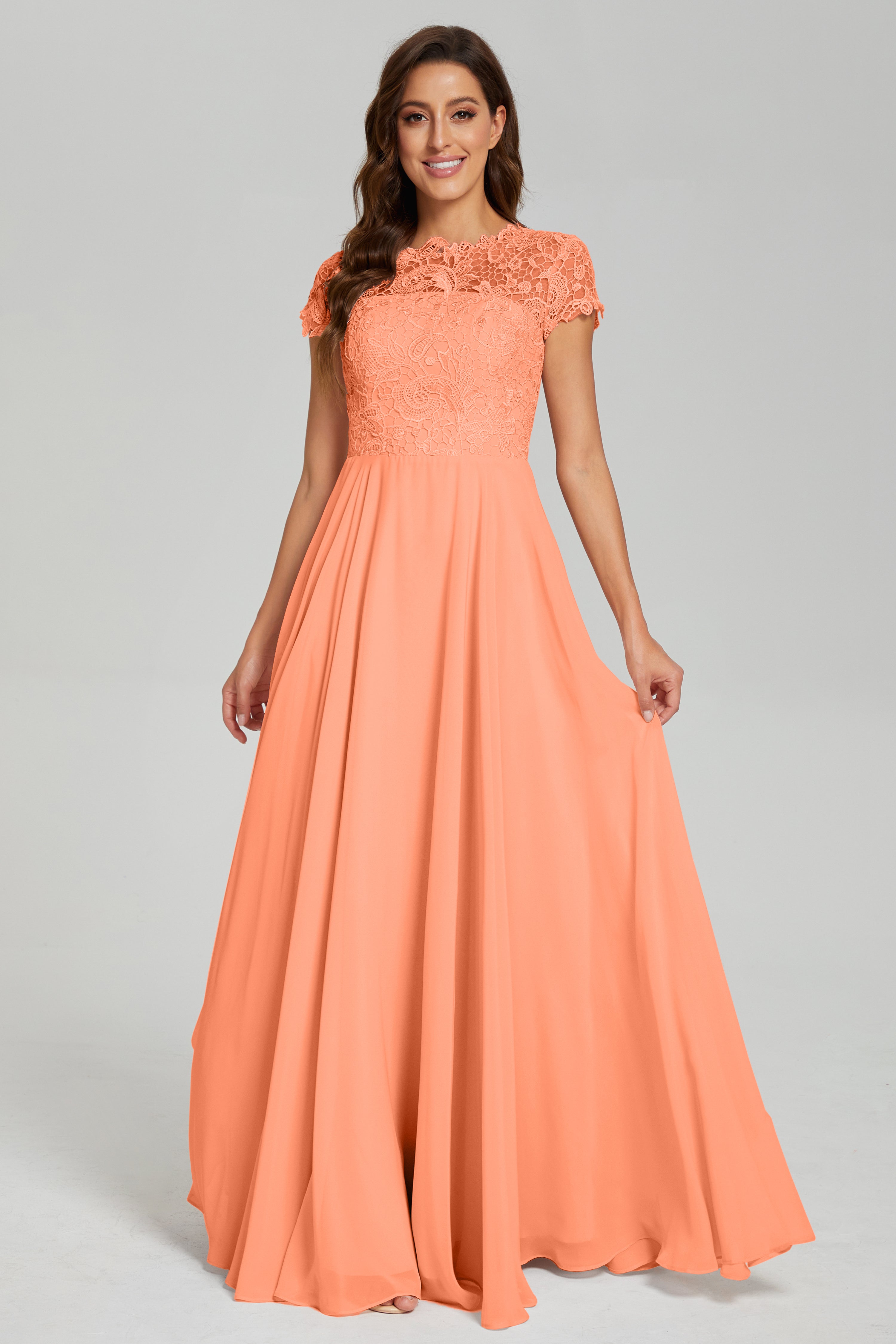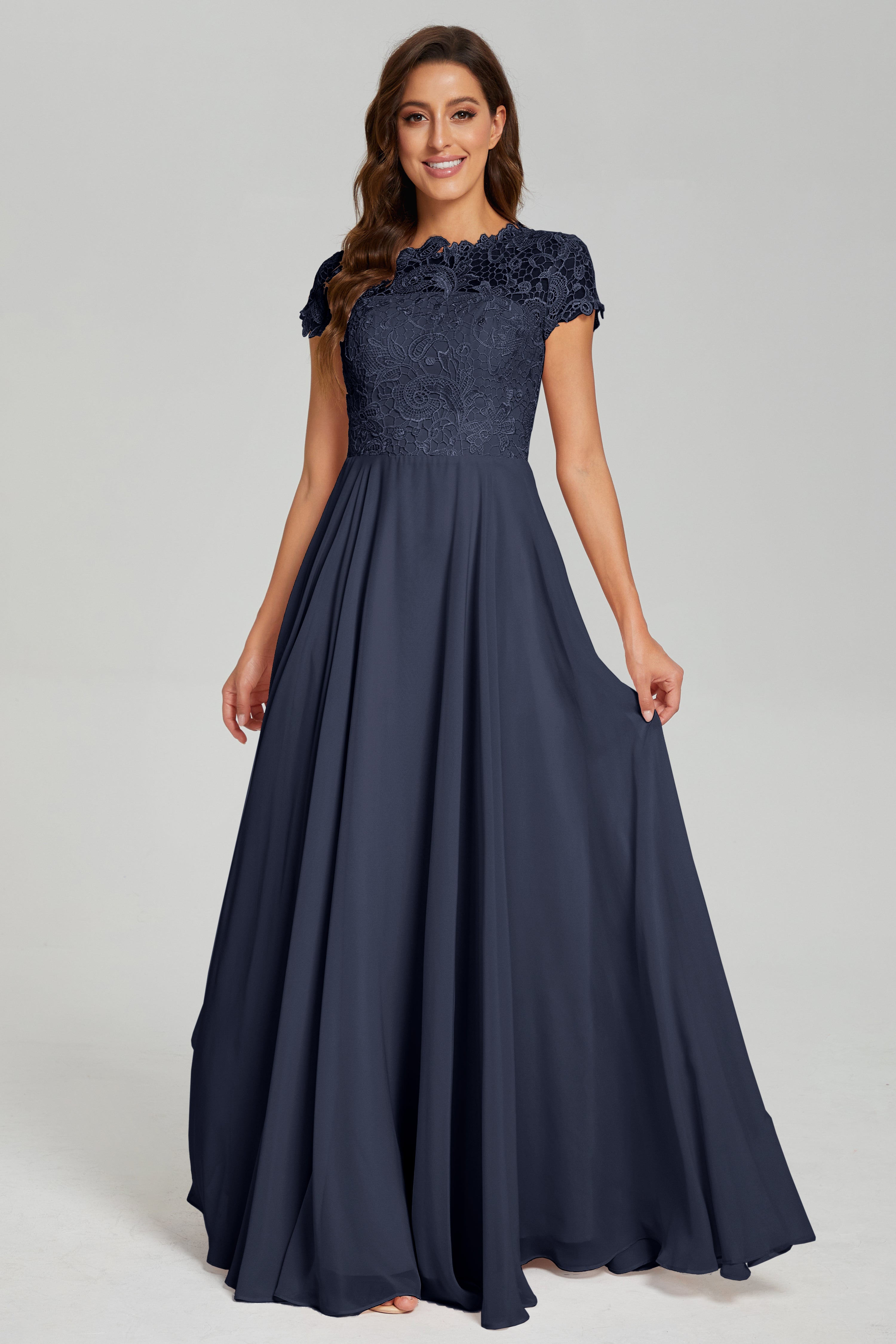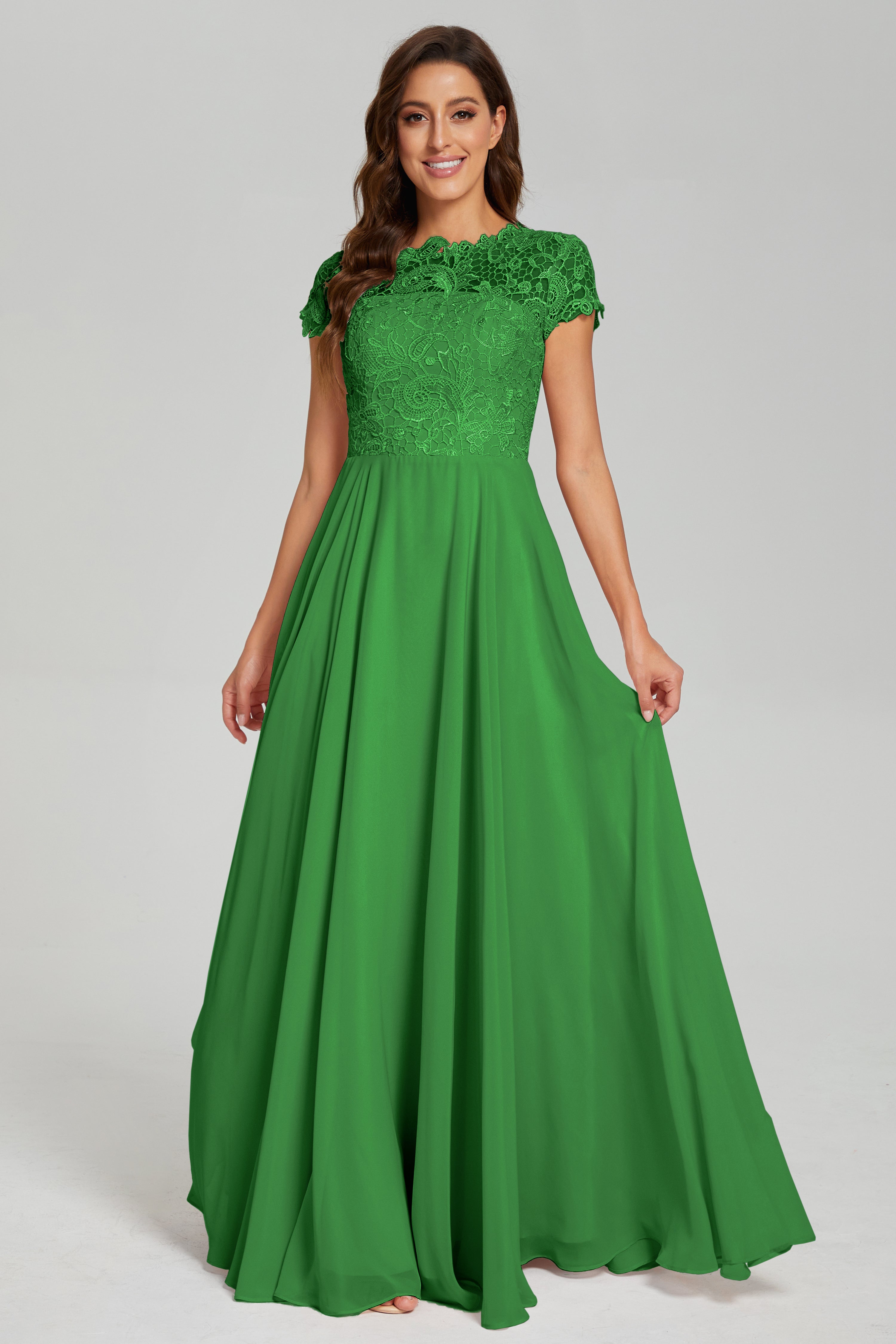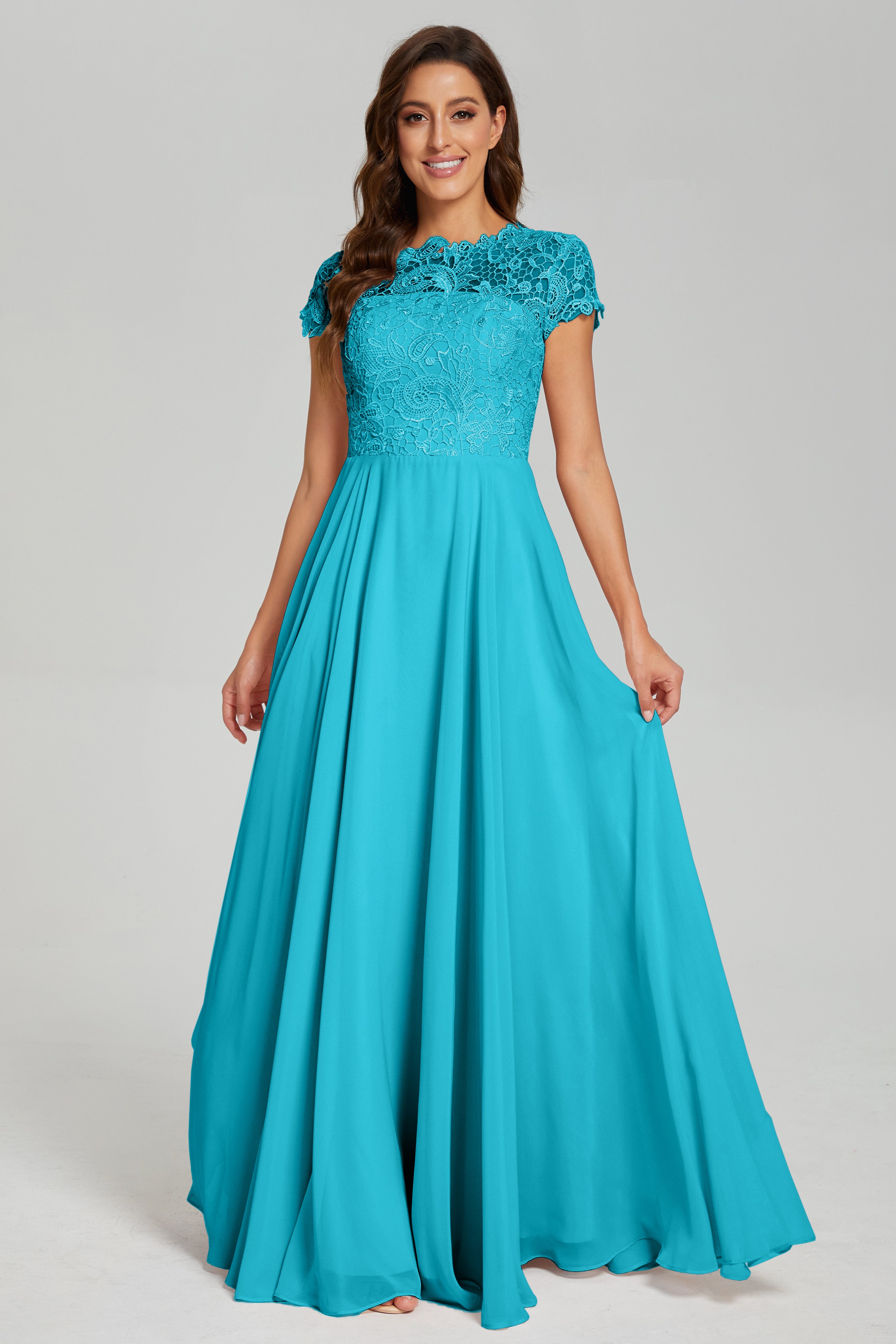 Short Sleeves Chiffon Lace Prom Dresses with Pockets