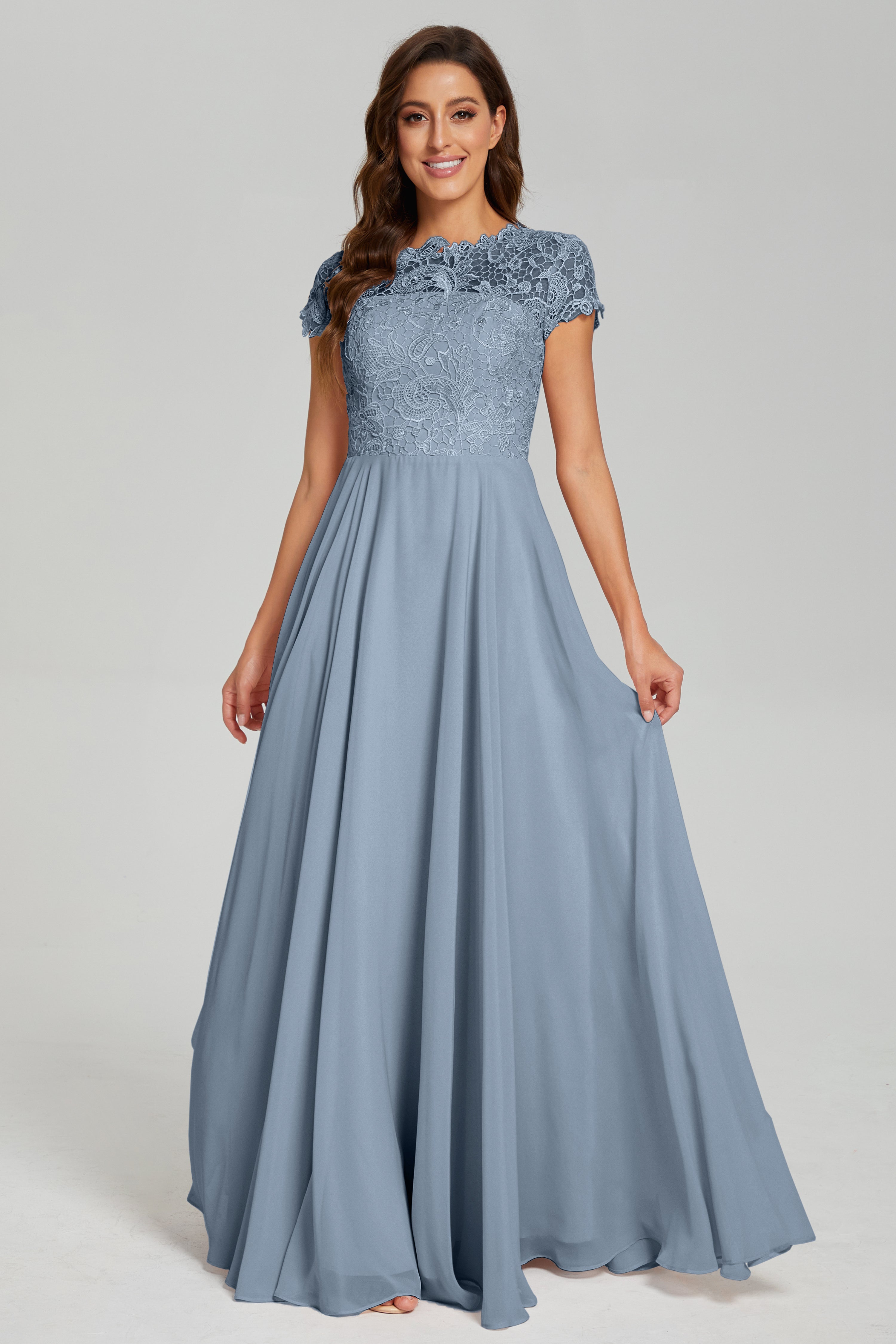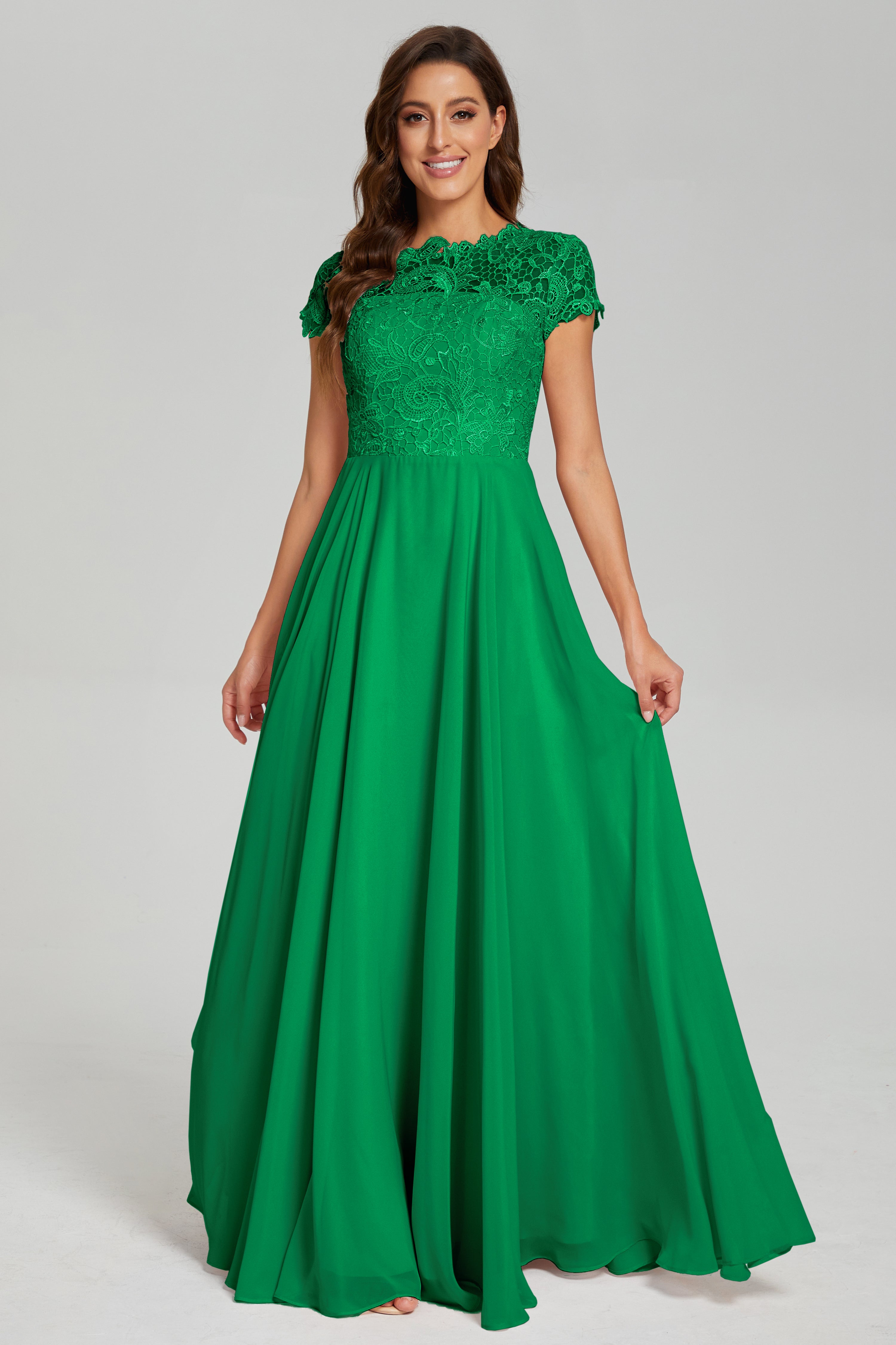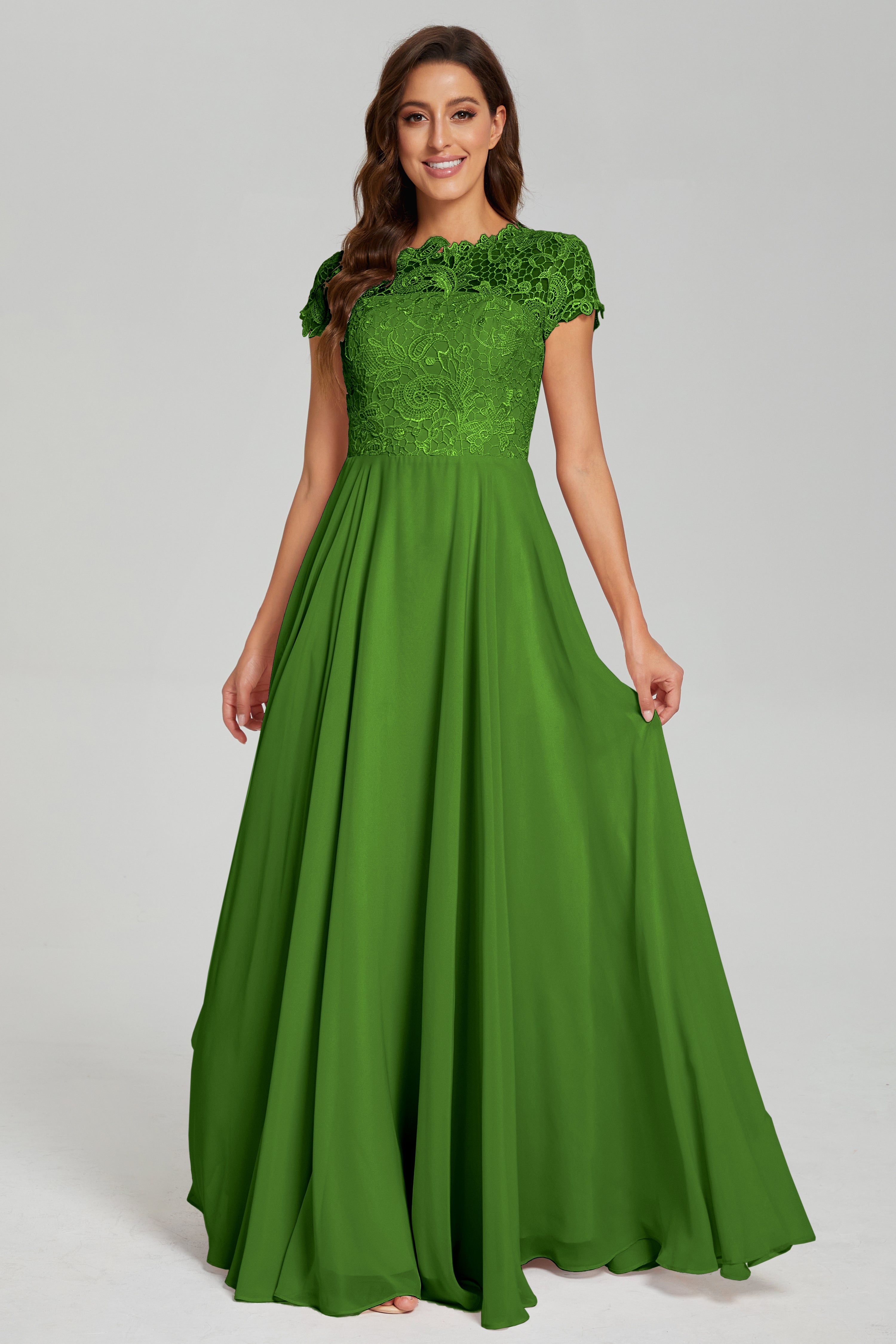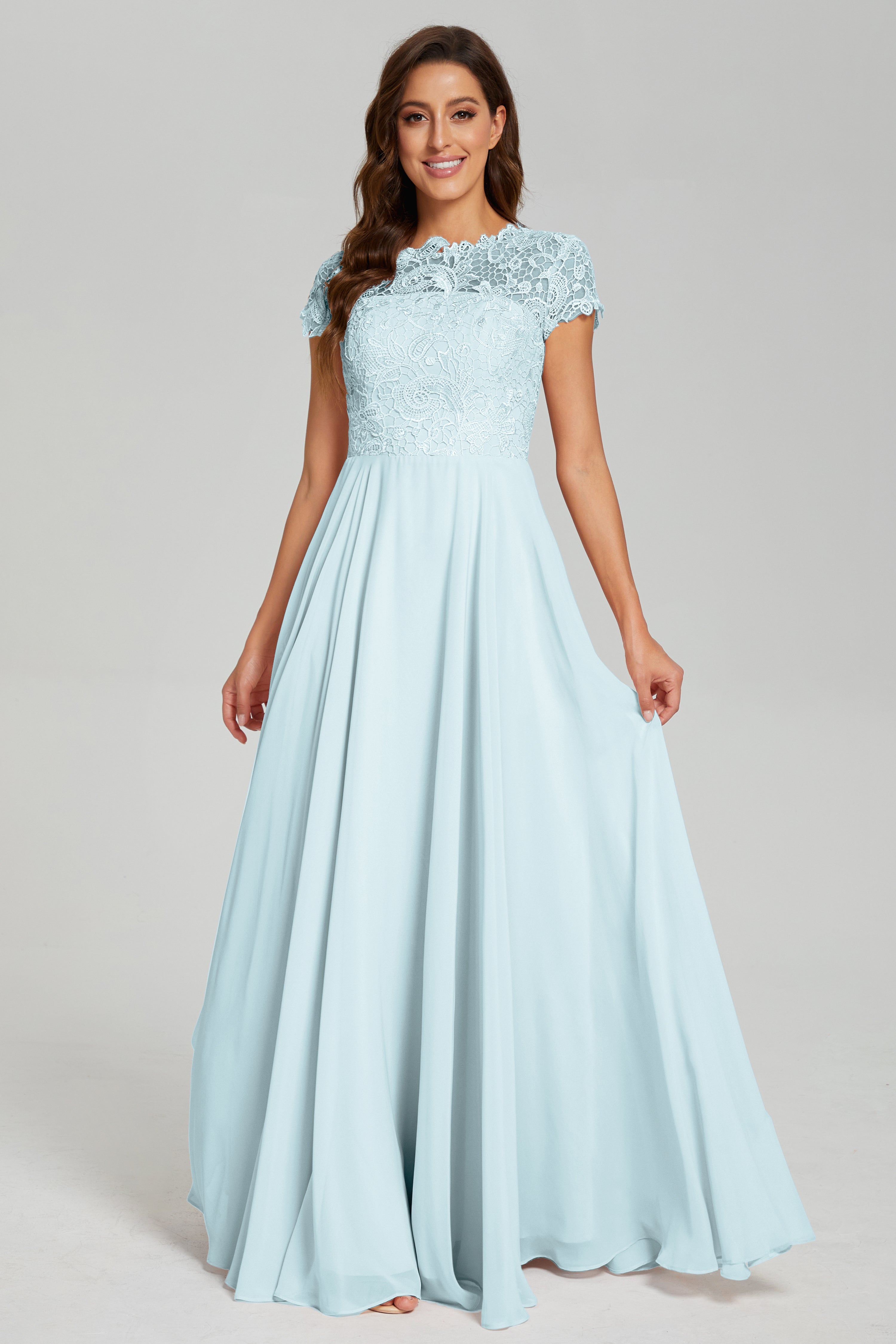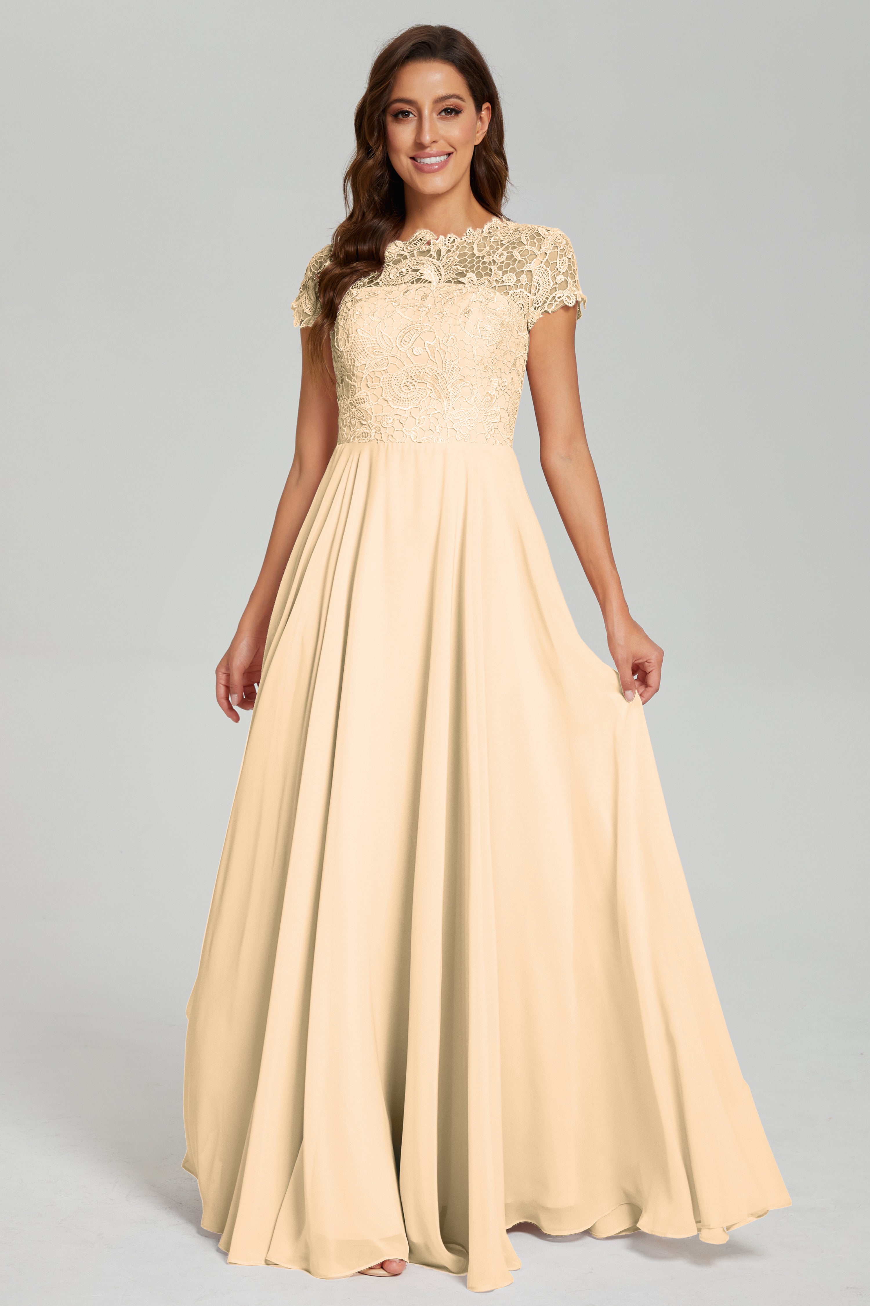 Short Sleeves Chiffon Lace Prom Dresses with Pockets