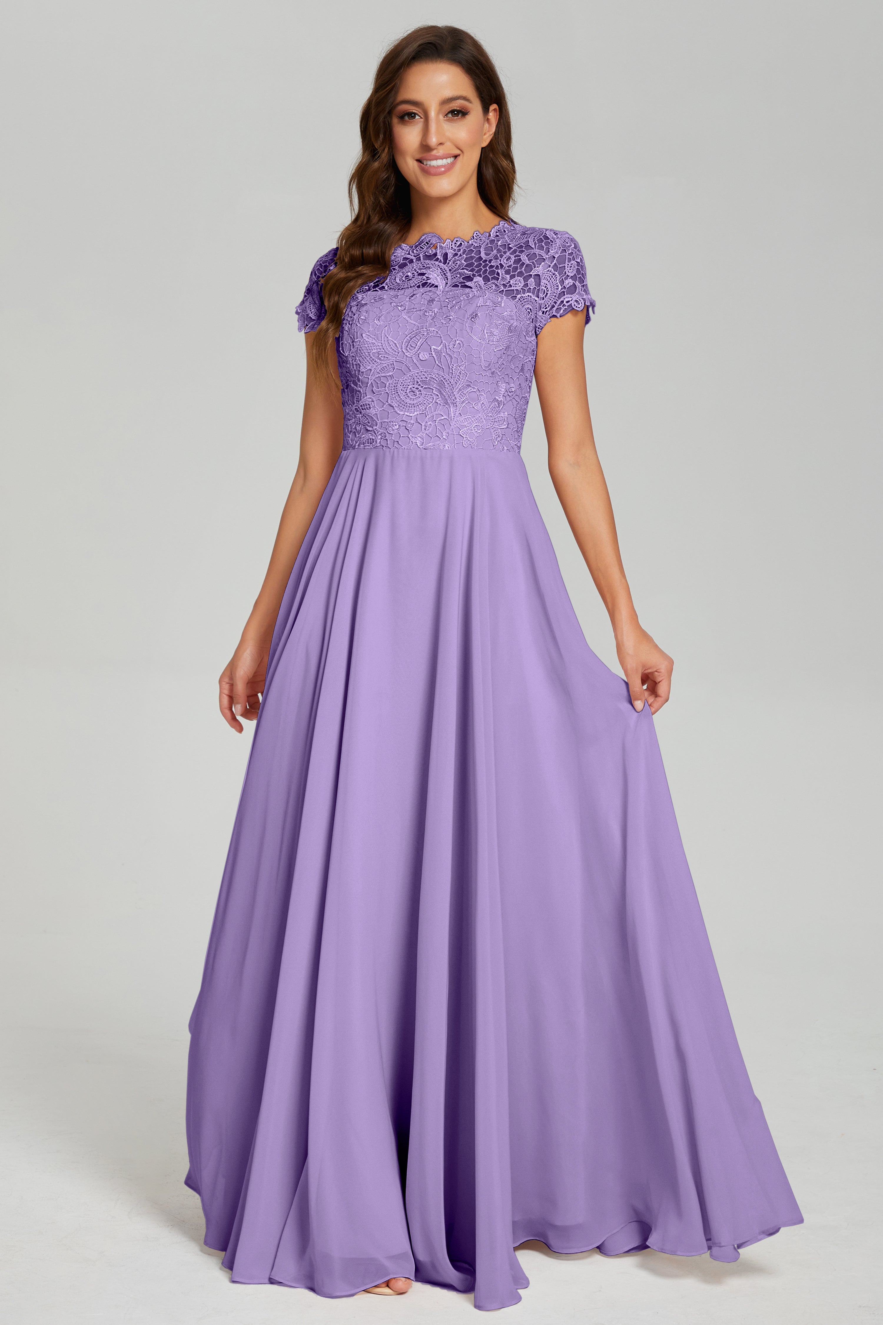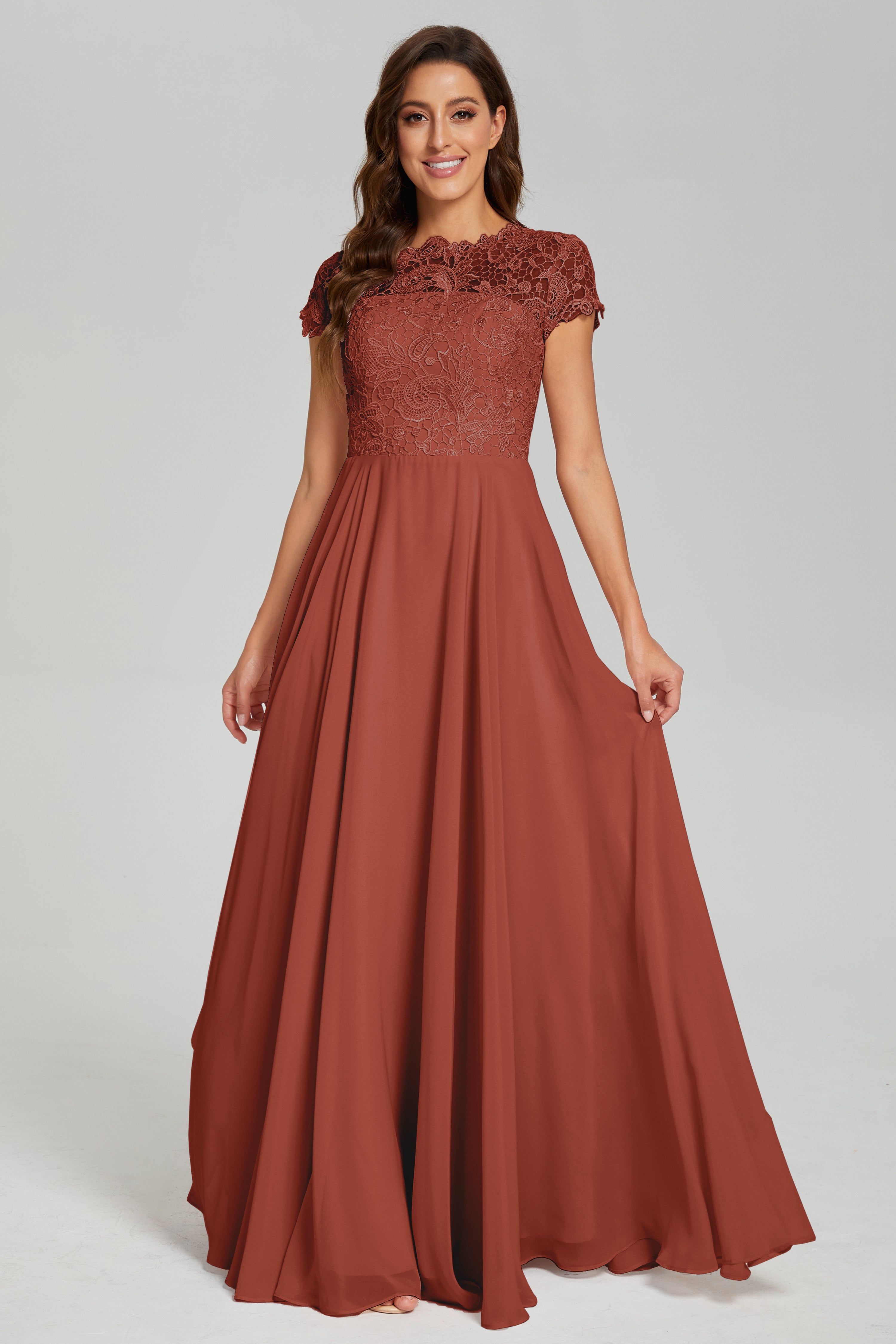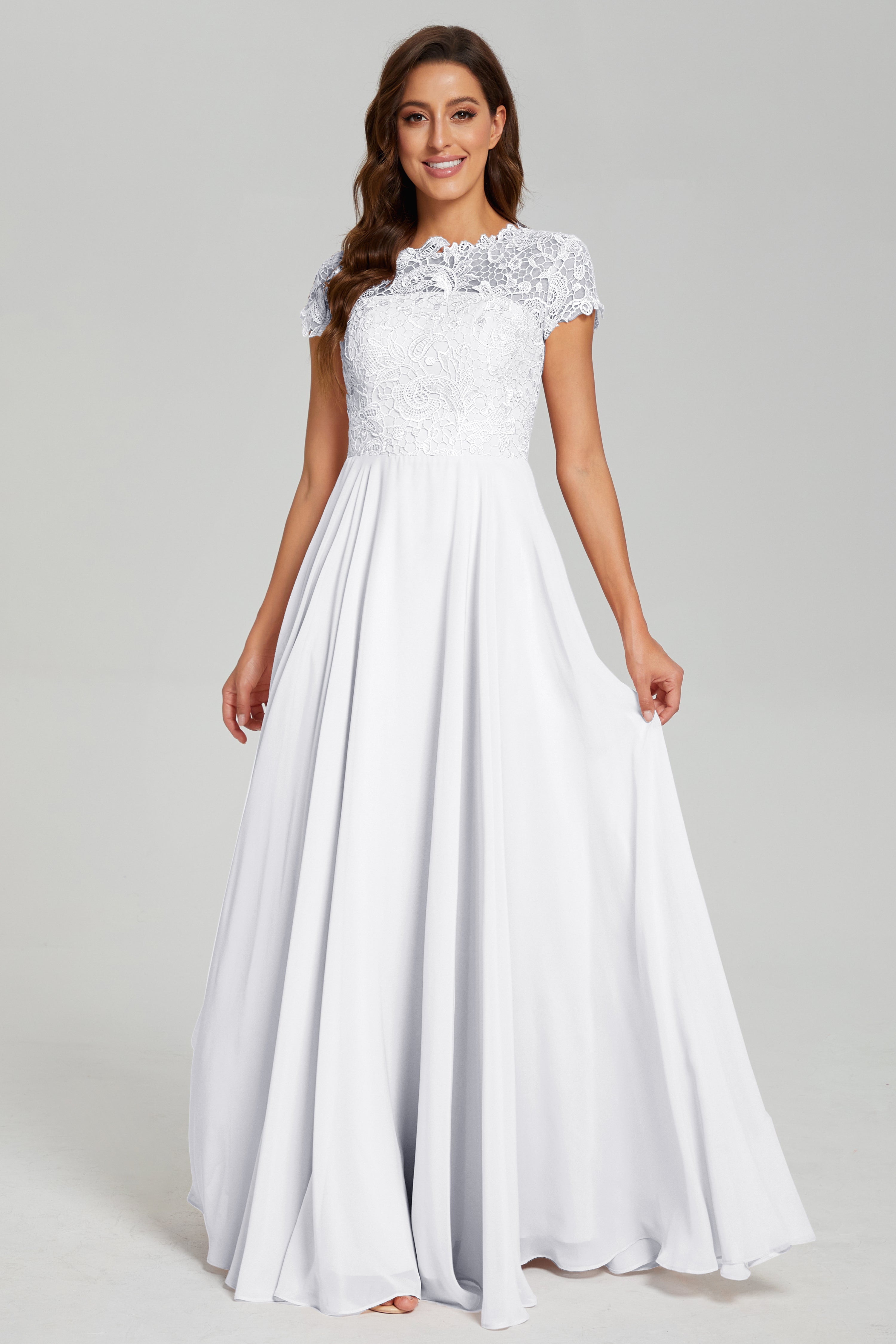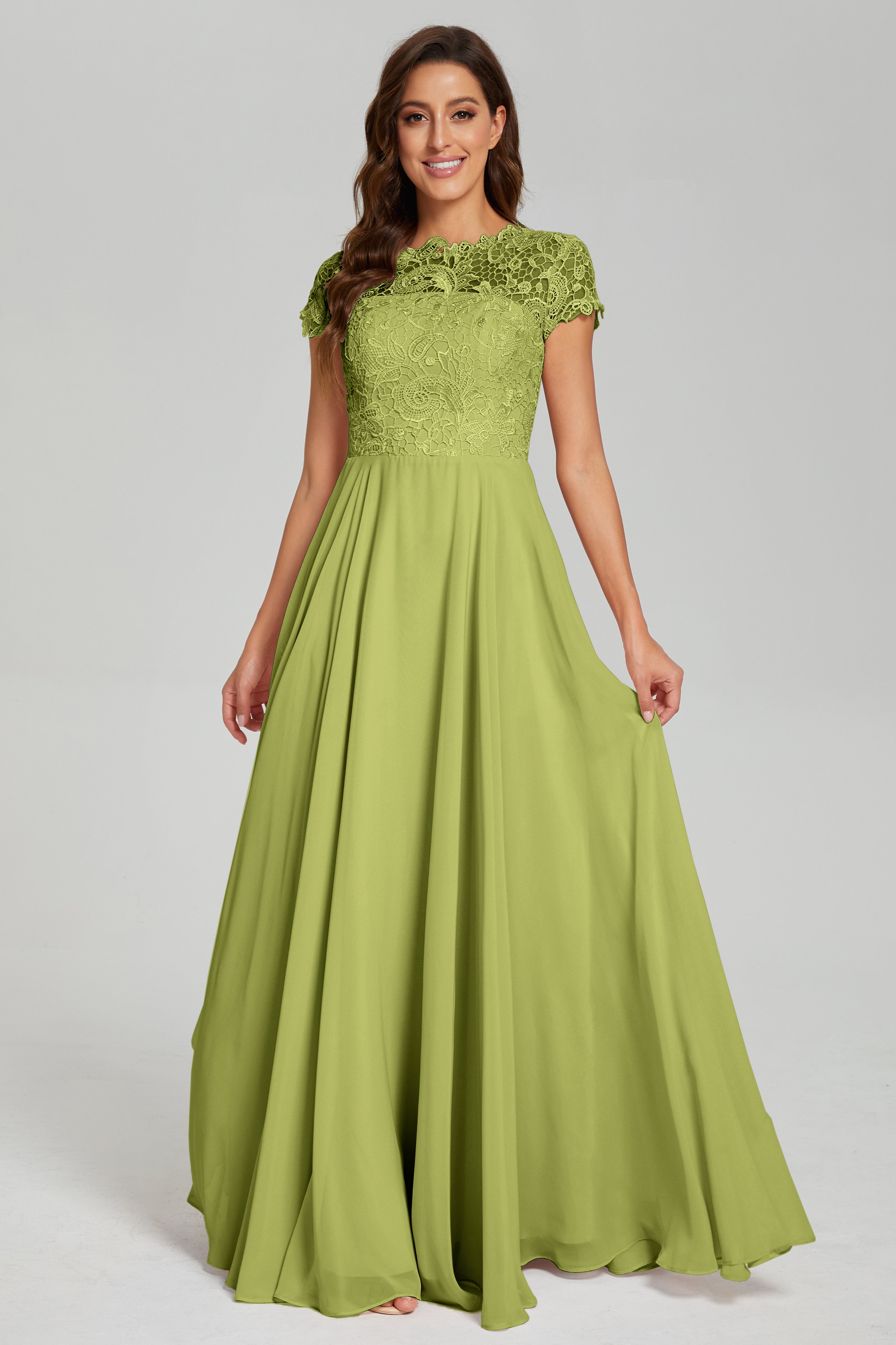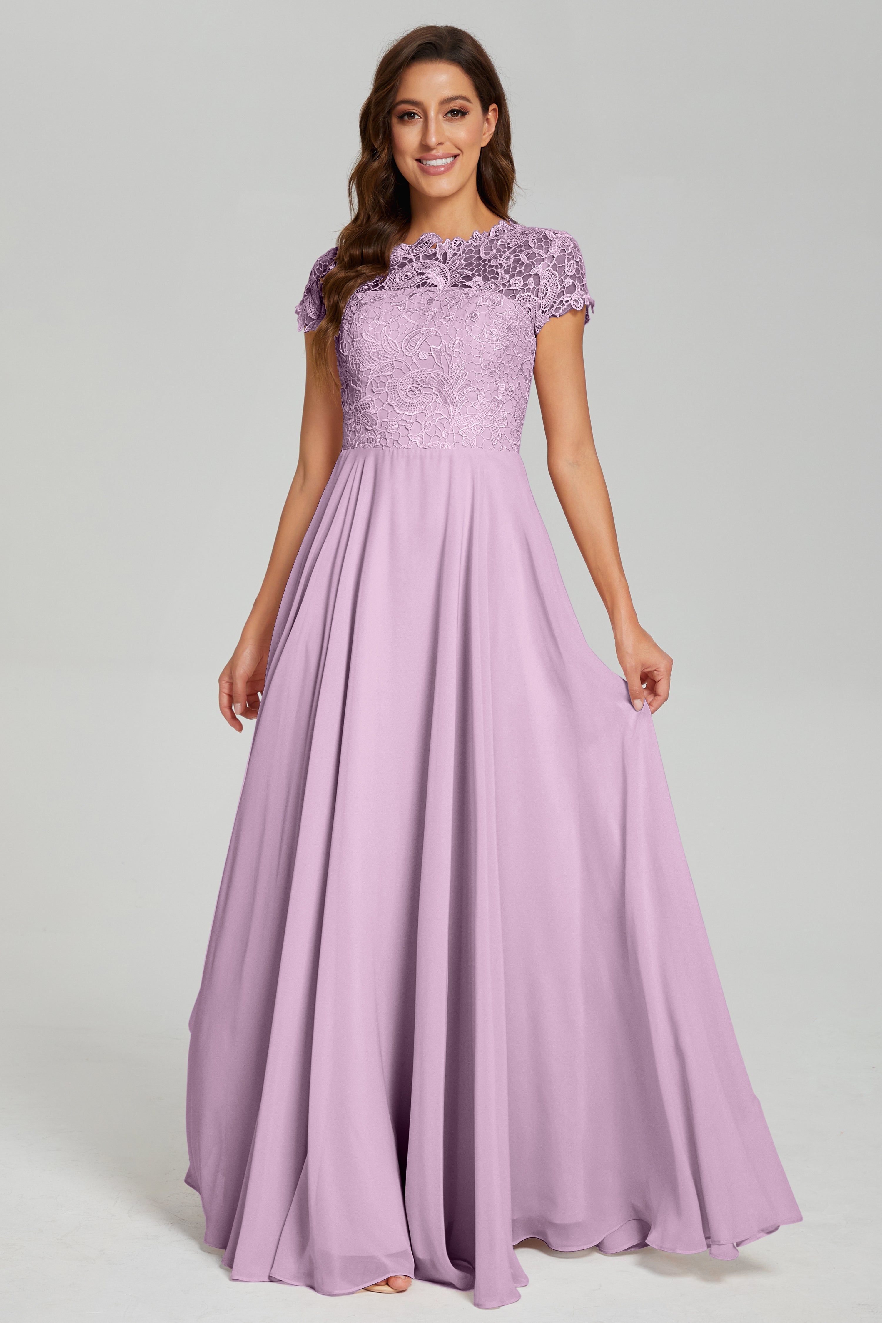 Short Sleeves Chiffon Lace Prom Dresses with Pockets