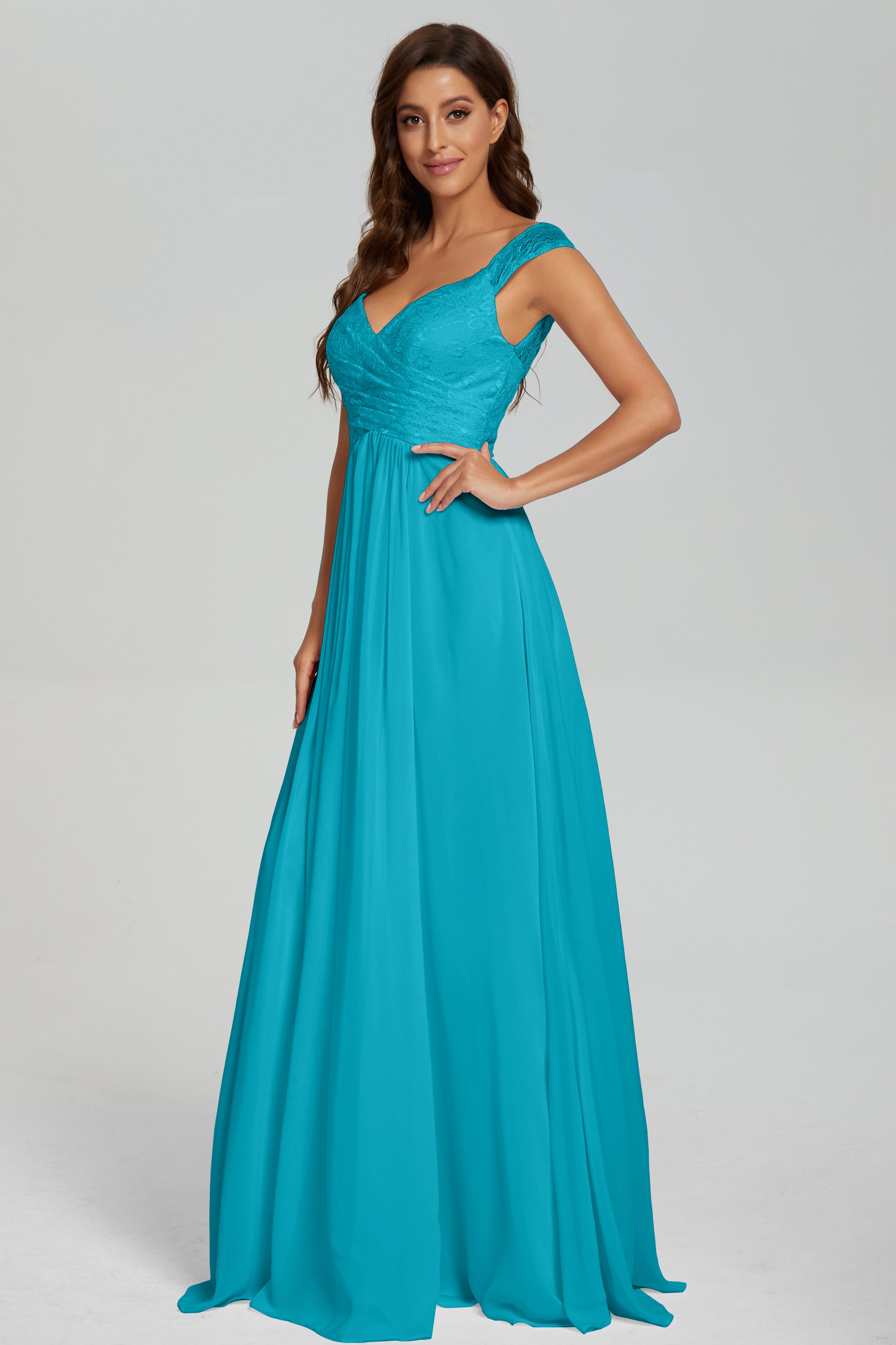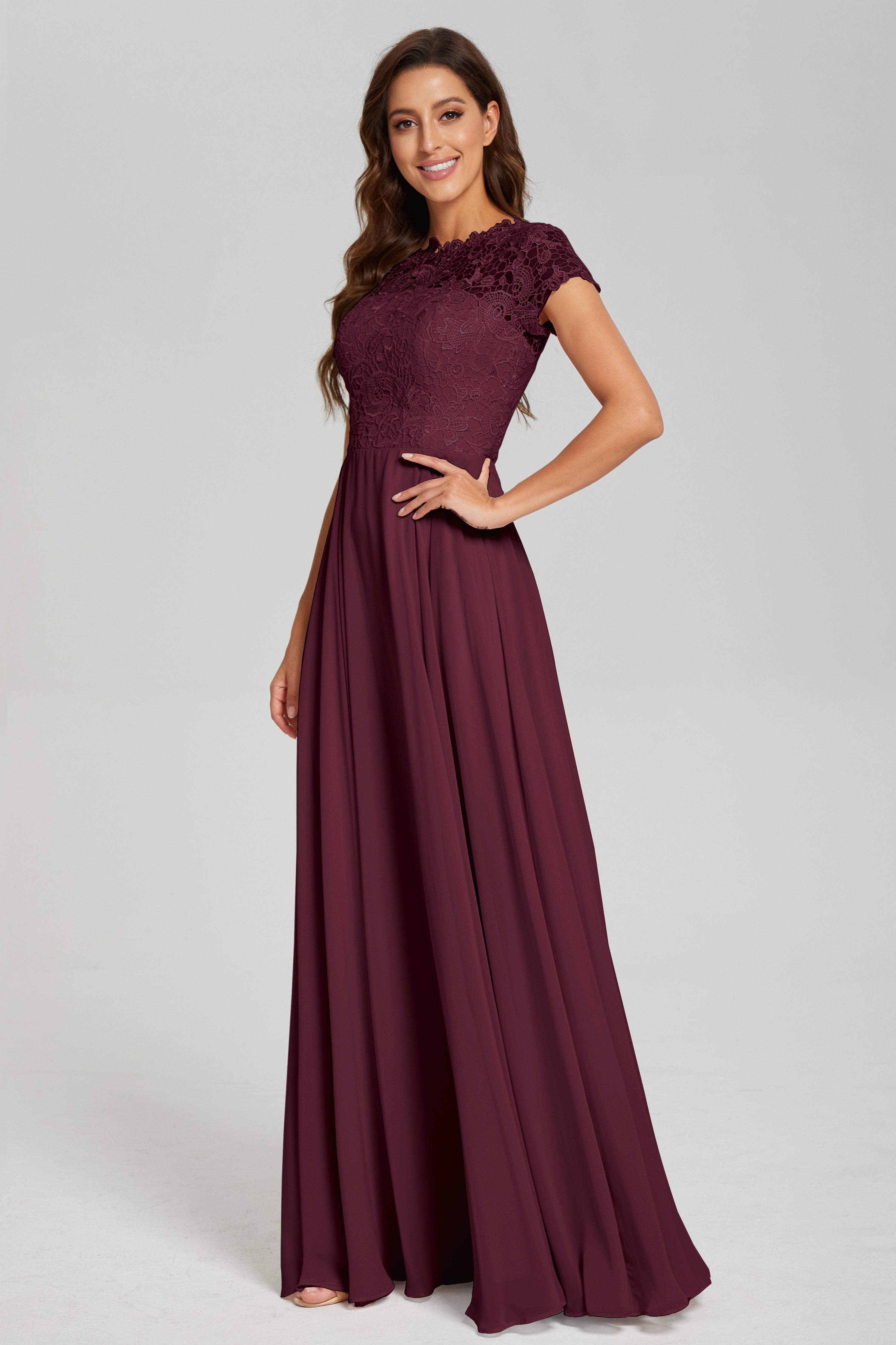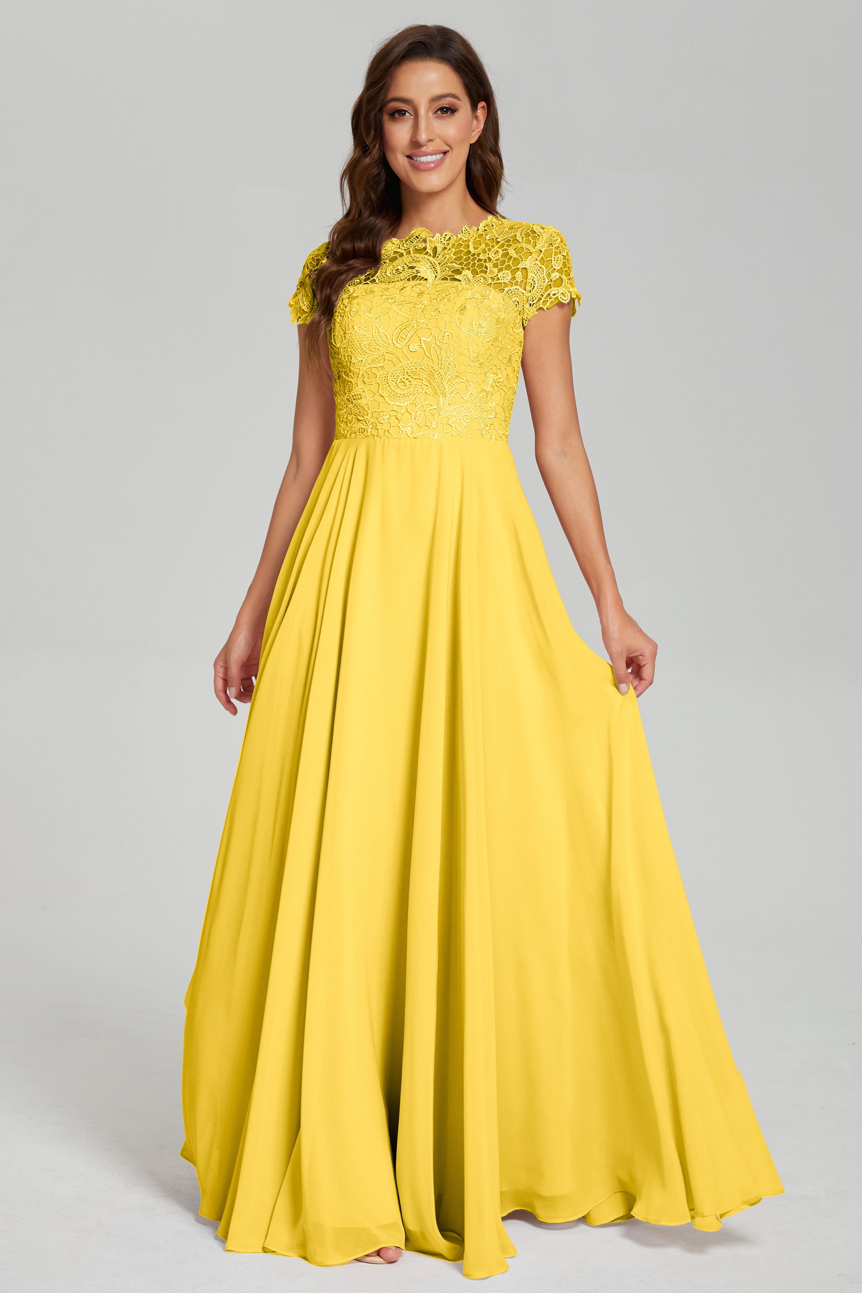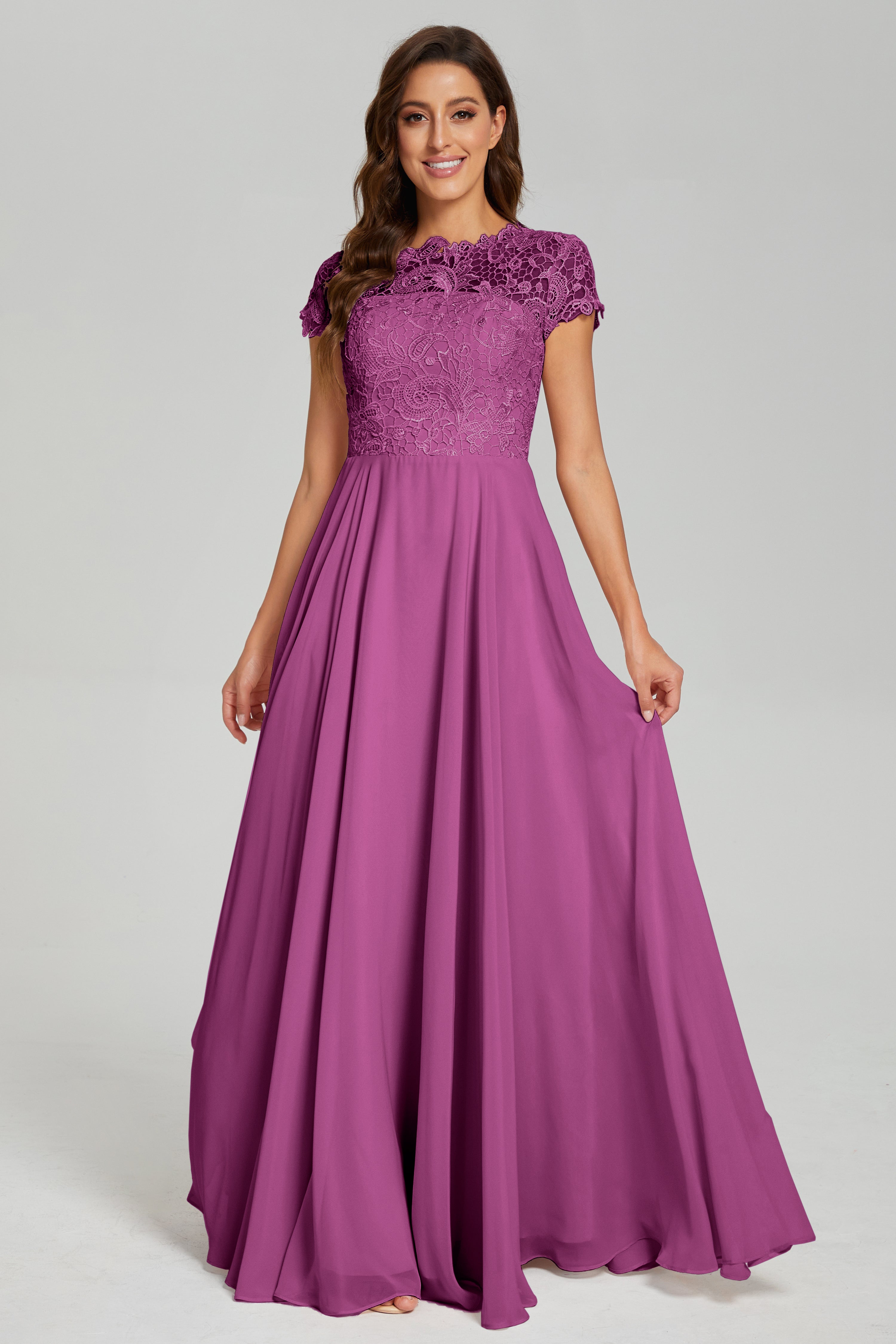 Short Sleeves Chiffon Lace Prom Dresses with Pockets