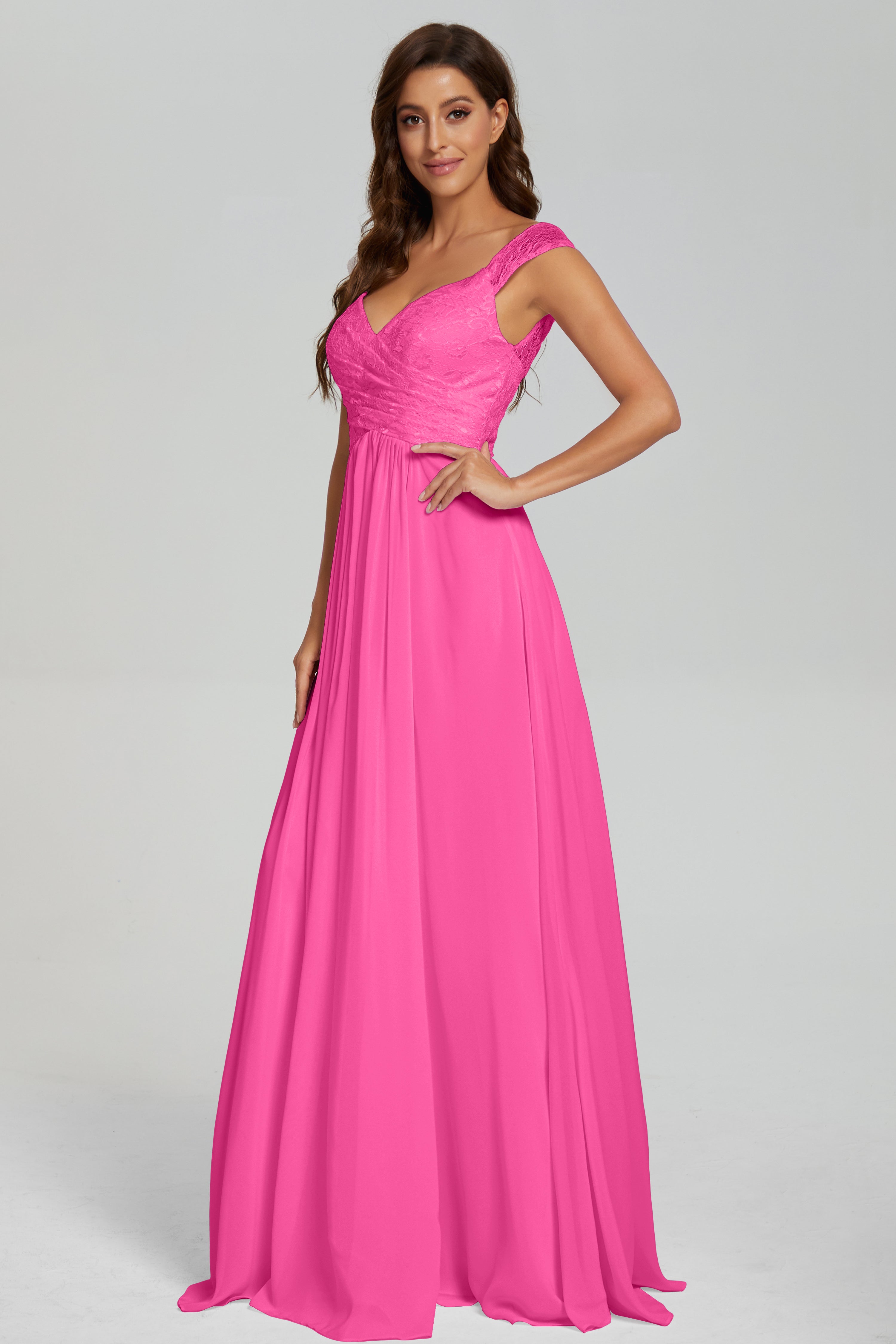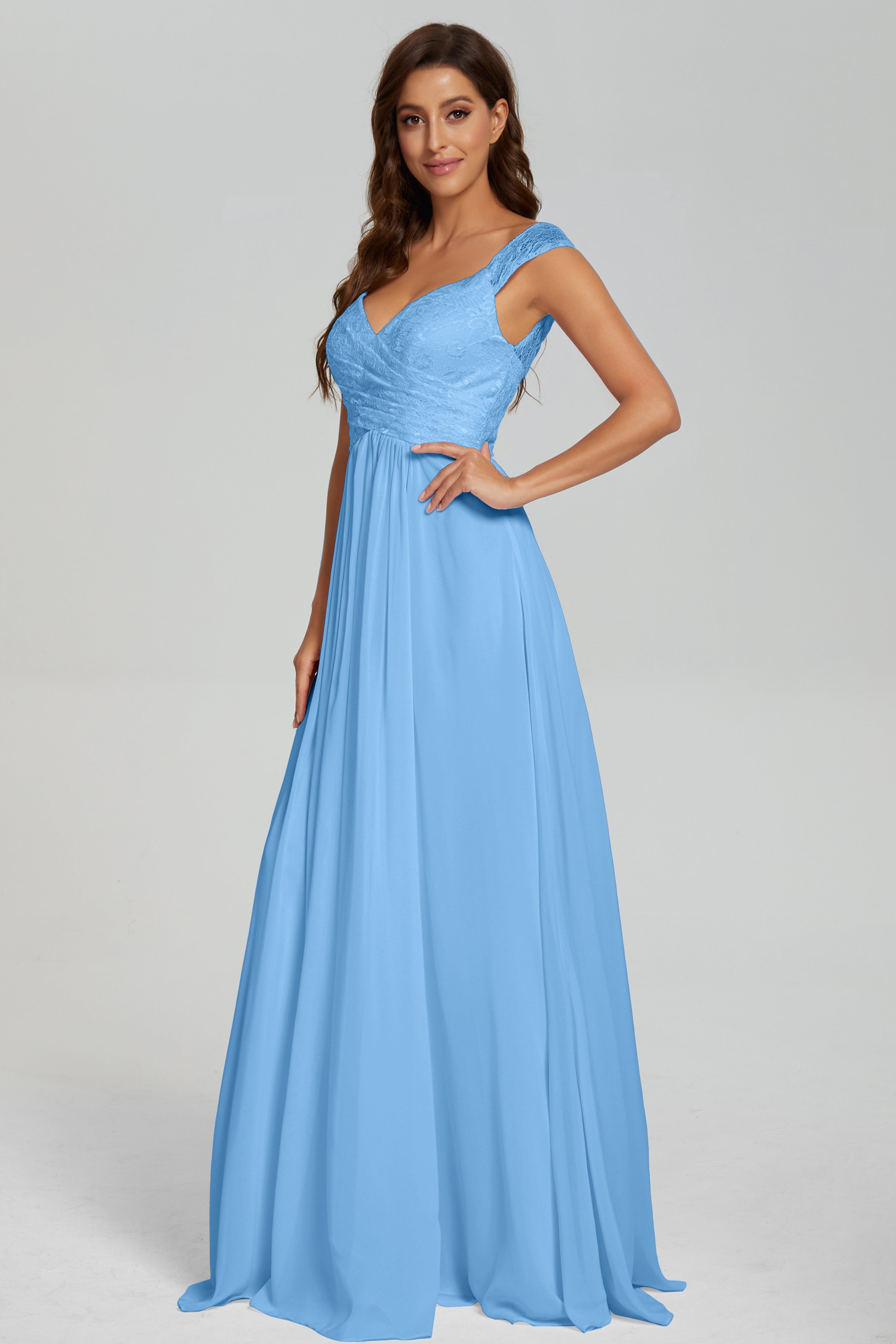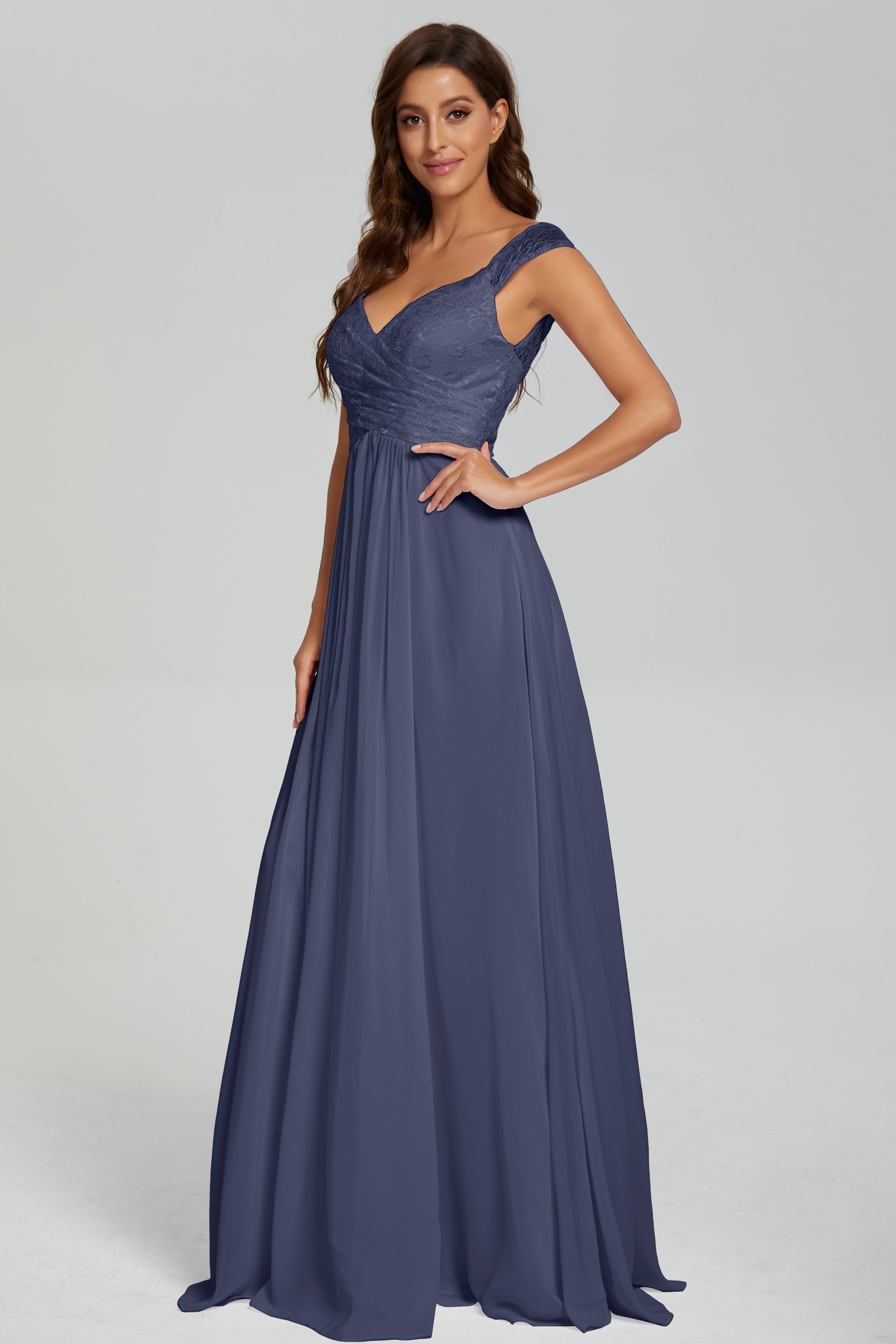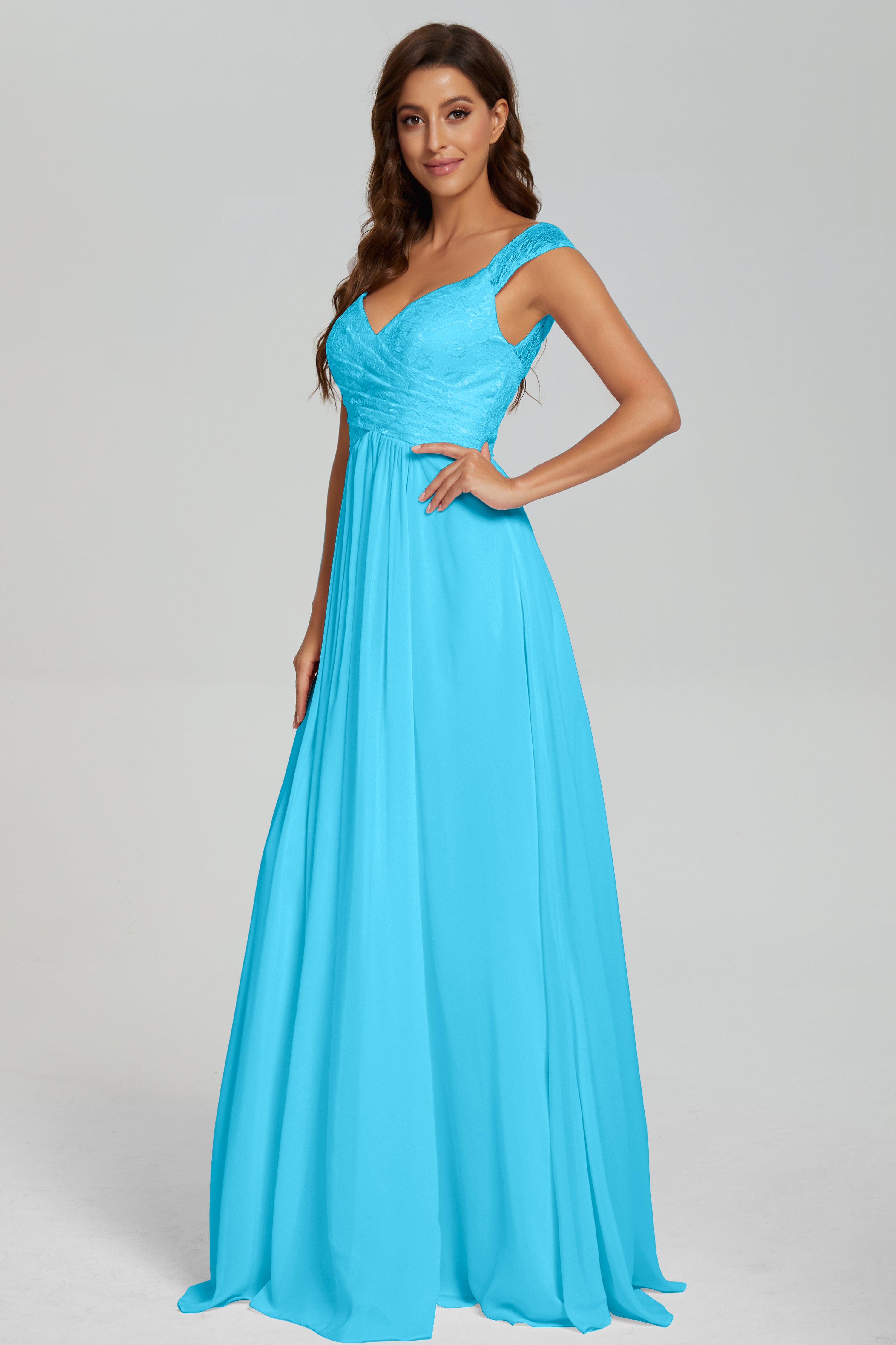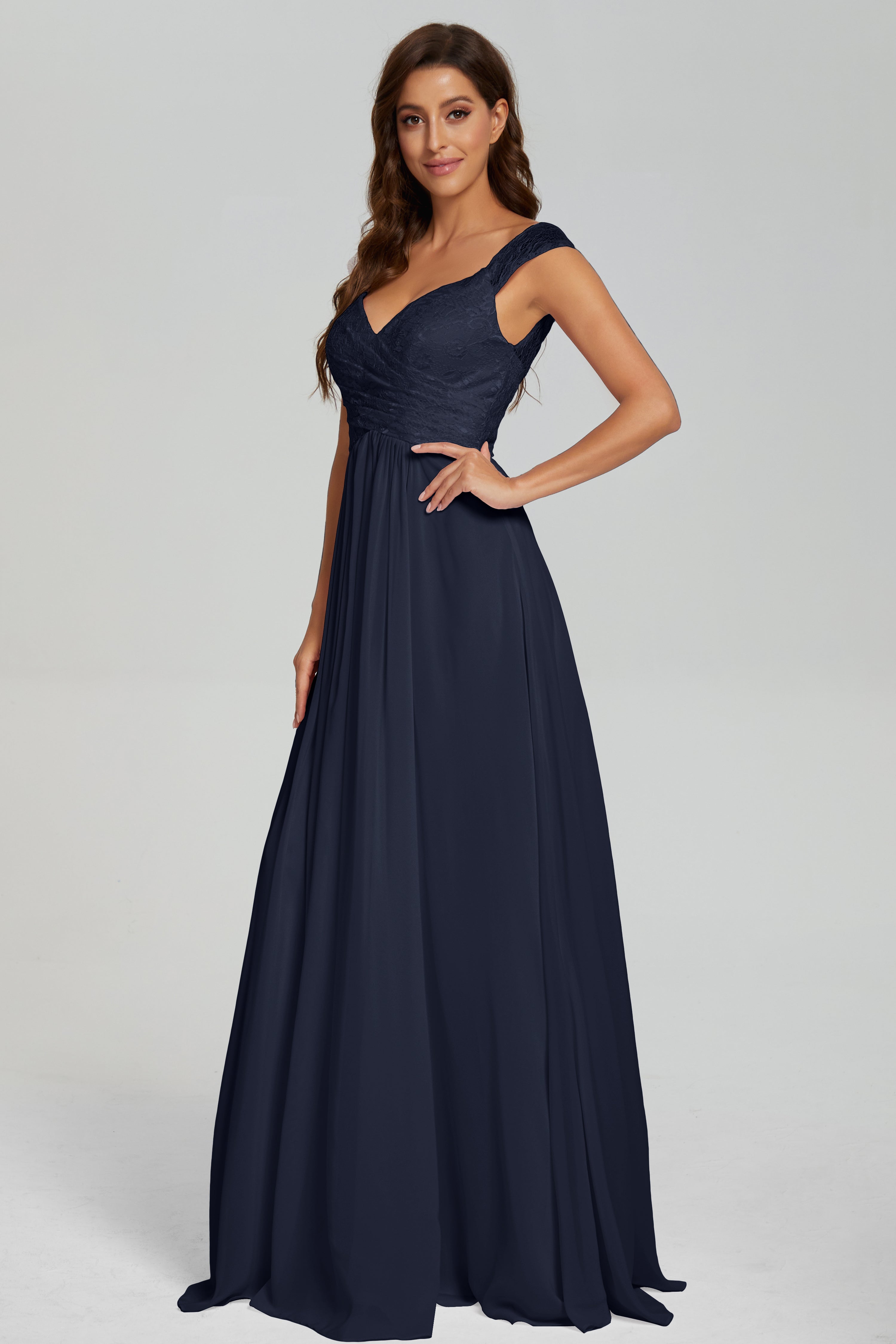 Short Sleeves Chiffon Lace Prom Dresses with Pockets