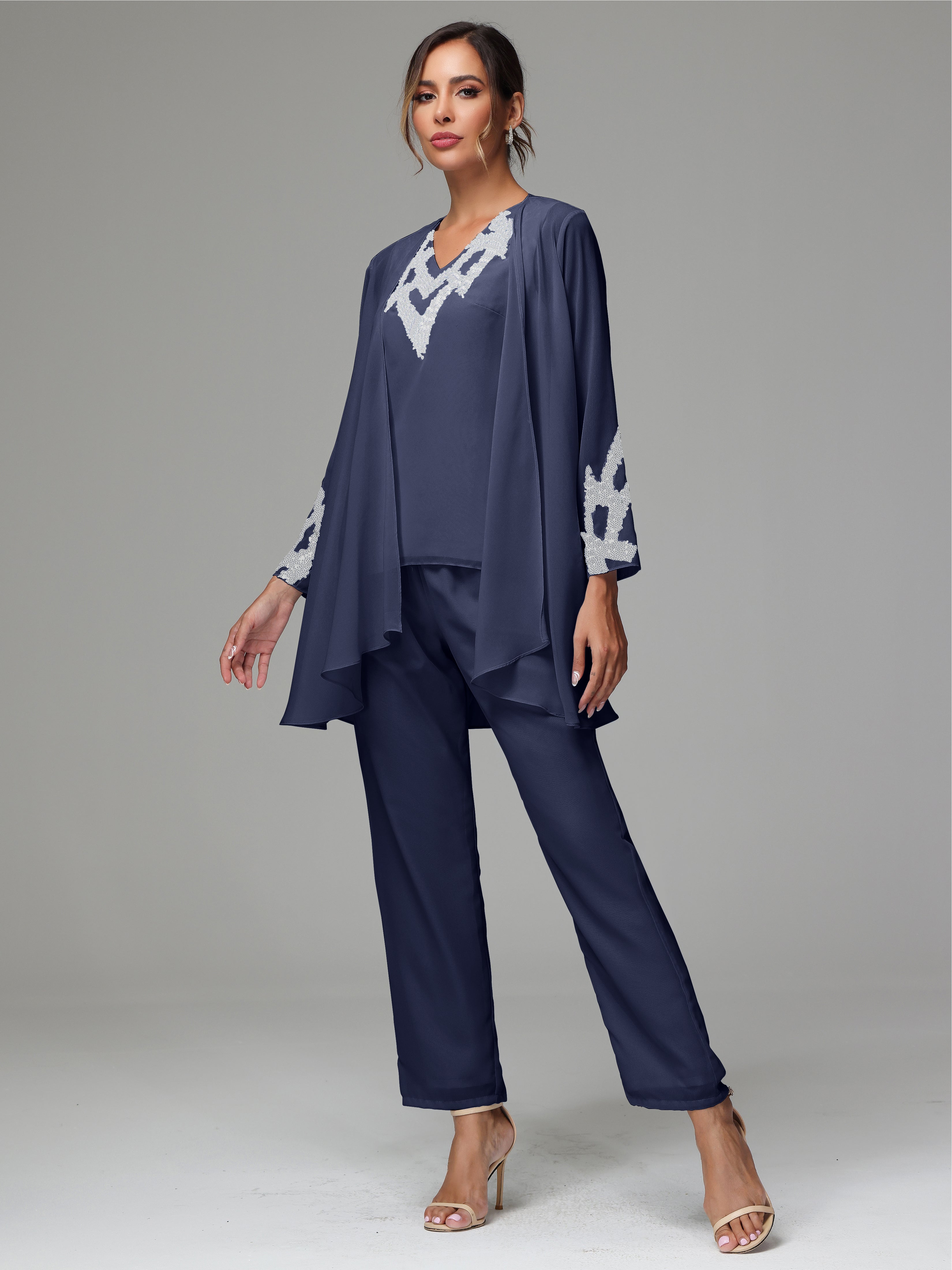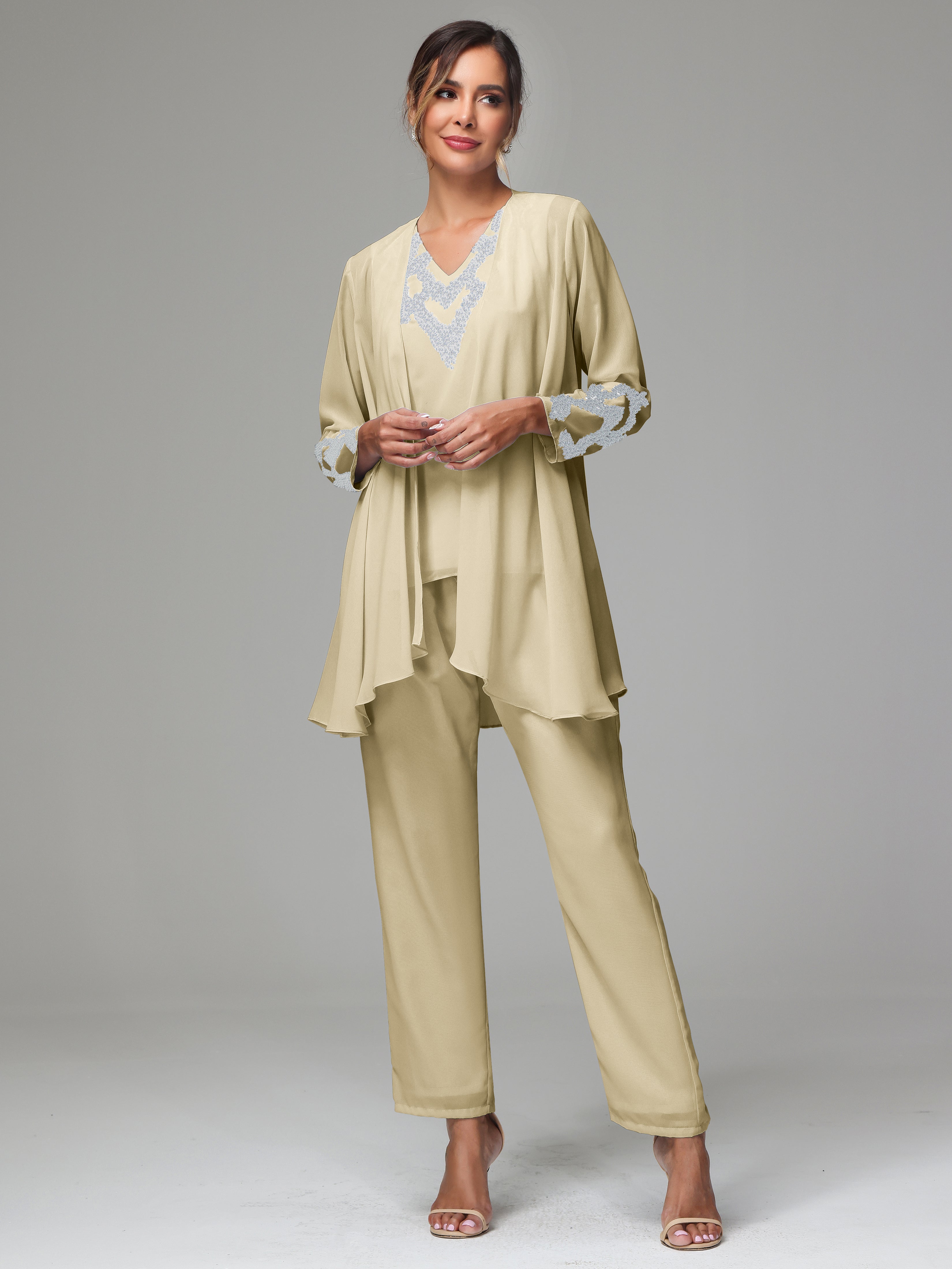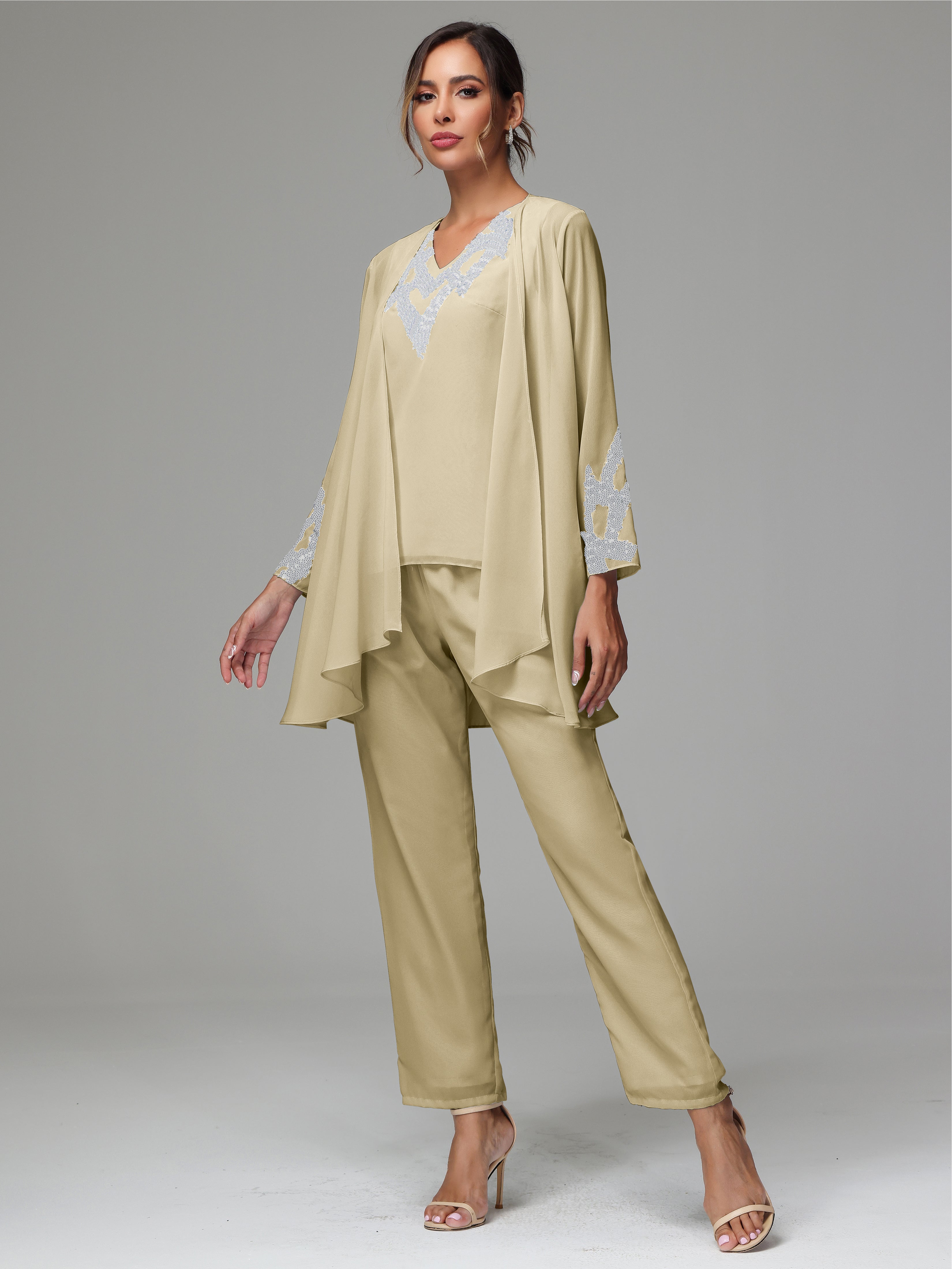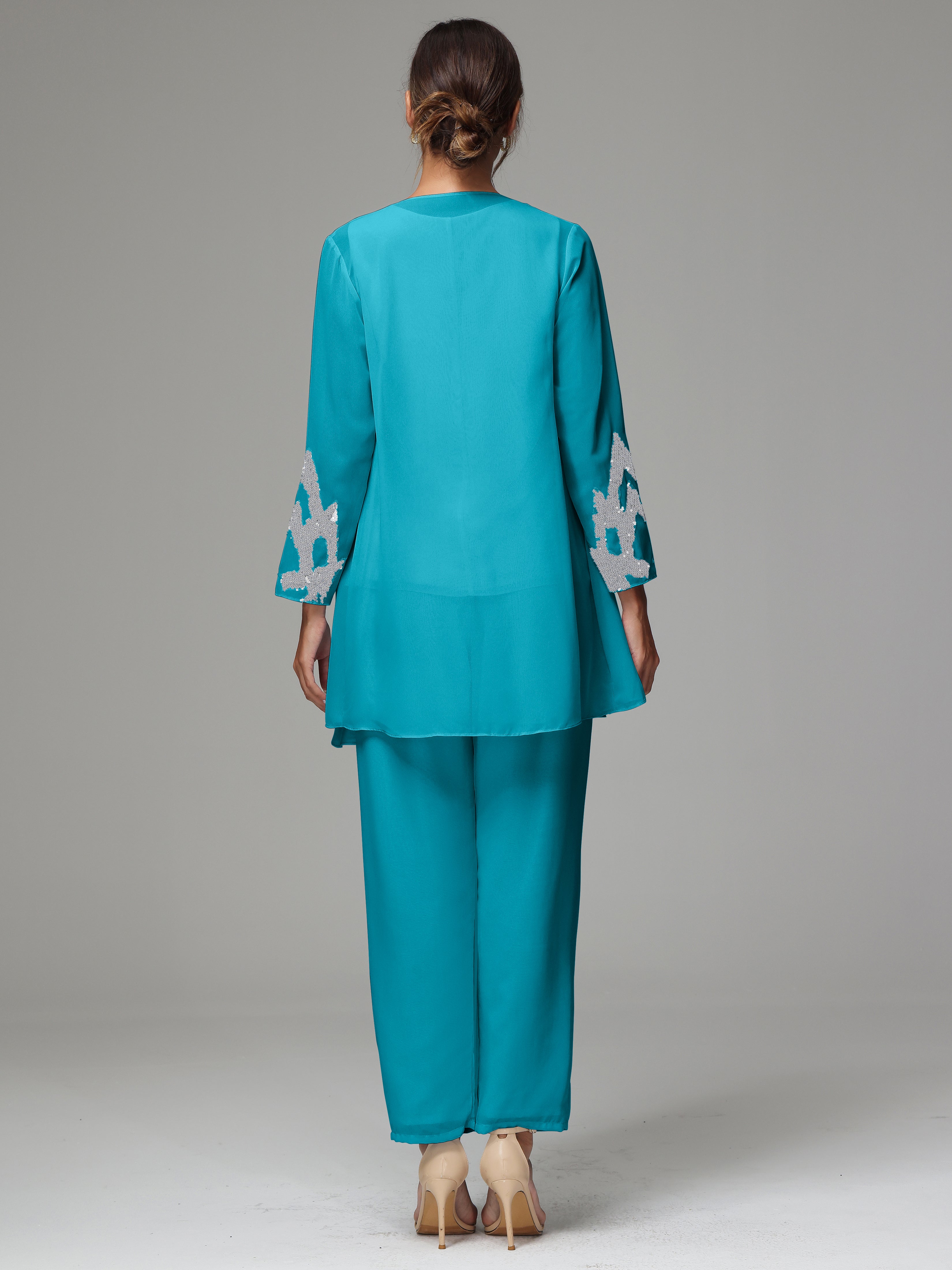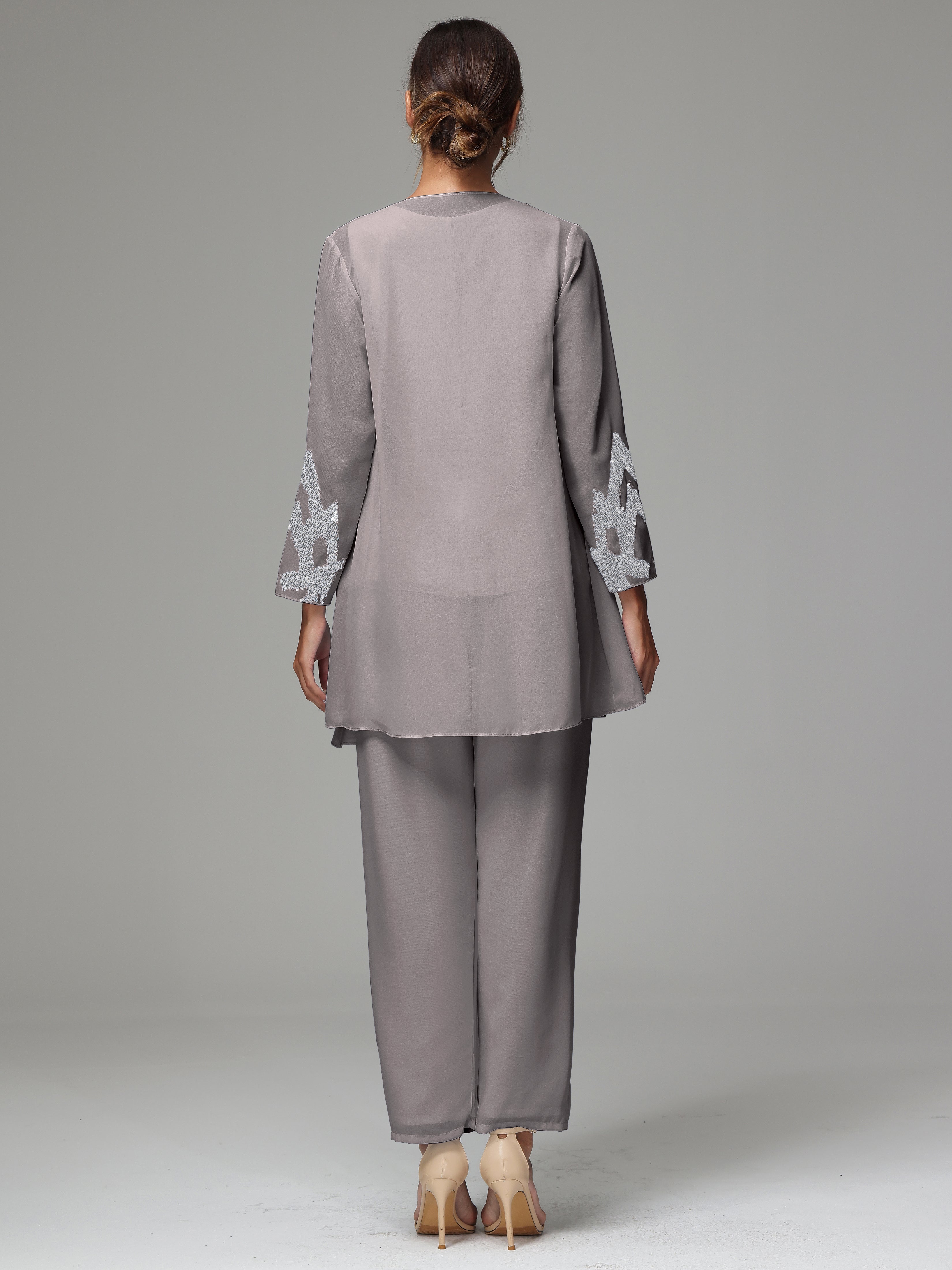 3 Pieces Long Sleeves Chiffon Lace Mother Of The Bride Dress Pants Suits with Silver Sequins