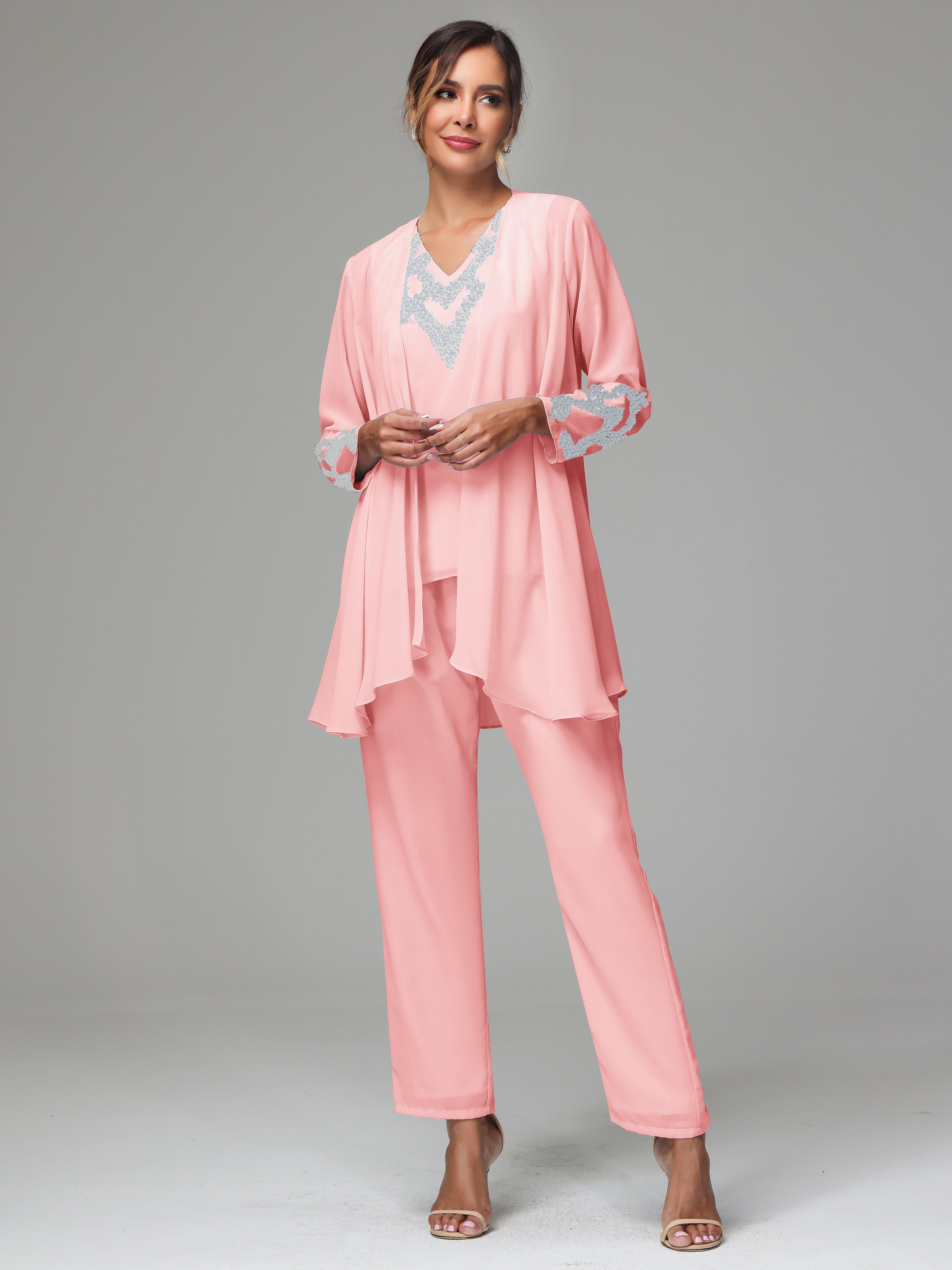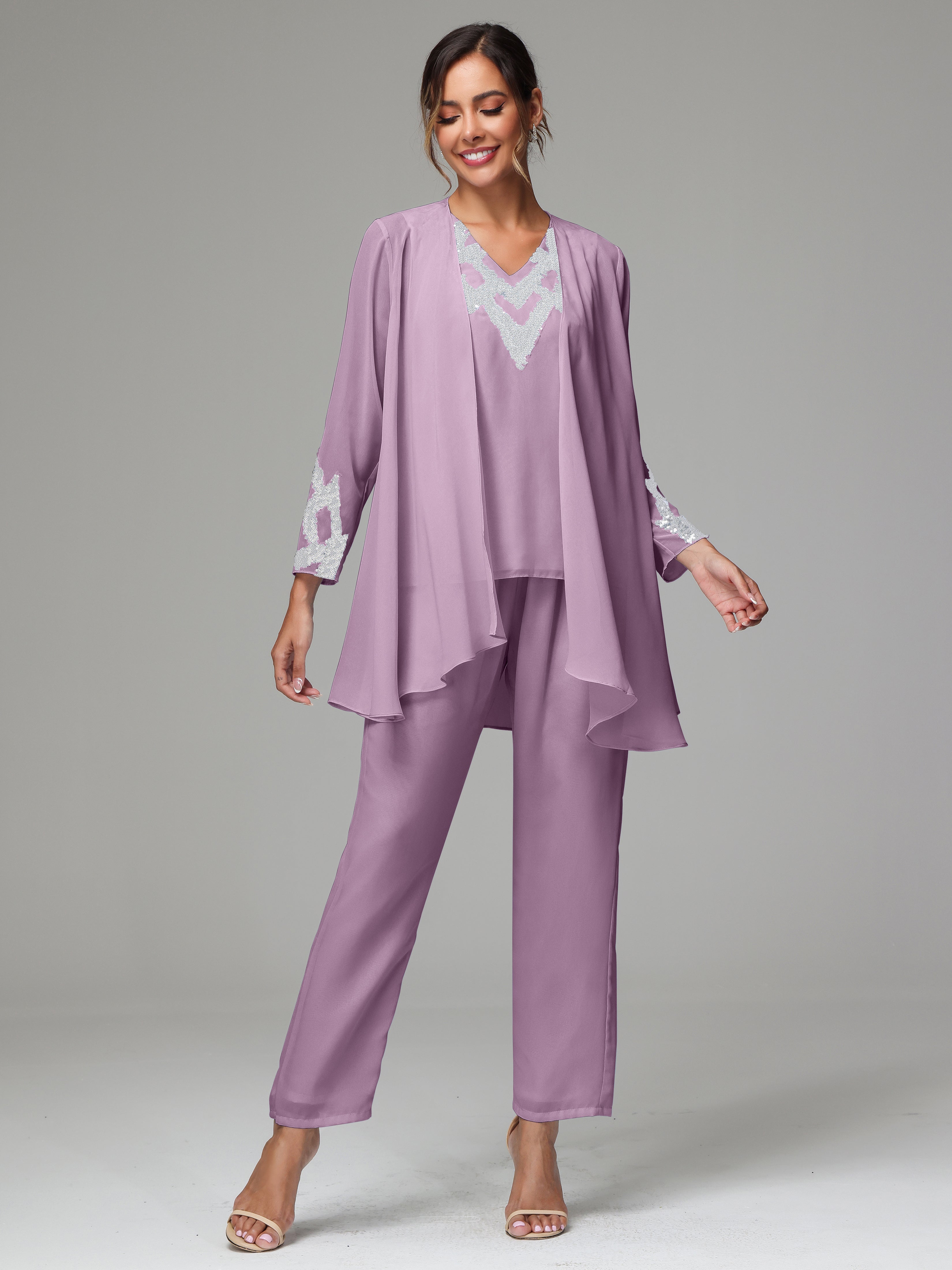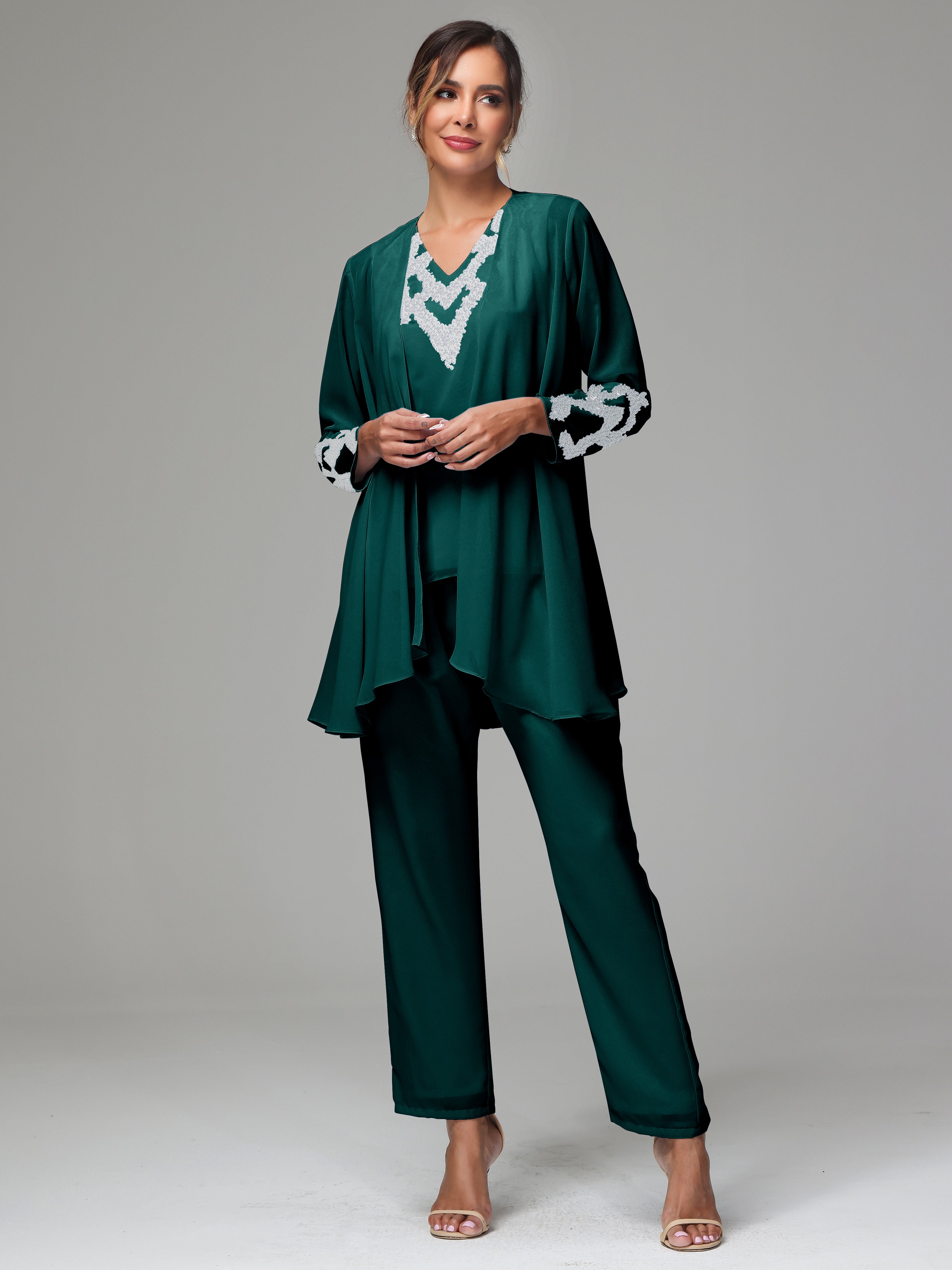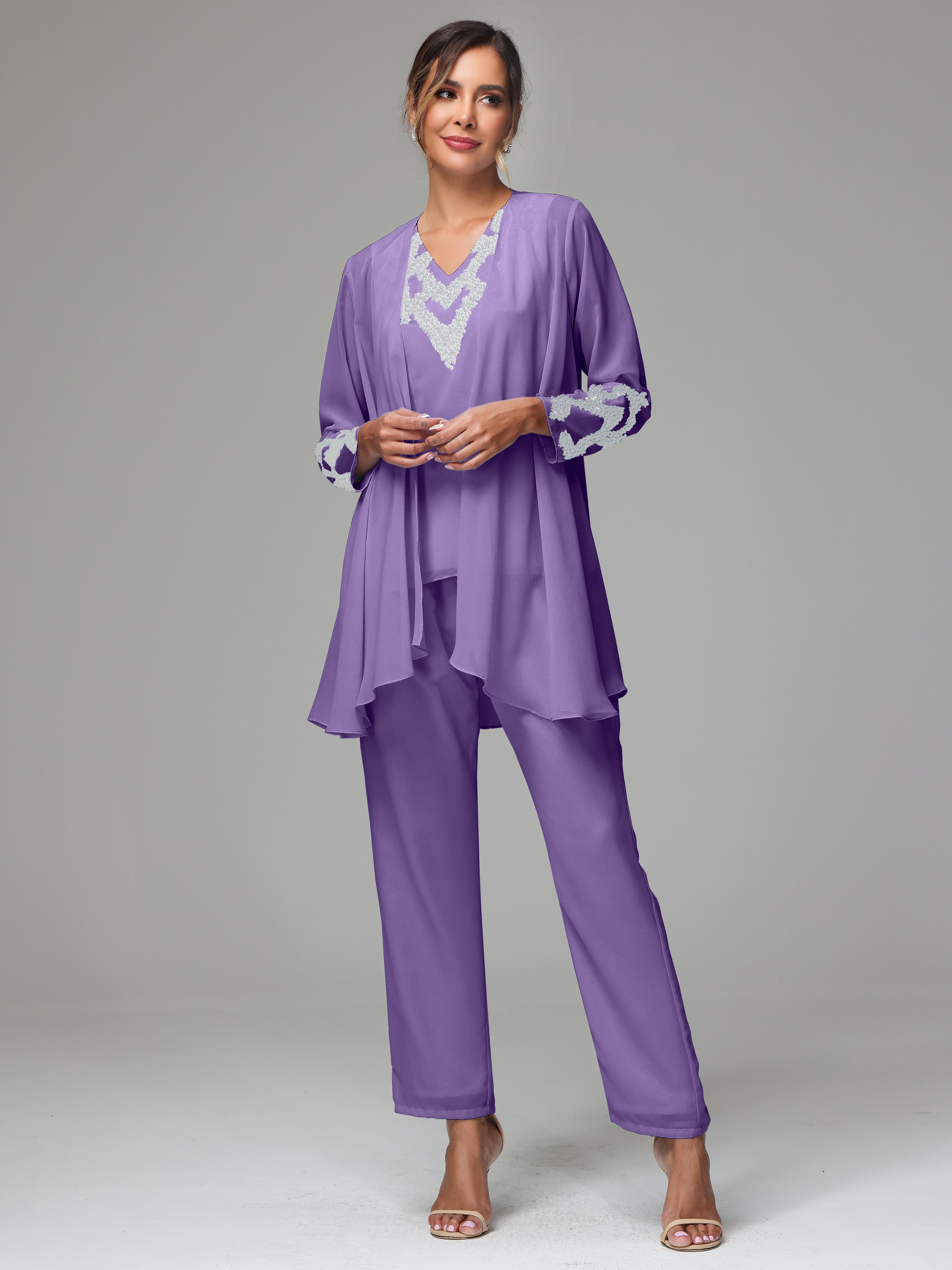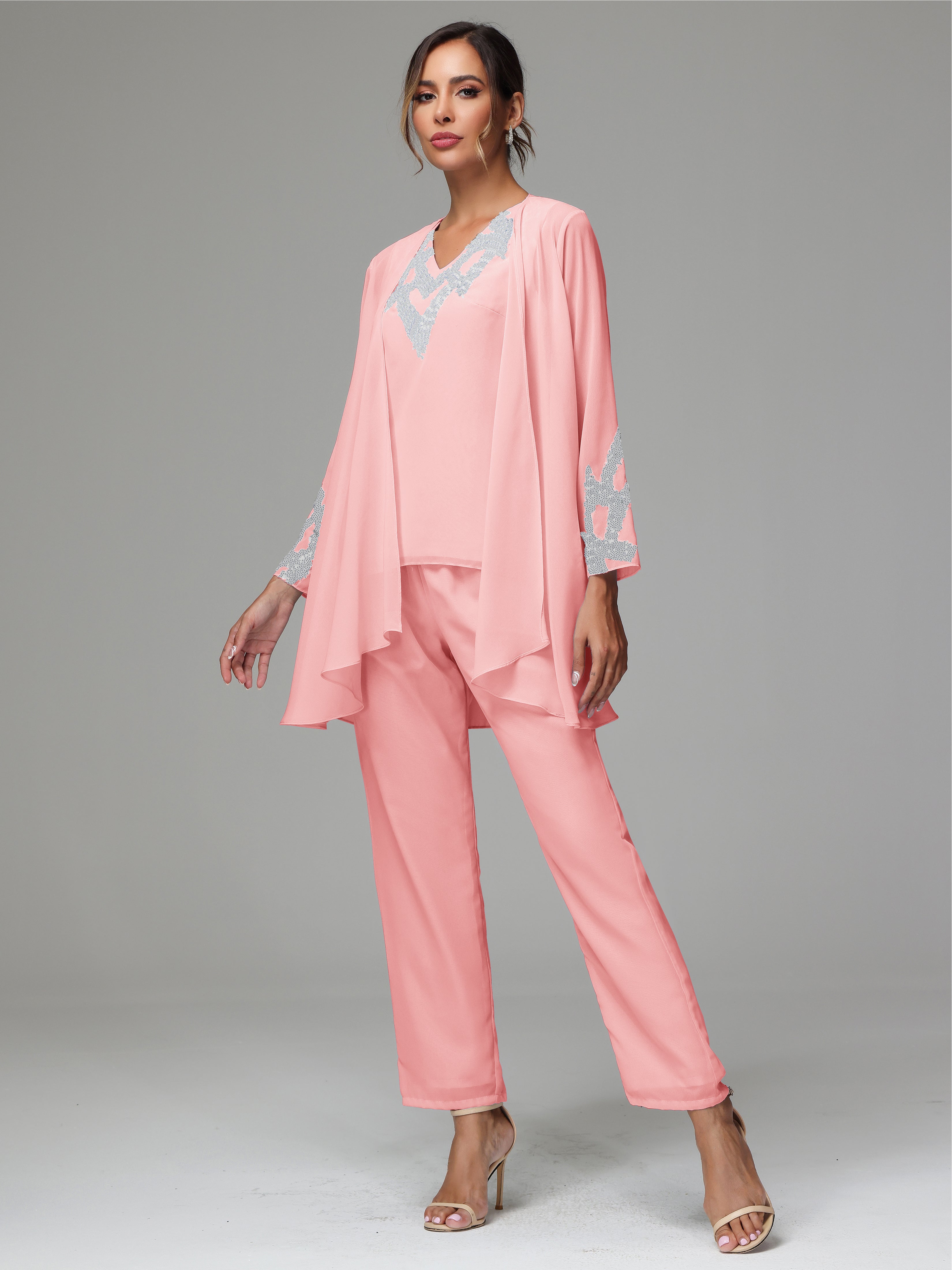 3 Pieces Long Sleeves Chiffon Lace Mother Of The Bride Dress Pants Suits with Silver Sequins