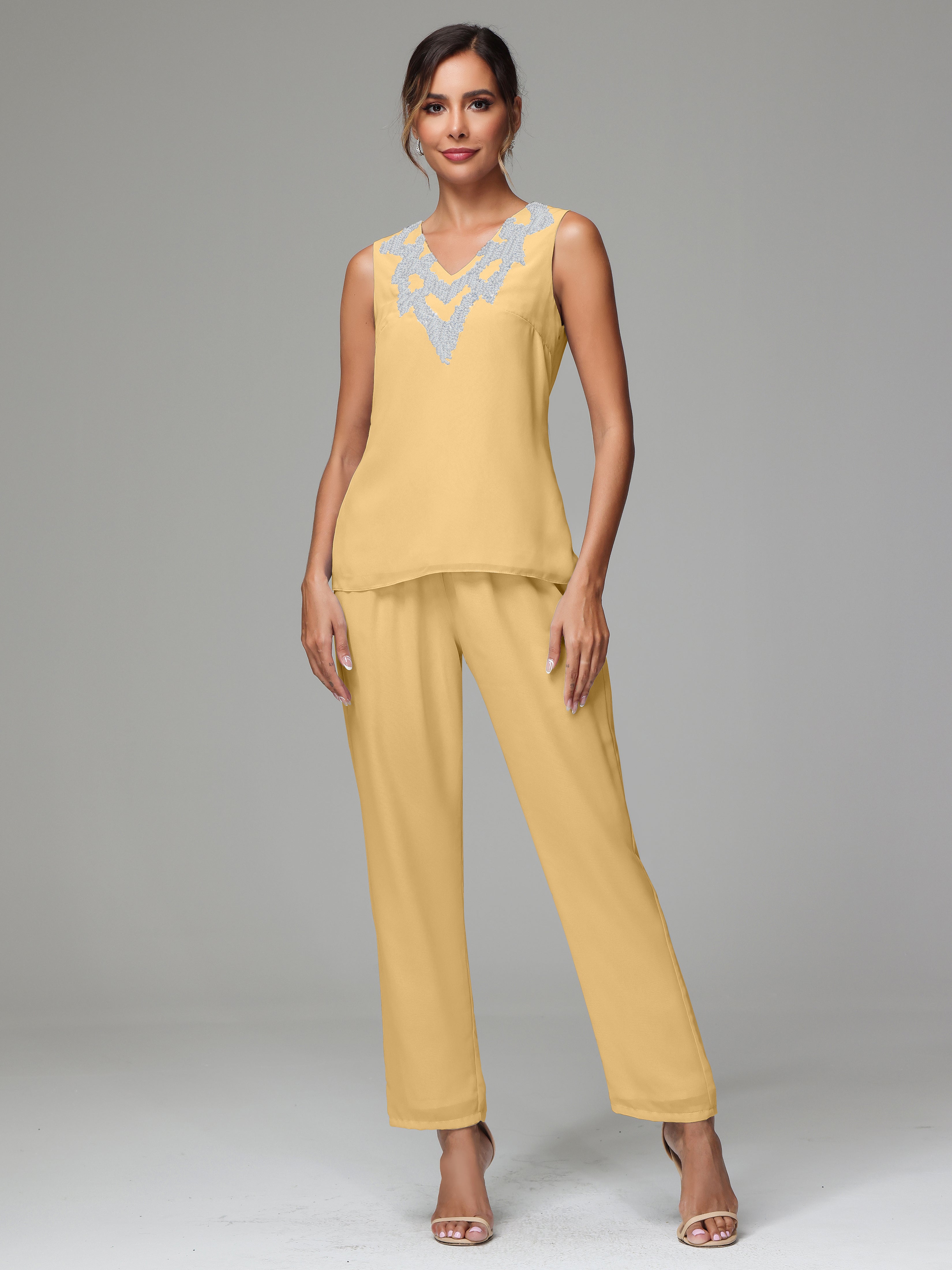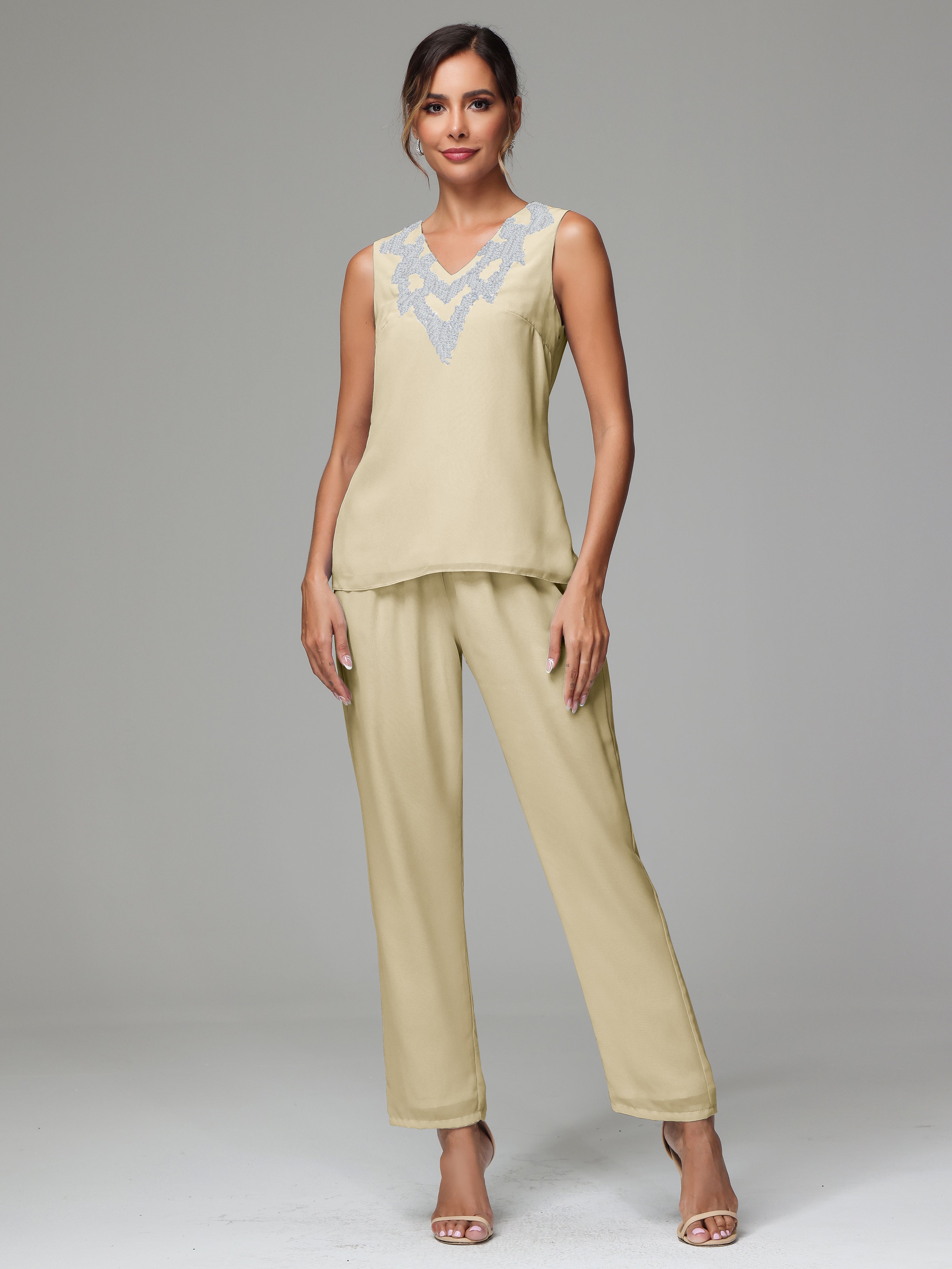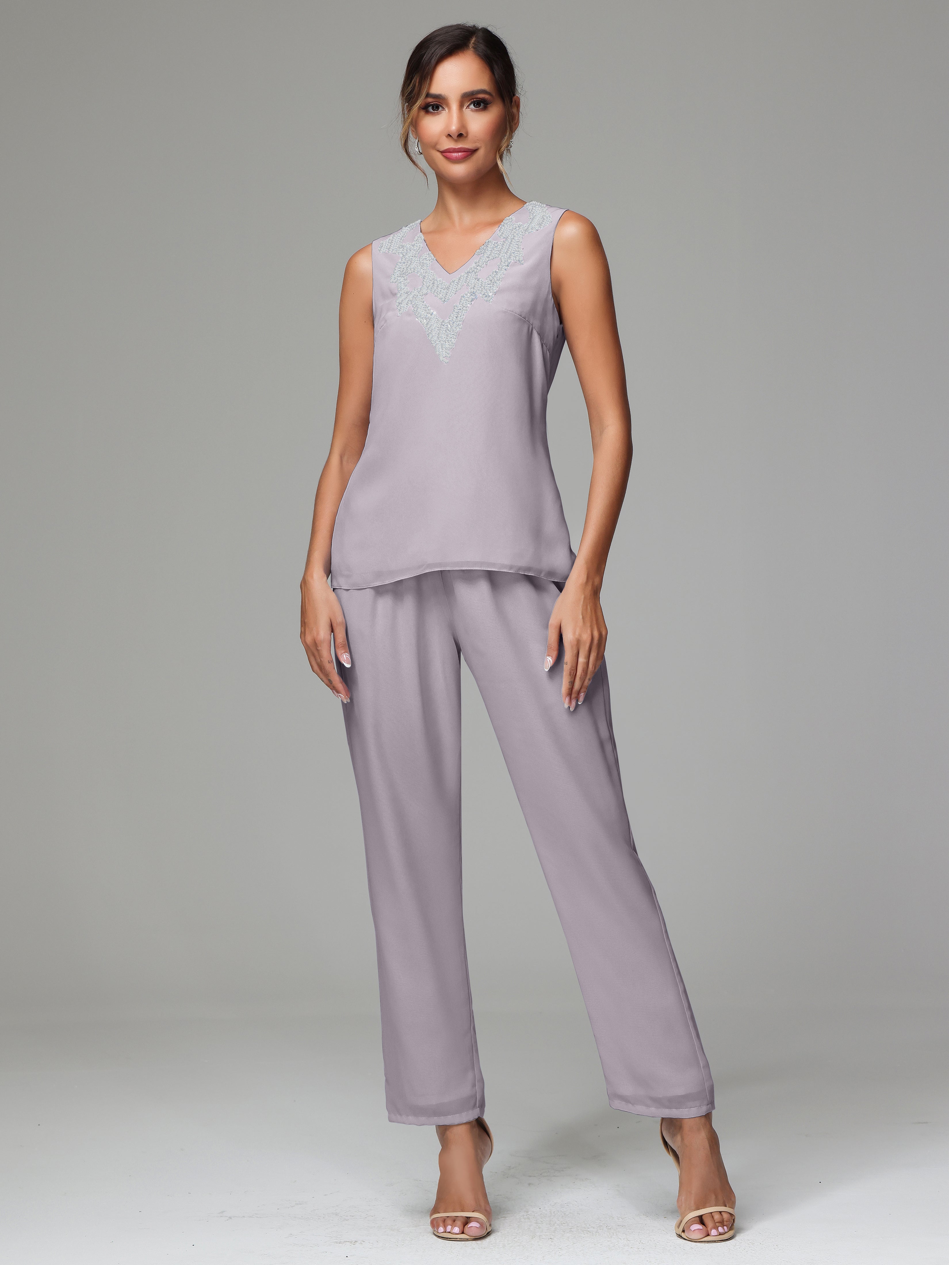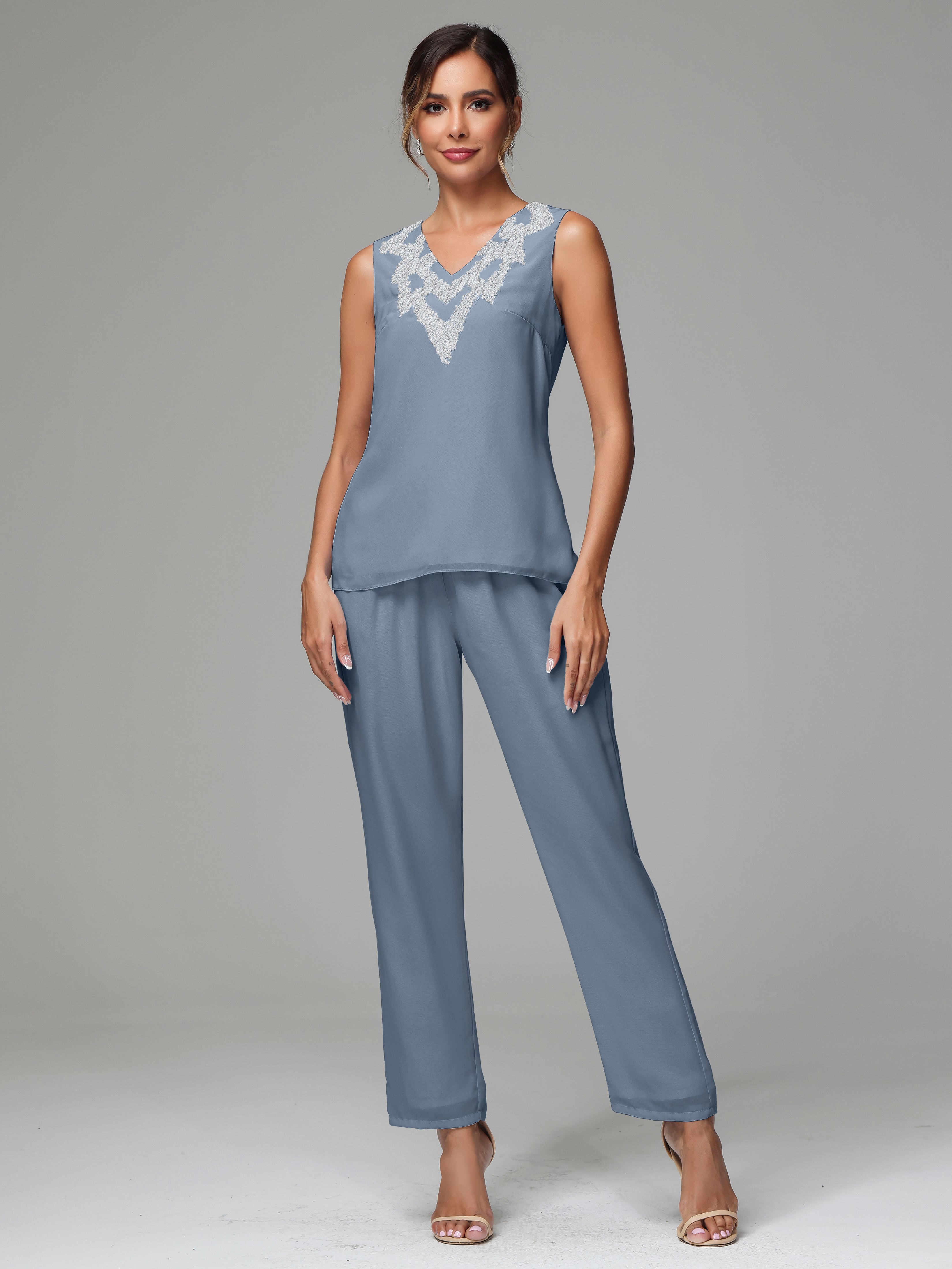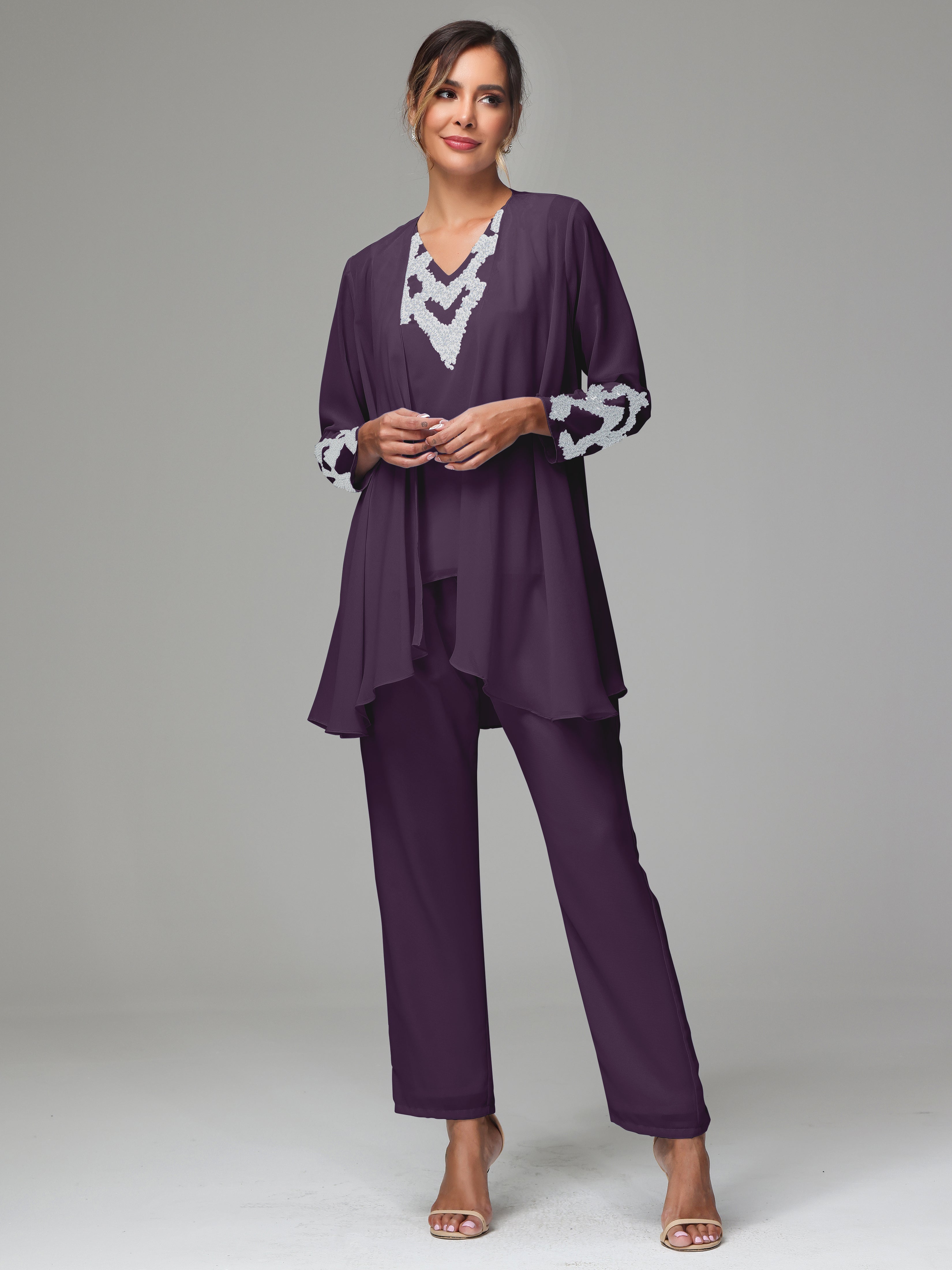 3 Pieces Long Sleeves Chiffon Lace Mother Of The Bride Dress Pants Suits with Silver Sequins