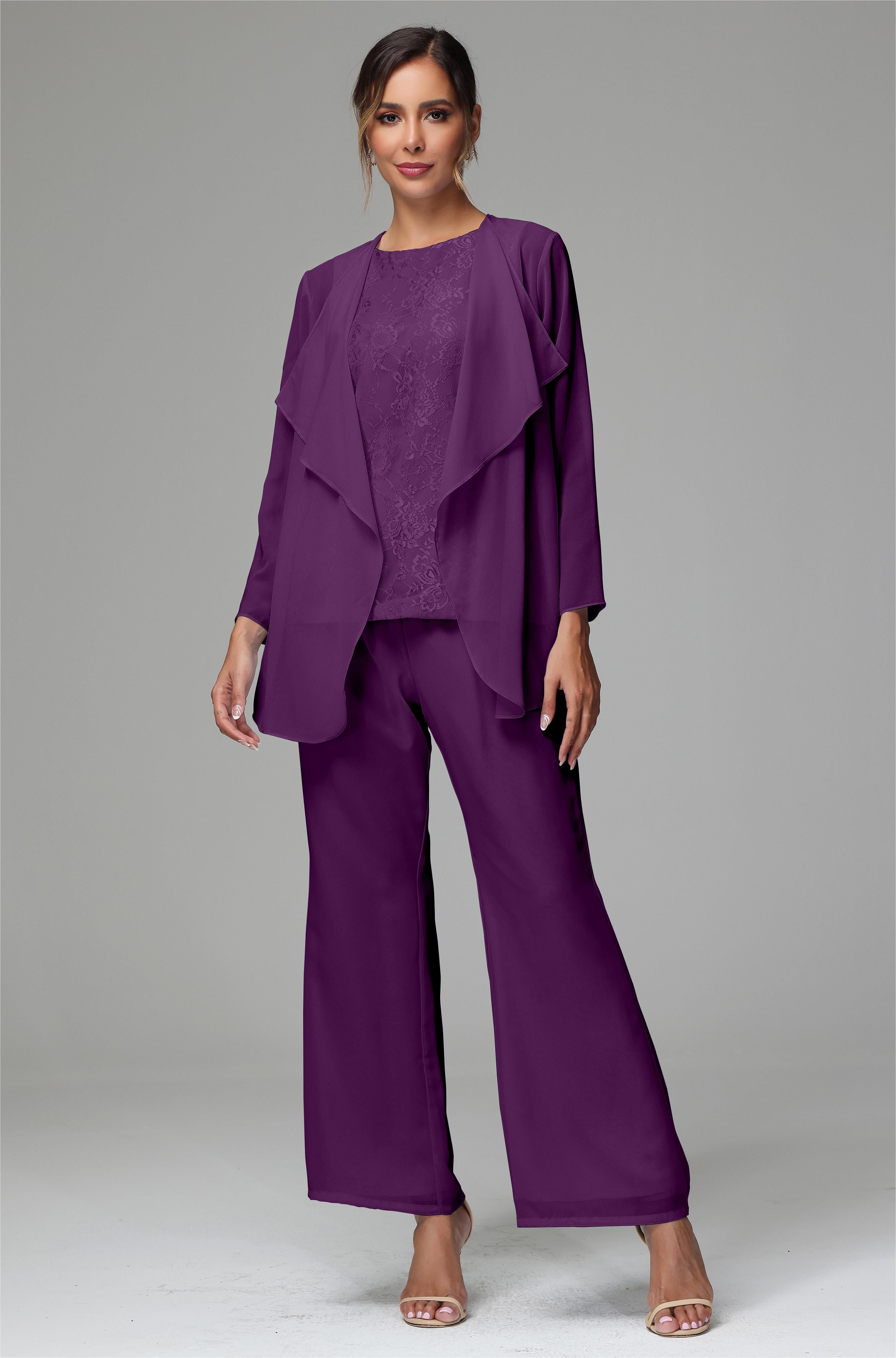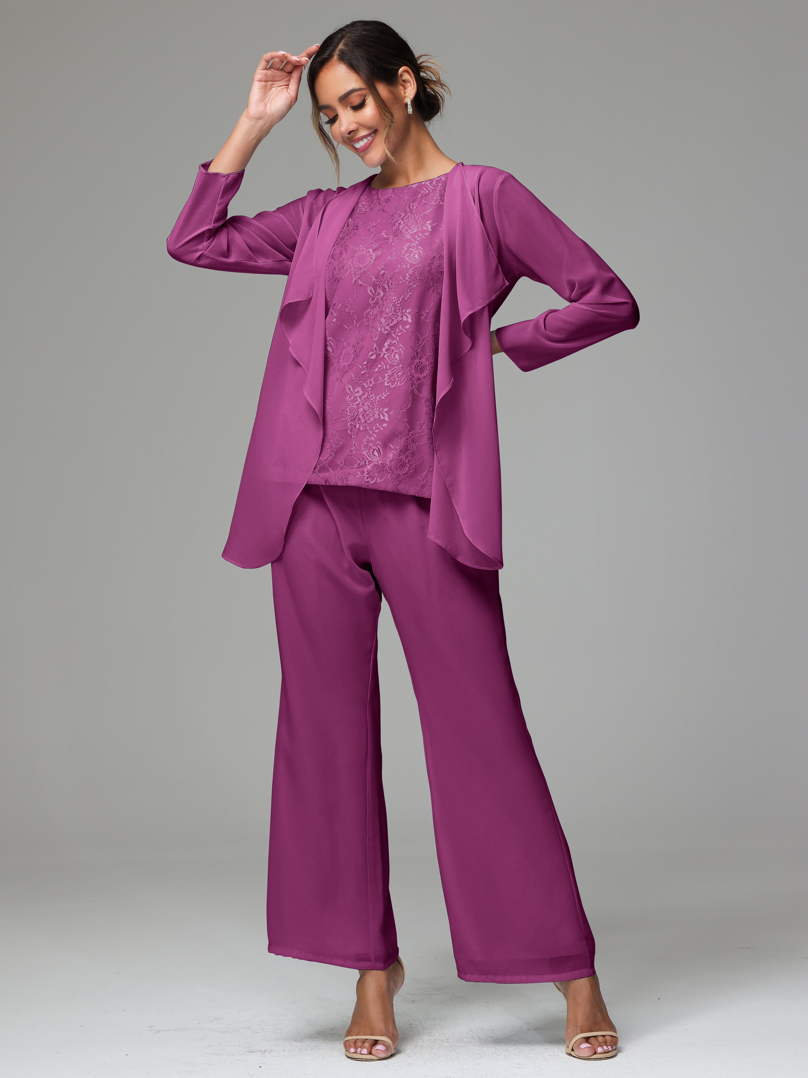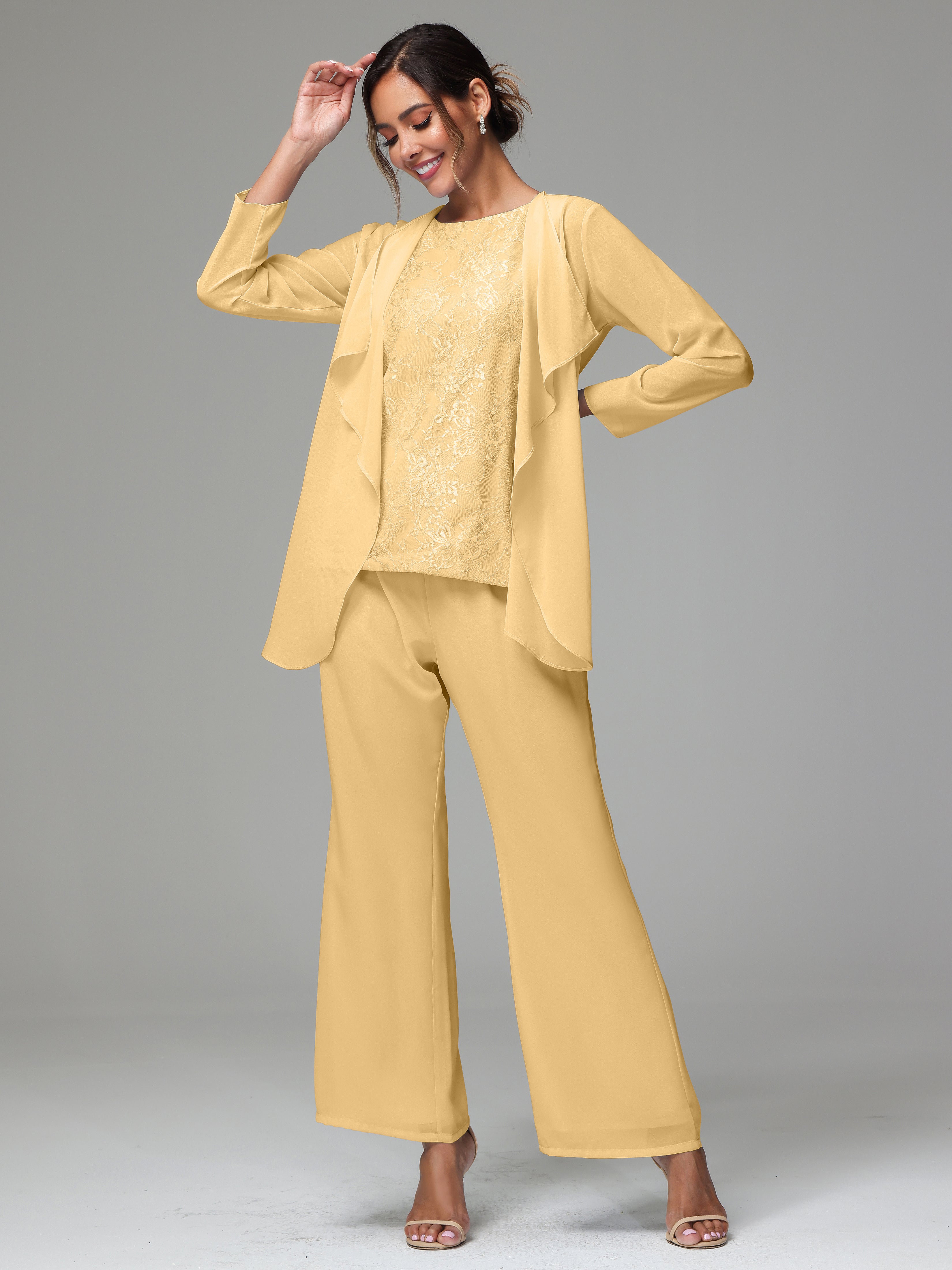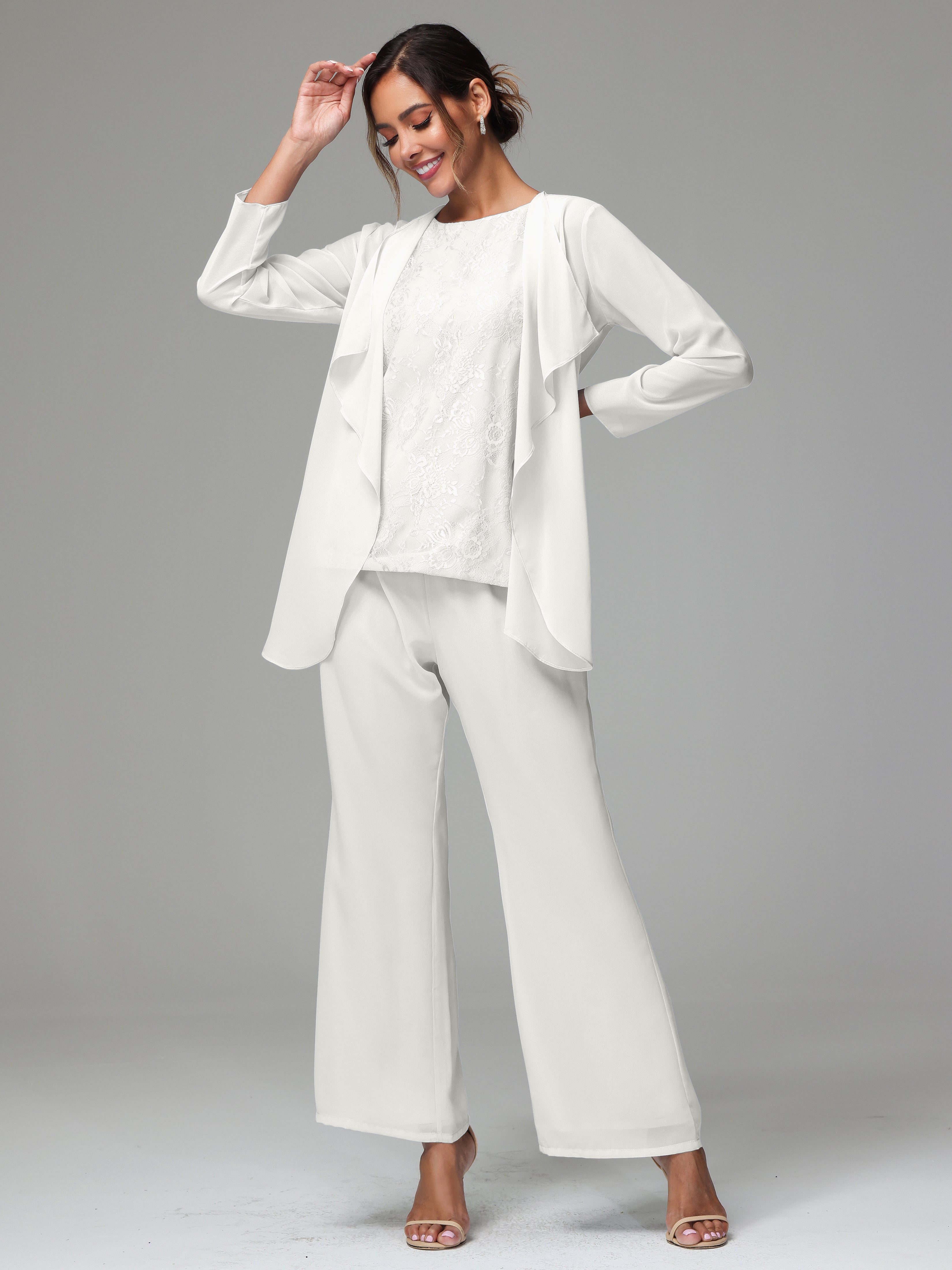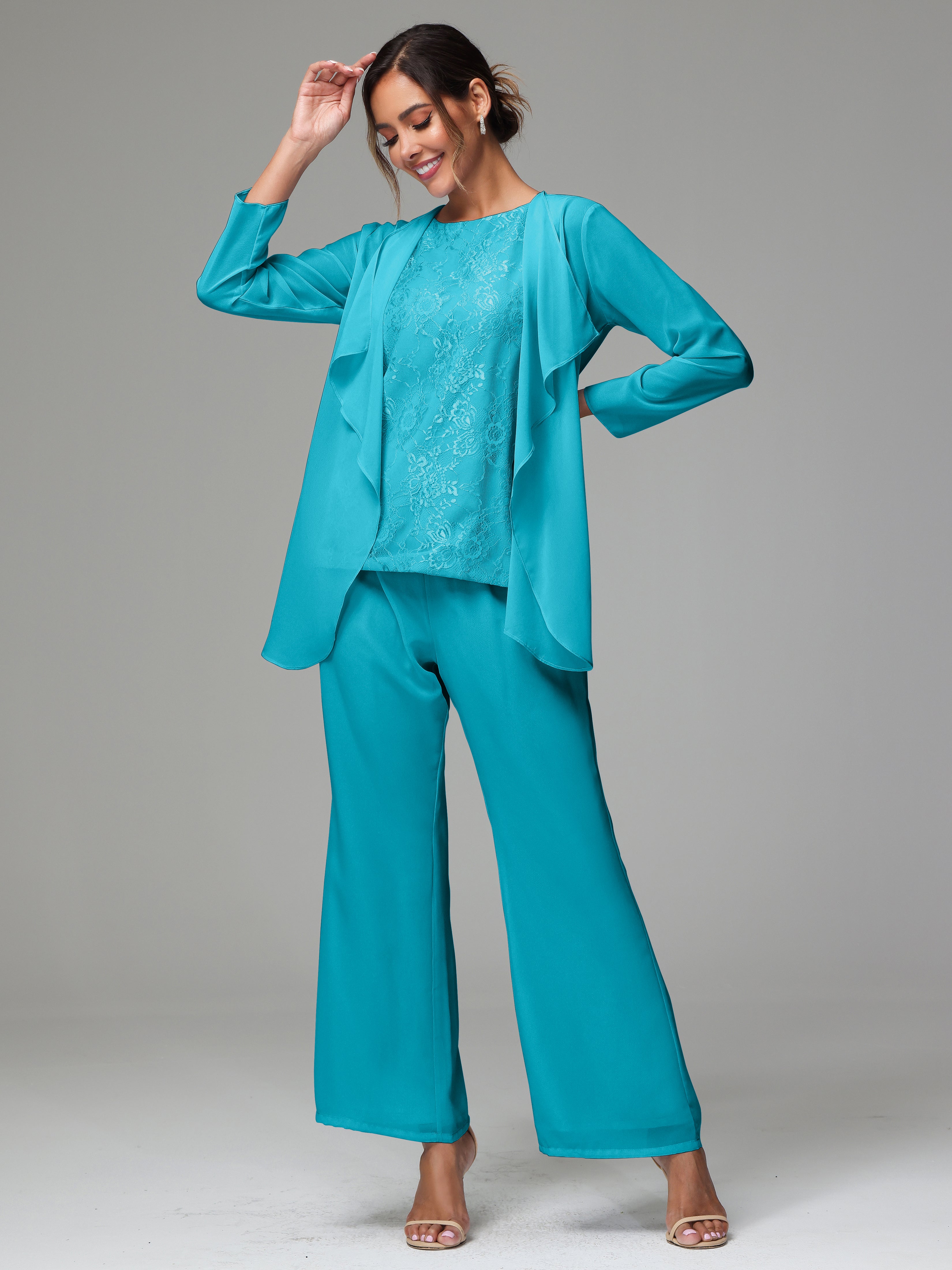 3 Pieces Long Sleeves Chiffon Lace Mother Of The Bride Dress Pants Suits