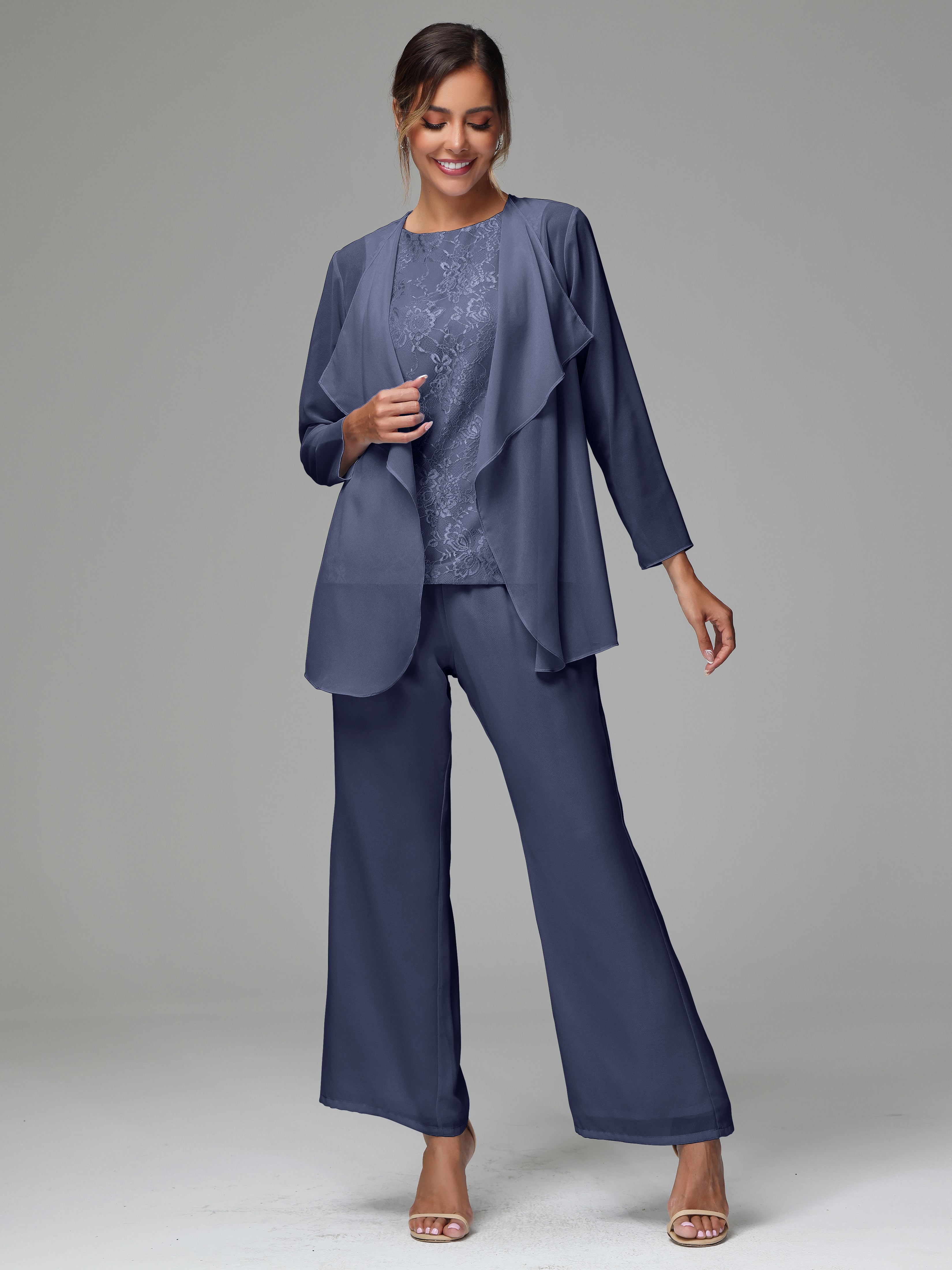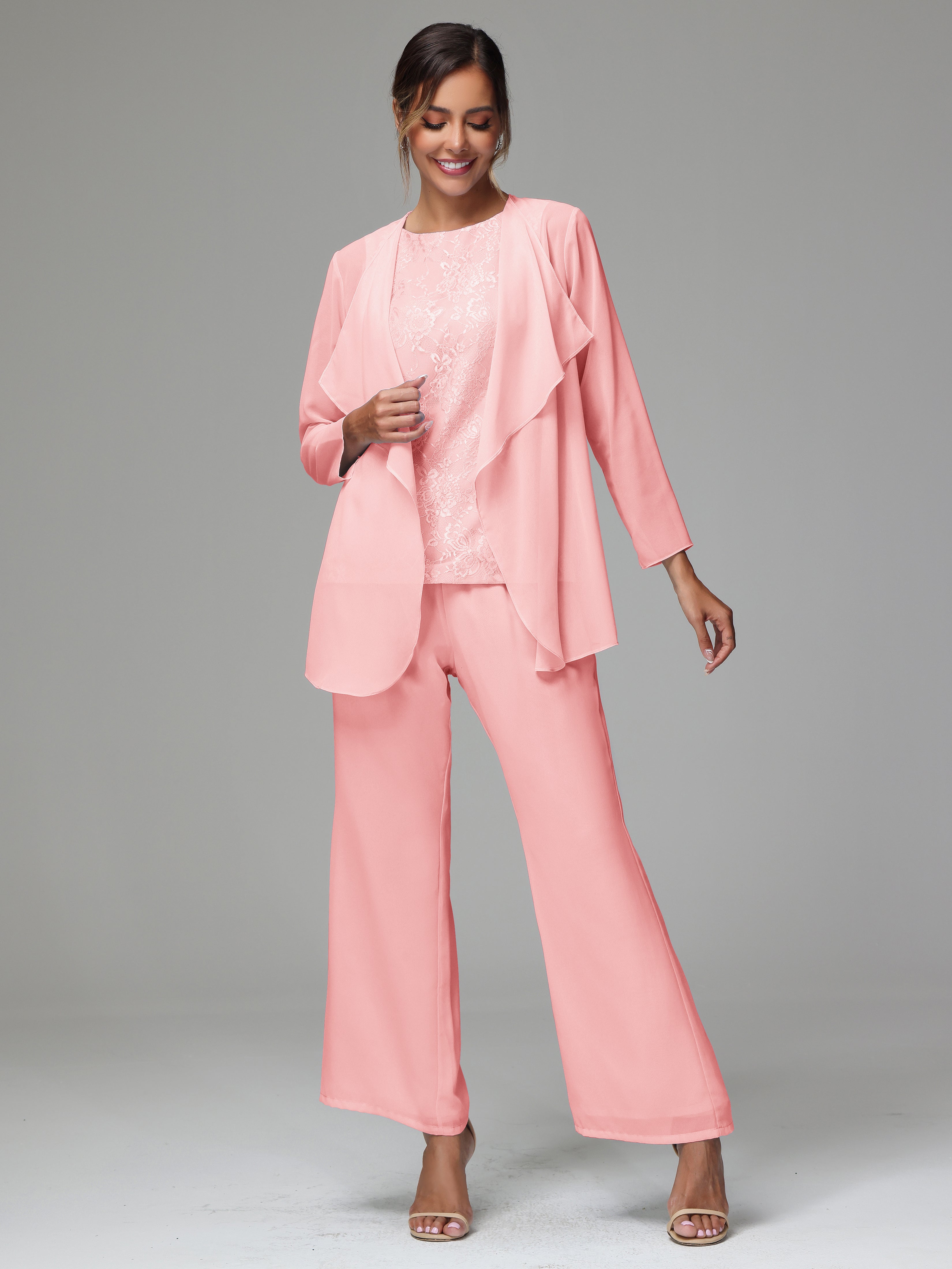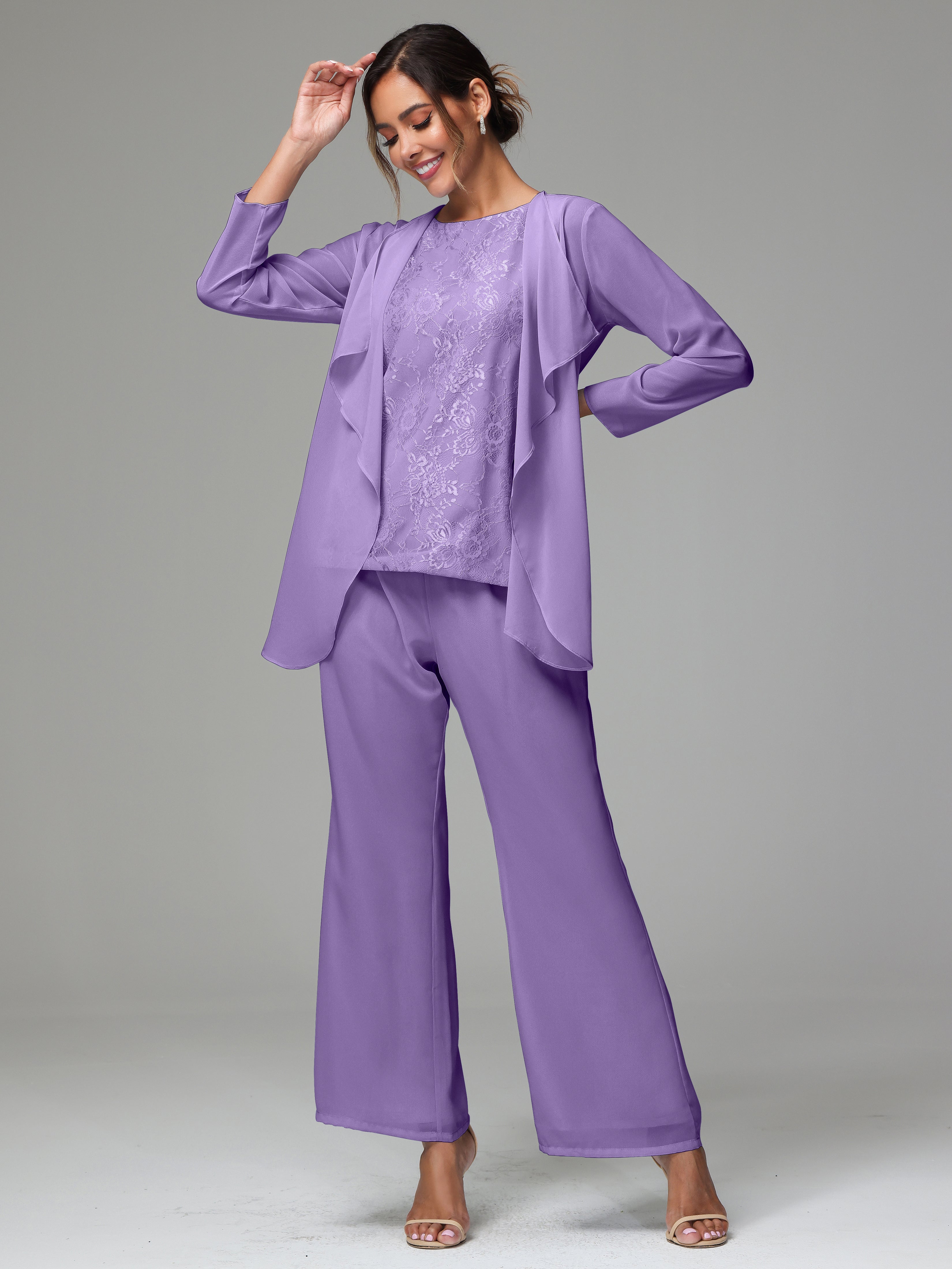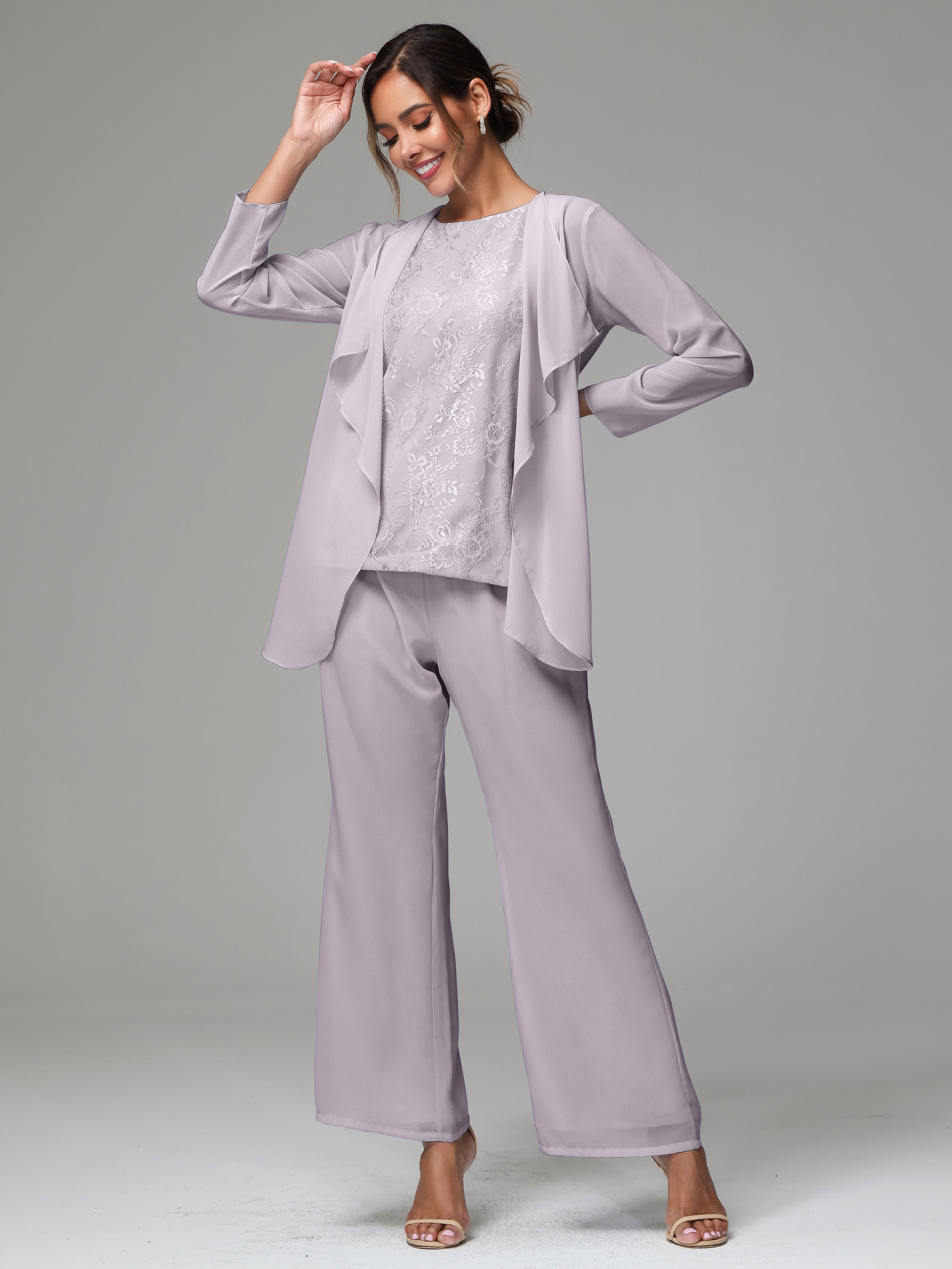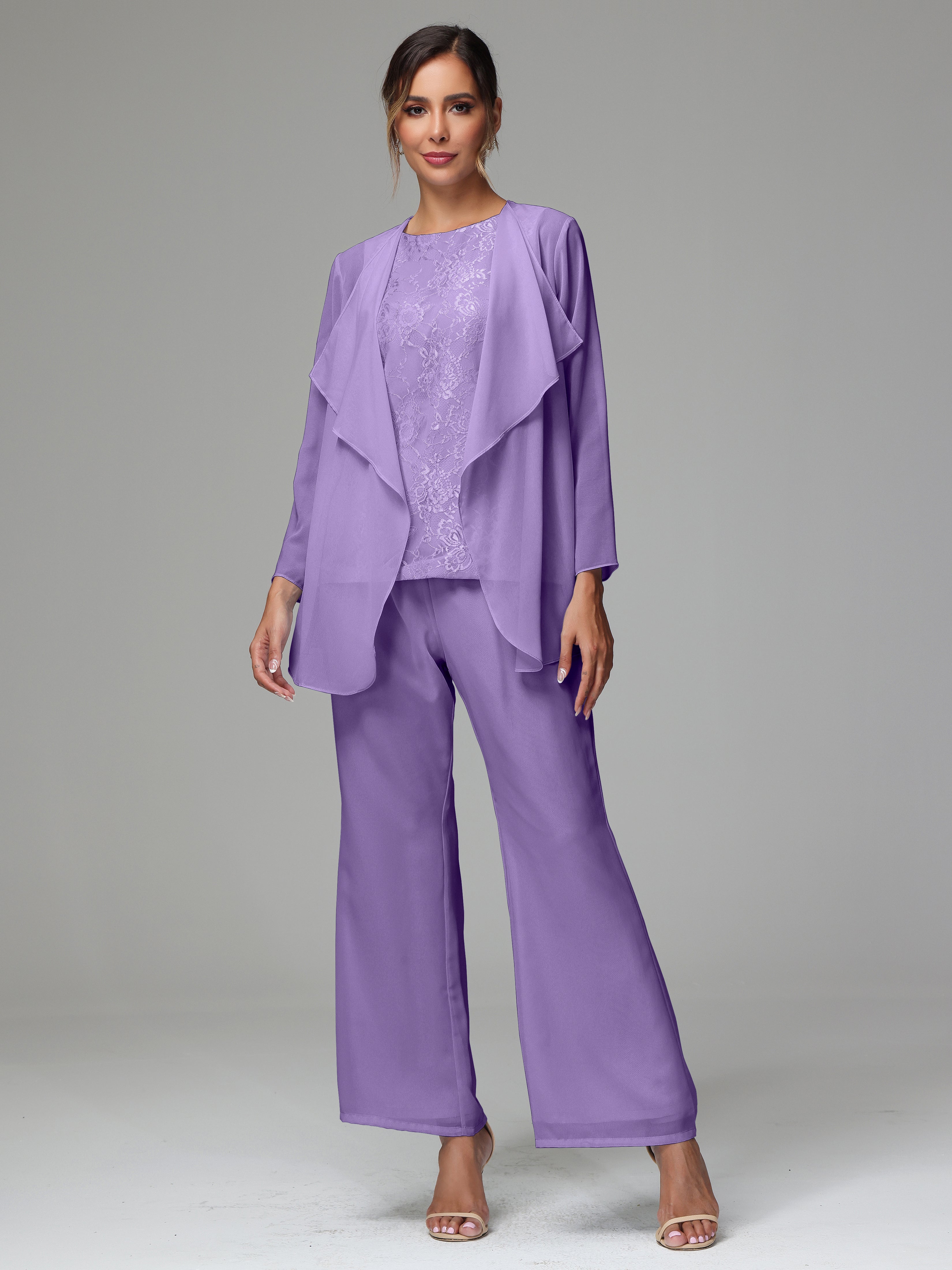 3 Pieces Long Sleeves Chiffon Lace Mother Of The Bride Dress Pants Suits