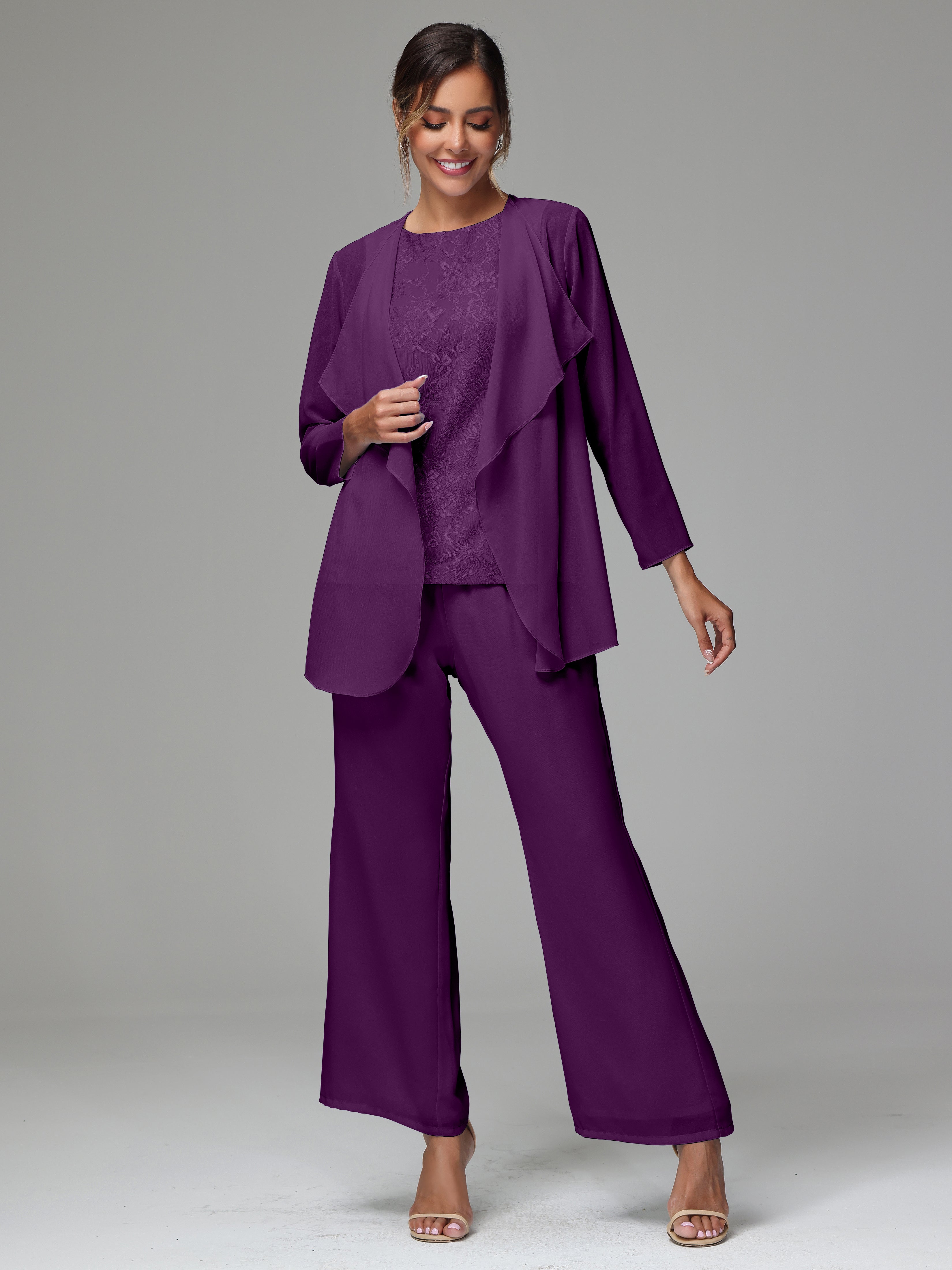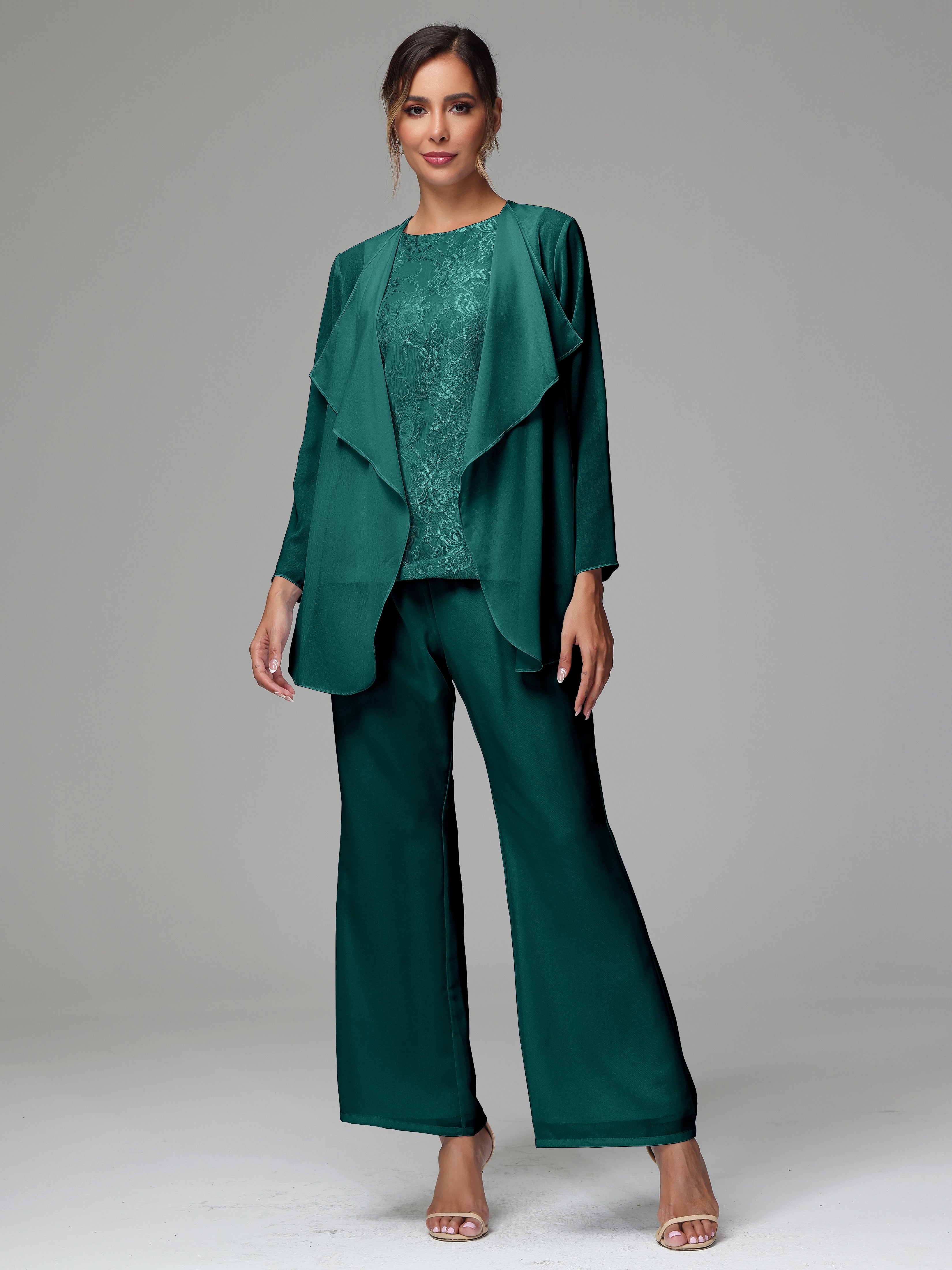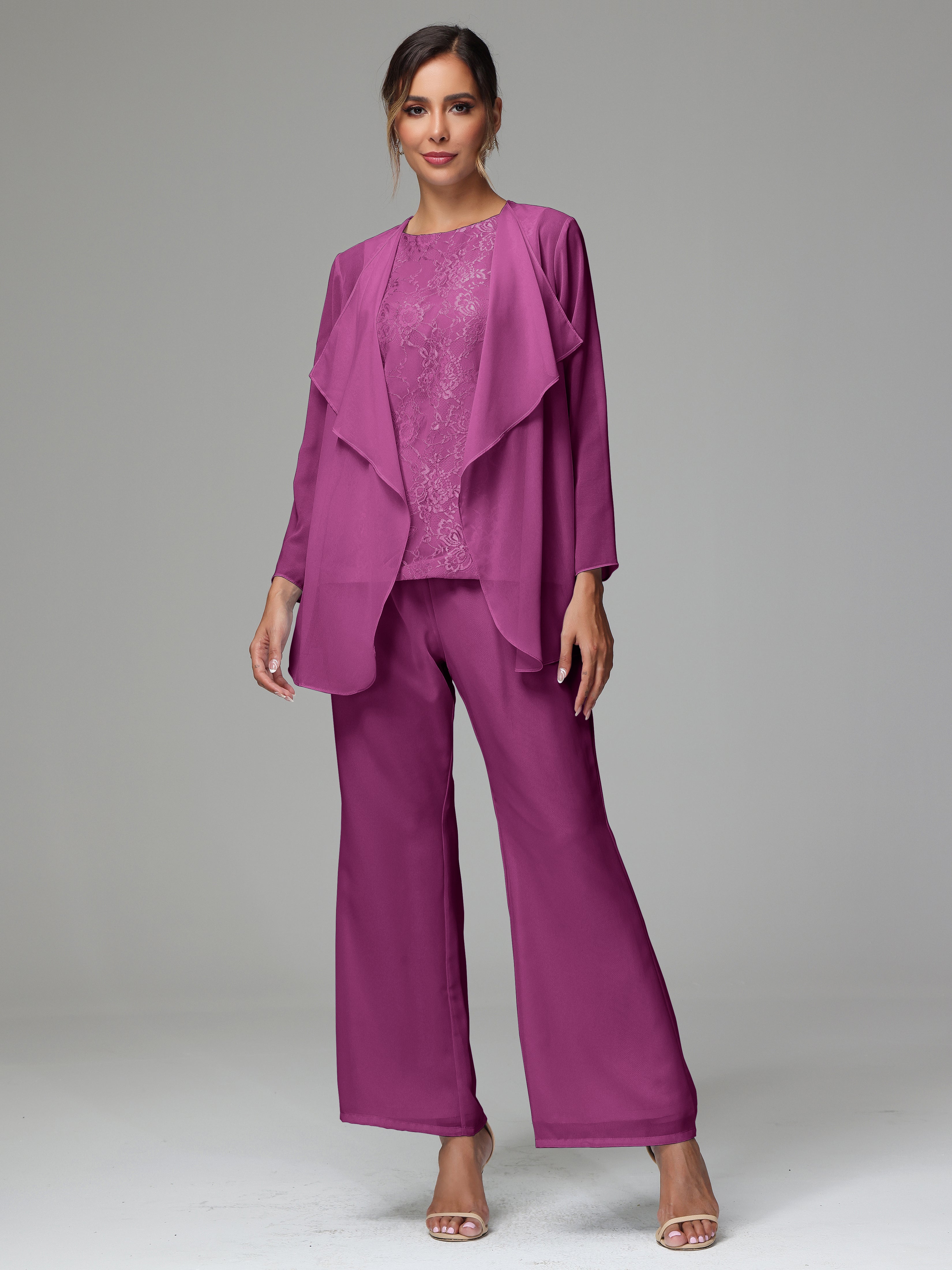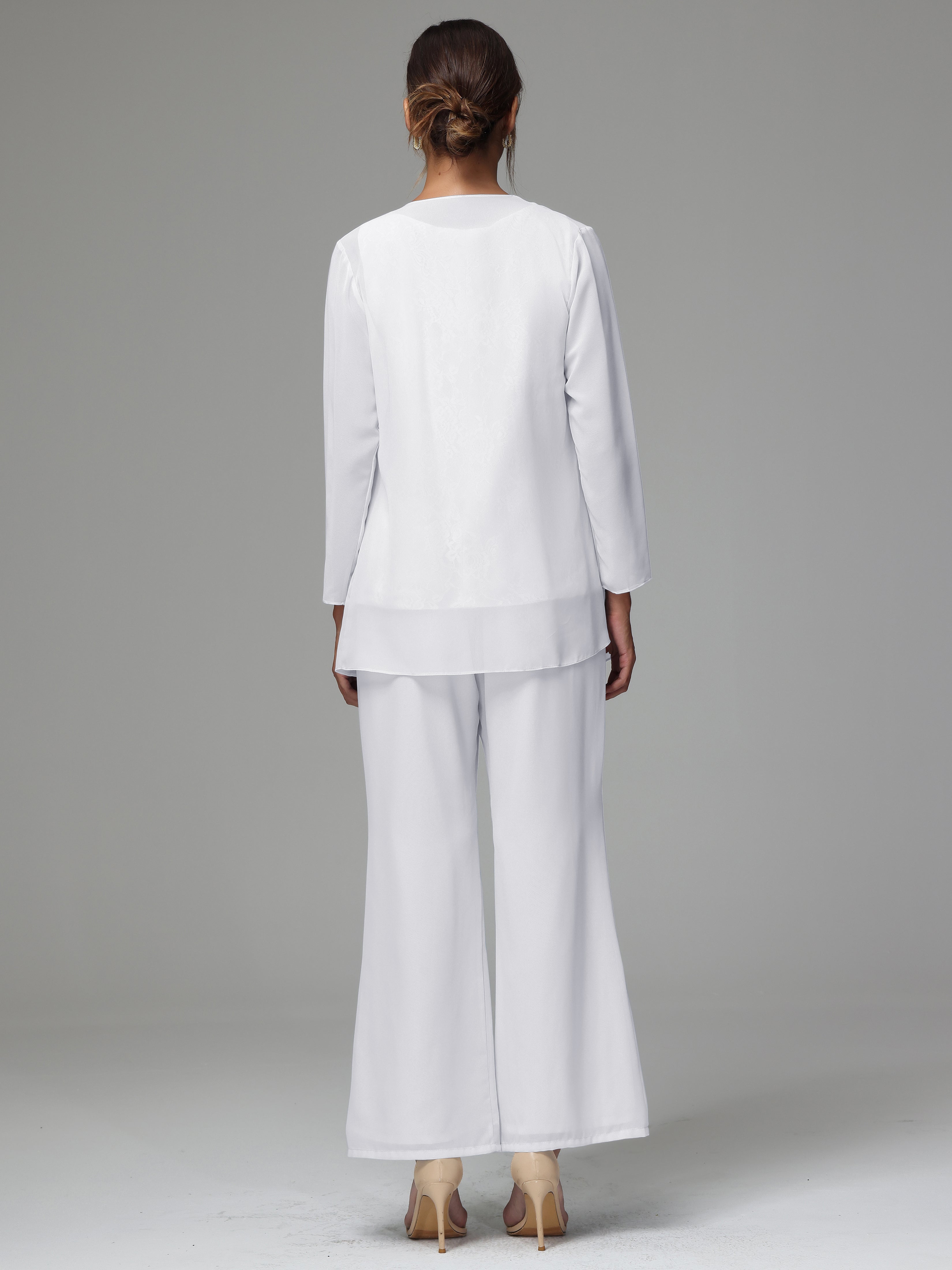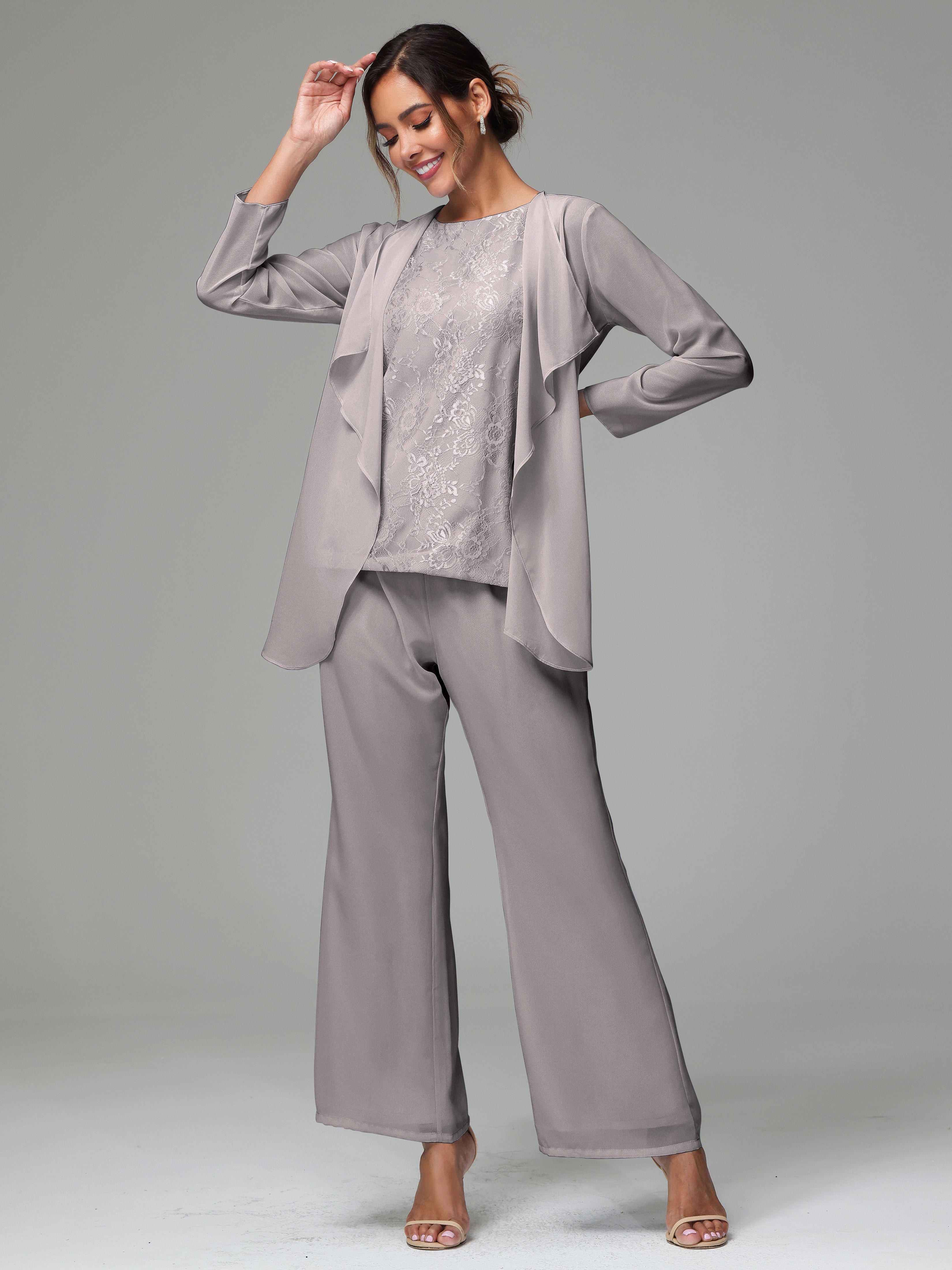 3 Pieces Long Sleeves Chiffon Lace Mother Of The Bride Dress Pants Suits