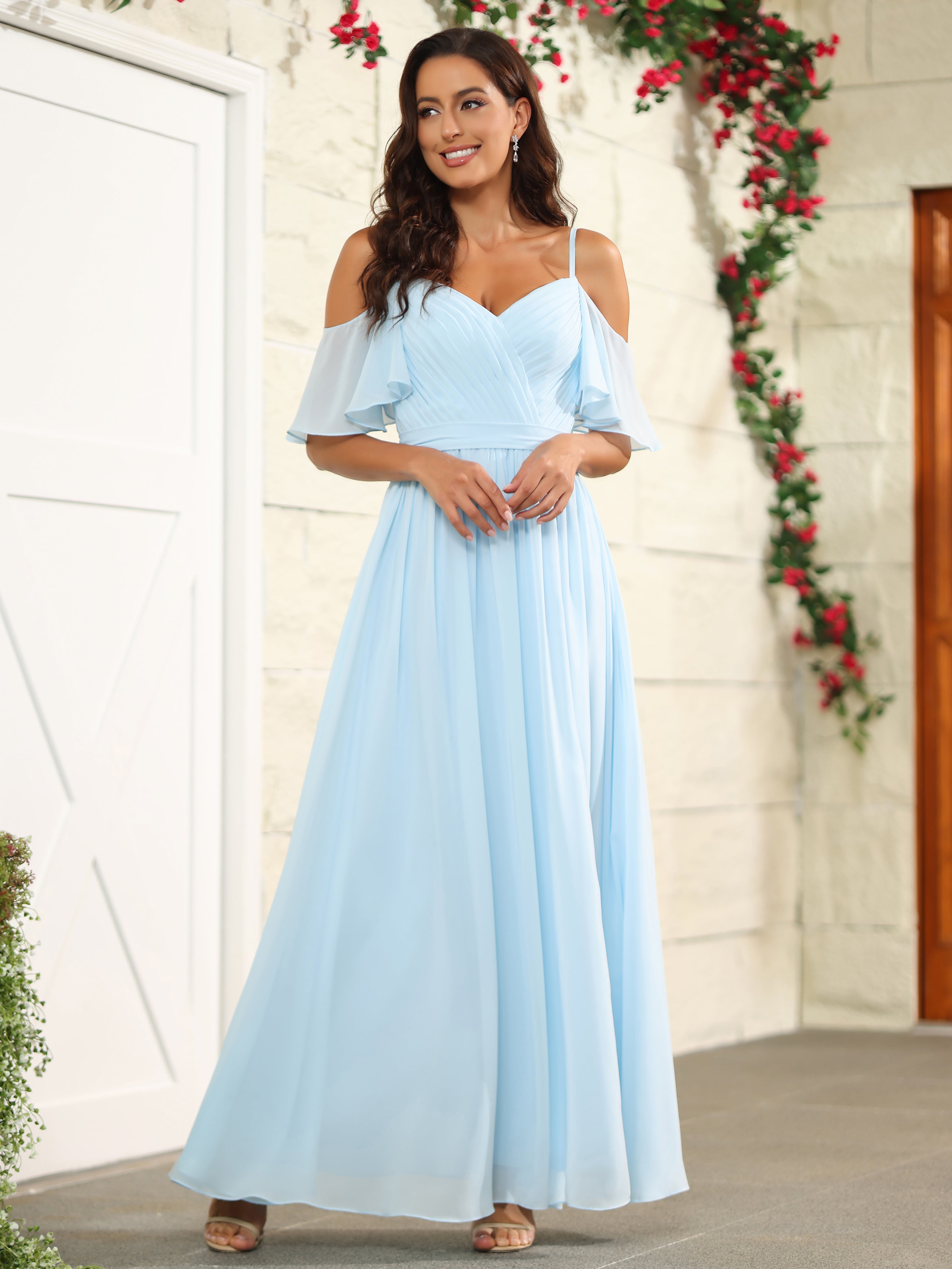 This A Line Chiffon Wedding Guest Dress features an elegant off the shoulder design and a flattering slit. Made with high quality chiffon material, this dress offers a comfortable and stylish fit. Perfect for any wedding guest, this dress is a must-have addition to your wardrobe.
