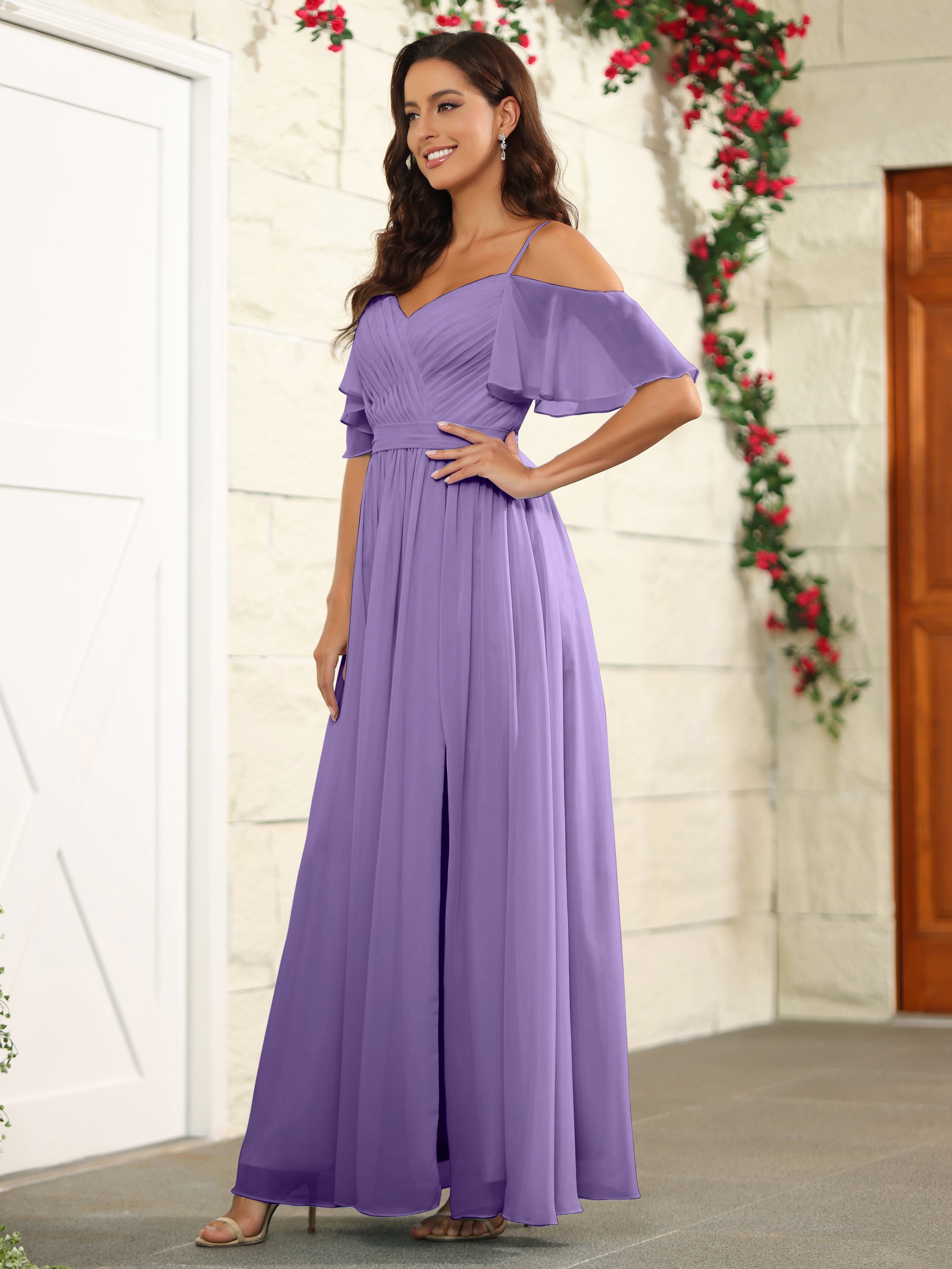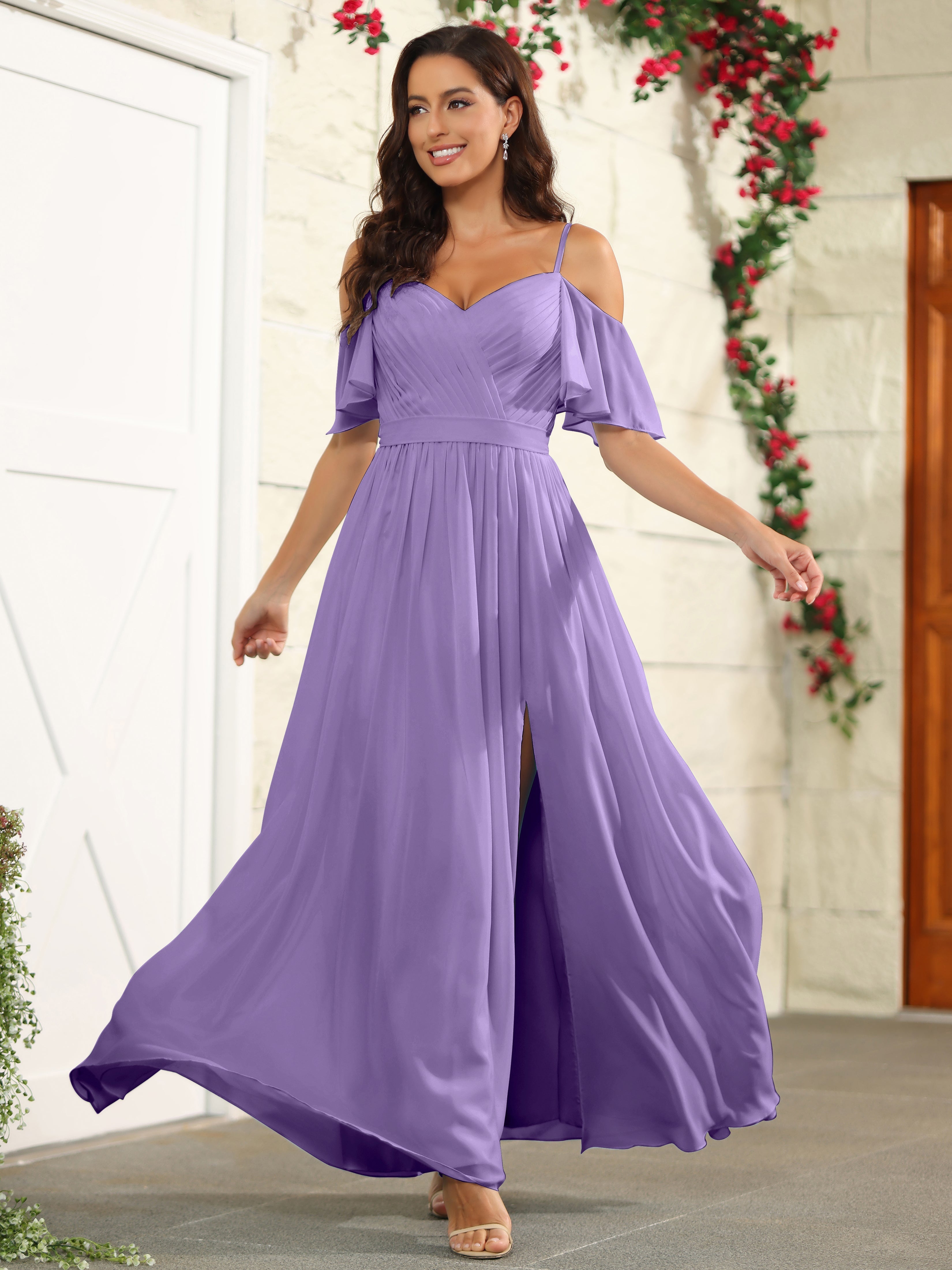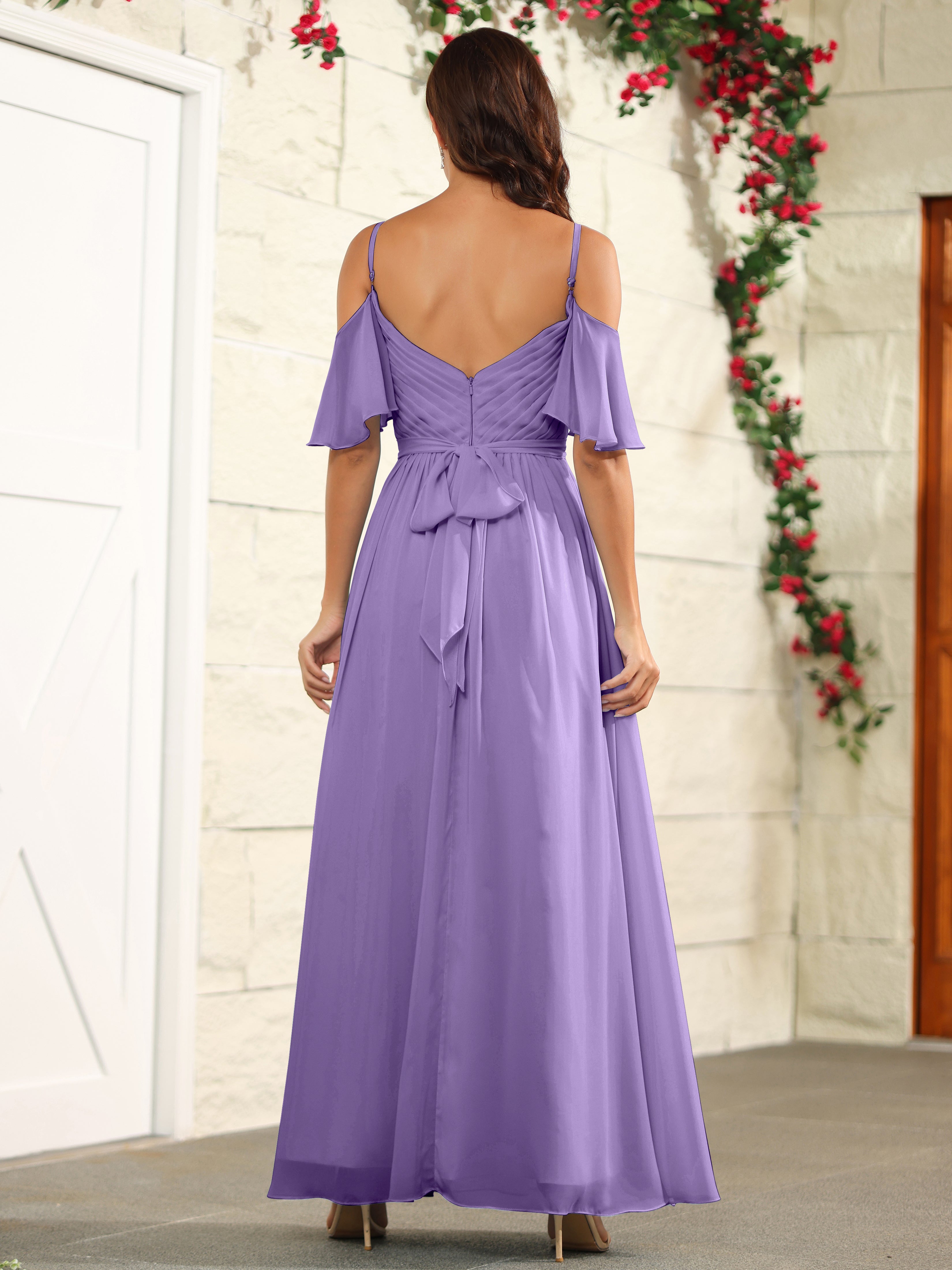 Step out in style with our A Line Off The Shoulder Chiffon Long Bridesmaid Dress with Slit. The perfect blend of elegance and comfort, this dress features an off-the-shoulder design and a high slit for a modern twist. Made with lightweight chiffon fabric, it's the ideal choice for a bridesmaid dress.