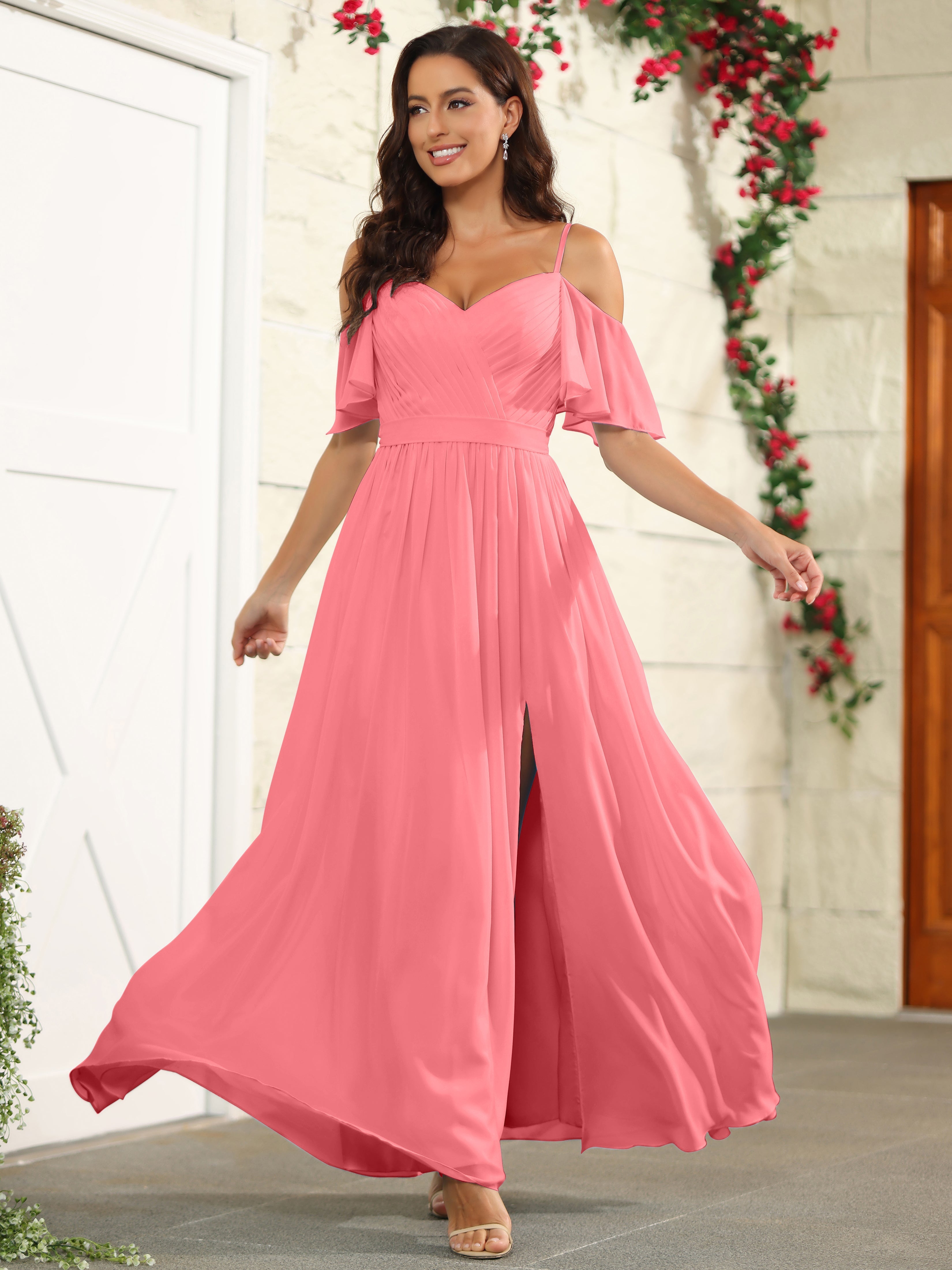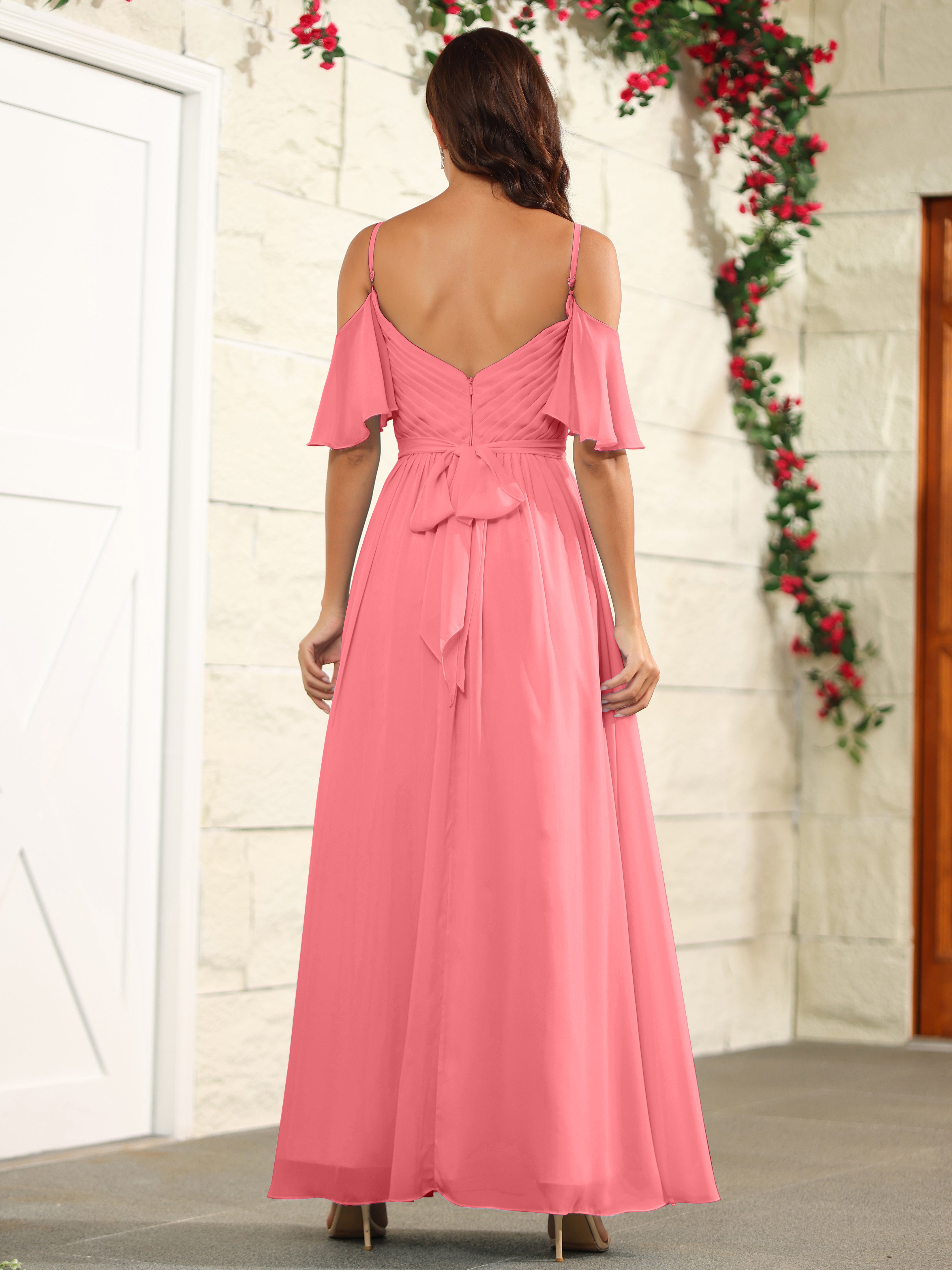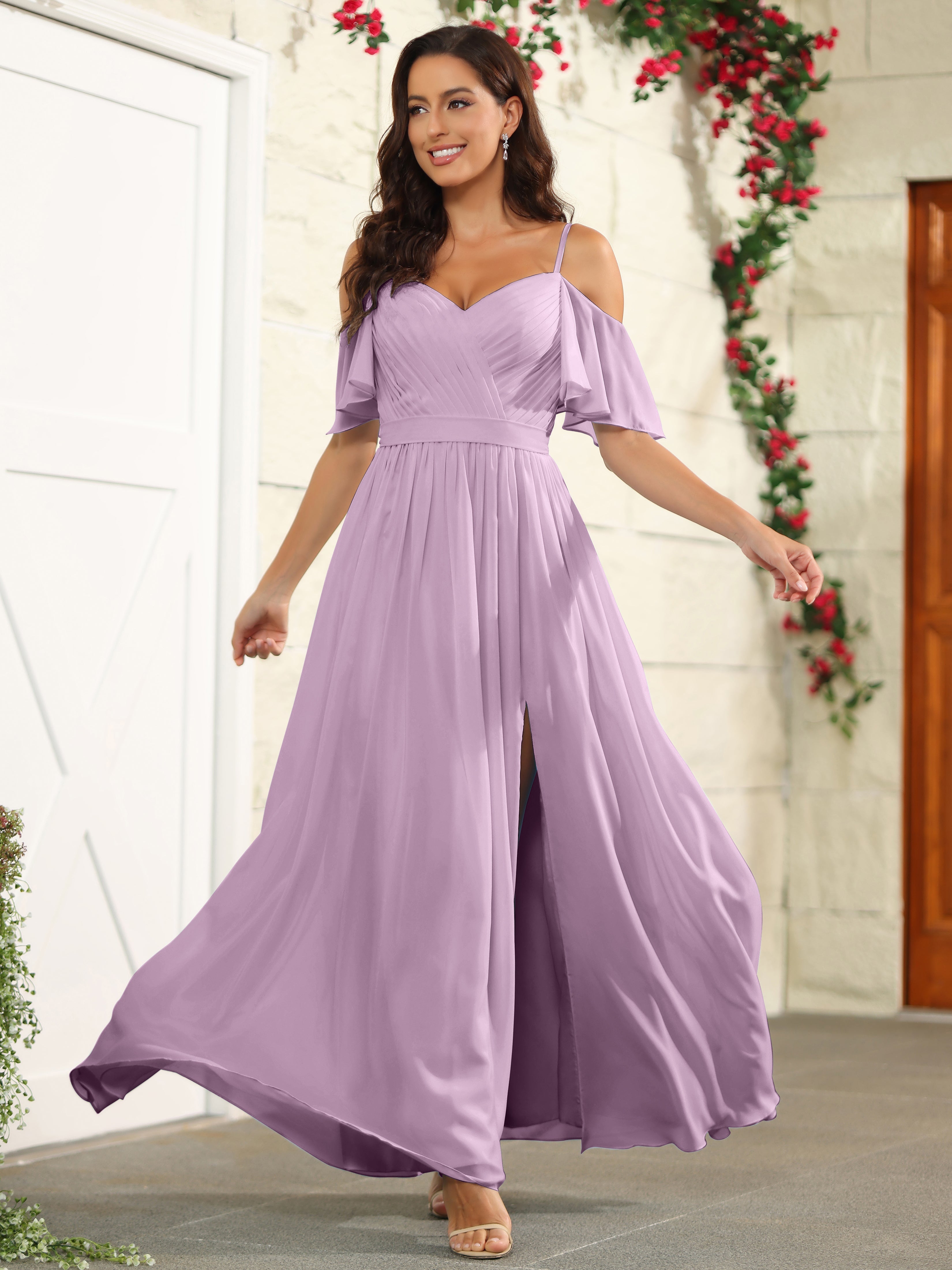 Step out in style with our A Line Off The Shoulder Chiffon Long Bridesmaid Dress with Slit. The perfect blend of elegance and comfort, this dress features an off-the-shoulder design and a high slit for a modern twist. Made with lightweight chiffon fabric, it's the ideal choice for a bridesmaid dress.