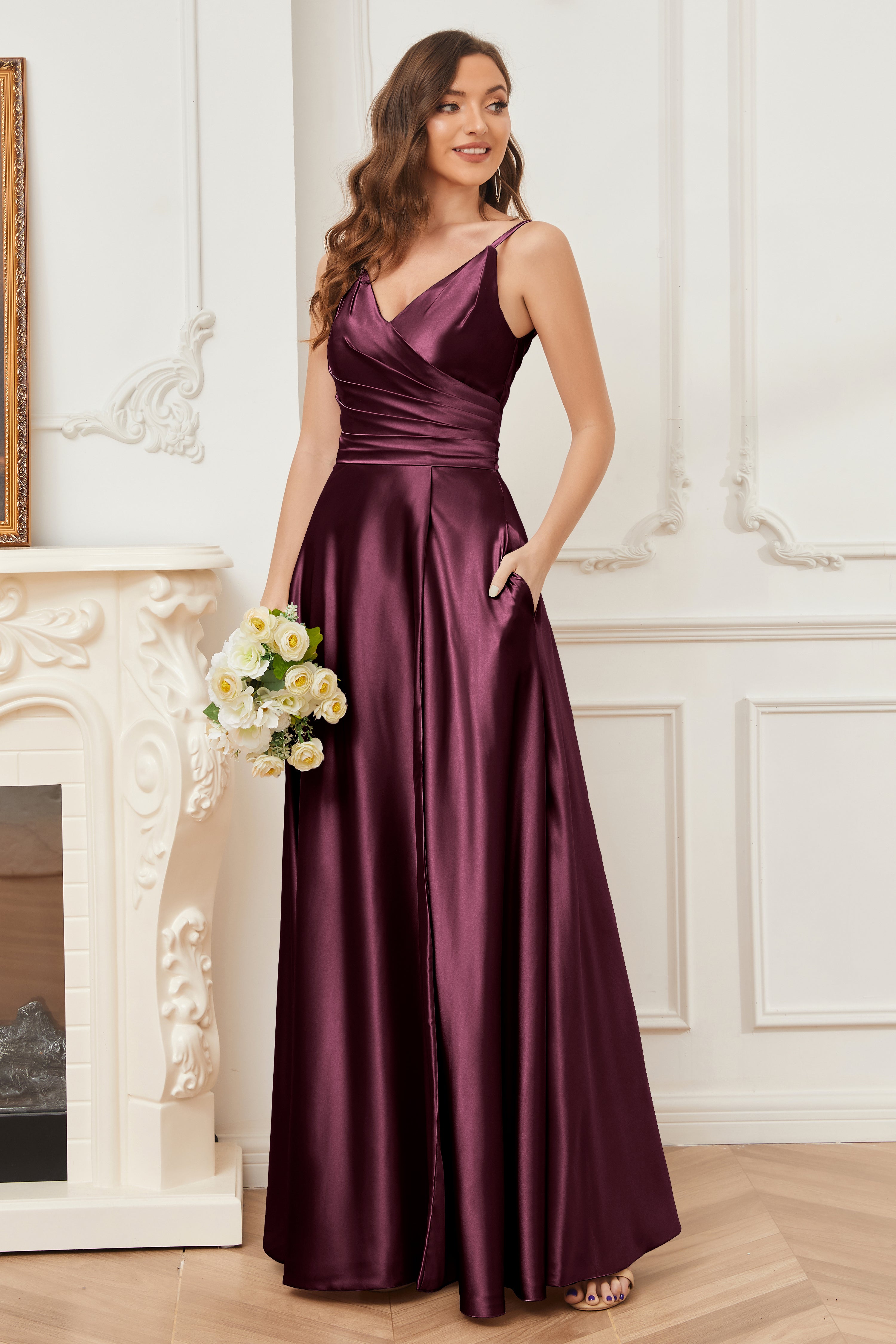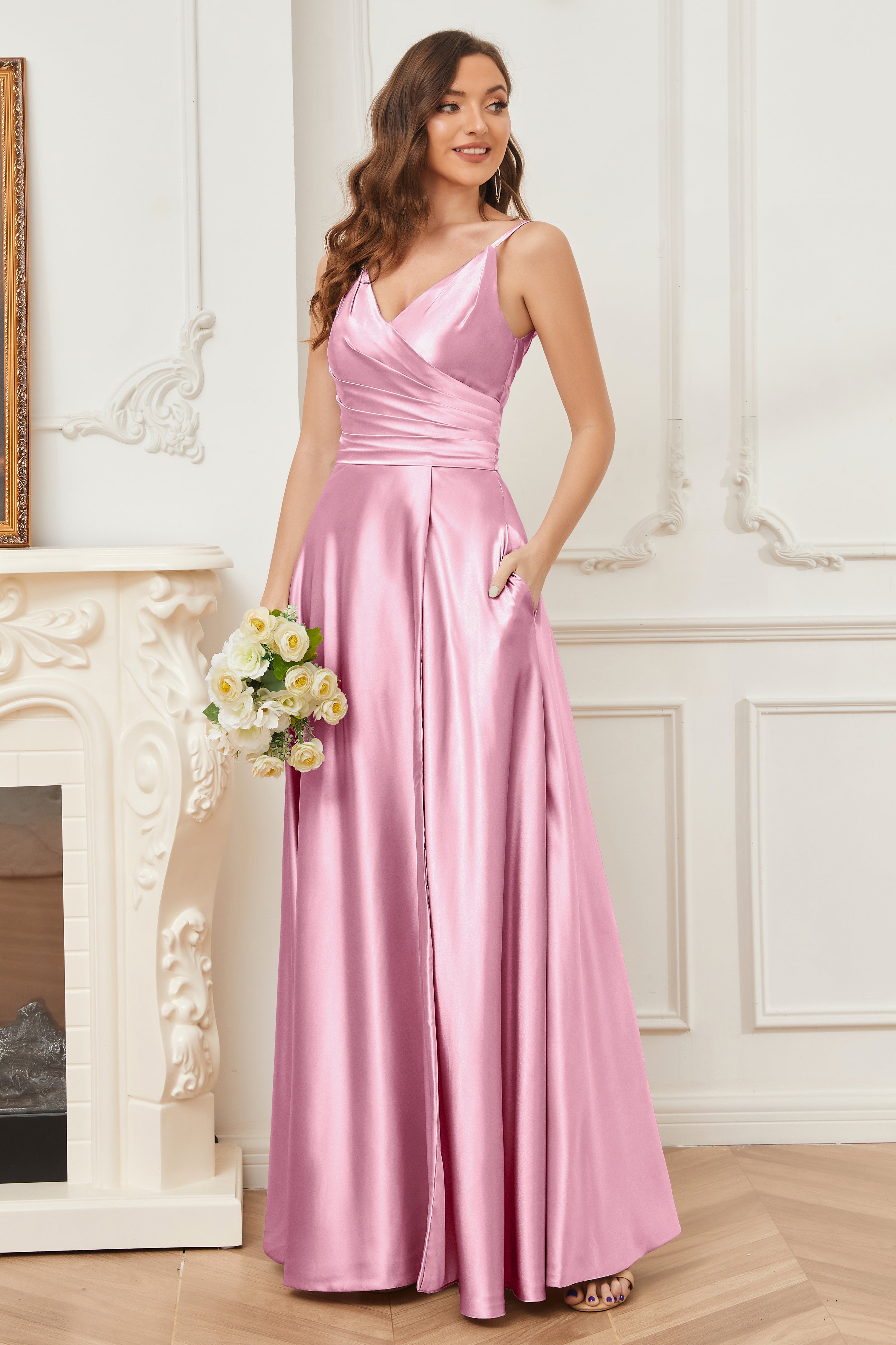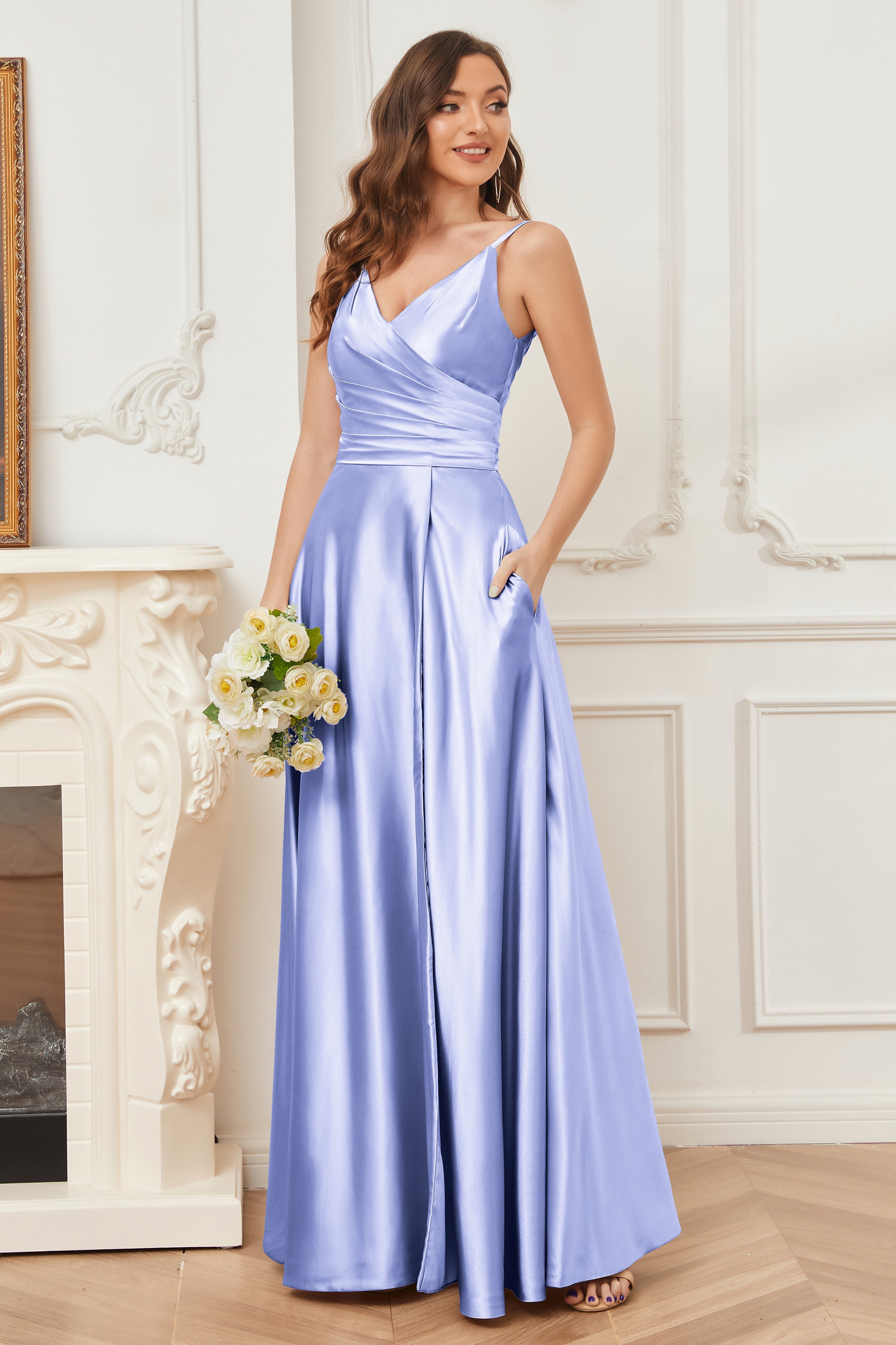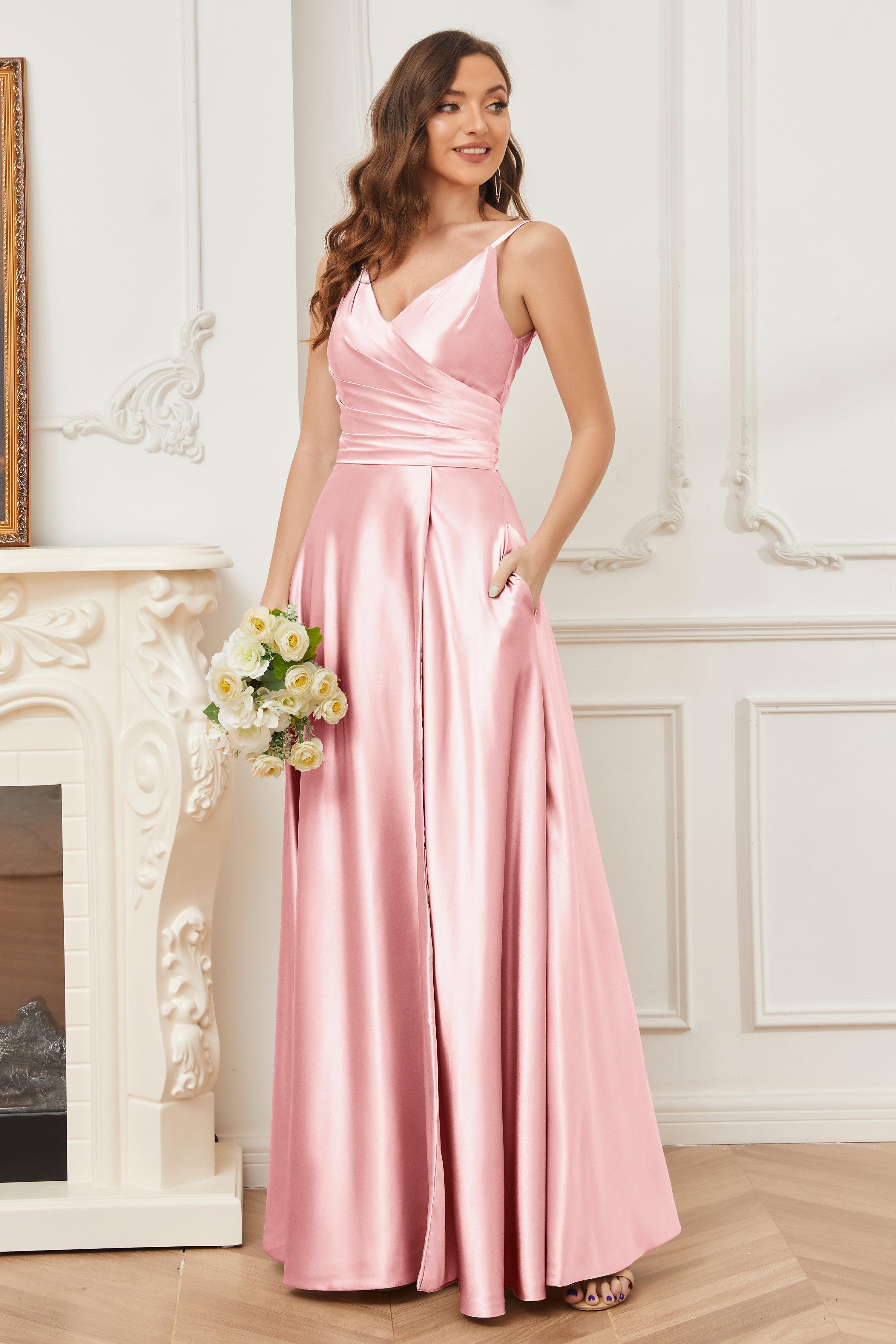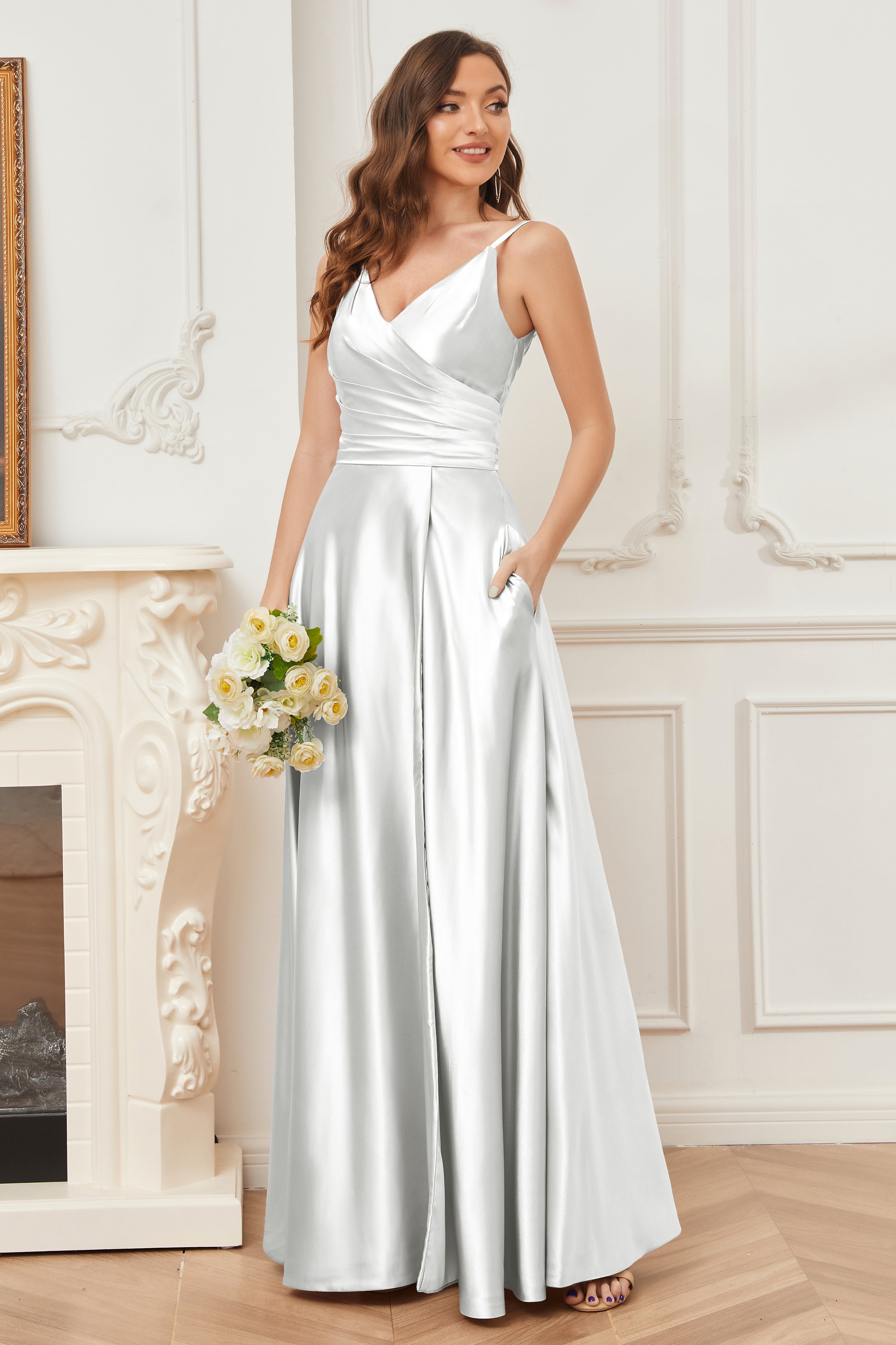 A-line V-neck Soft Satin Long Bridesmaid Dress with Pockets