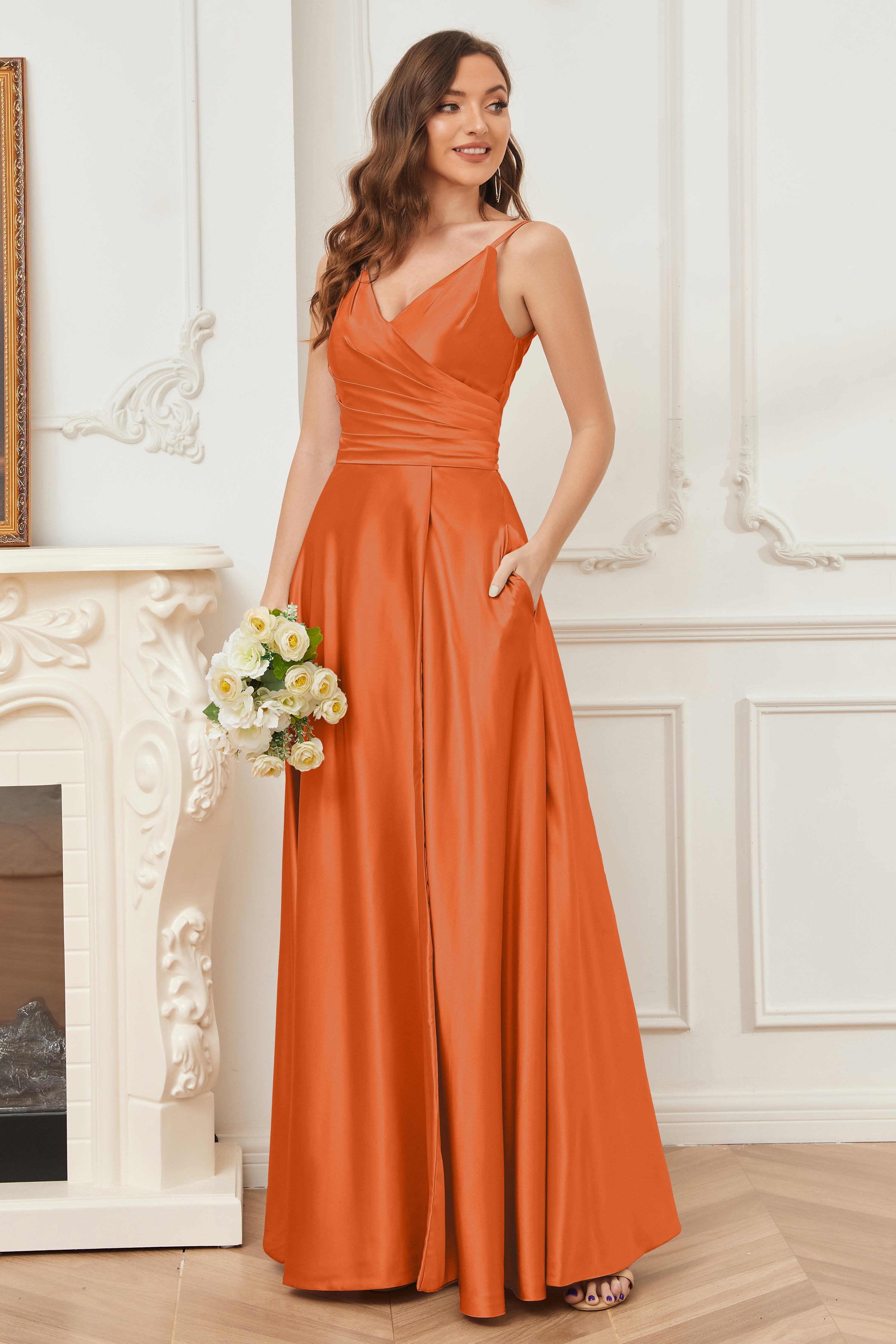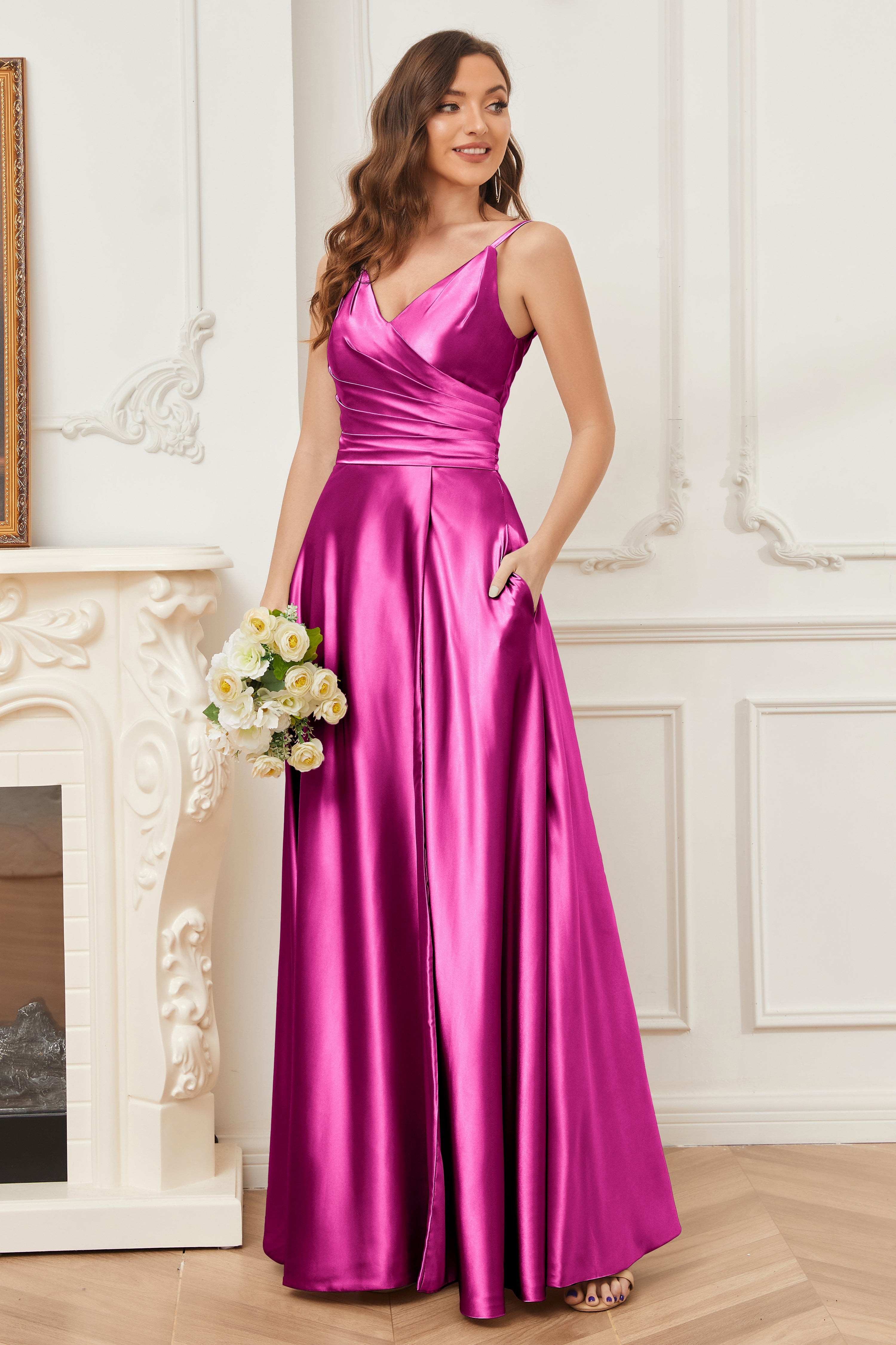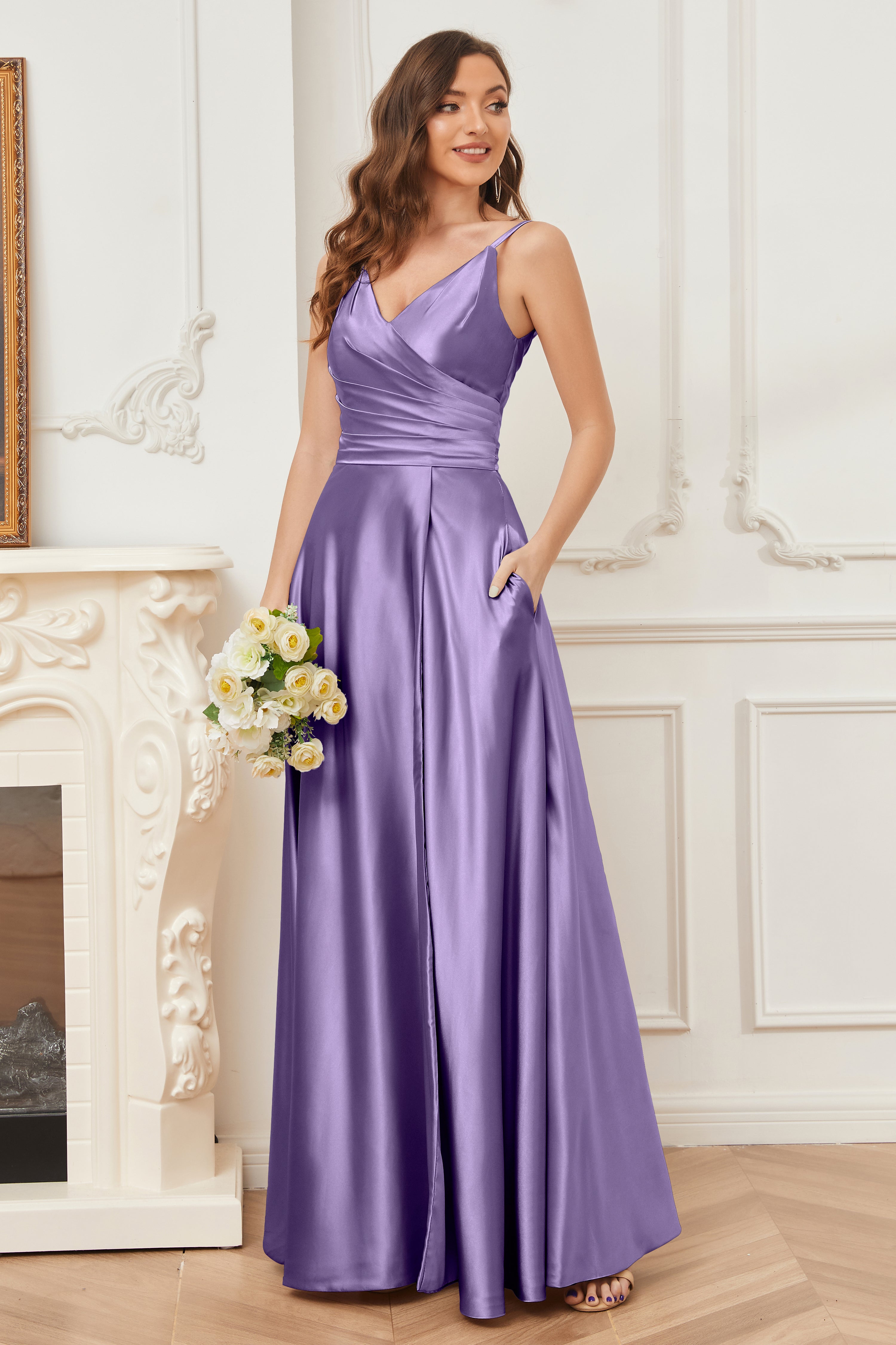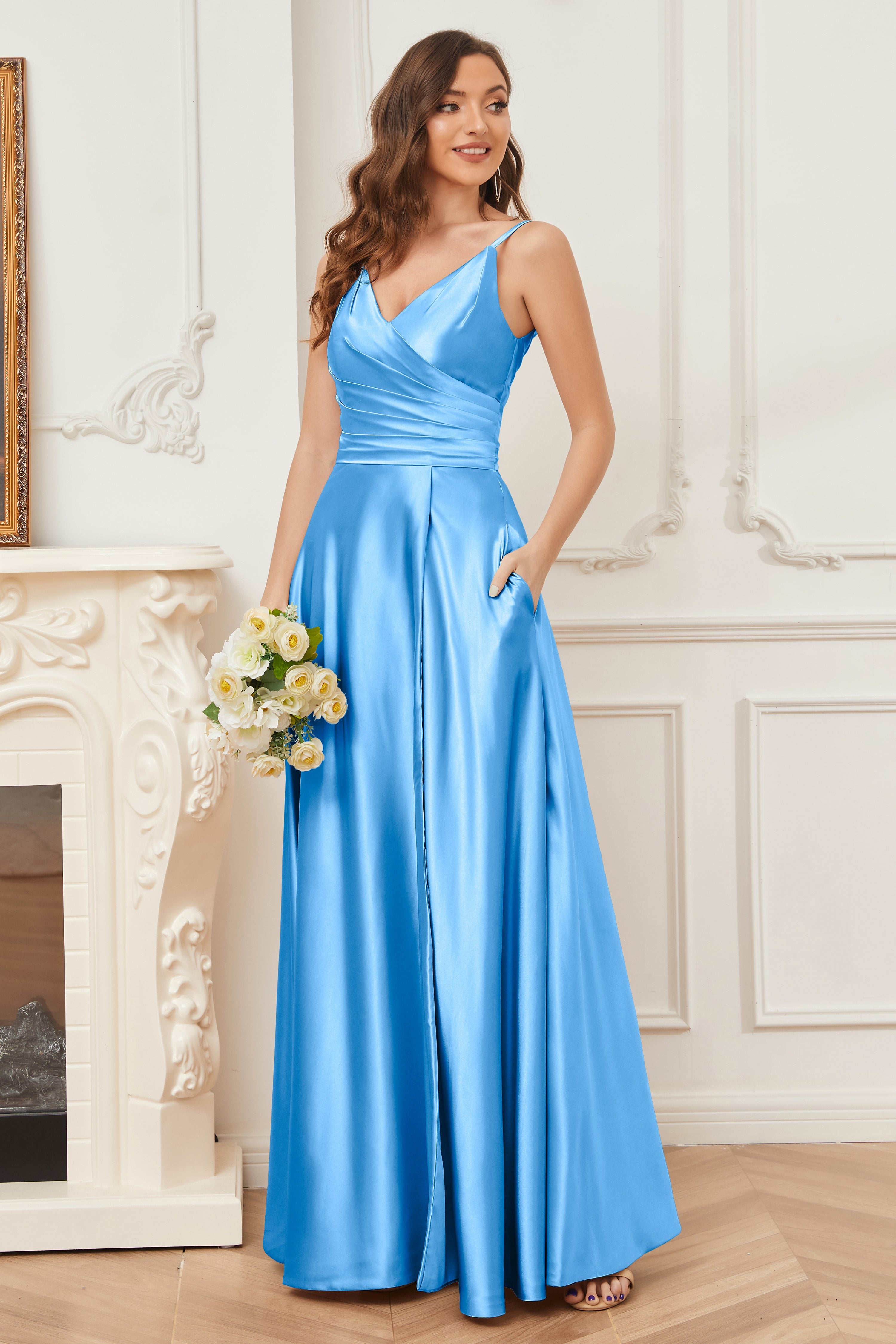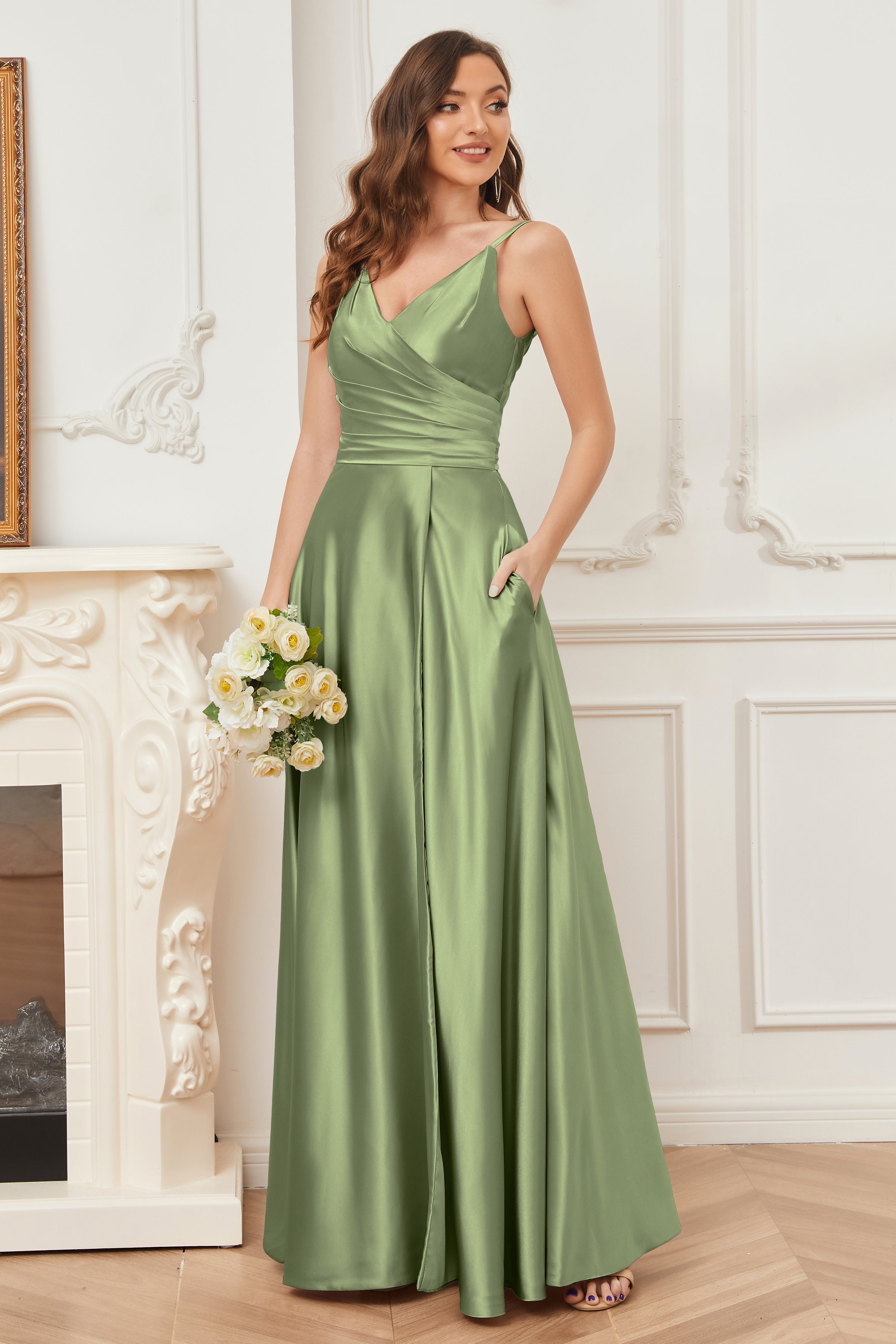 A-line V-neck Soft Satin Long Bridesmaid Dress with Pockets