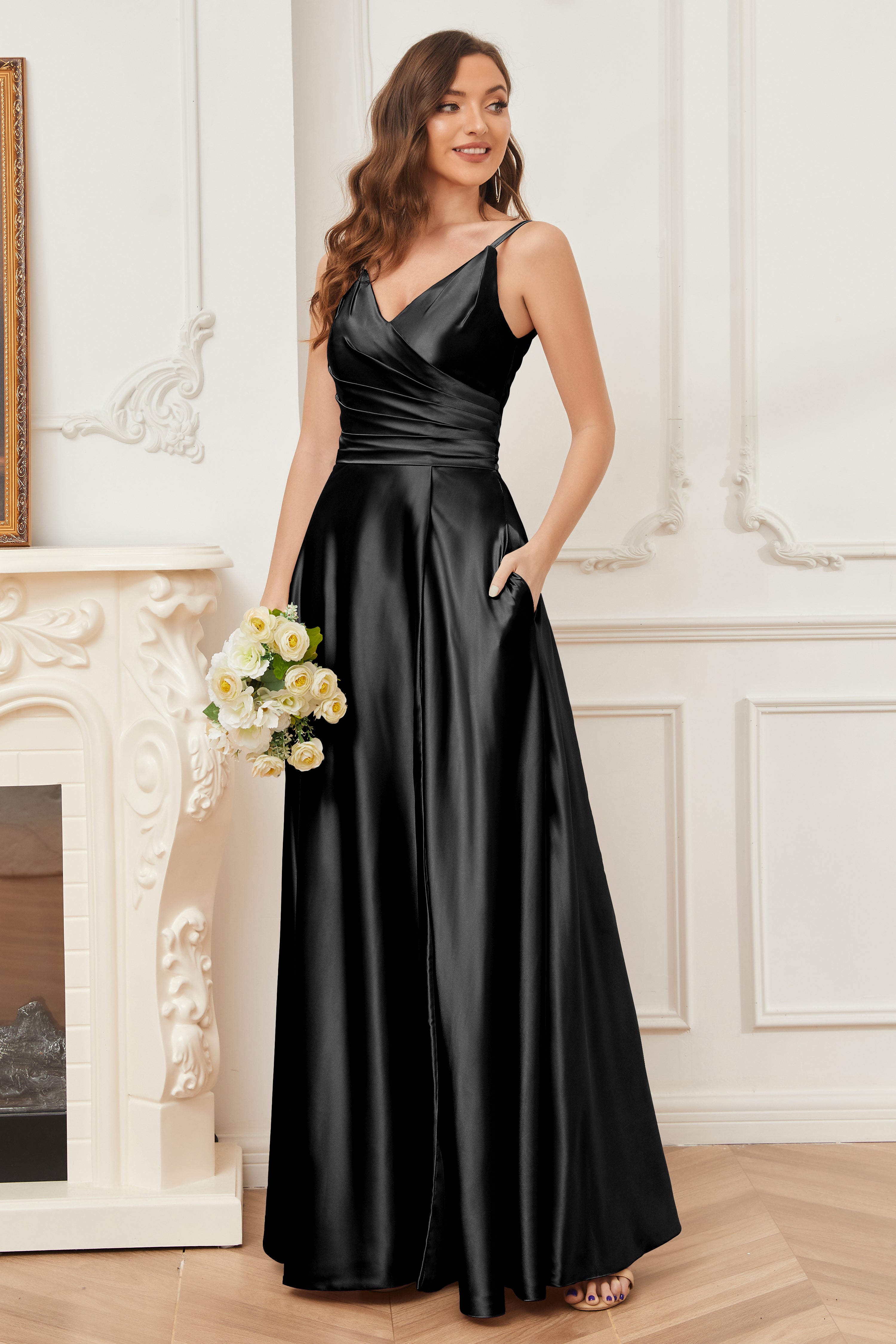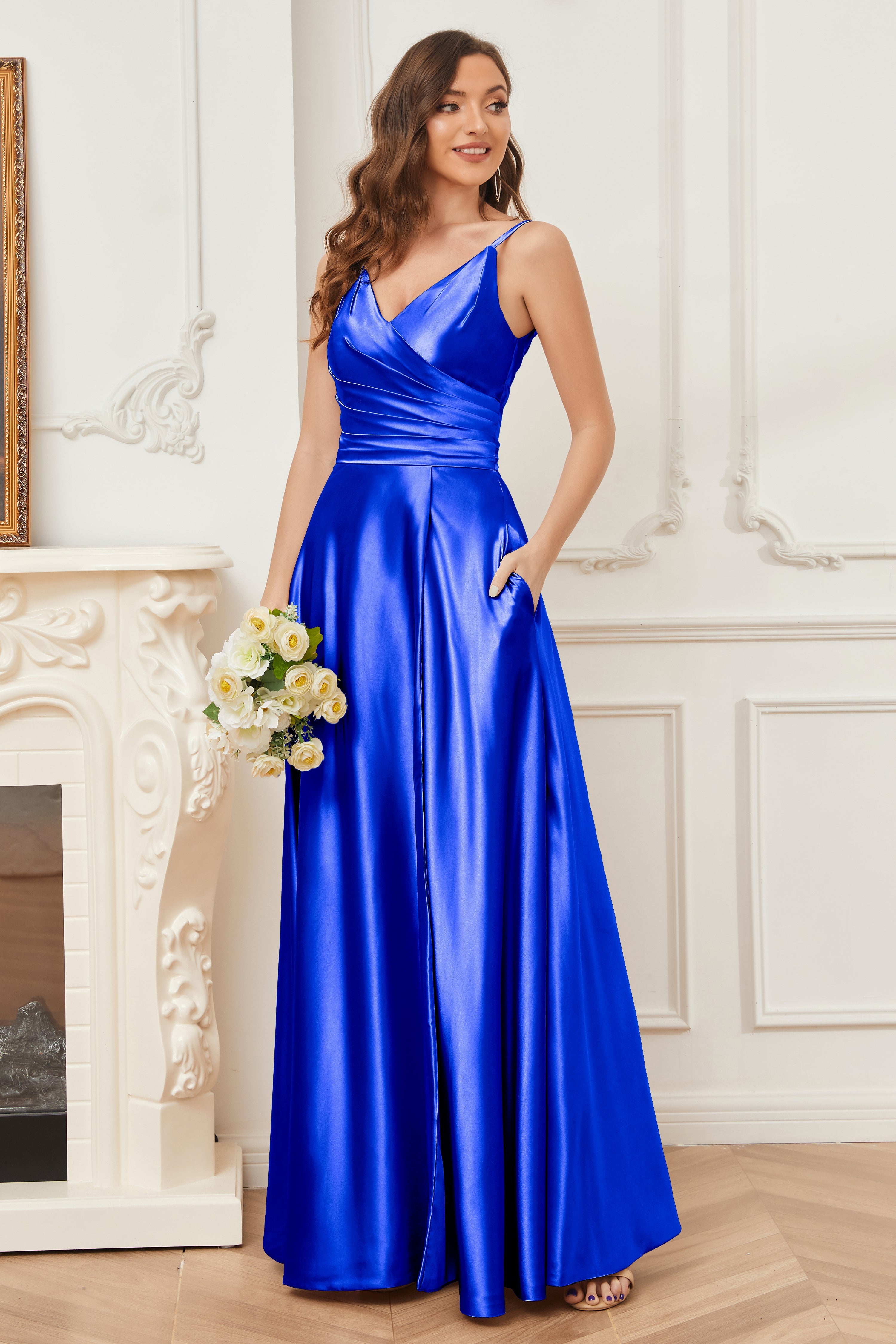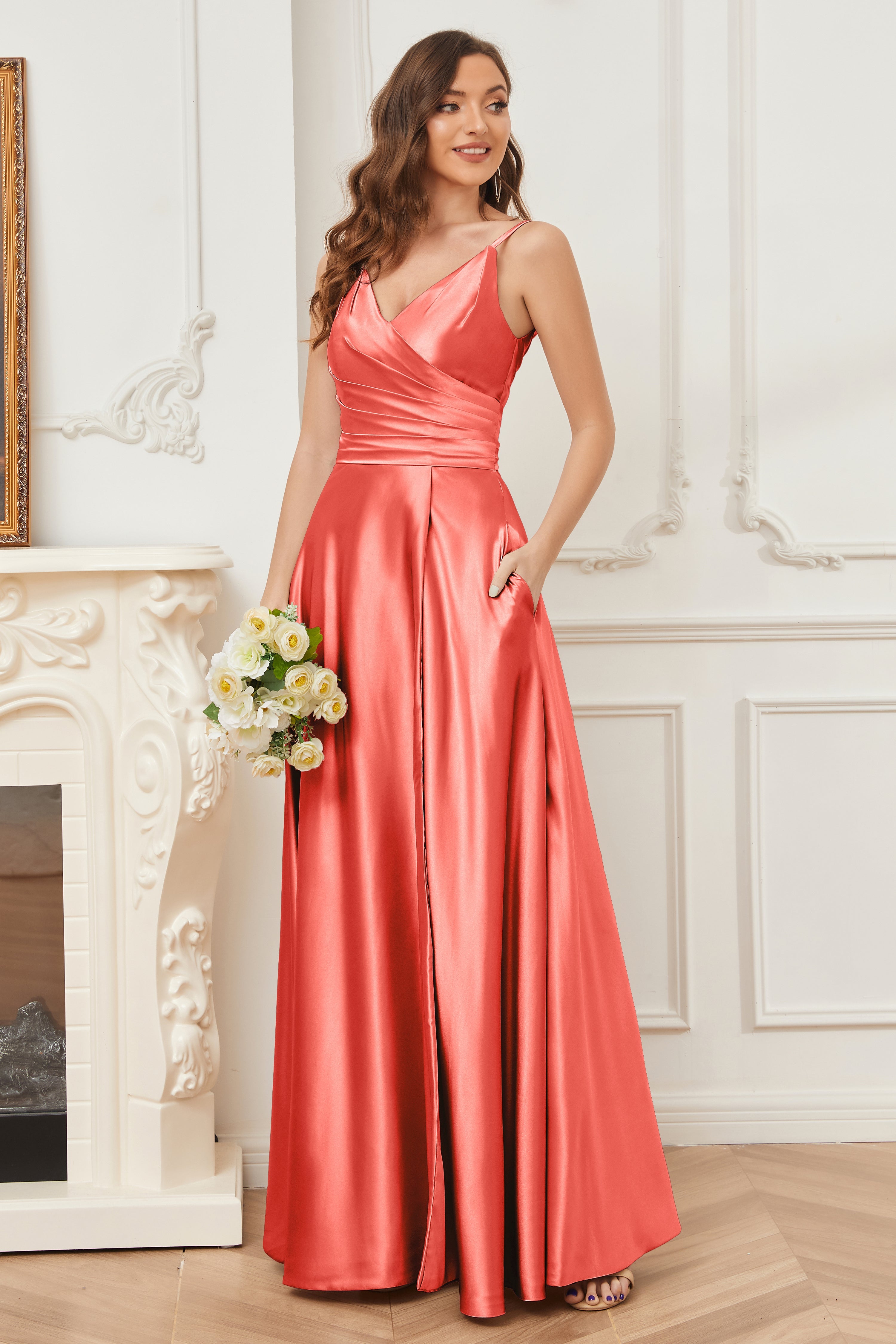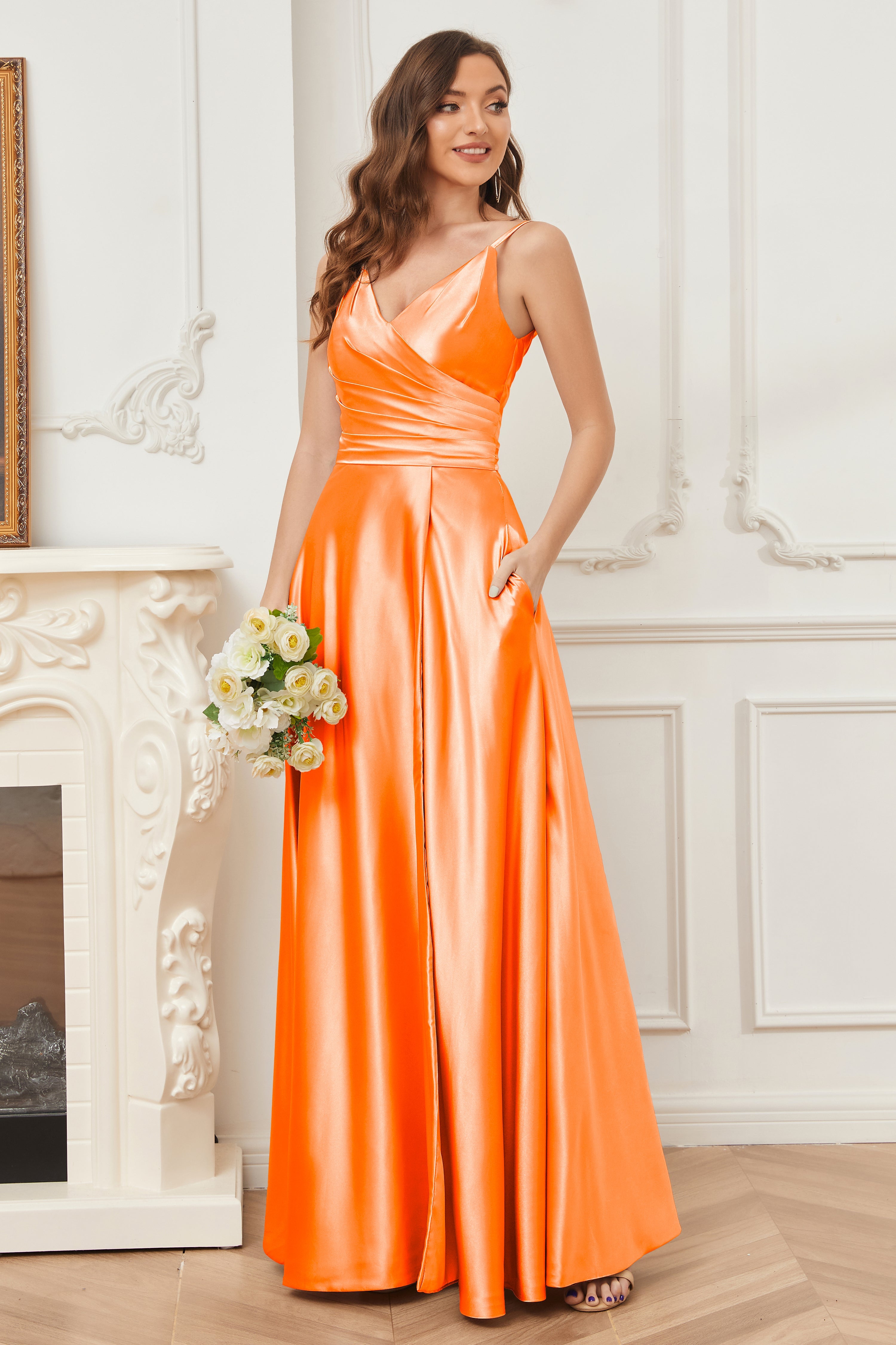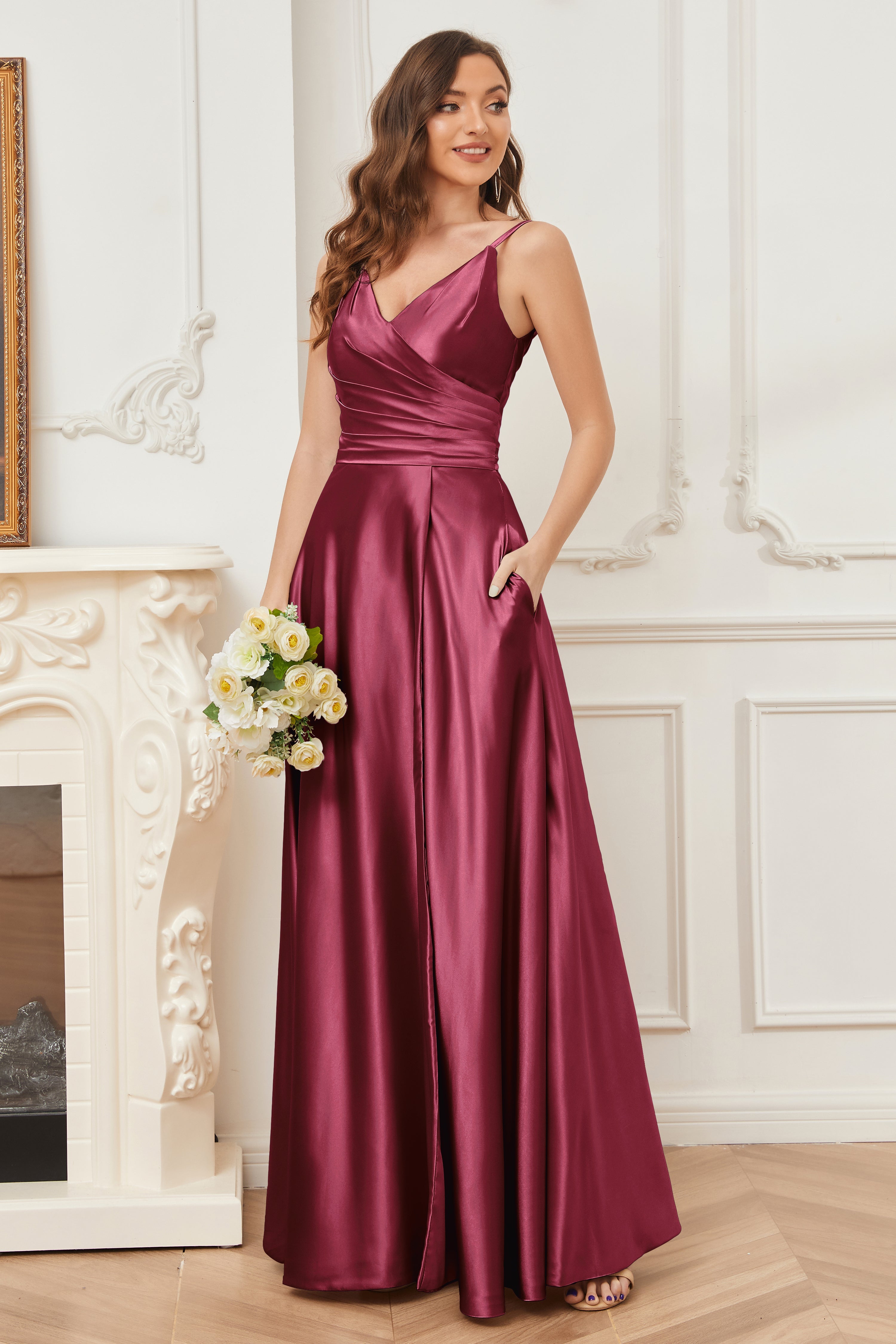 A-line V-neck Soft Satin Long Bridesmaid Dress with Pockets