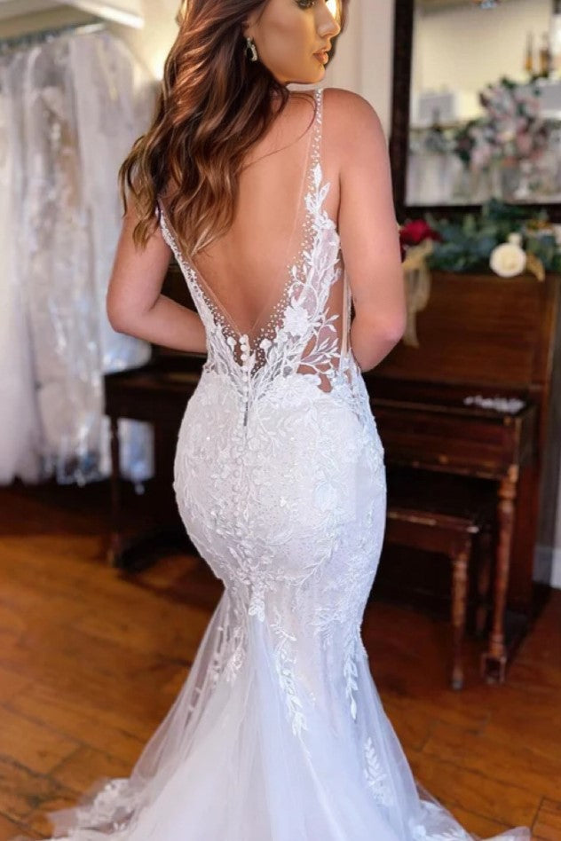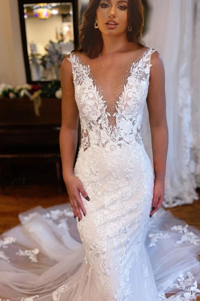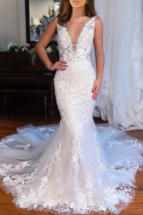 Charming V-Neck Mermaid Lace Long Wedding Dress