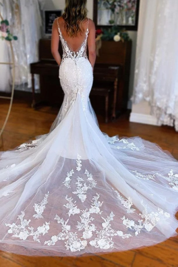This Charming V-Neck Mermaid Lace Long Wedding Dress features gorgeous spaghetti straps, delicate lace detailing, and an open back design. Expertly crafted for a stunning and elegant look, this dress is perfect for any bride looking to make a statement on their special day. Comfortable and stylish, it's the ideal choice for a dreamy wedding ensemble.