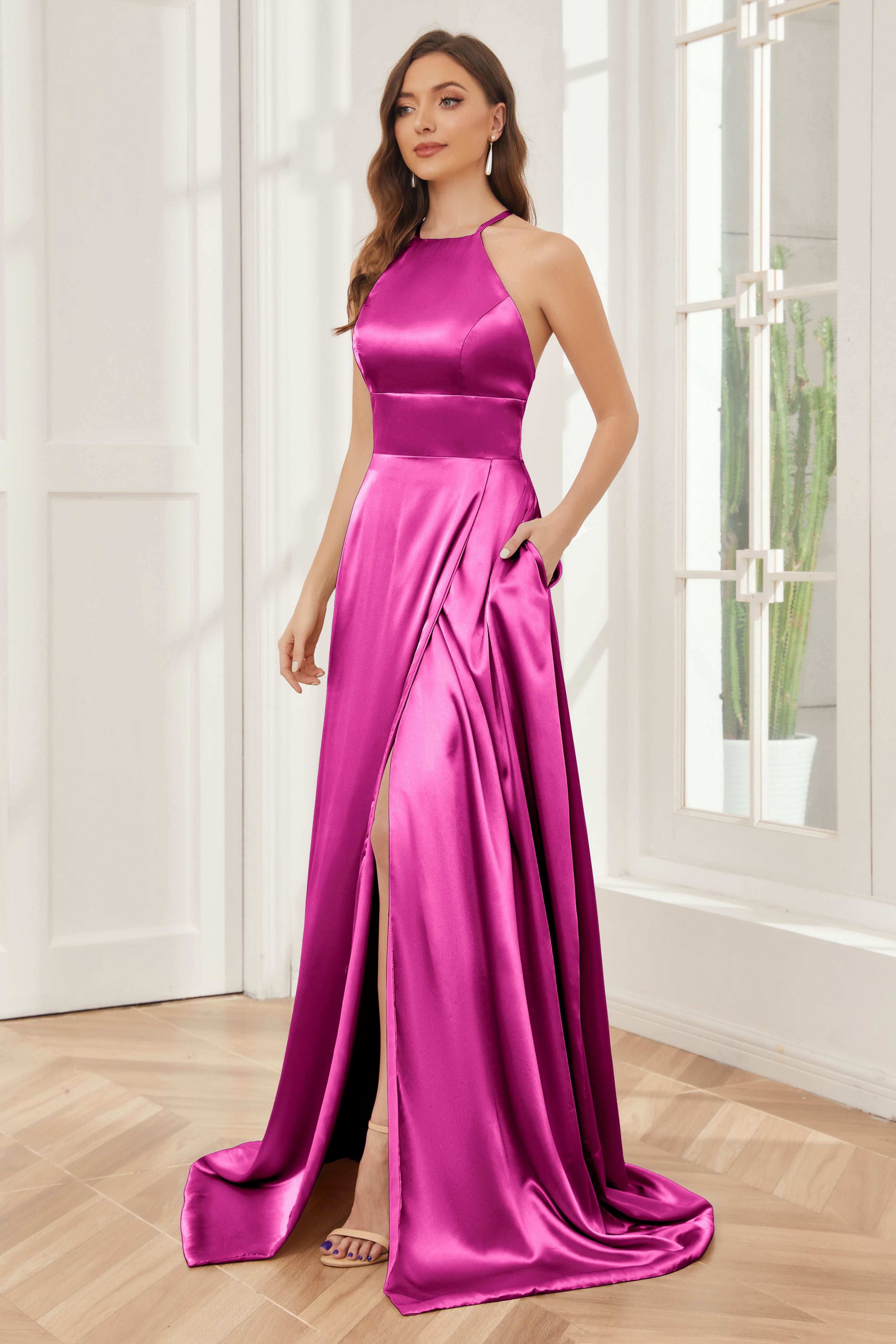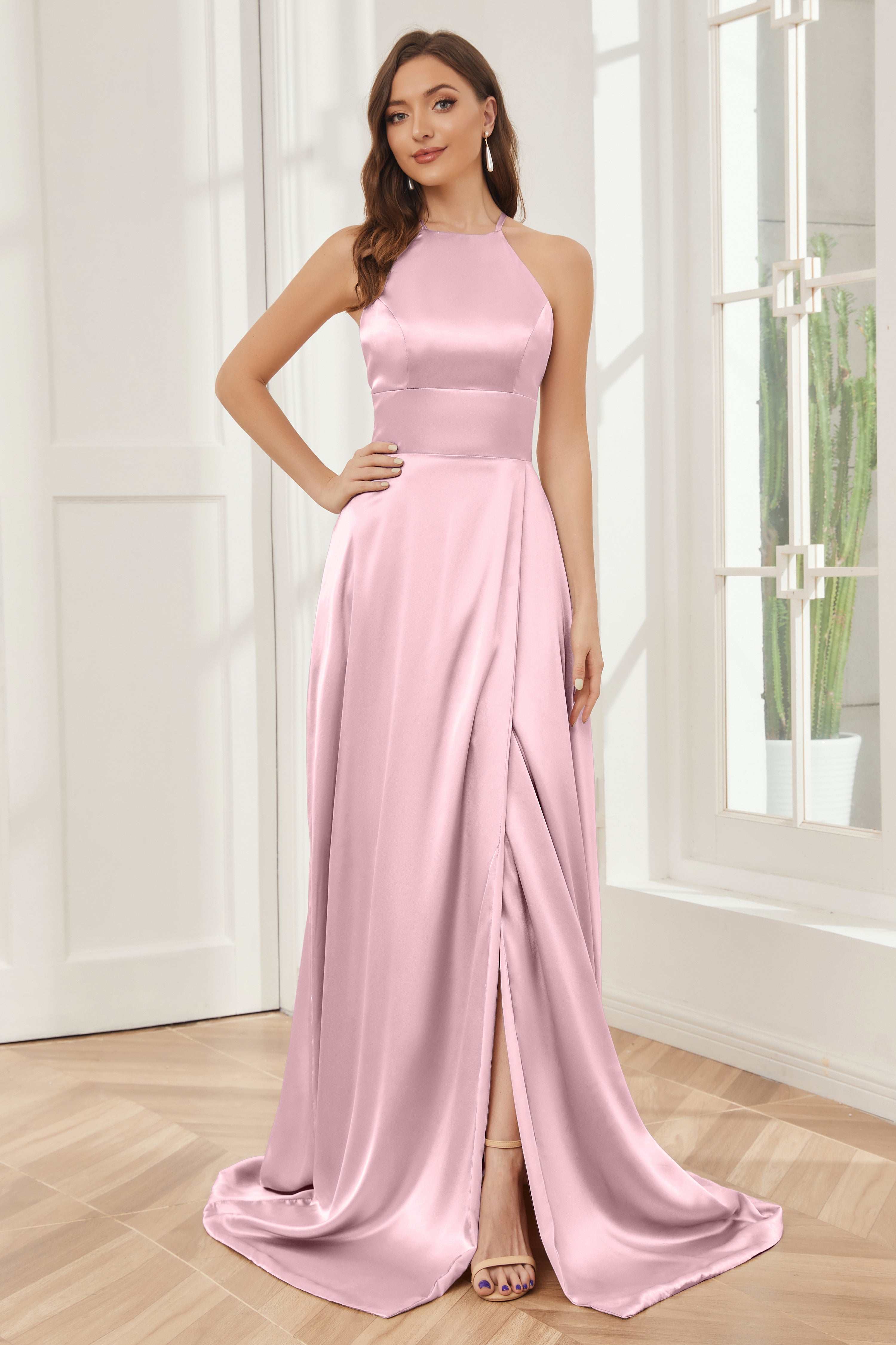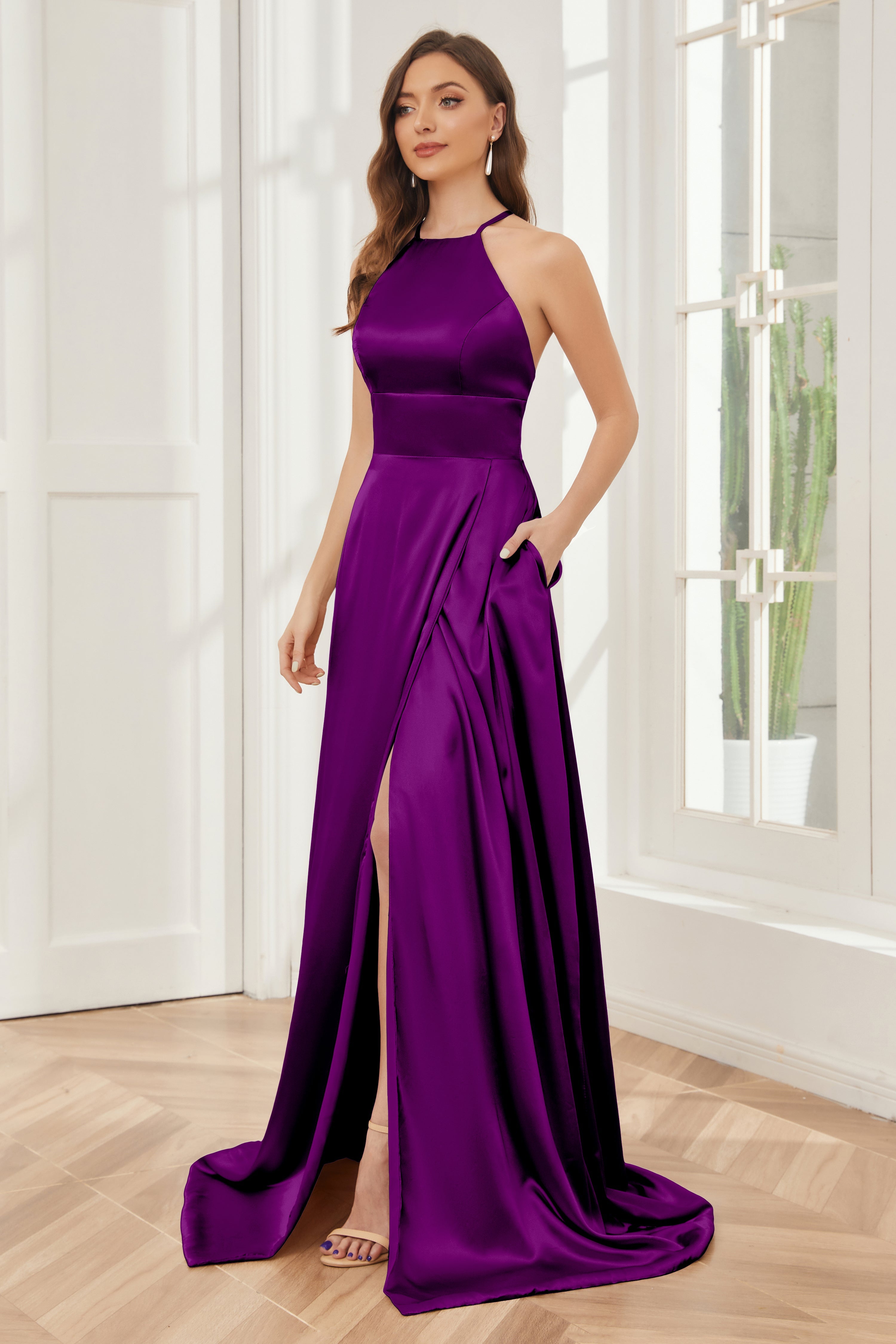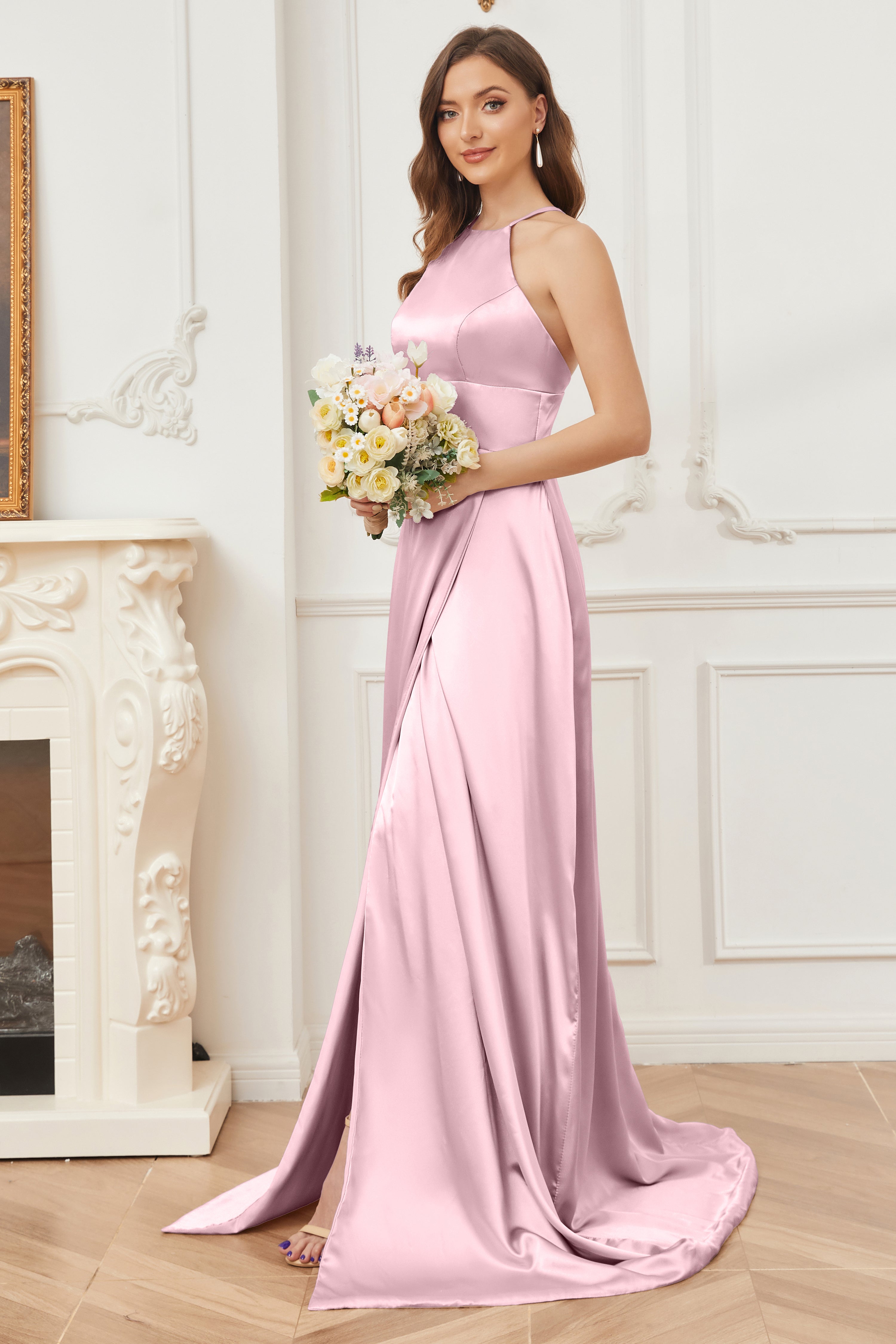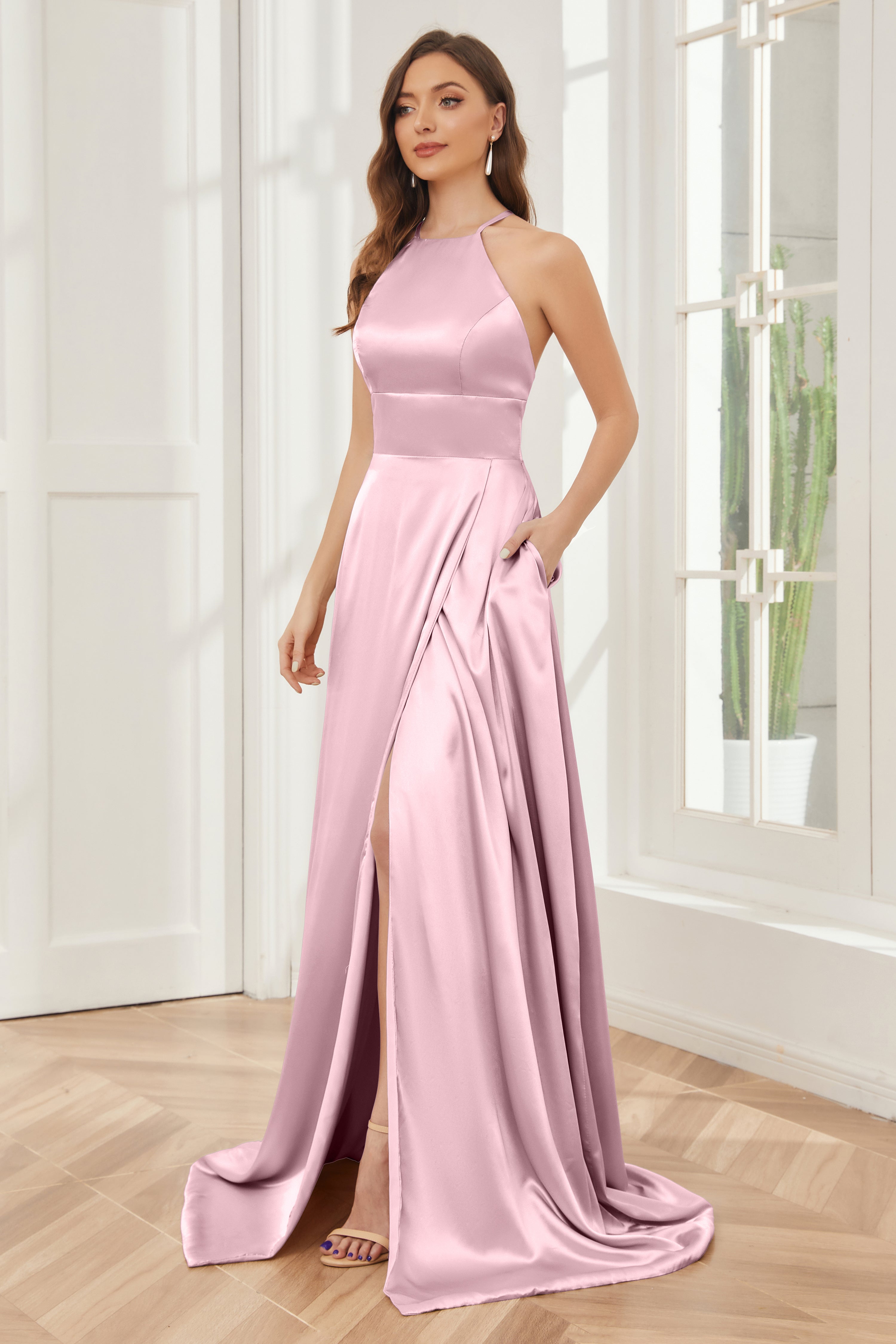 Column Halter Soft Satin Bridesmaid Dress with Pockets
