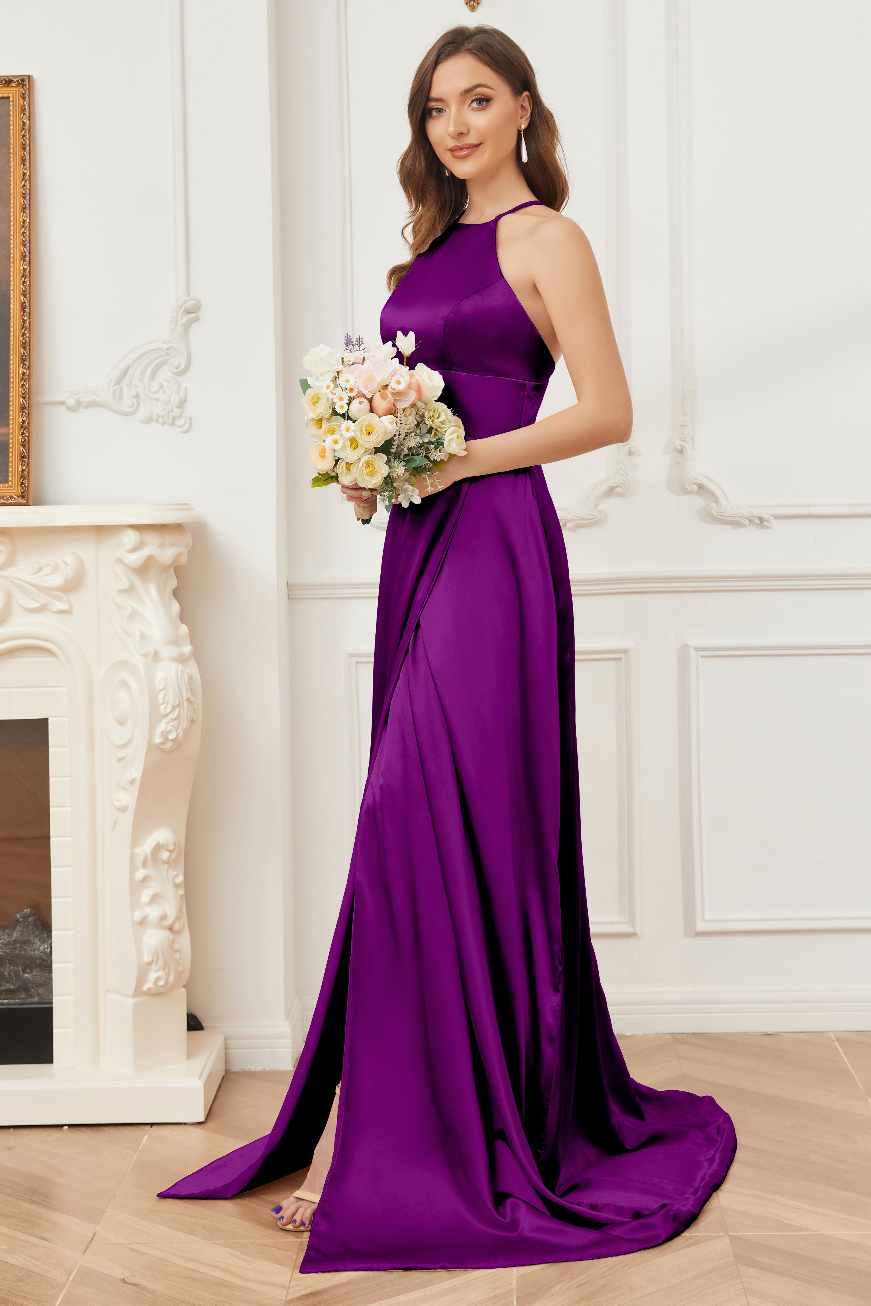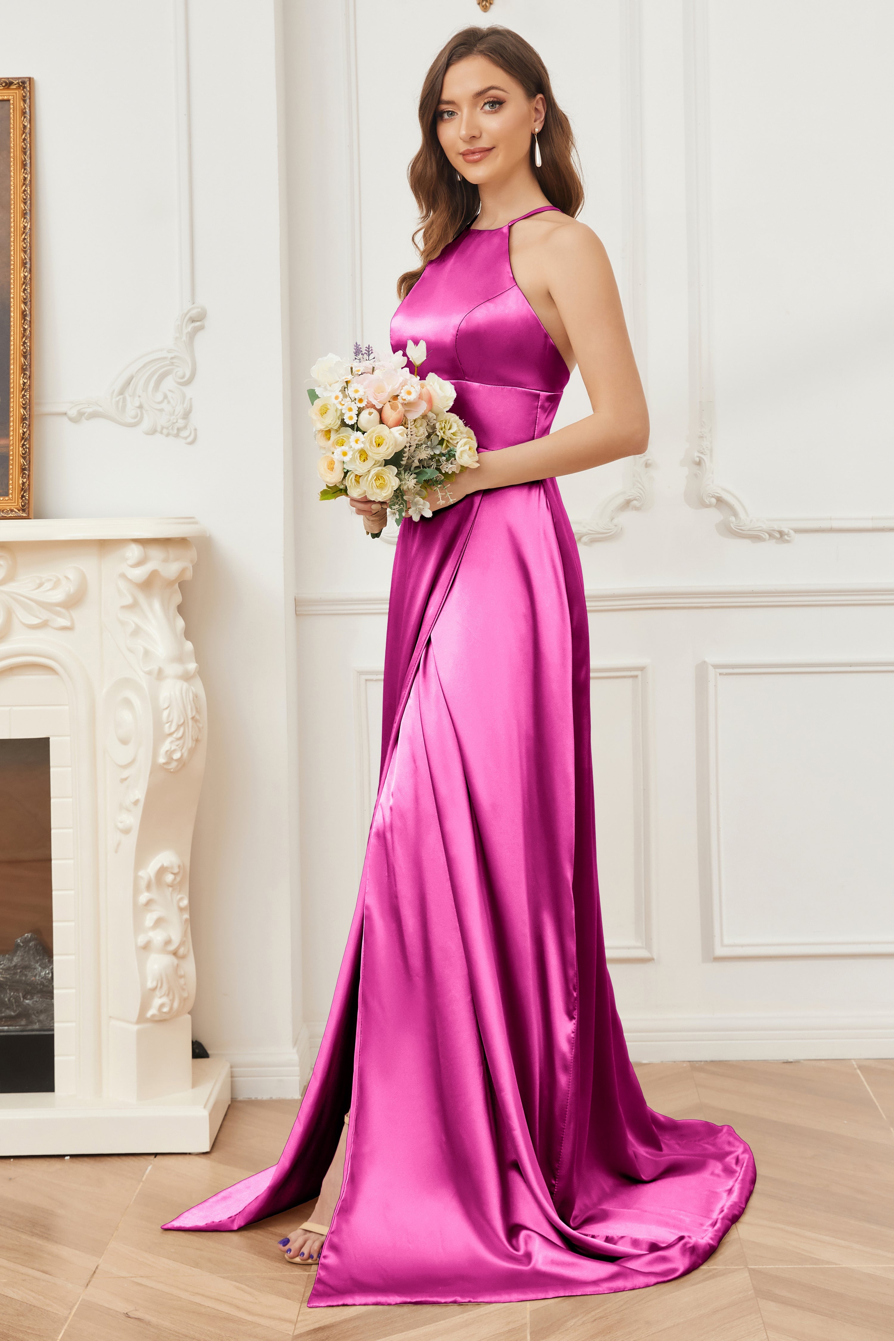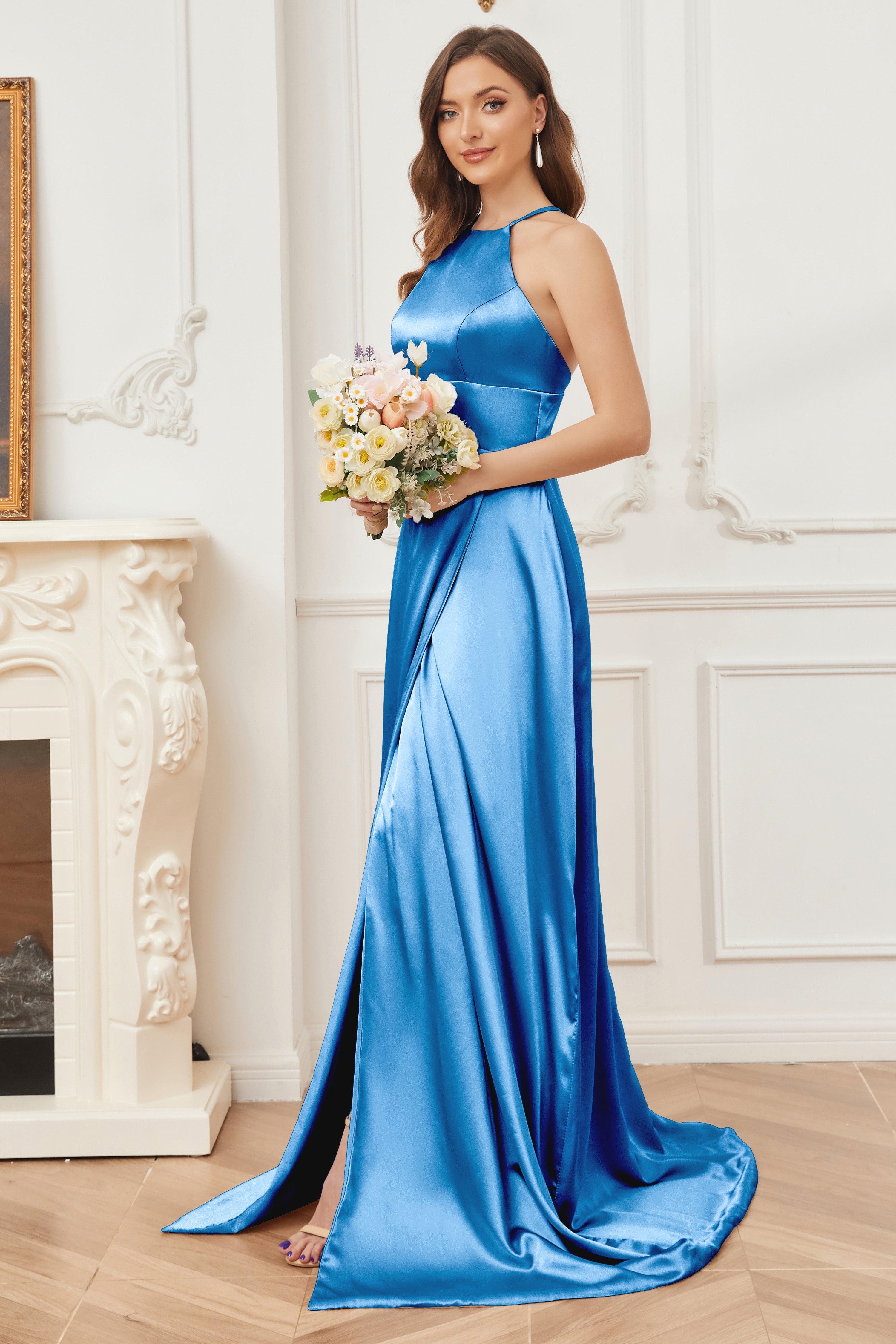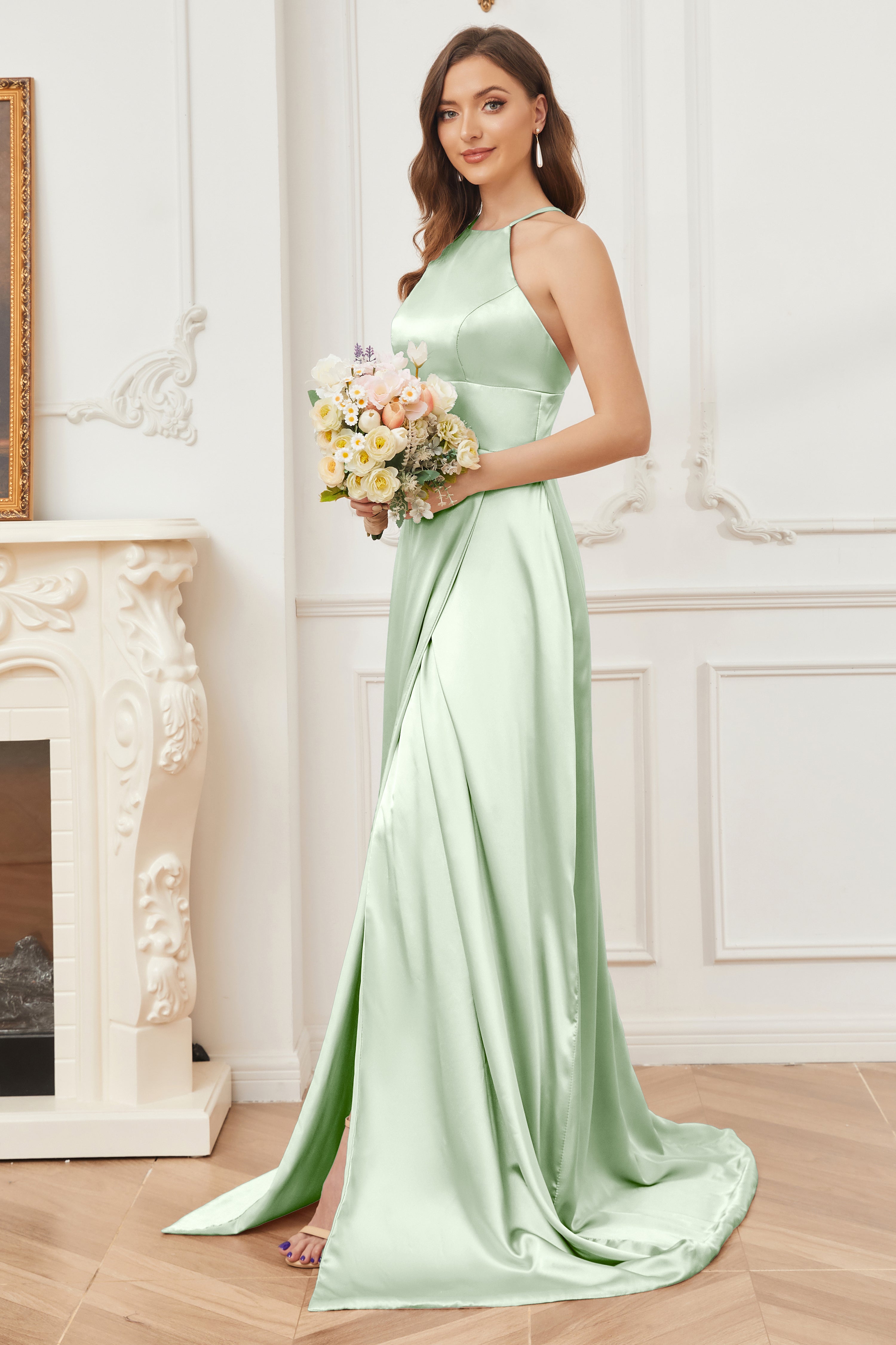 Column Halter Soft Satin Bridesmaid Dress with Pockets