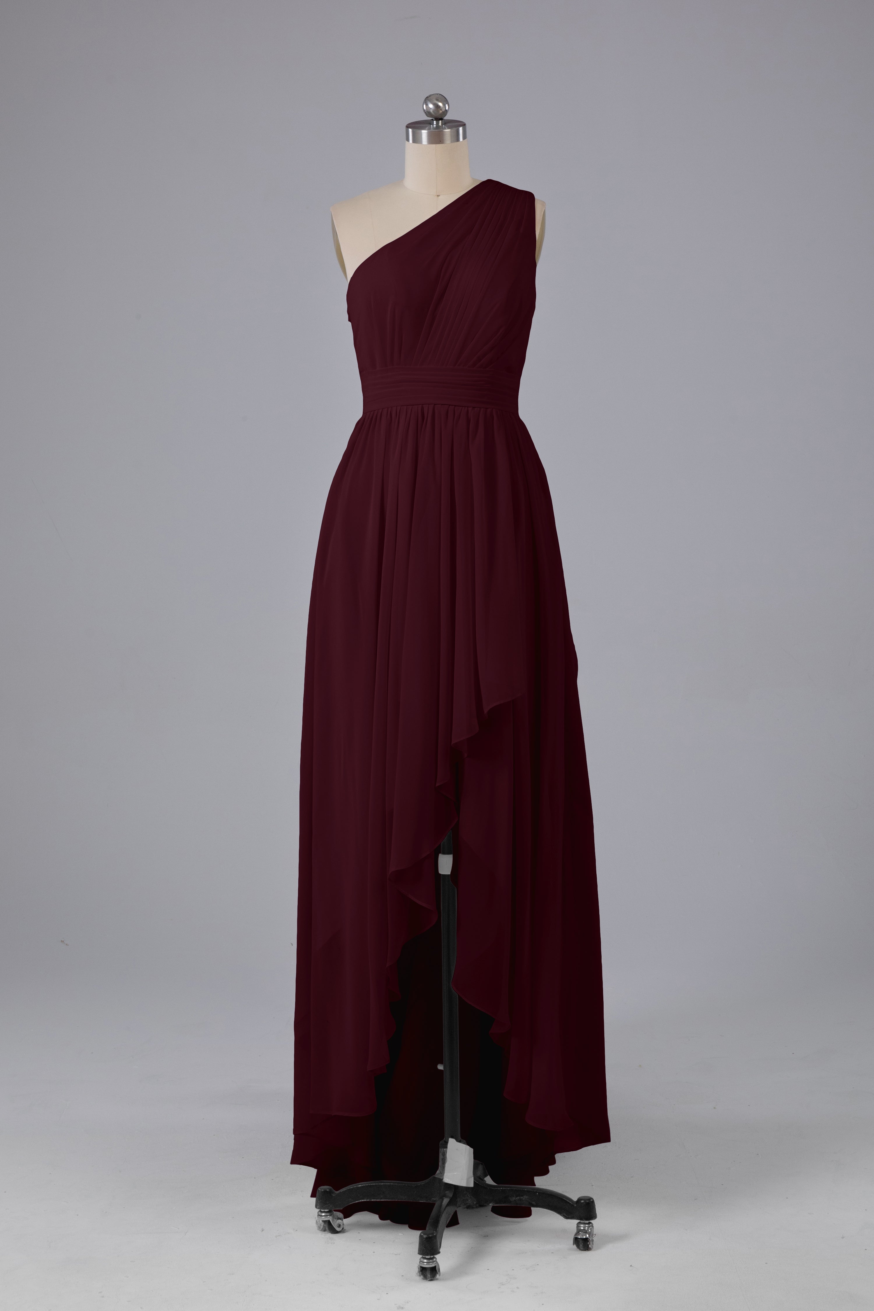This one-shoulder chiffon bridesmaid dress offers a unique and elegant touch to any wedding party. Made with high quality fabric, it provides a comfortable fit with a flattering high-low design. Perfect for those looking for a chic and modern bridesmaid dress.