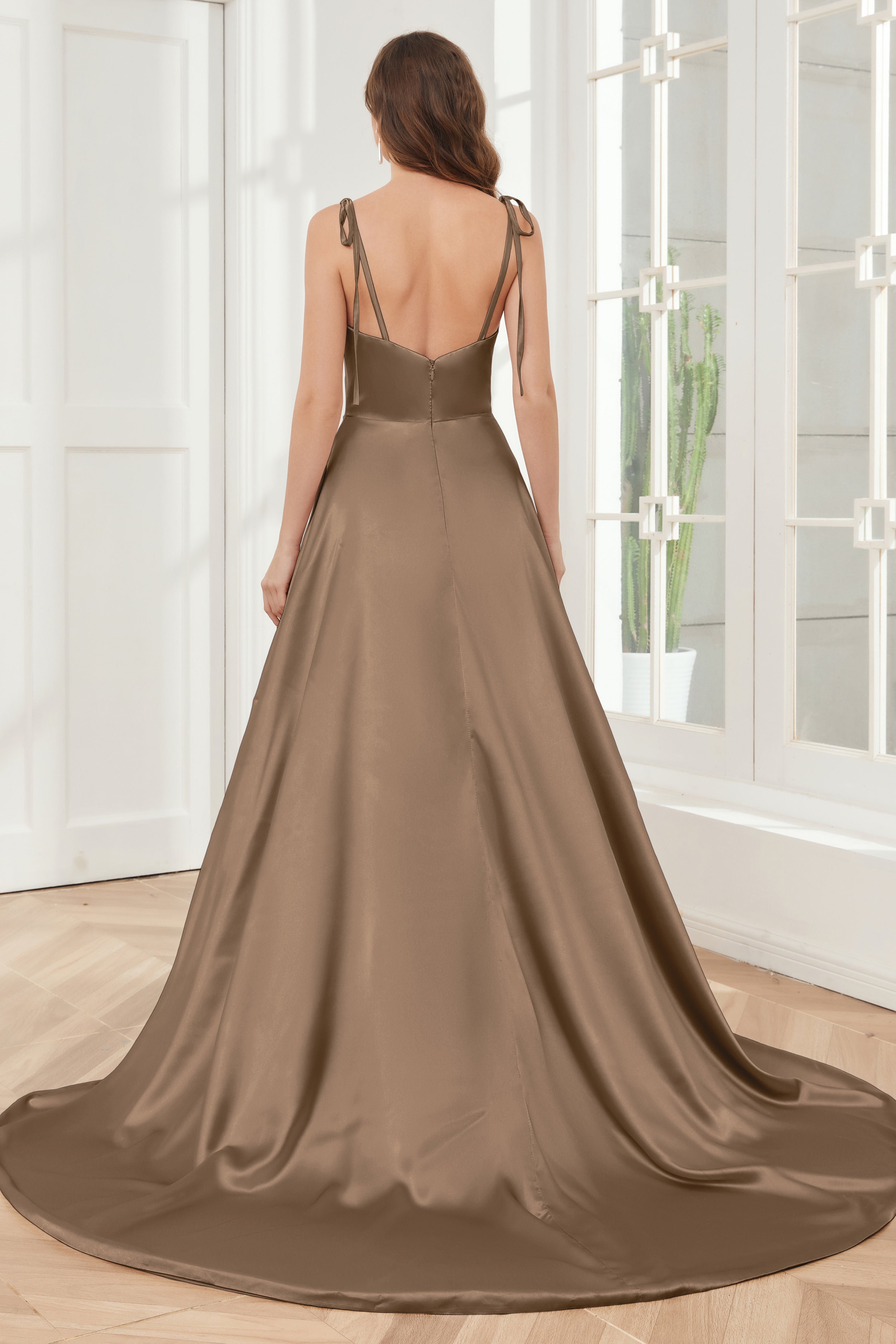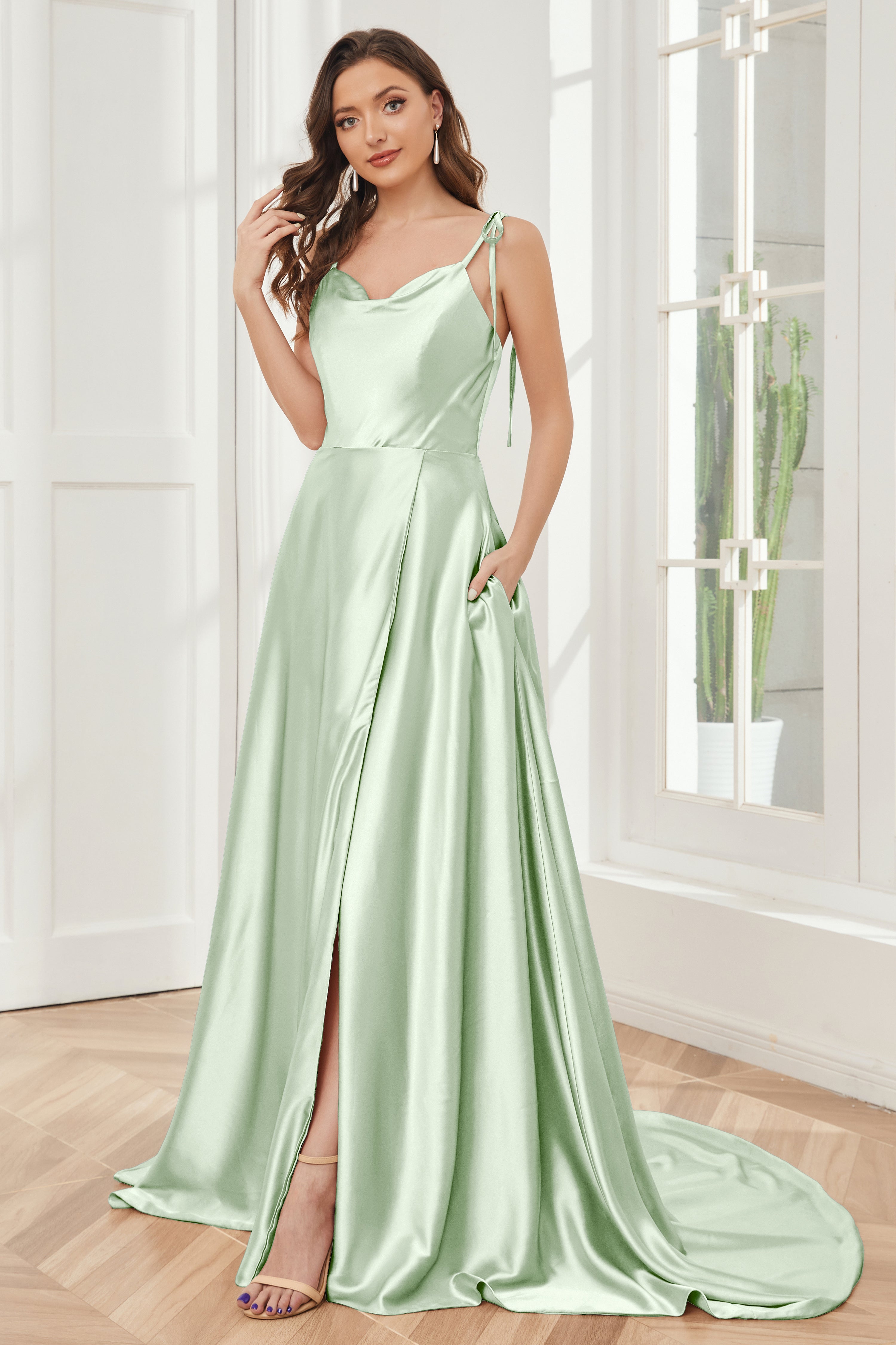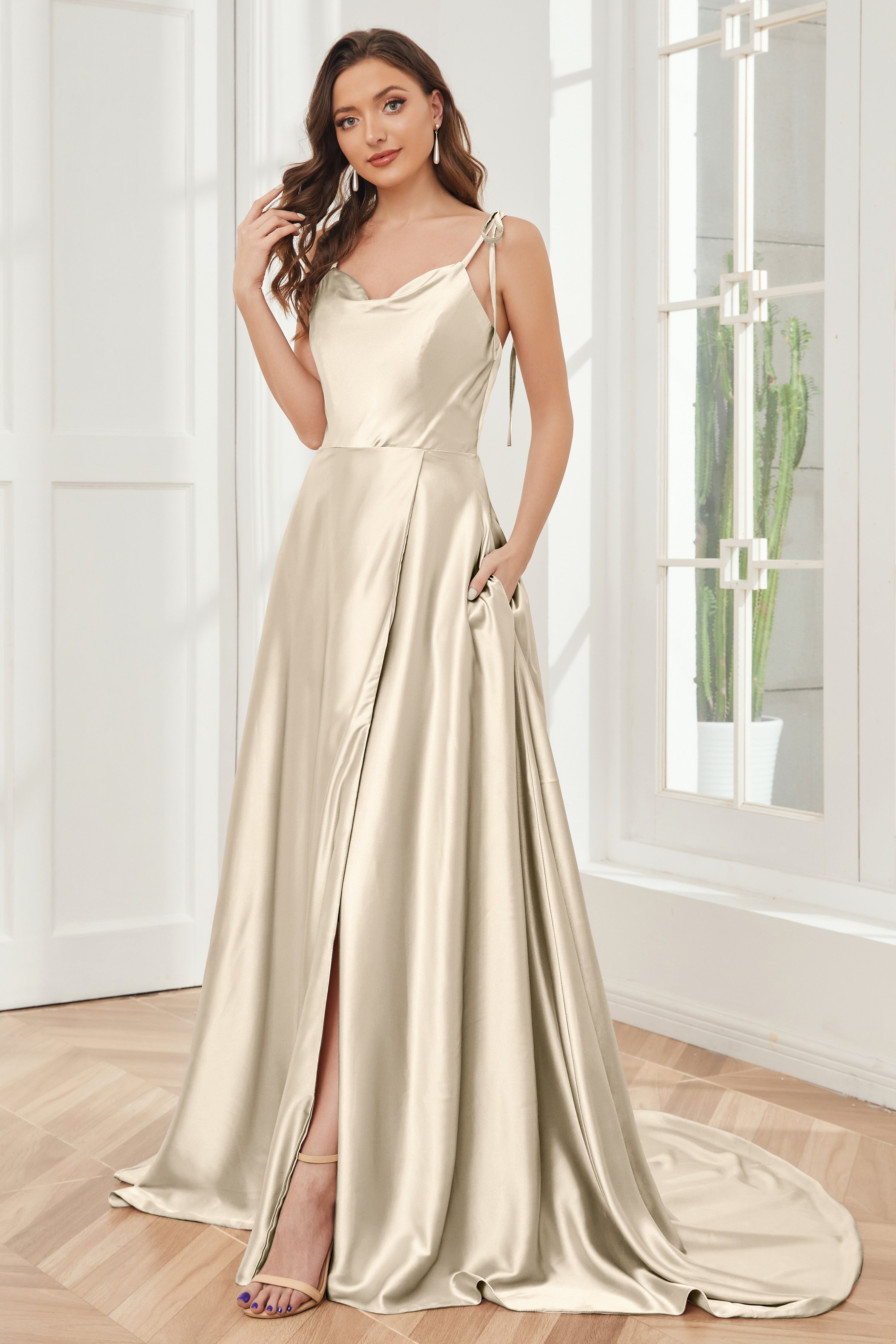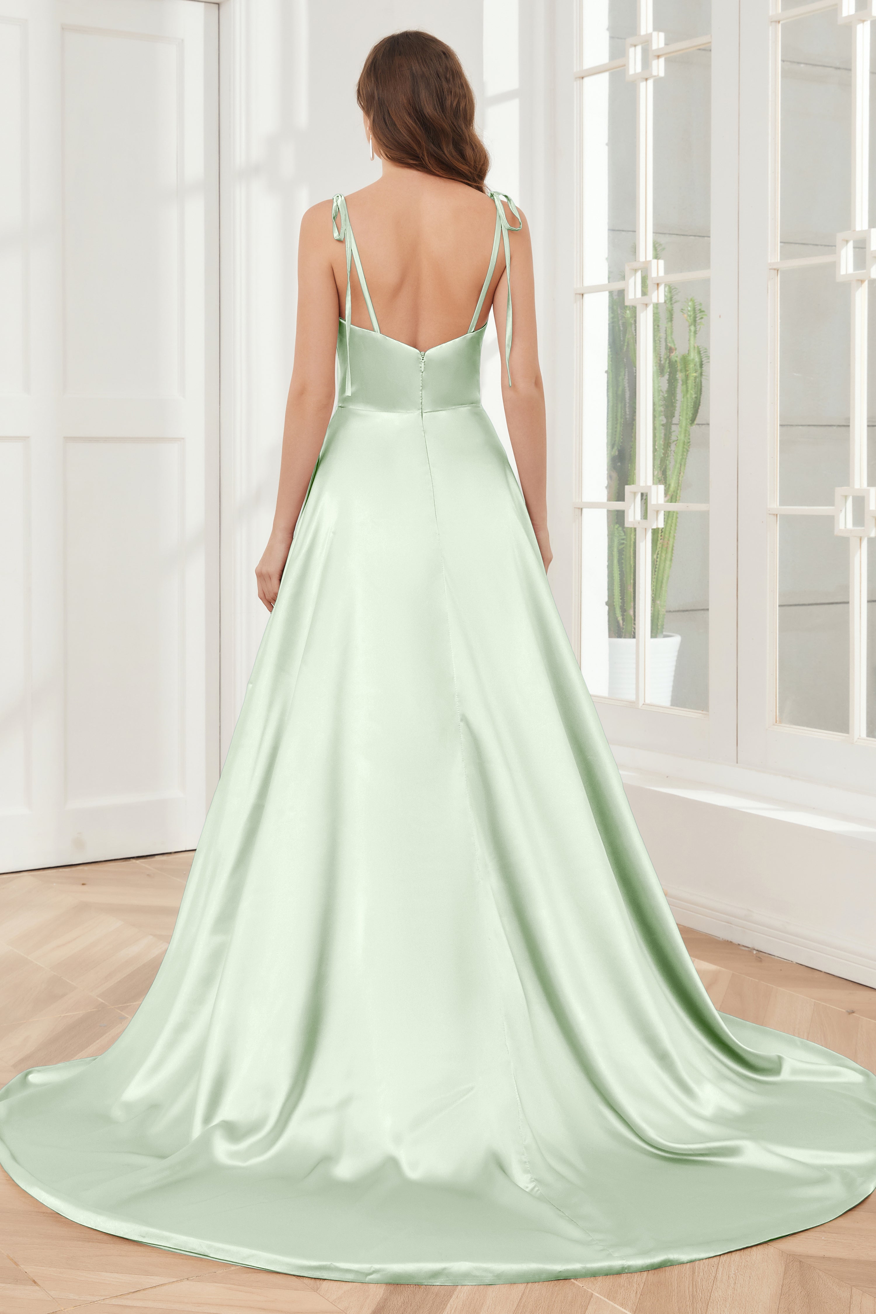 Spaghetti Straps Soft Satin Bridesmaid Dress with Train