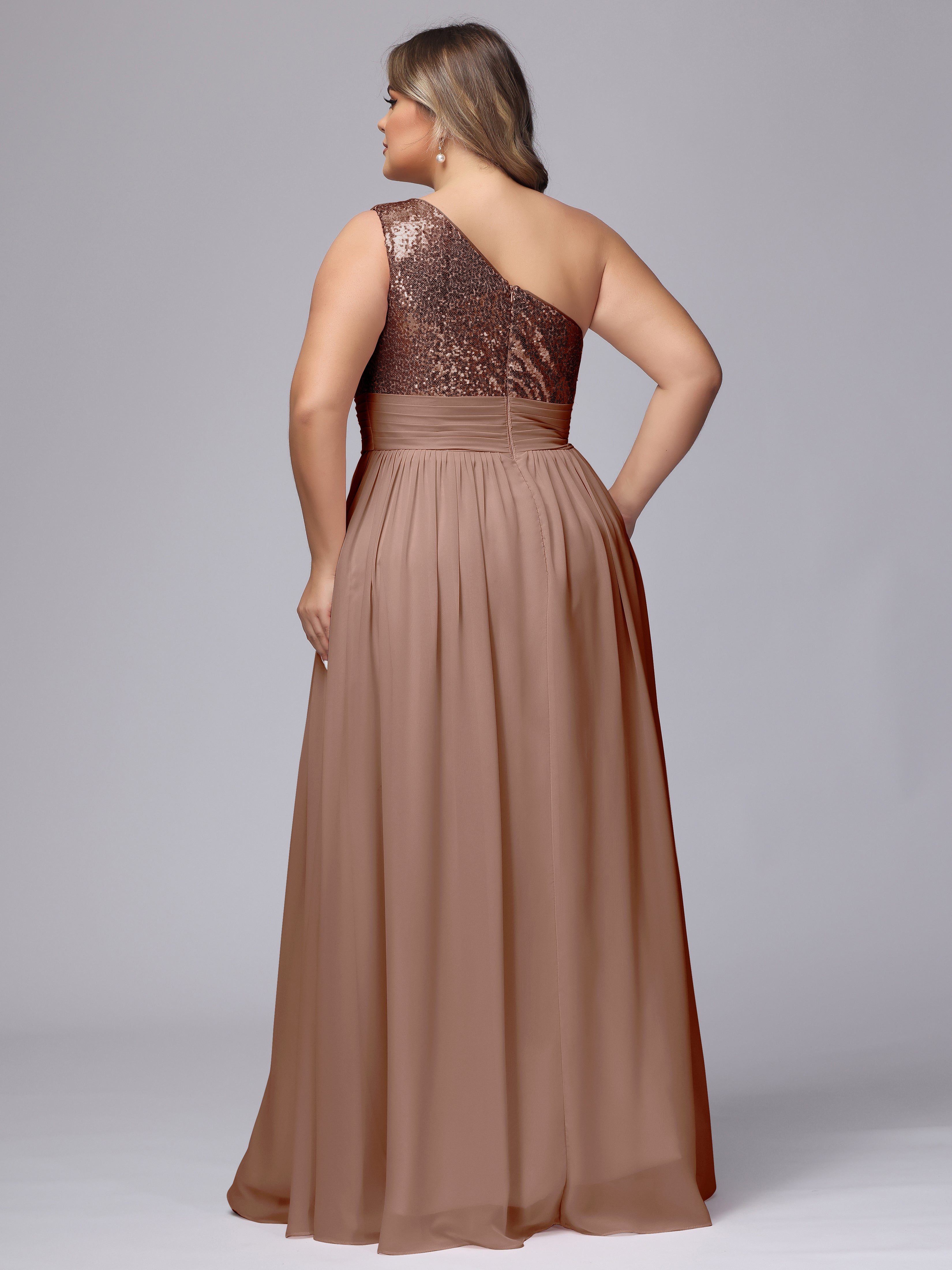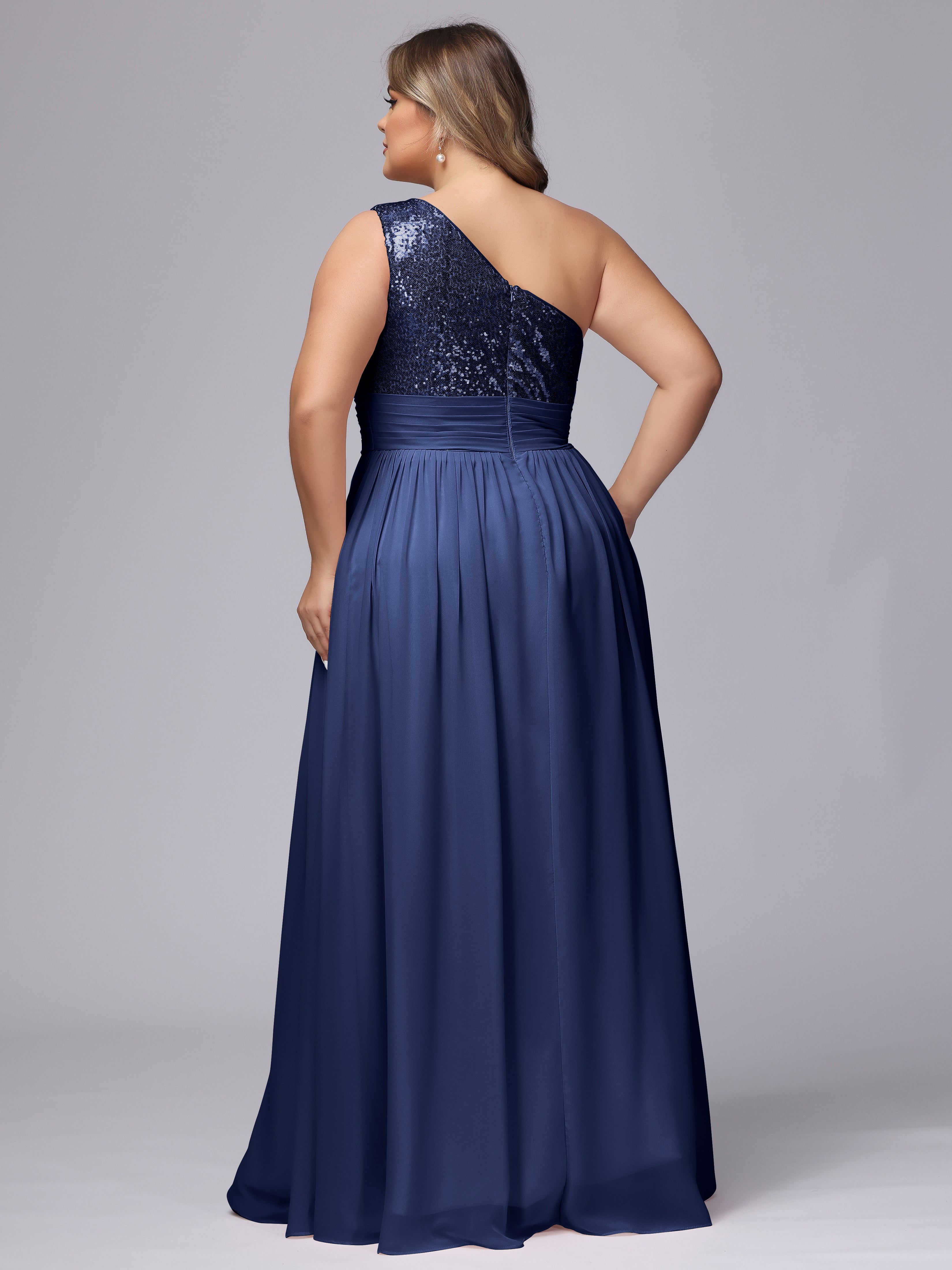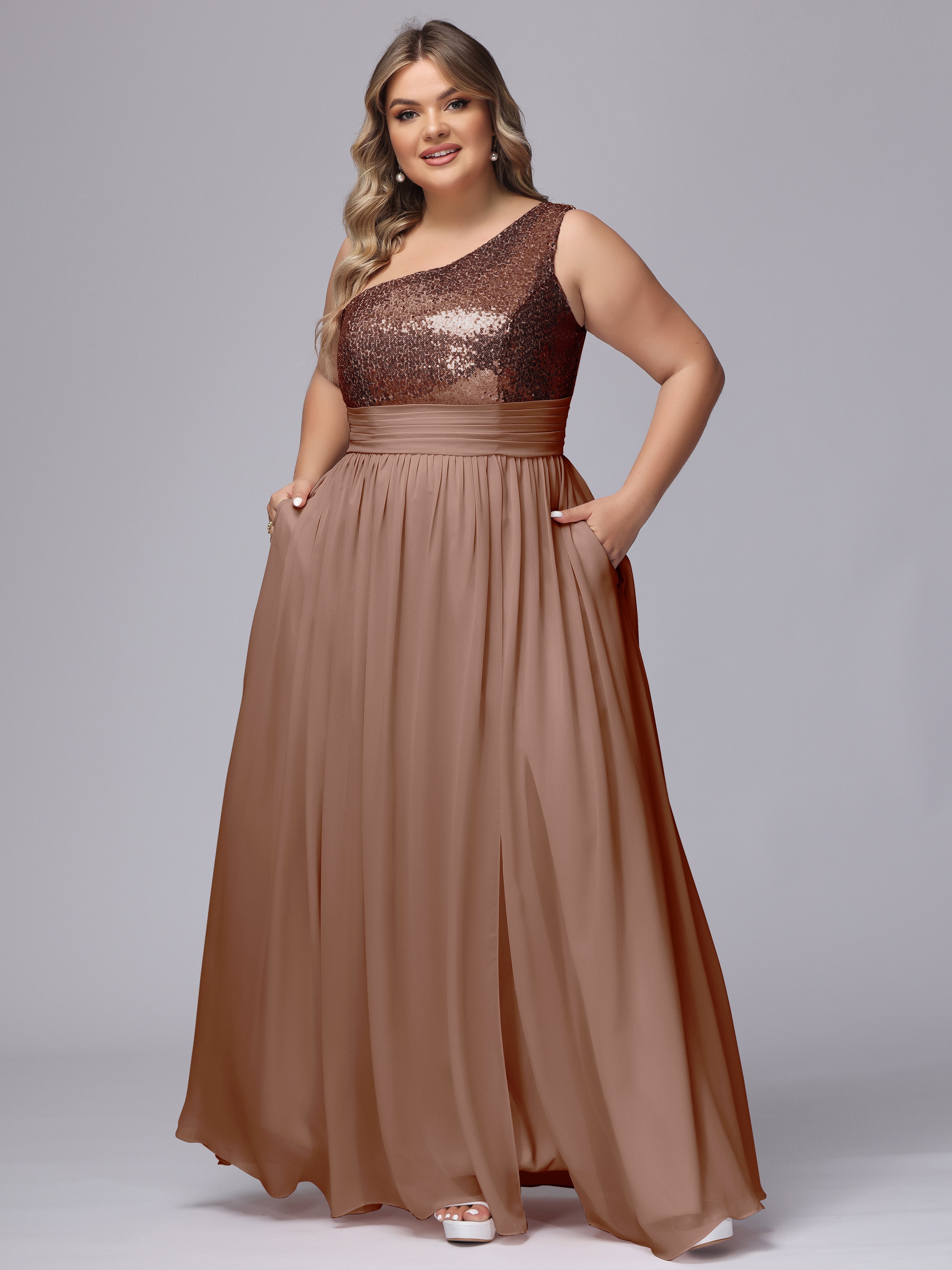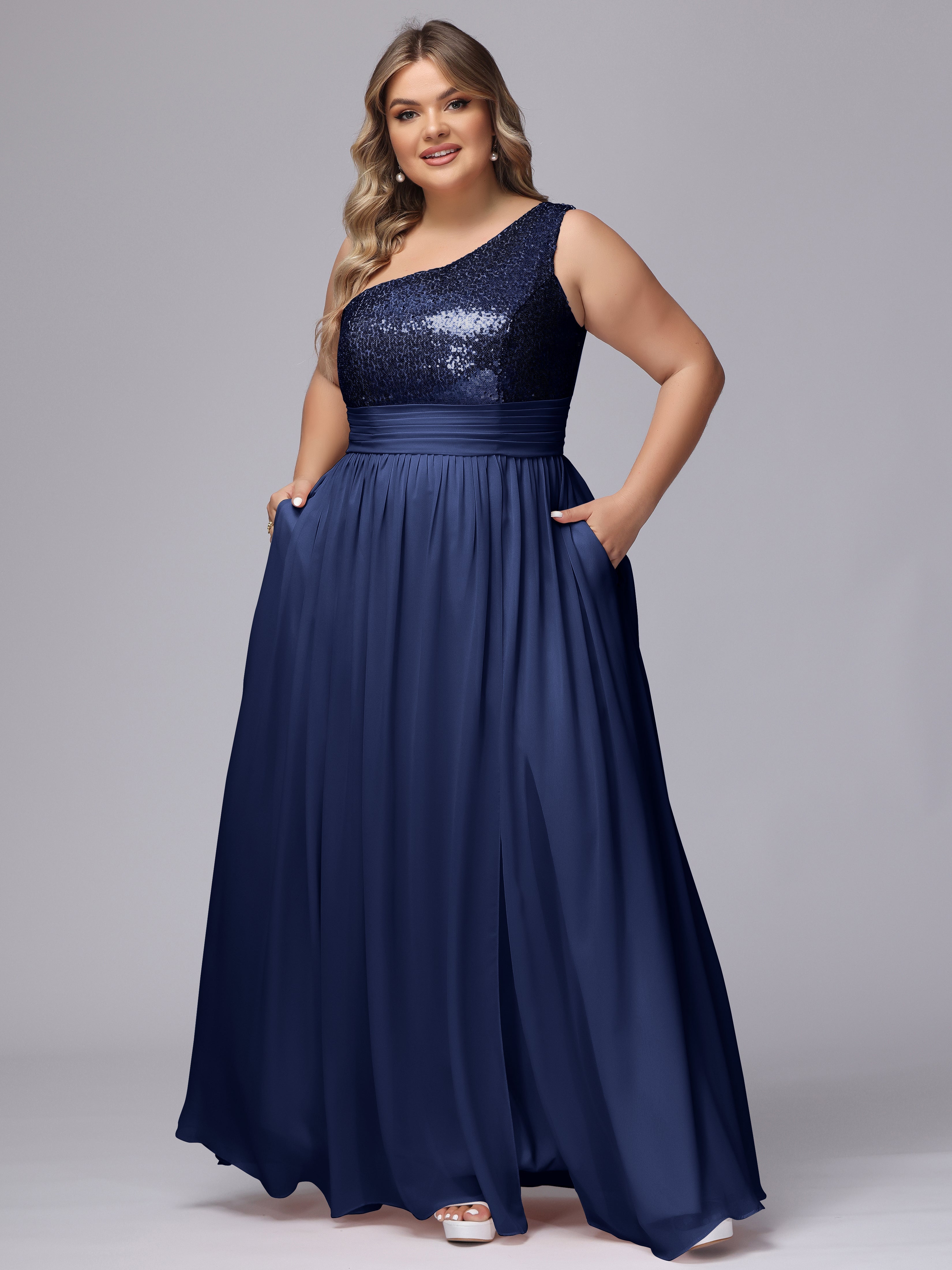 One-Shoulder Sequins Plus Size Bridesmaid Dress with Pockets