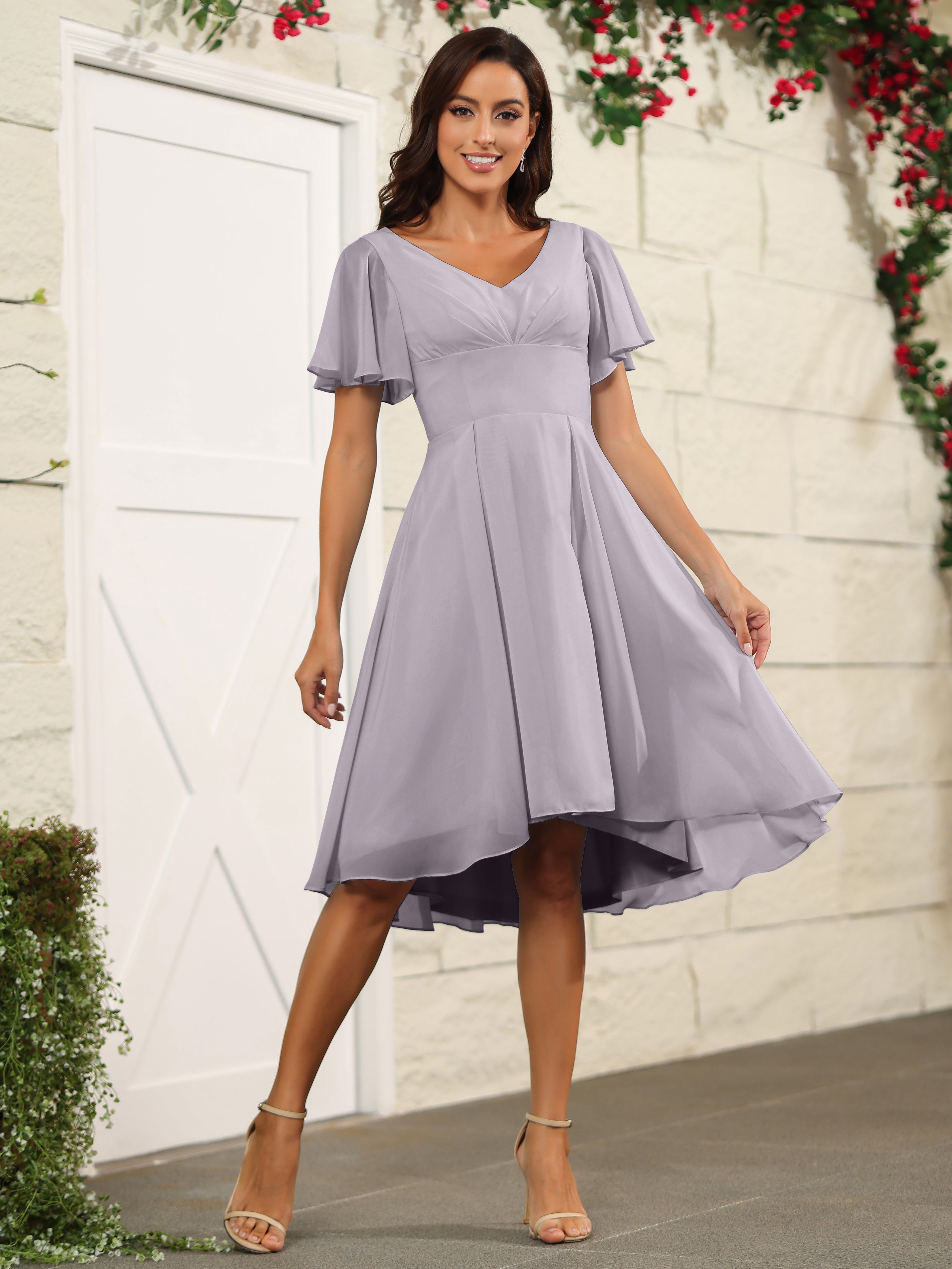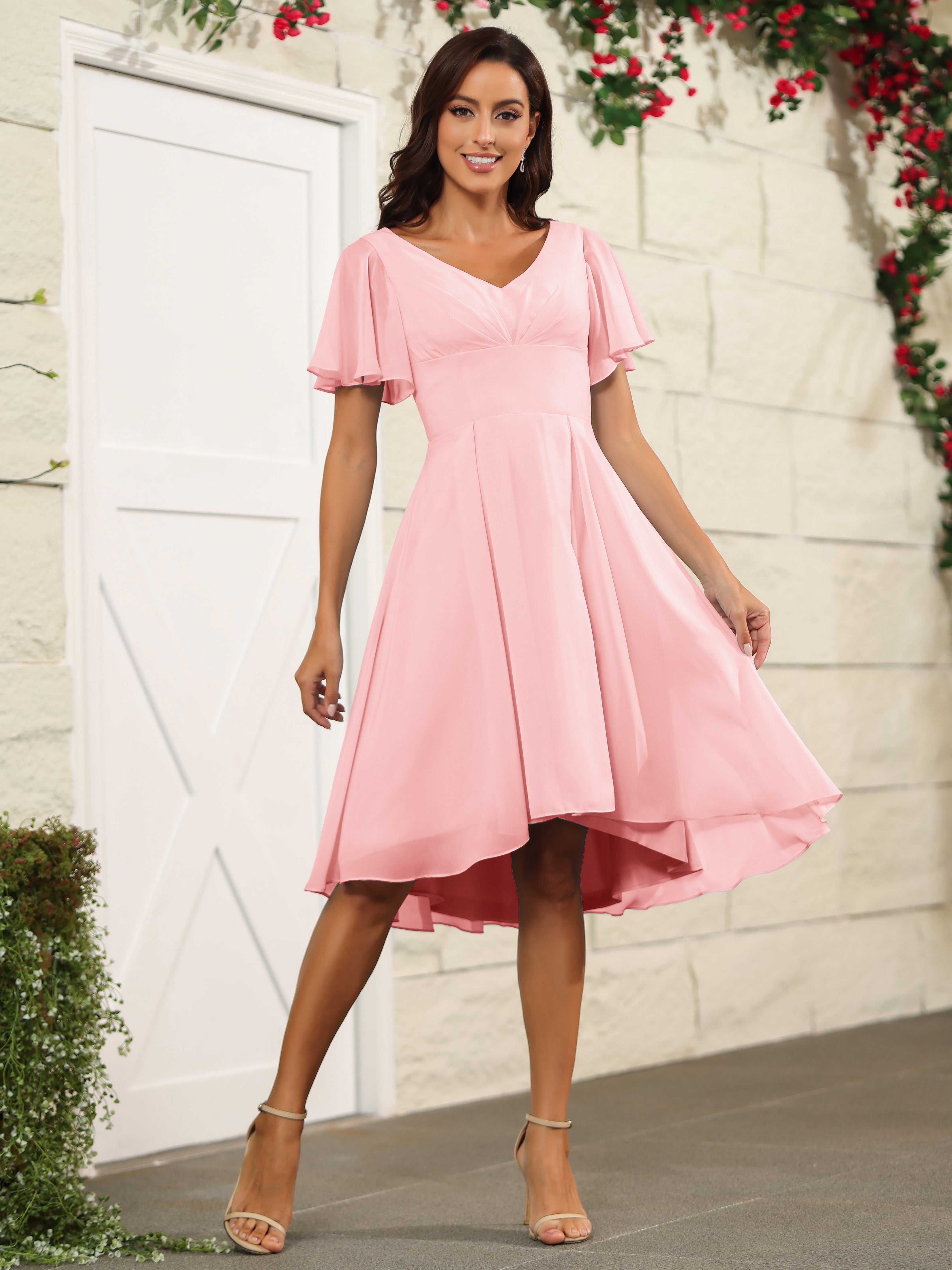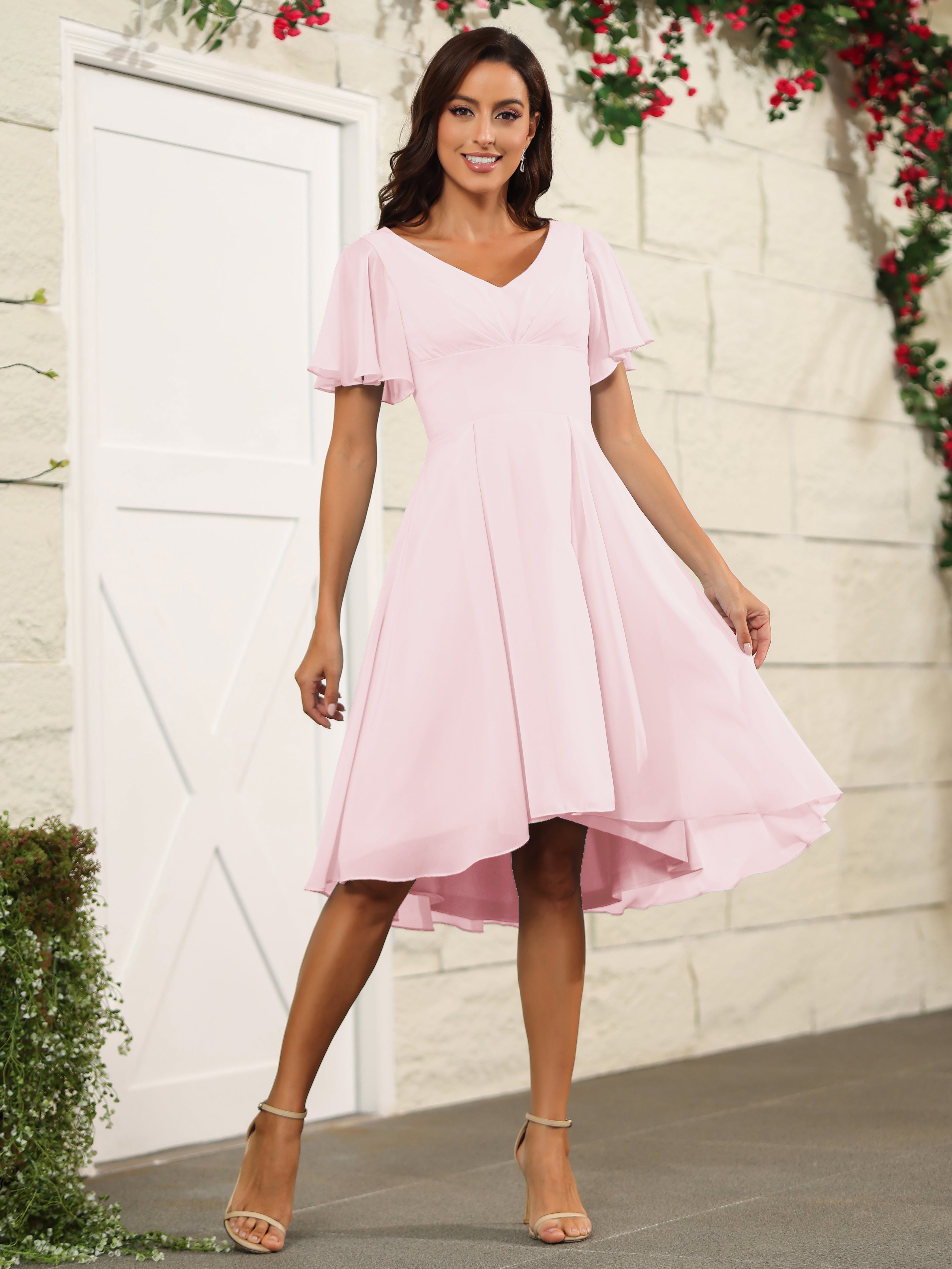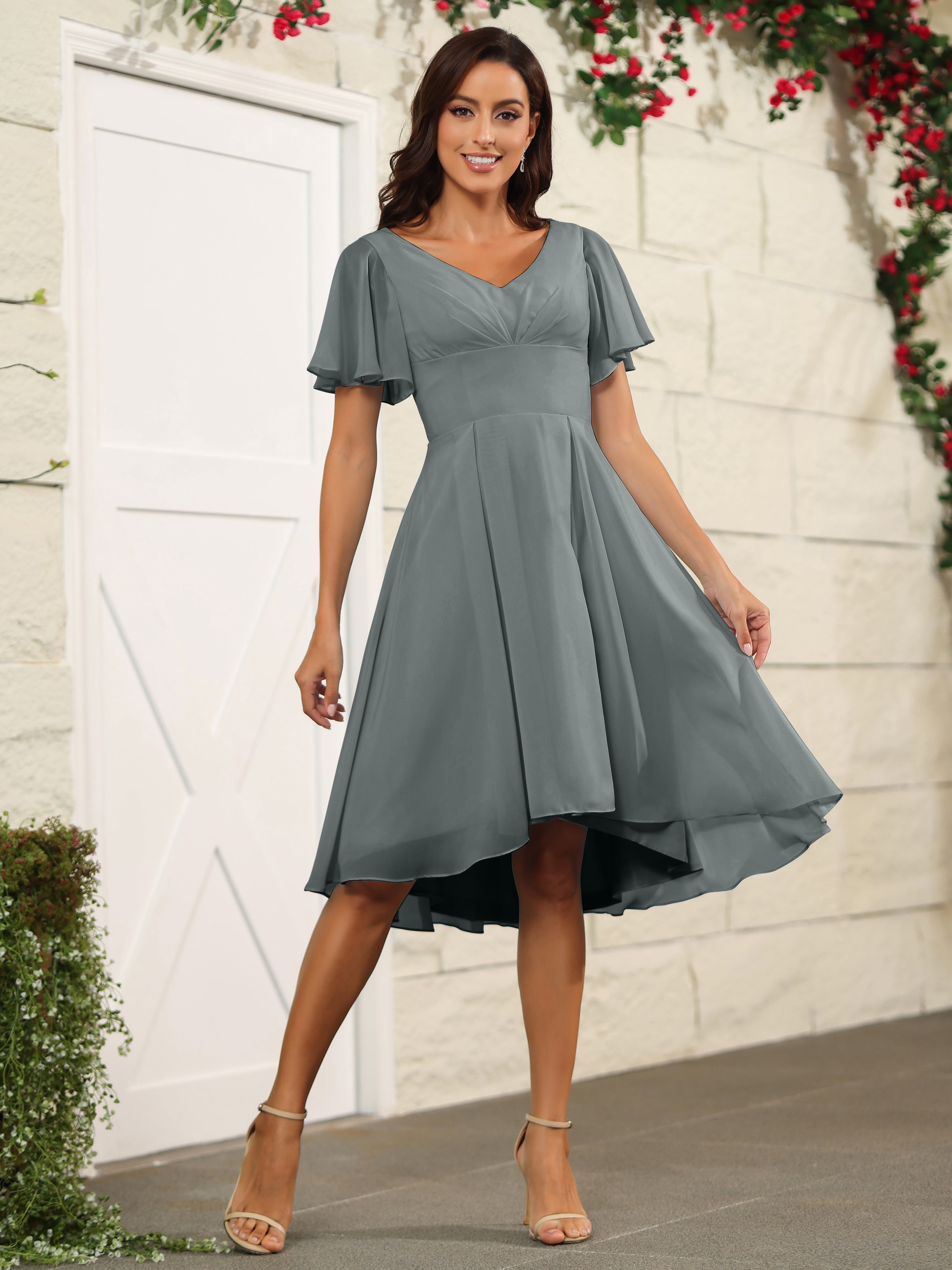 Short Sleeves Chiffon V Neck Knee Length Bridesmaid Dresses