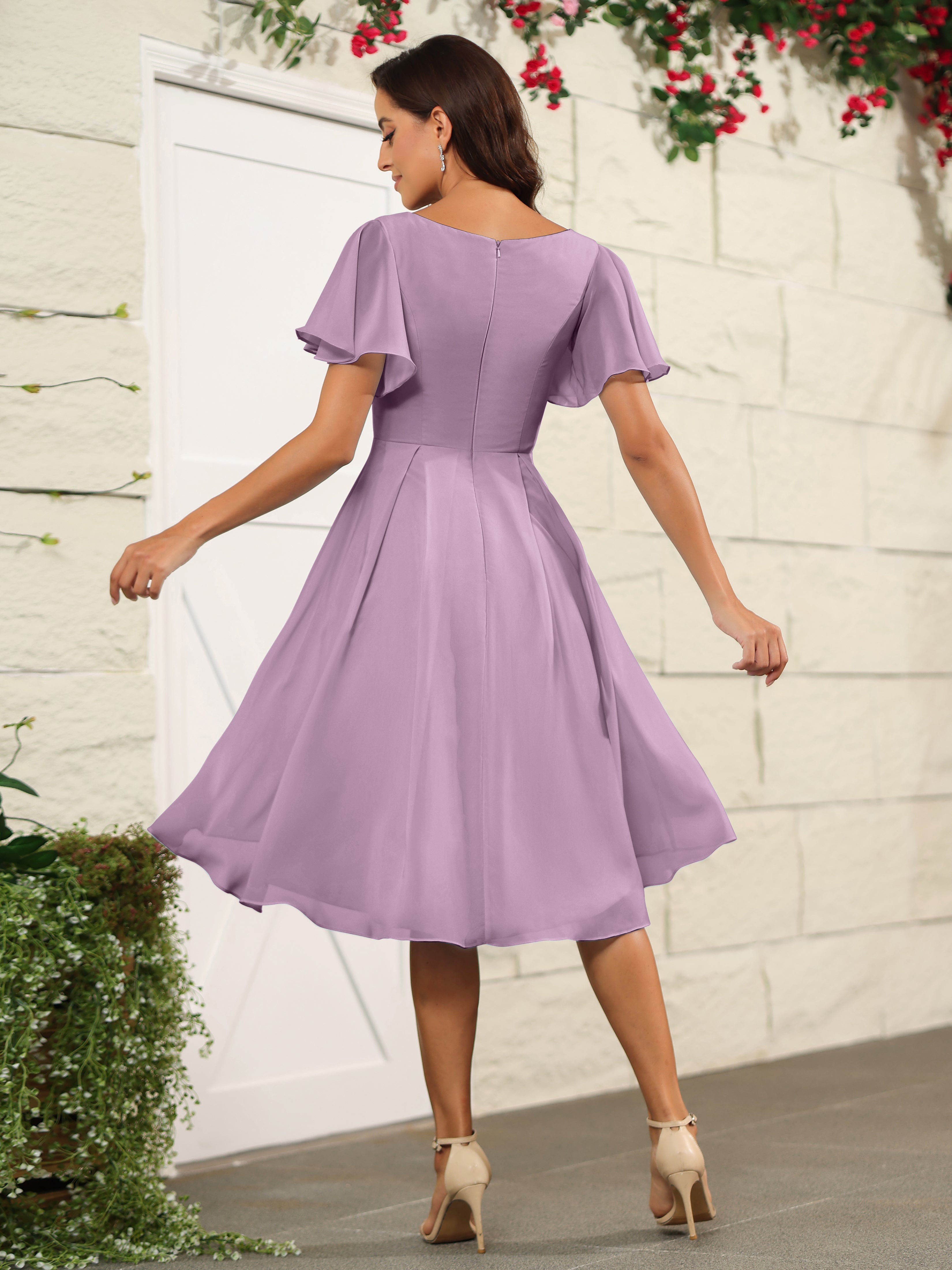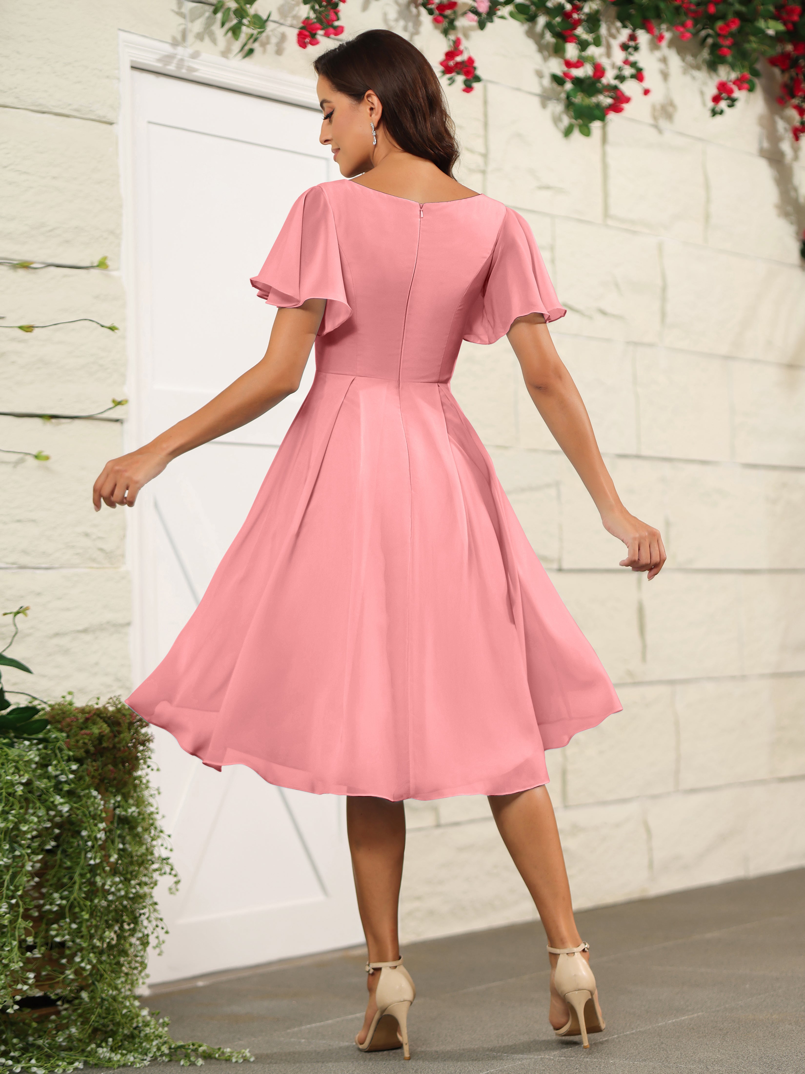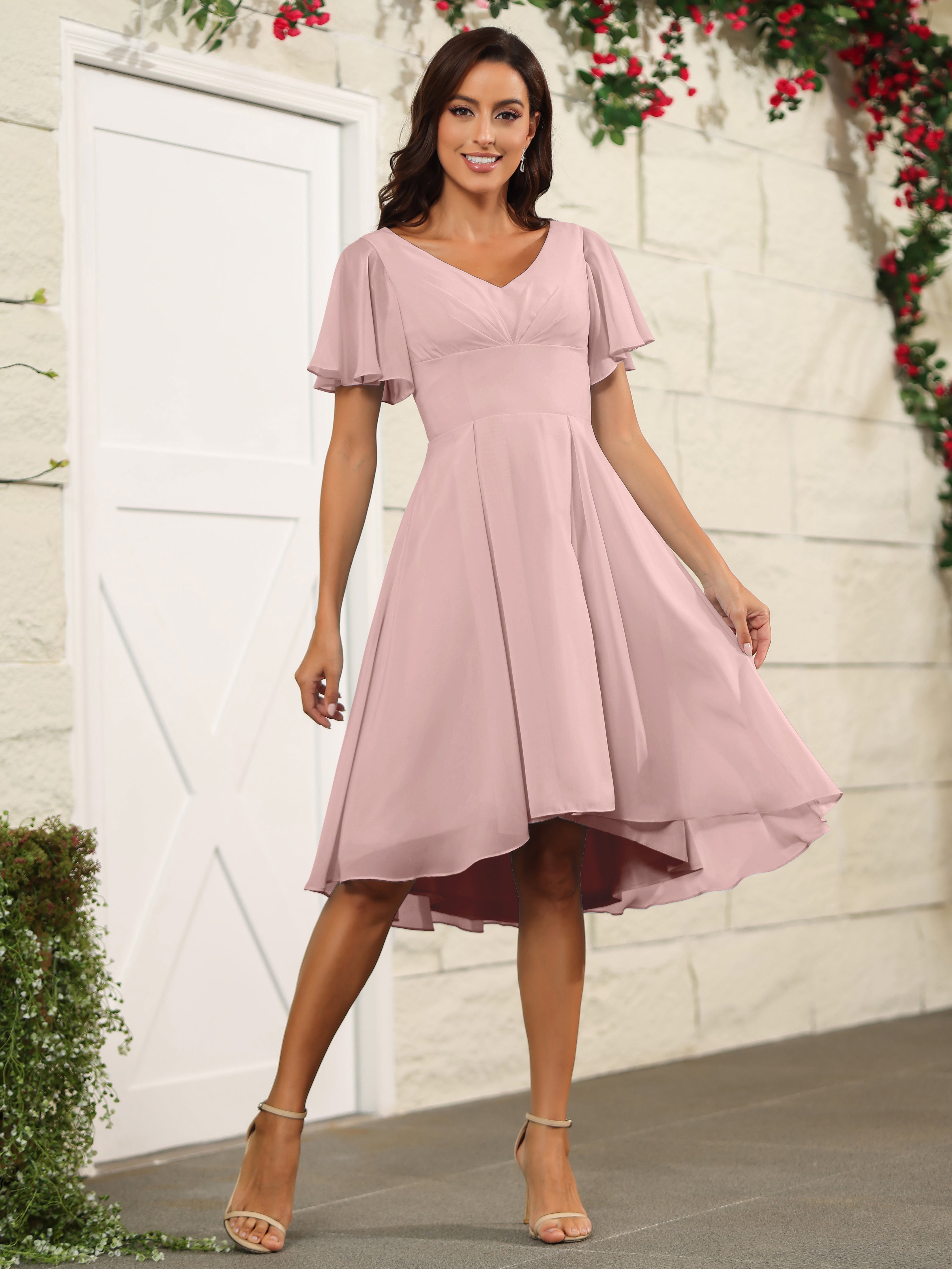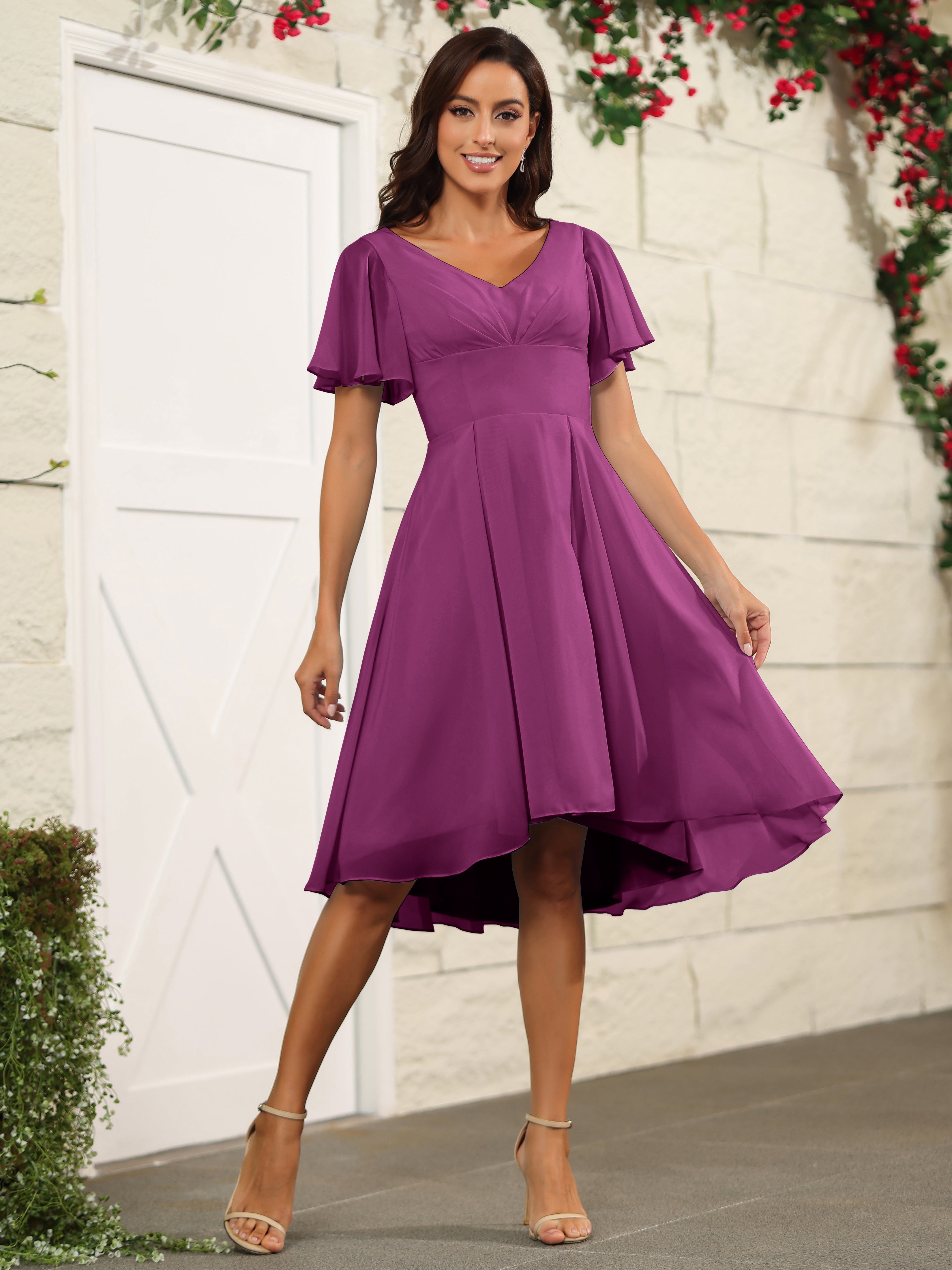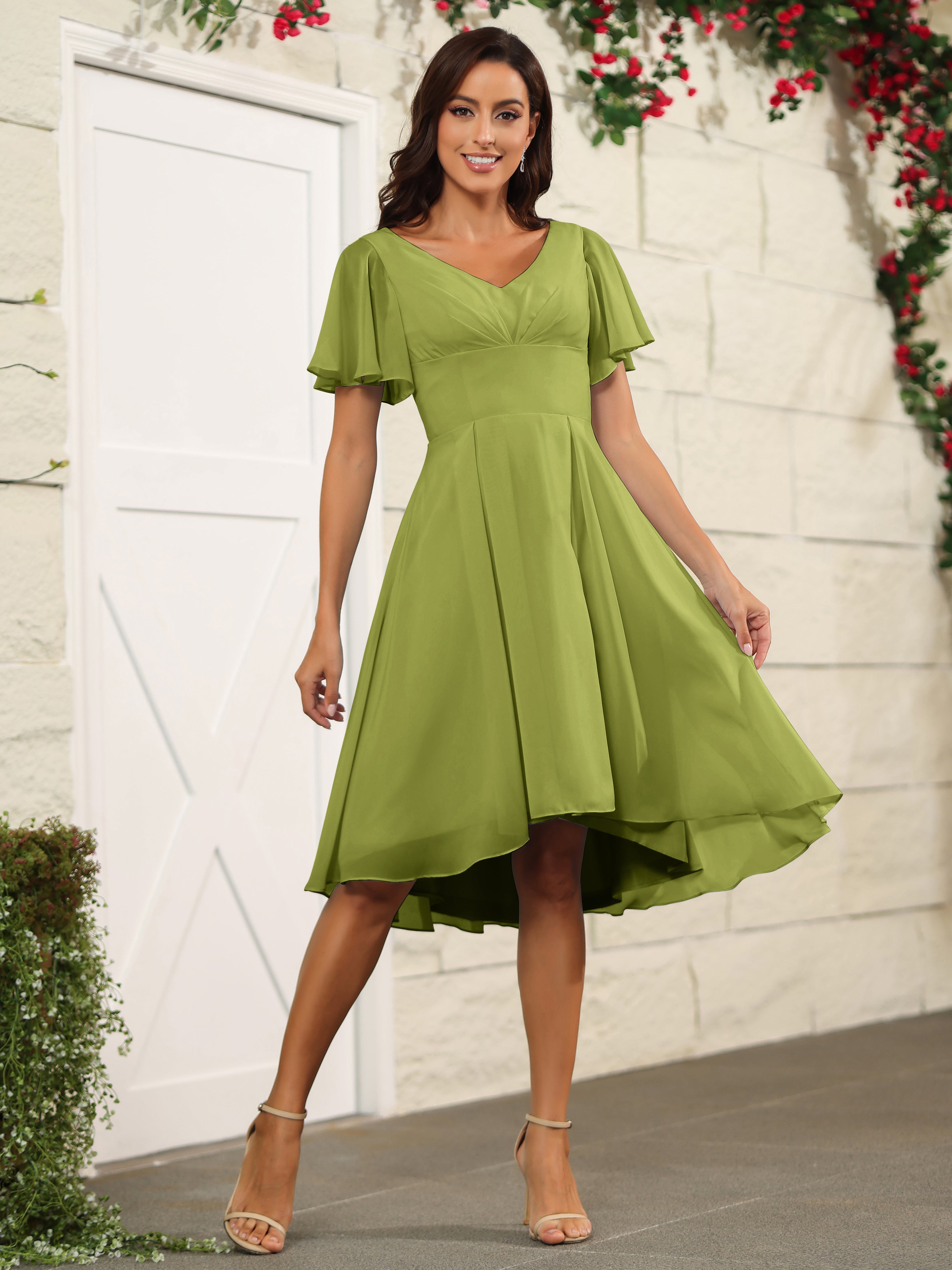 Short Sleeves Chiffon V Neck Knee Length Bridesmaid Dresses