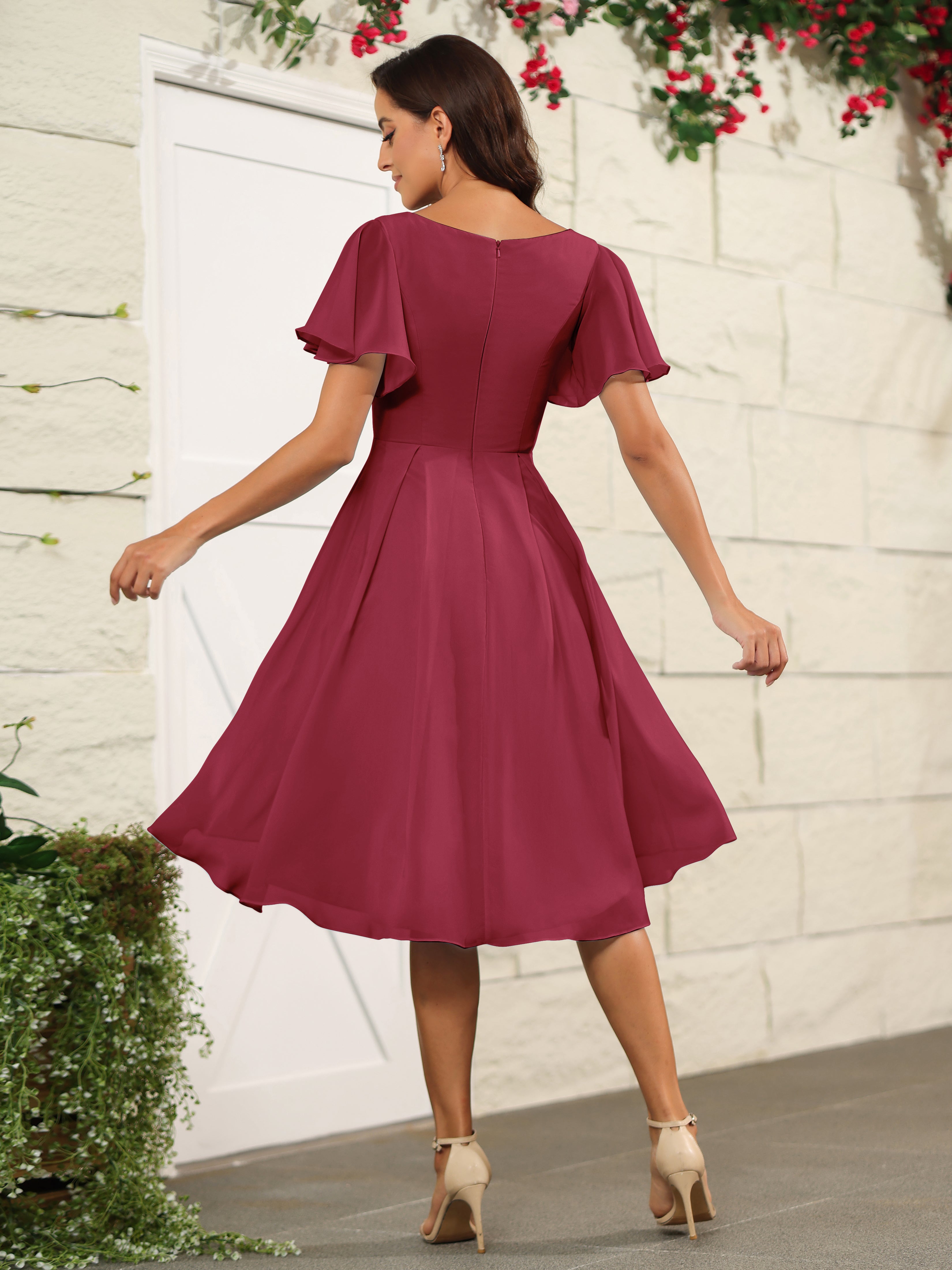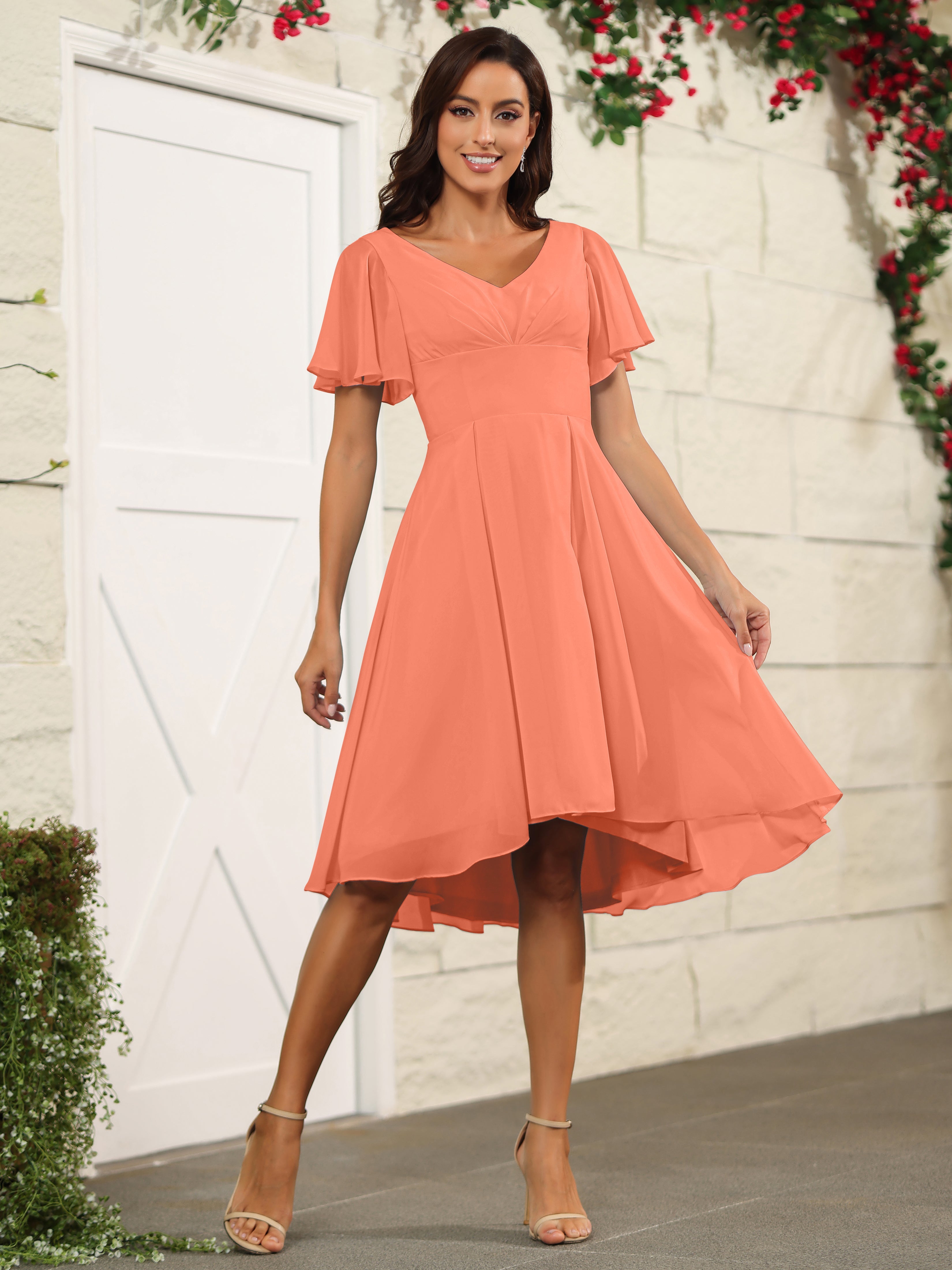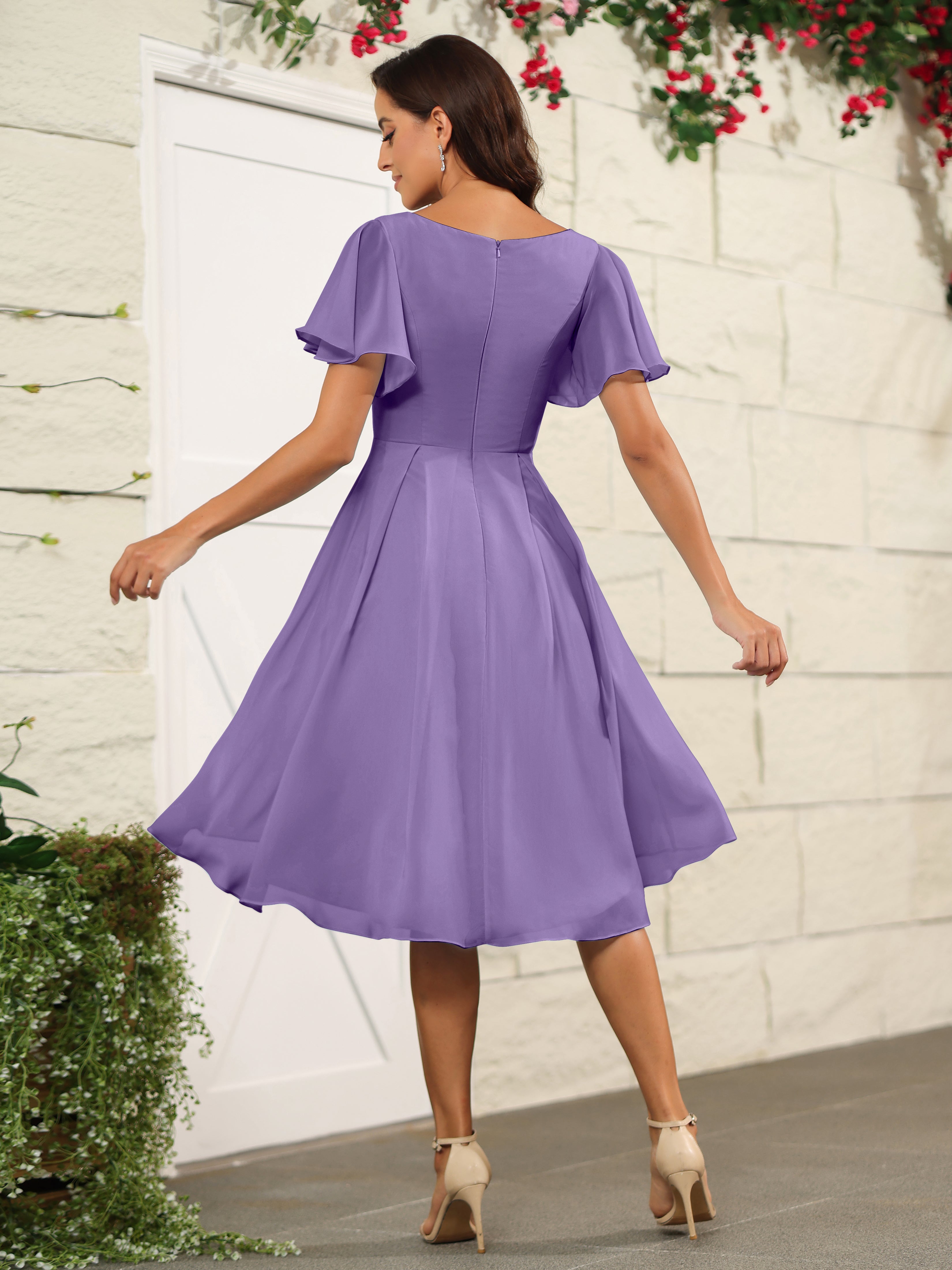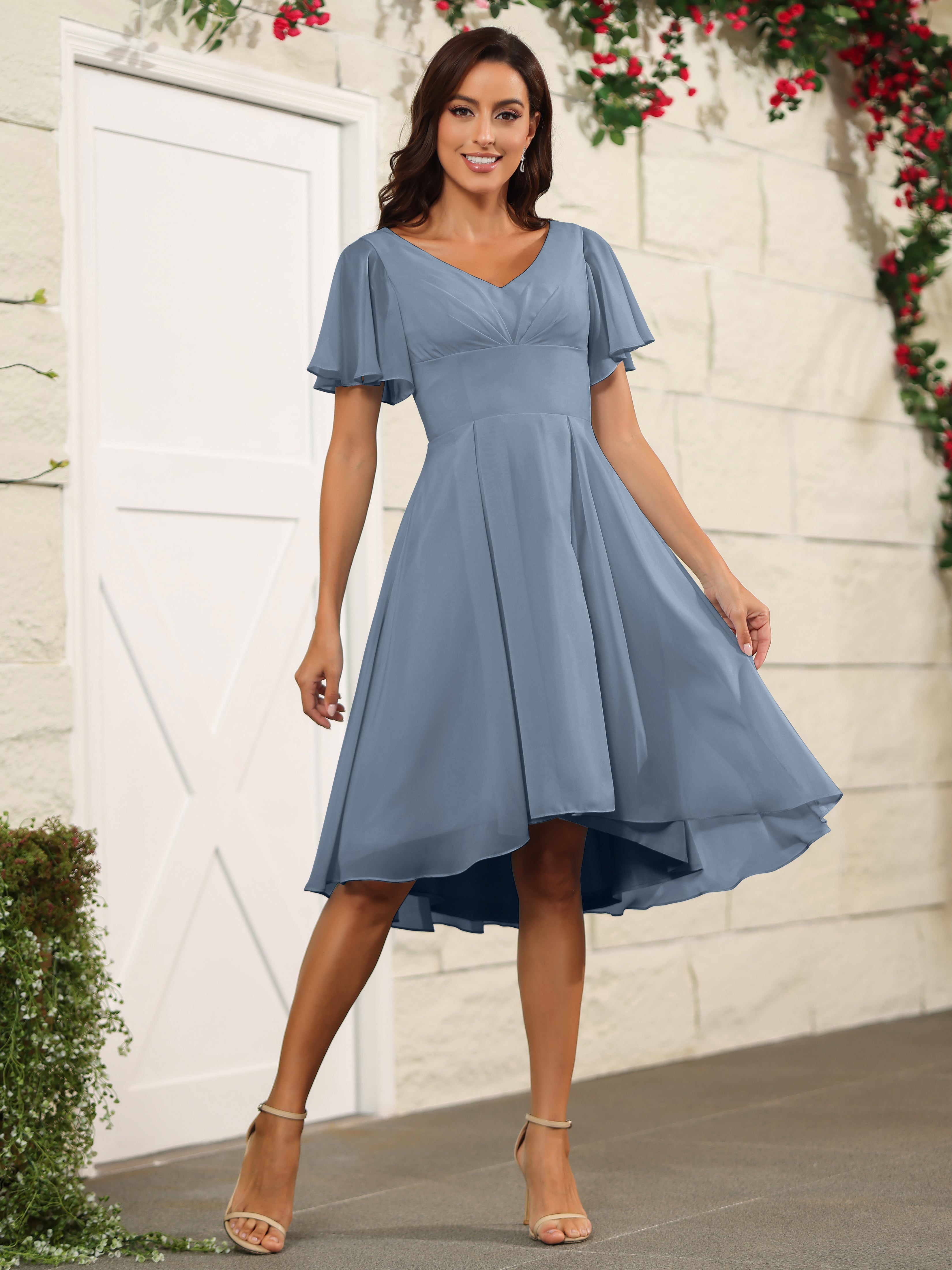 Short Sleeves Chiffon V Neck Knee Length Bridesmaid Dresses