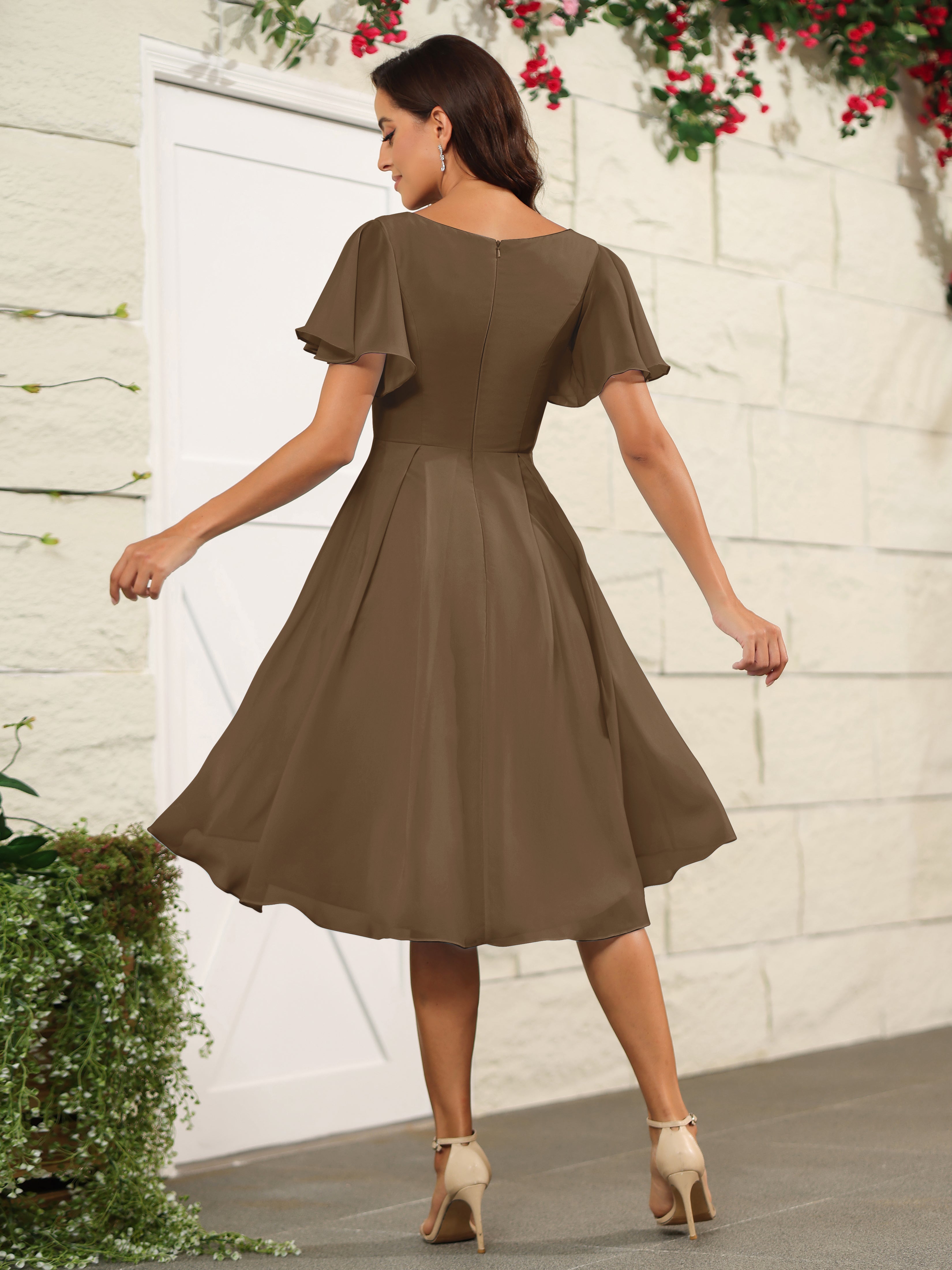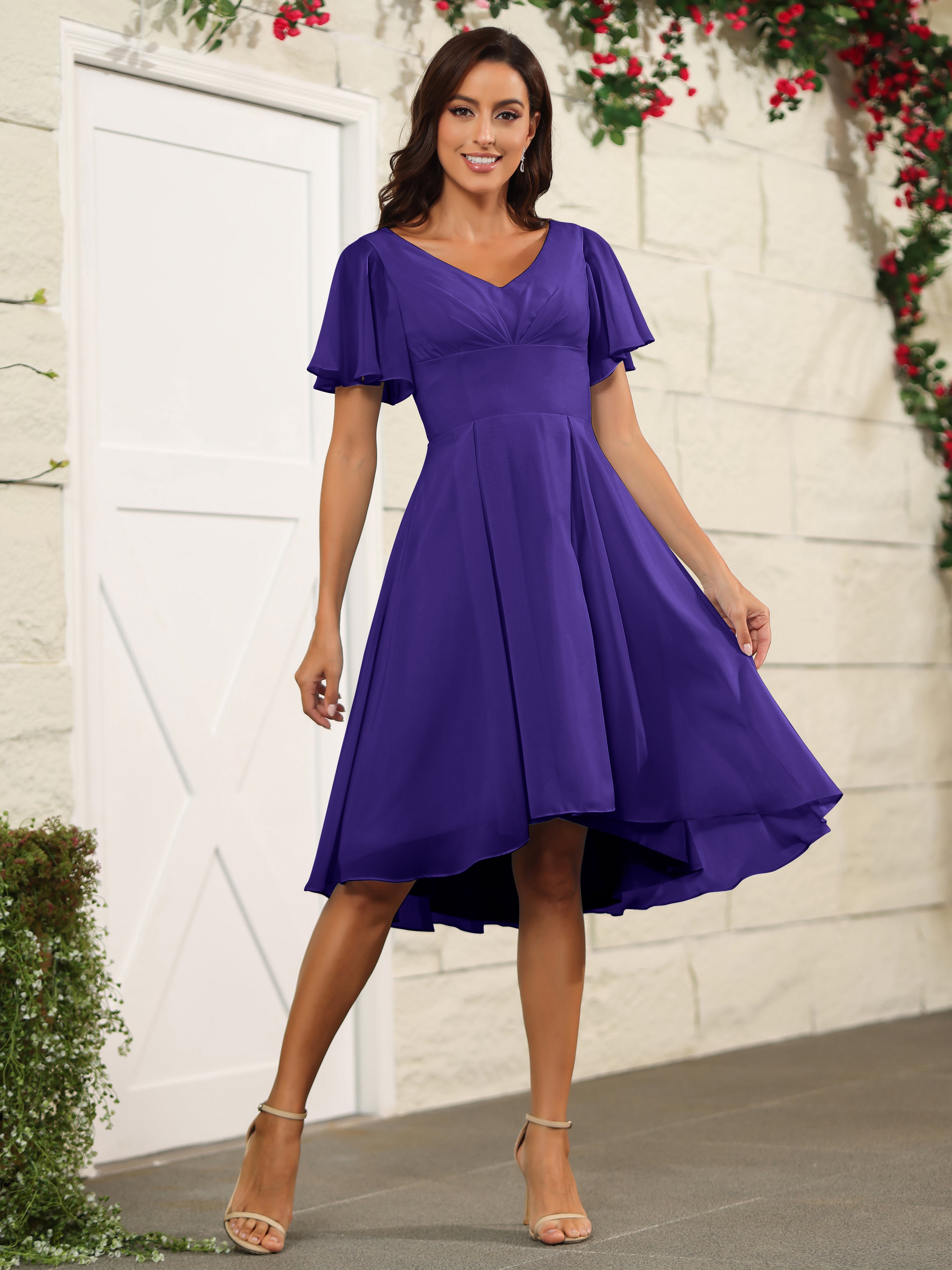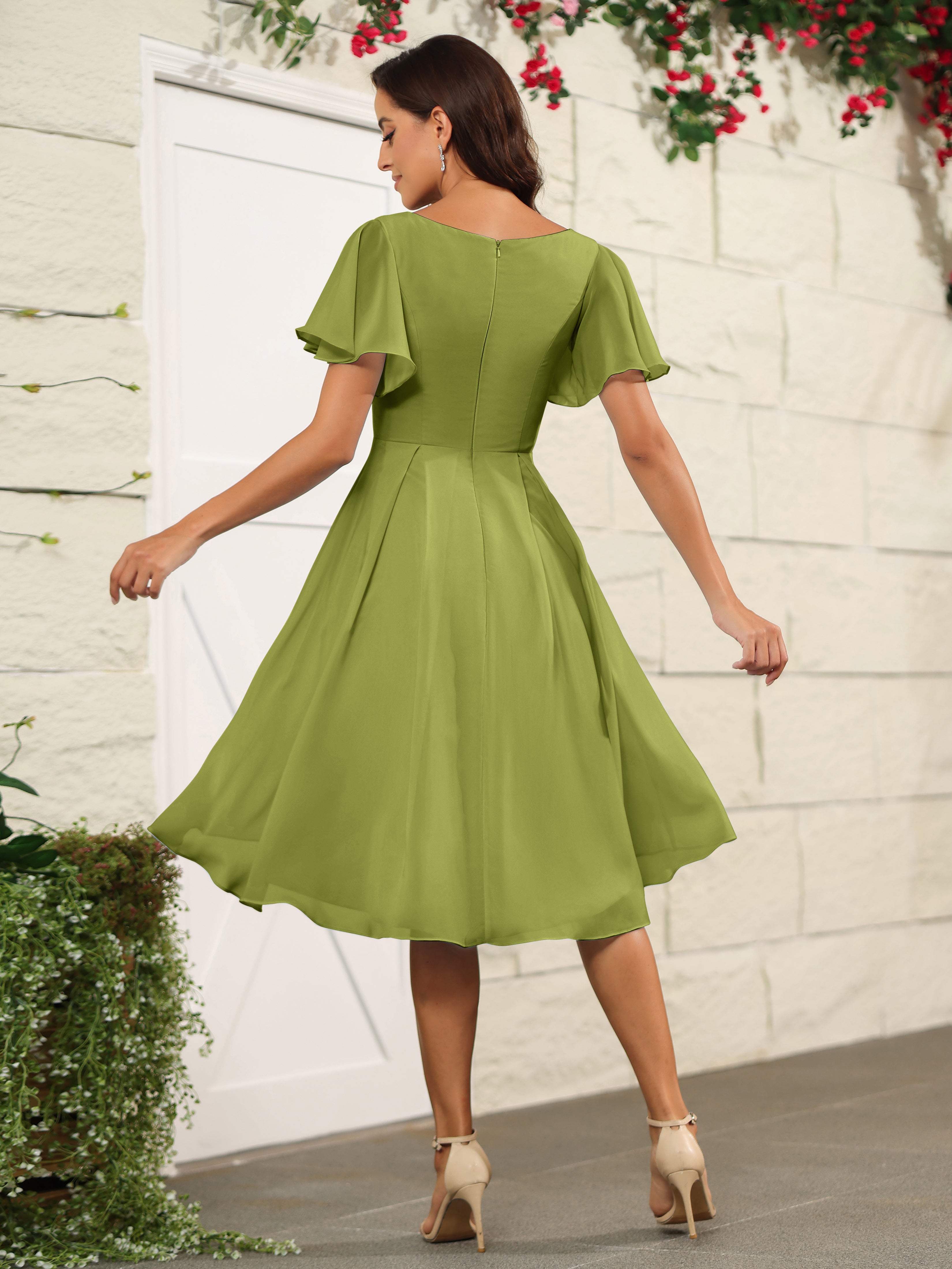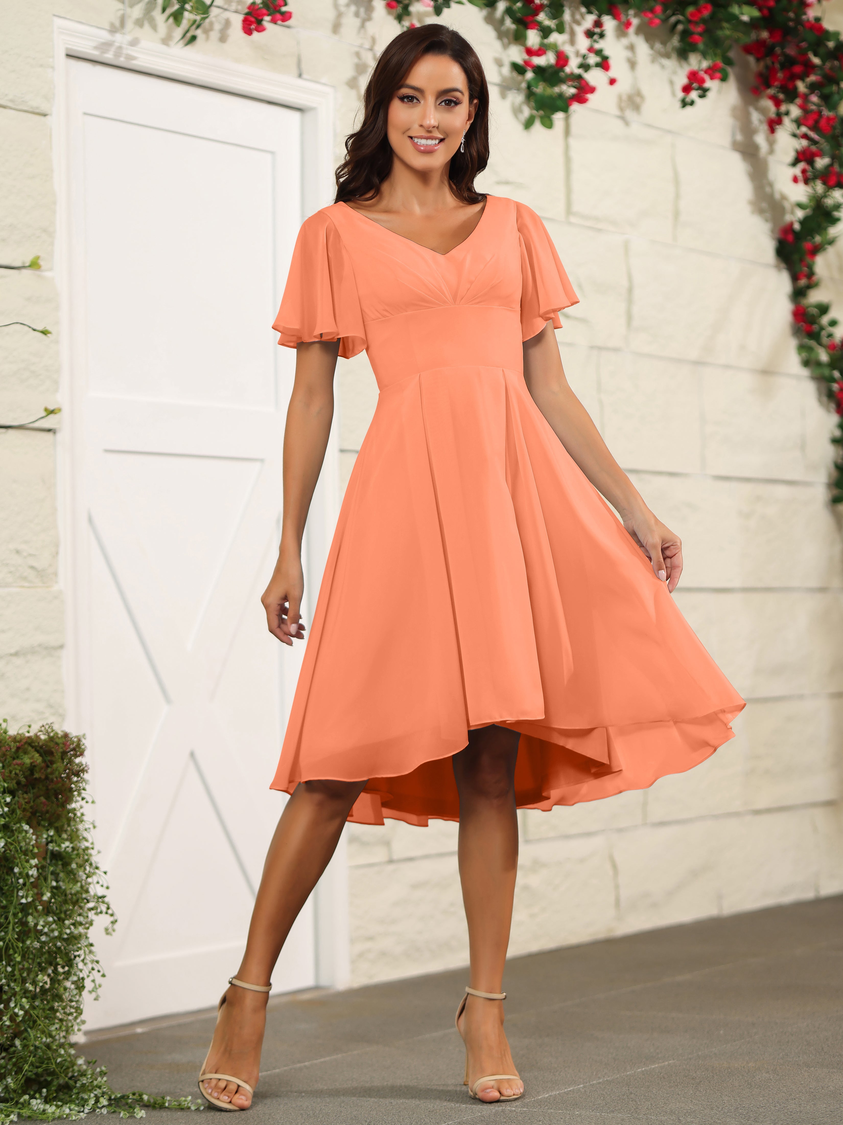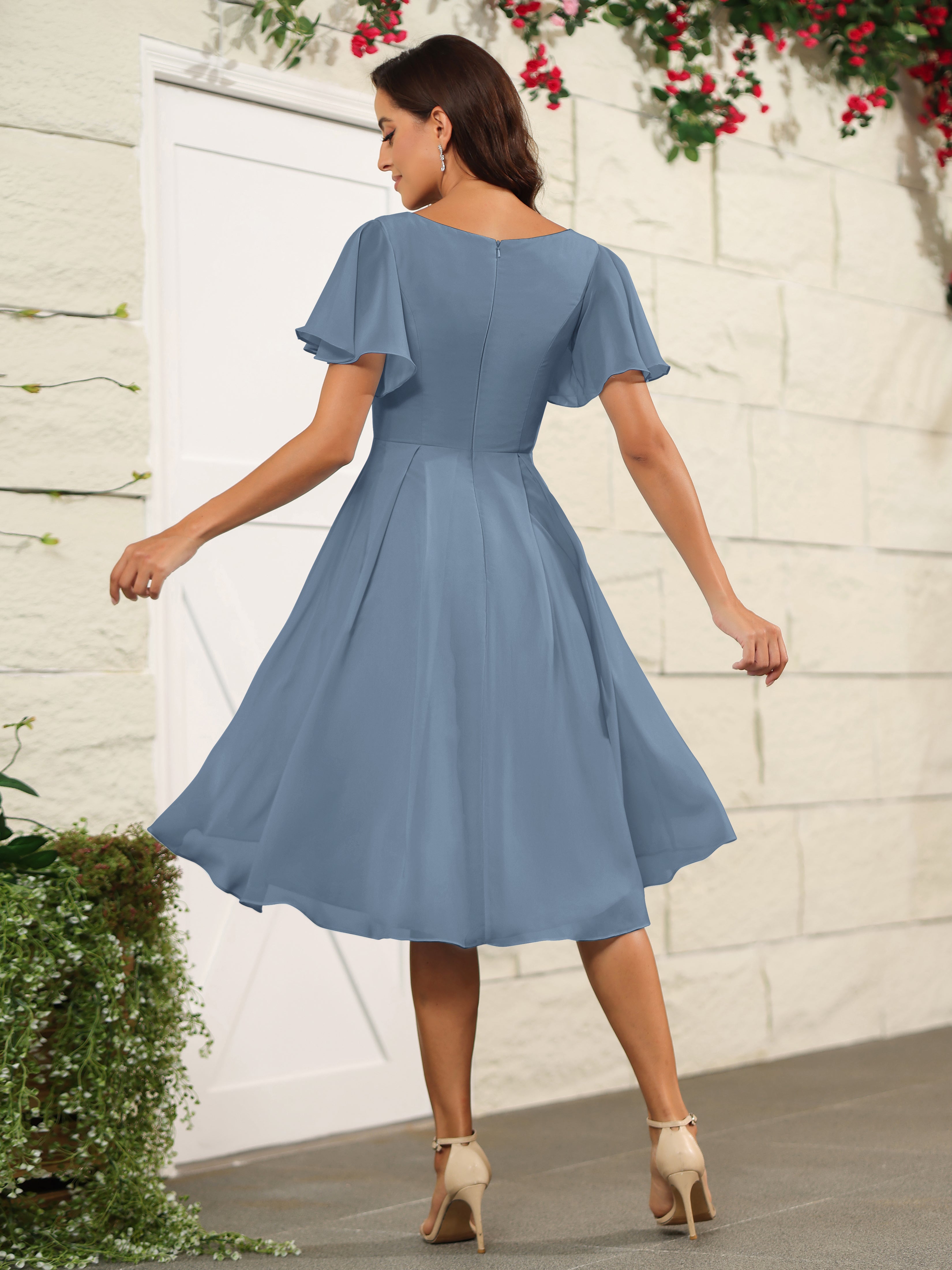Short Sleeves Chiffon V Neck Knee Length Bridesmaid Dresses