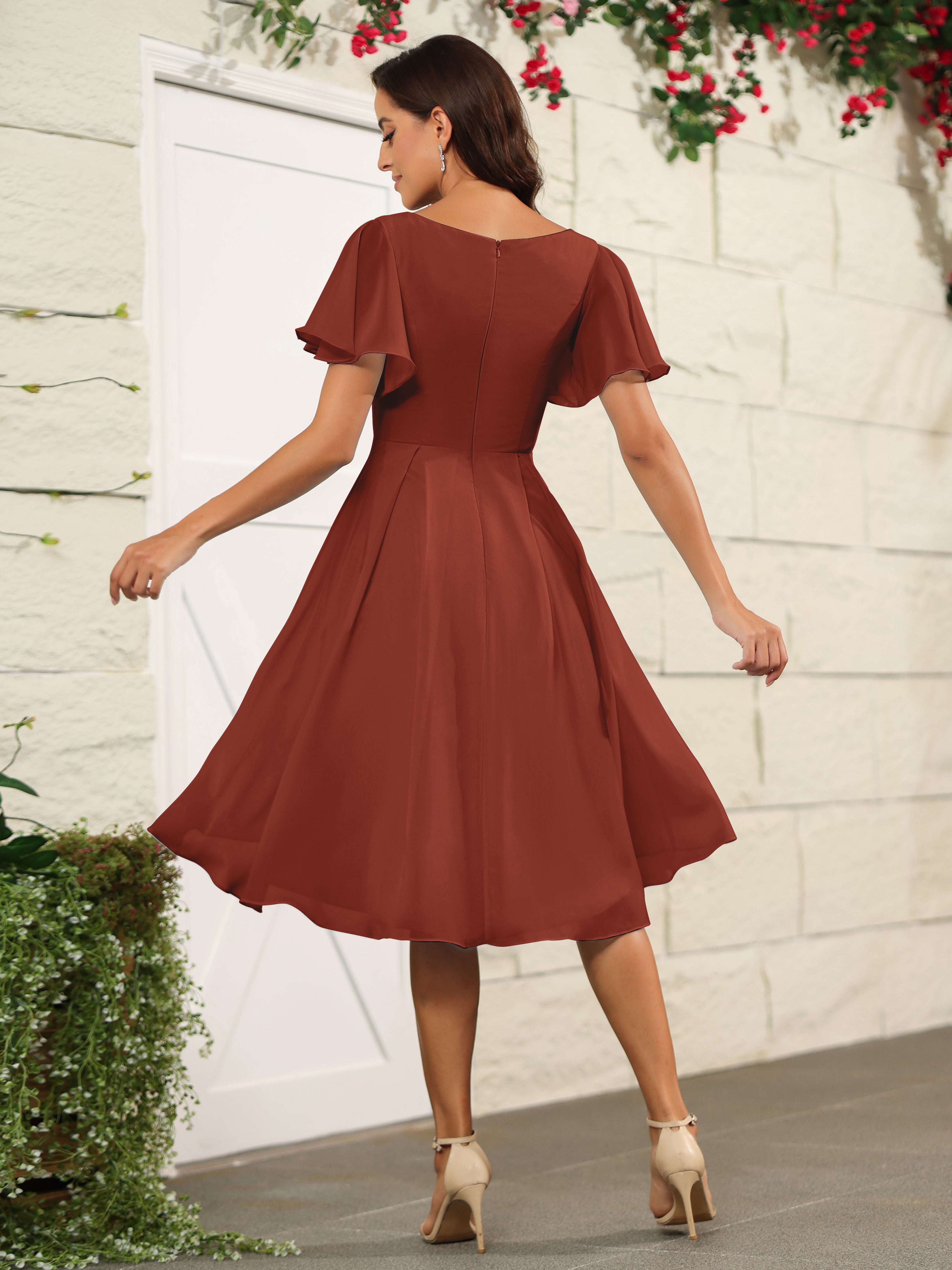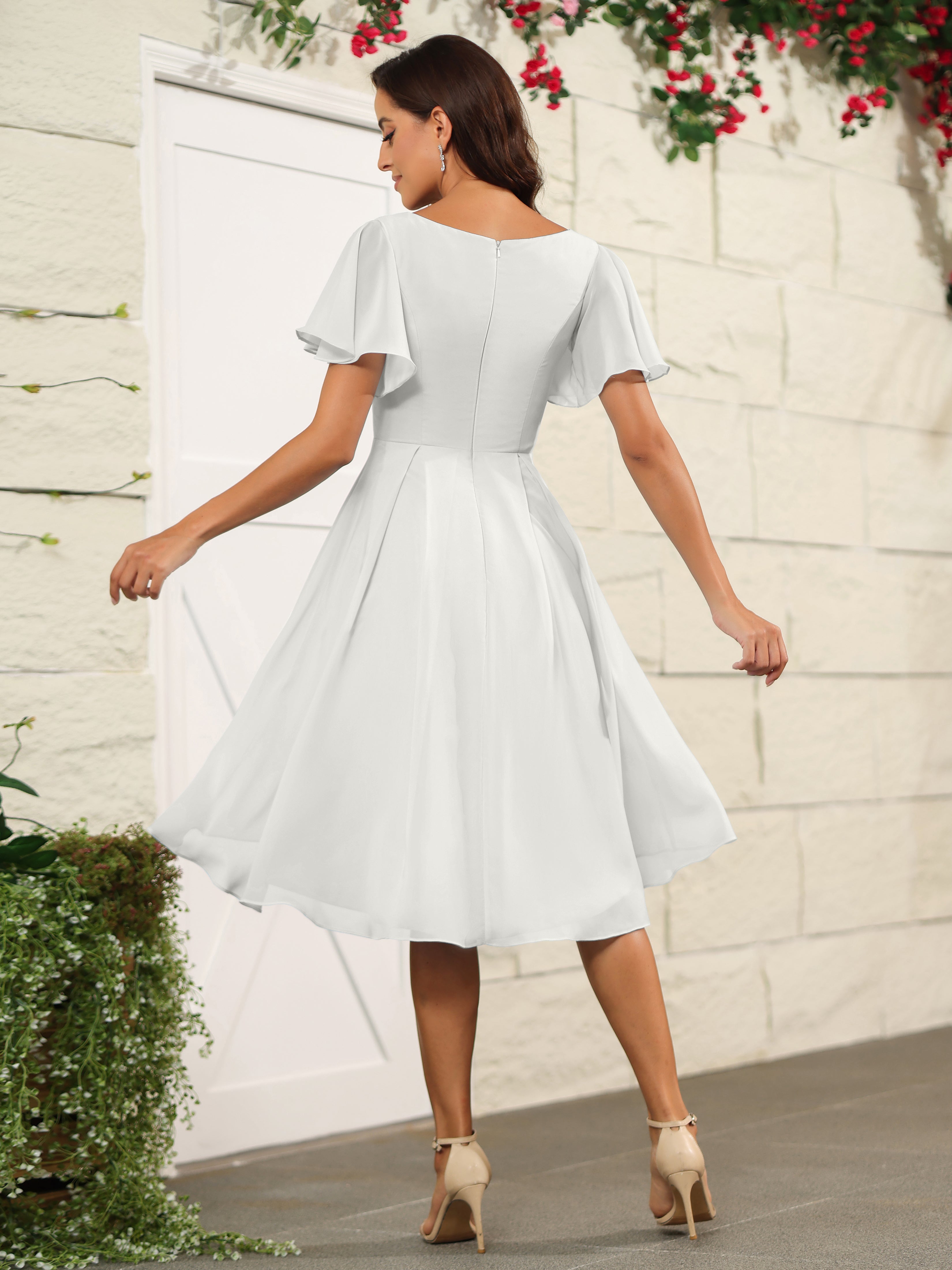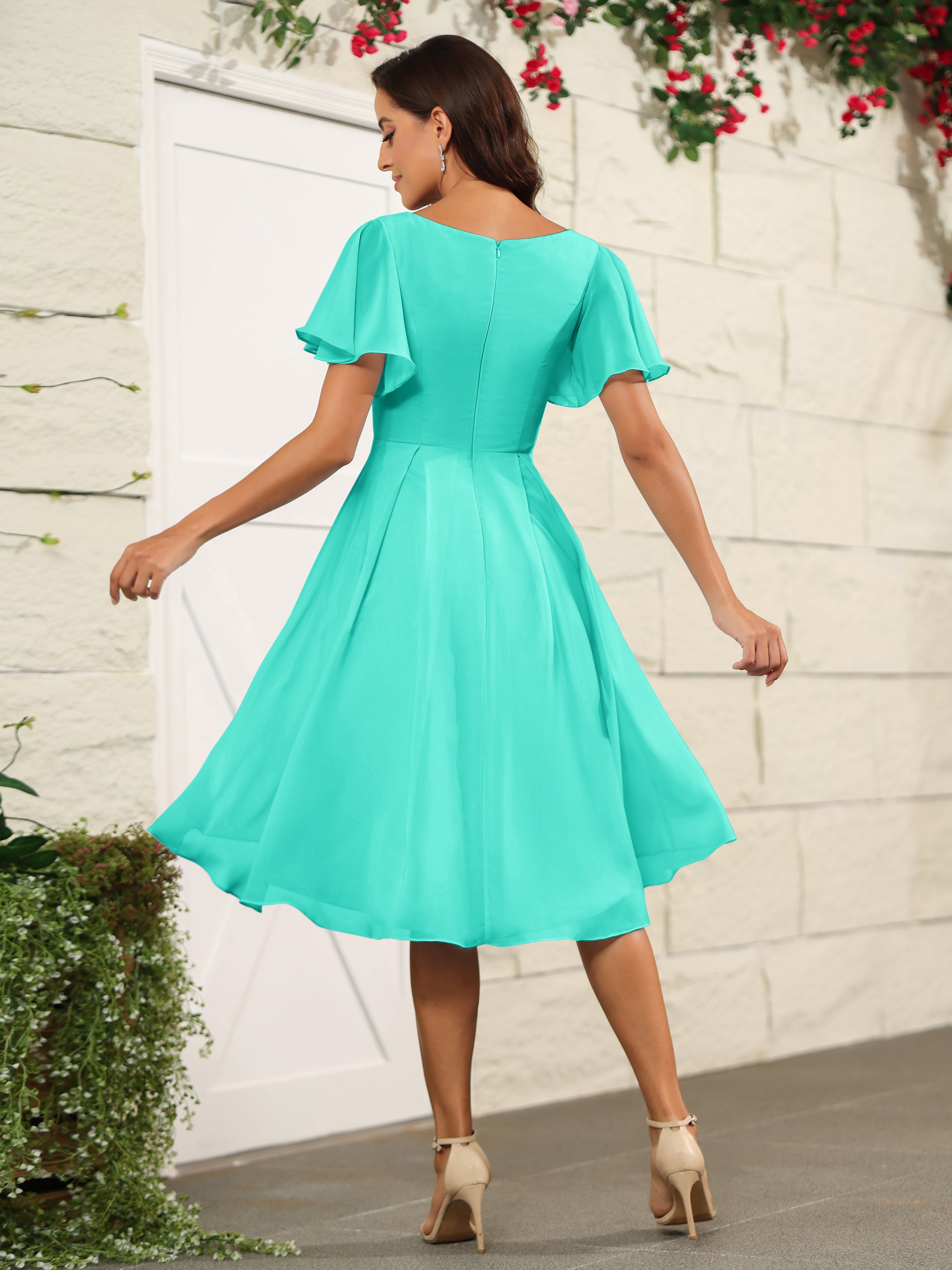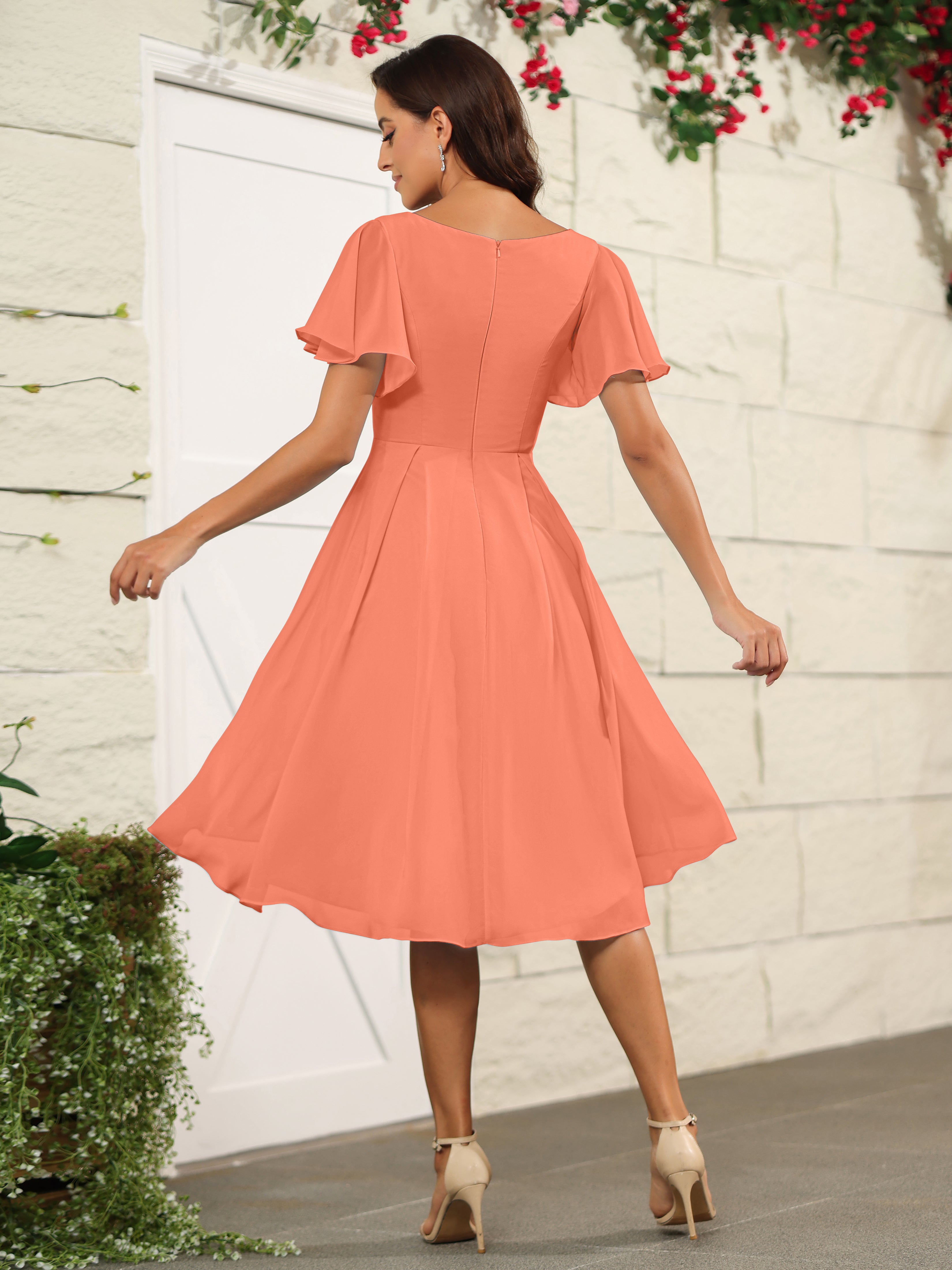 Upgrade your bridesmaid dress game with our Short Sleeves Chiffon V Neck Knee Length Bridesmaid Dresses. Effortlessly elegant and comfortable, these dresses feature a flowy chiffon fabric, v-neckline, and short sleeves for a flattering look. Perfect for weddings, formal events, and more.