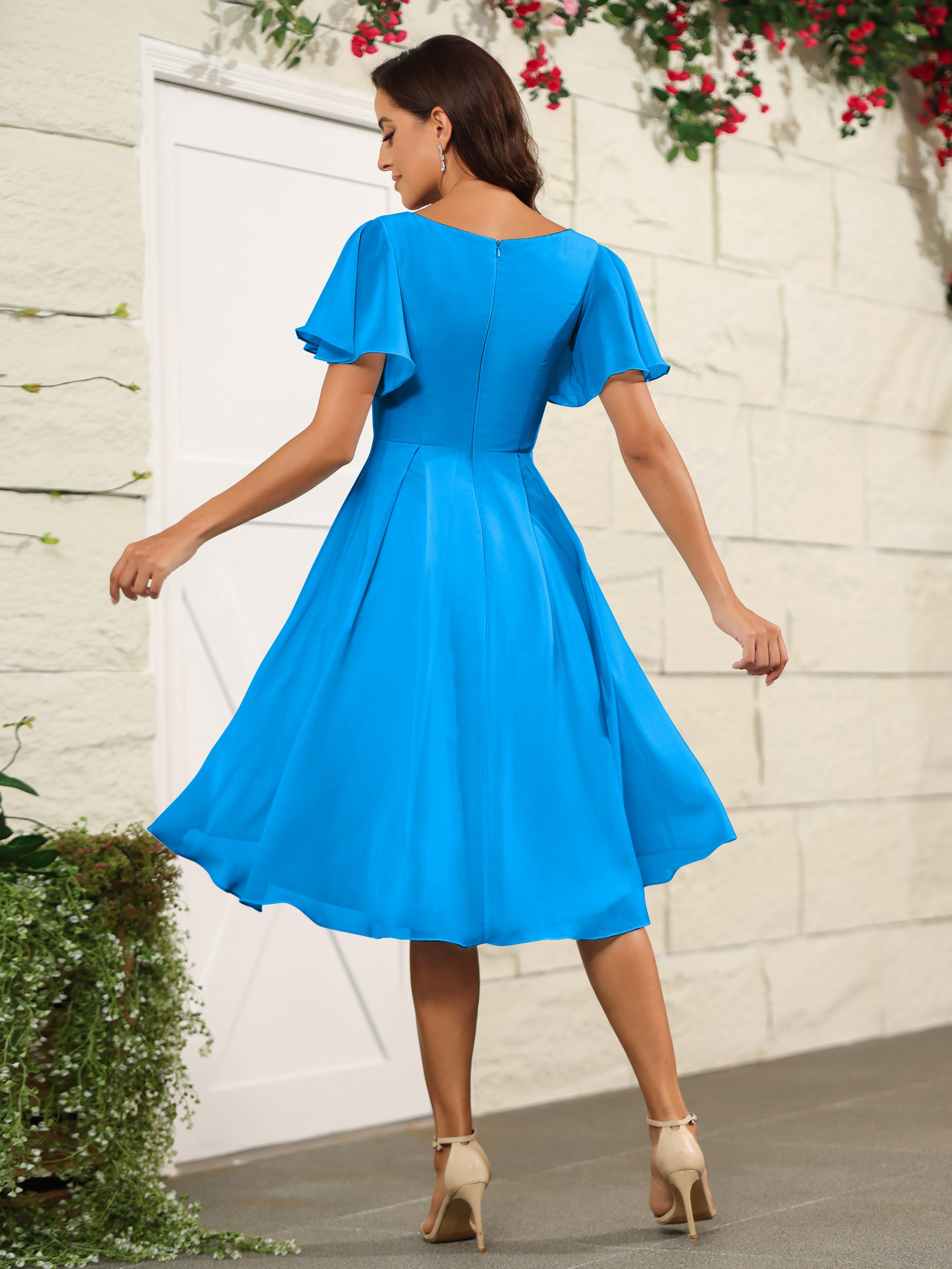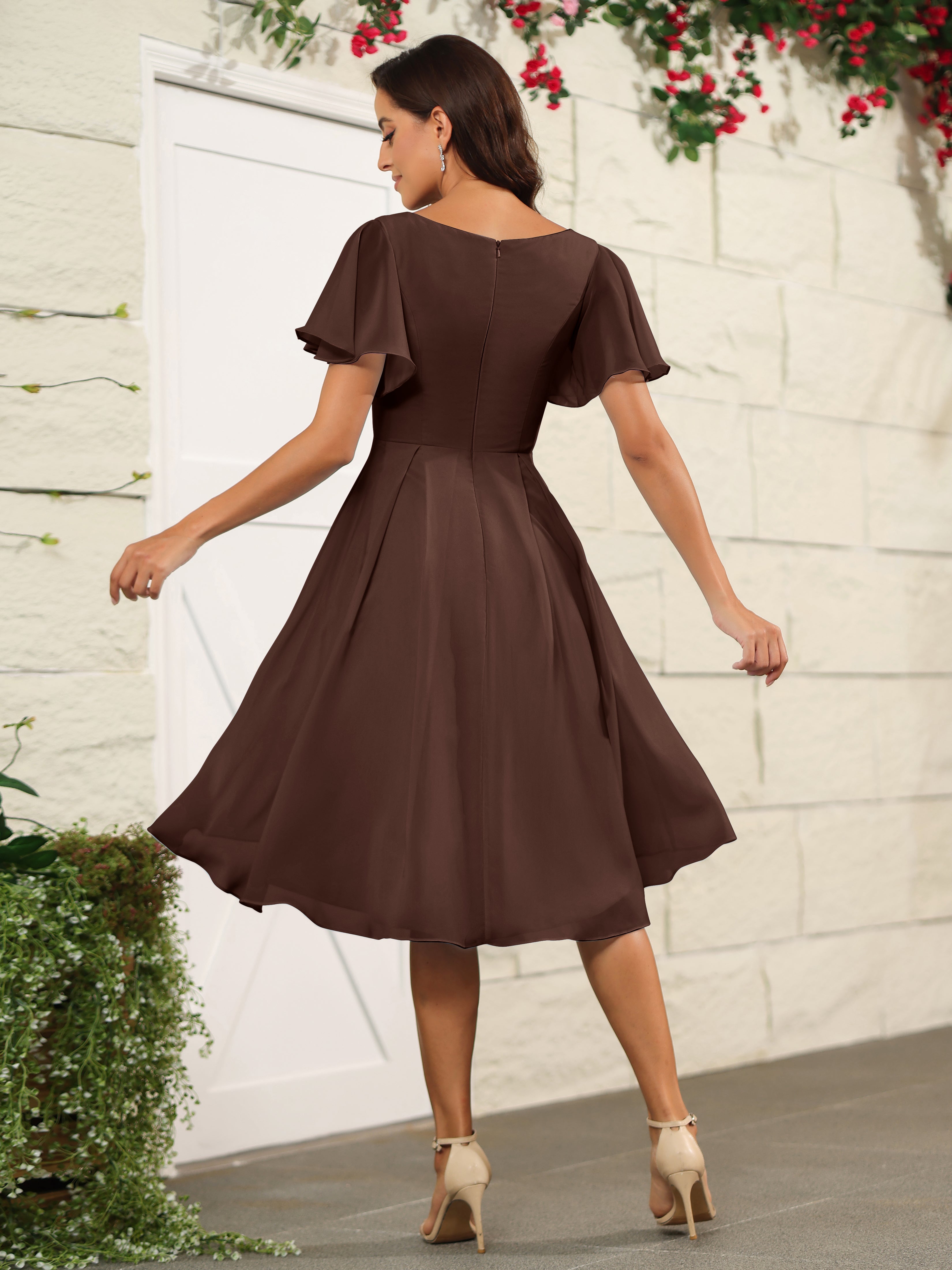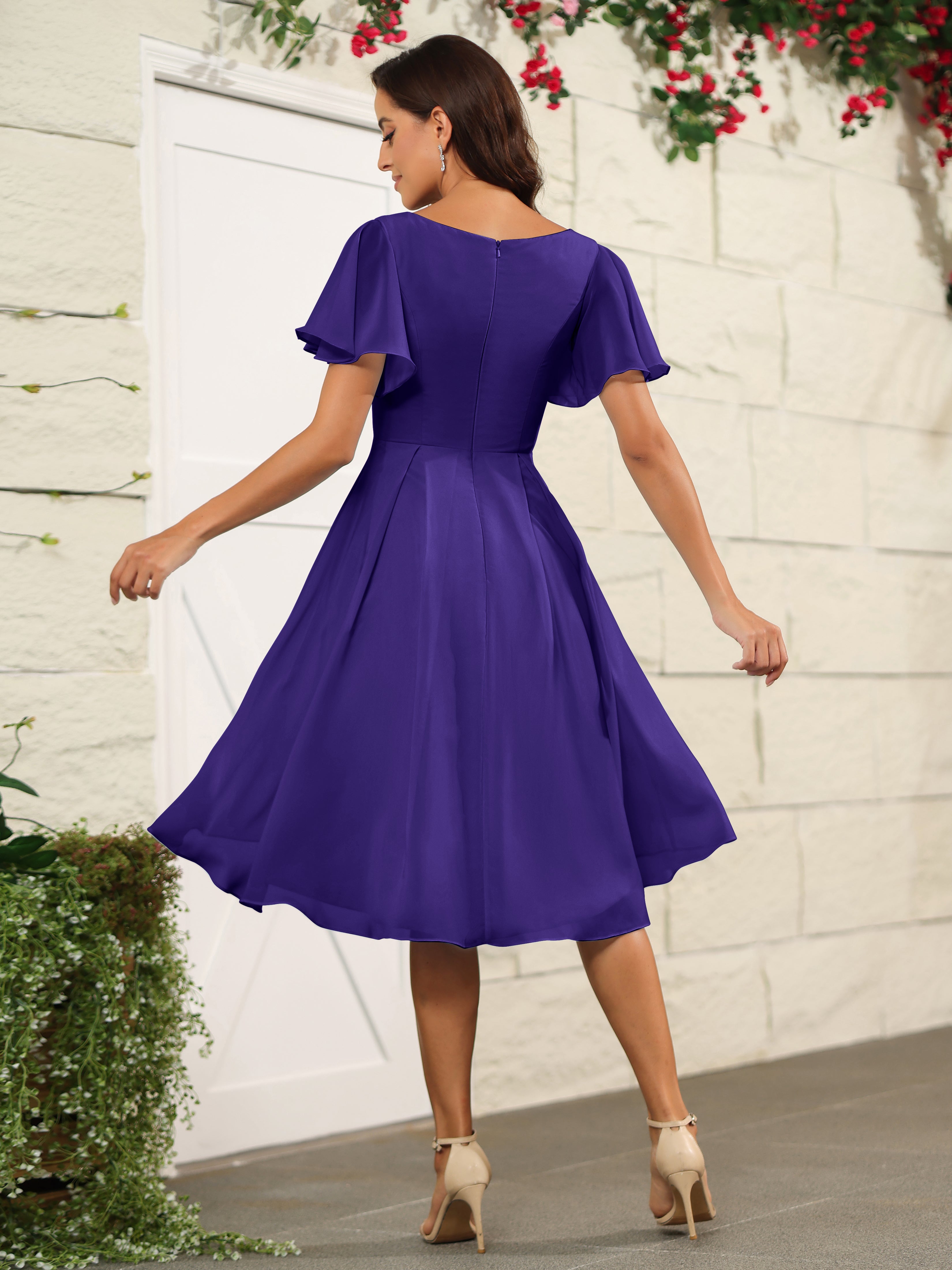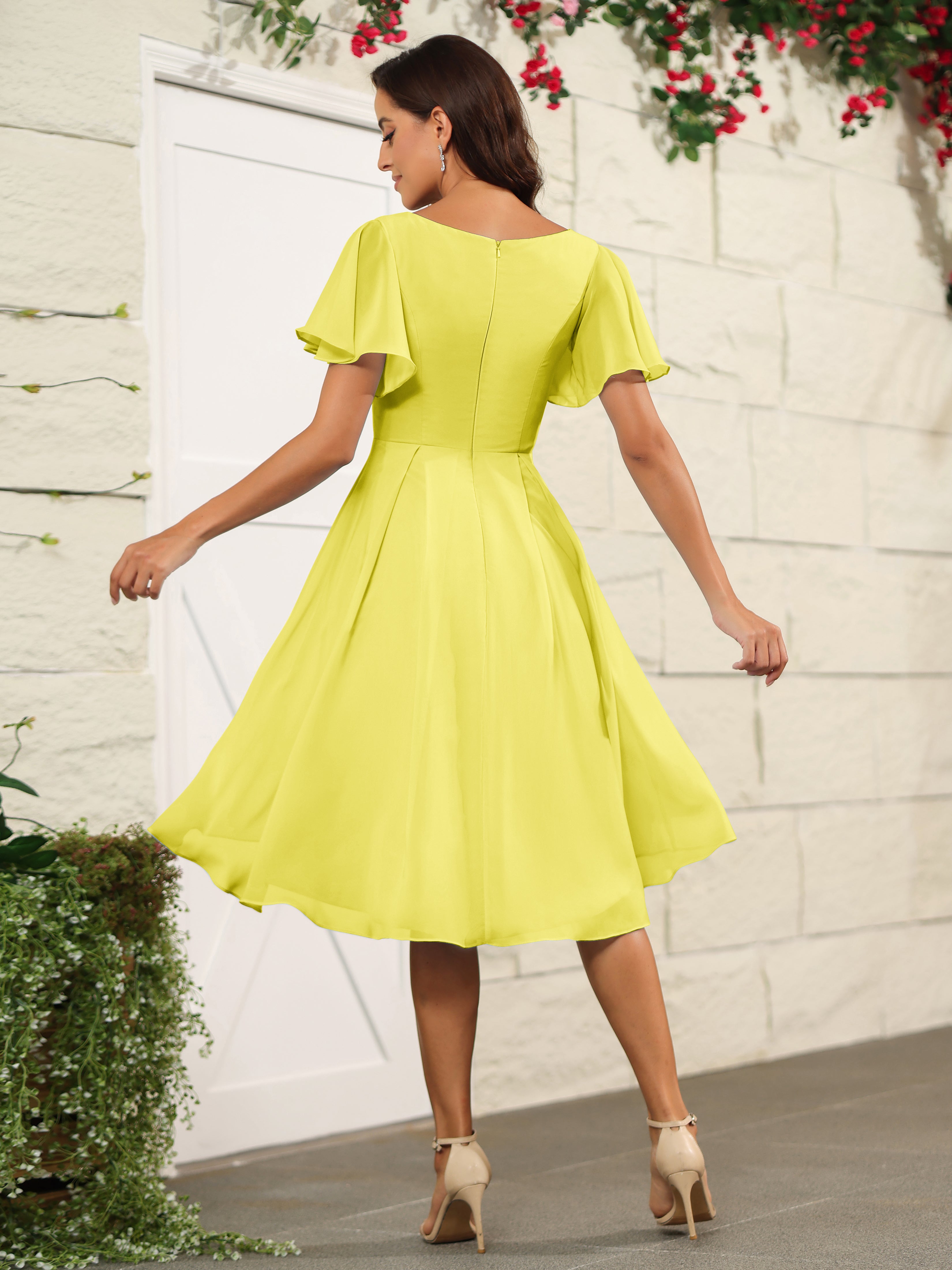 Upgrade your bridesmaid dress game with our Short Sleeves Chiffon V Neck Knee Length Bridesmaid Dresses. Effortlessly elegant and comfortable, these dresses feature a flowy chiffon fabric, v-neckline, and short sleeves for a flattering look. Perfect for weddings, formal events, and more.