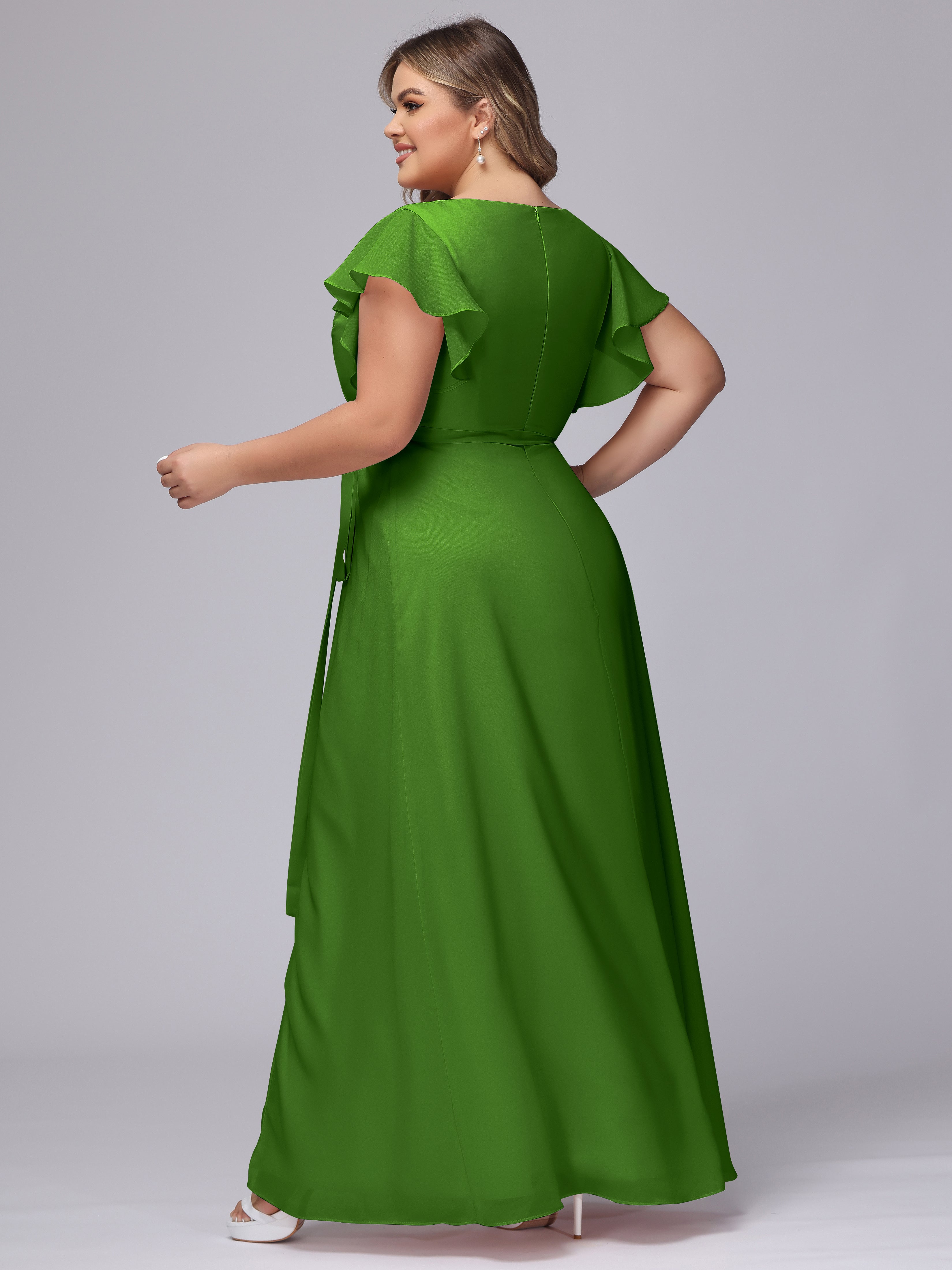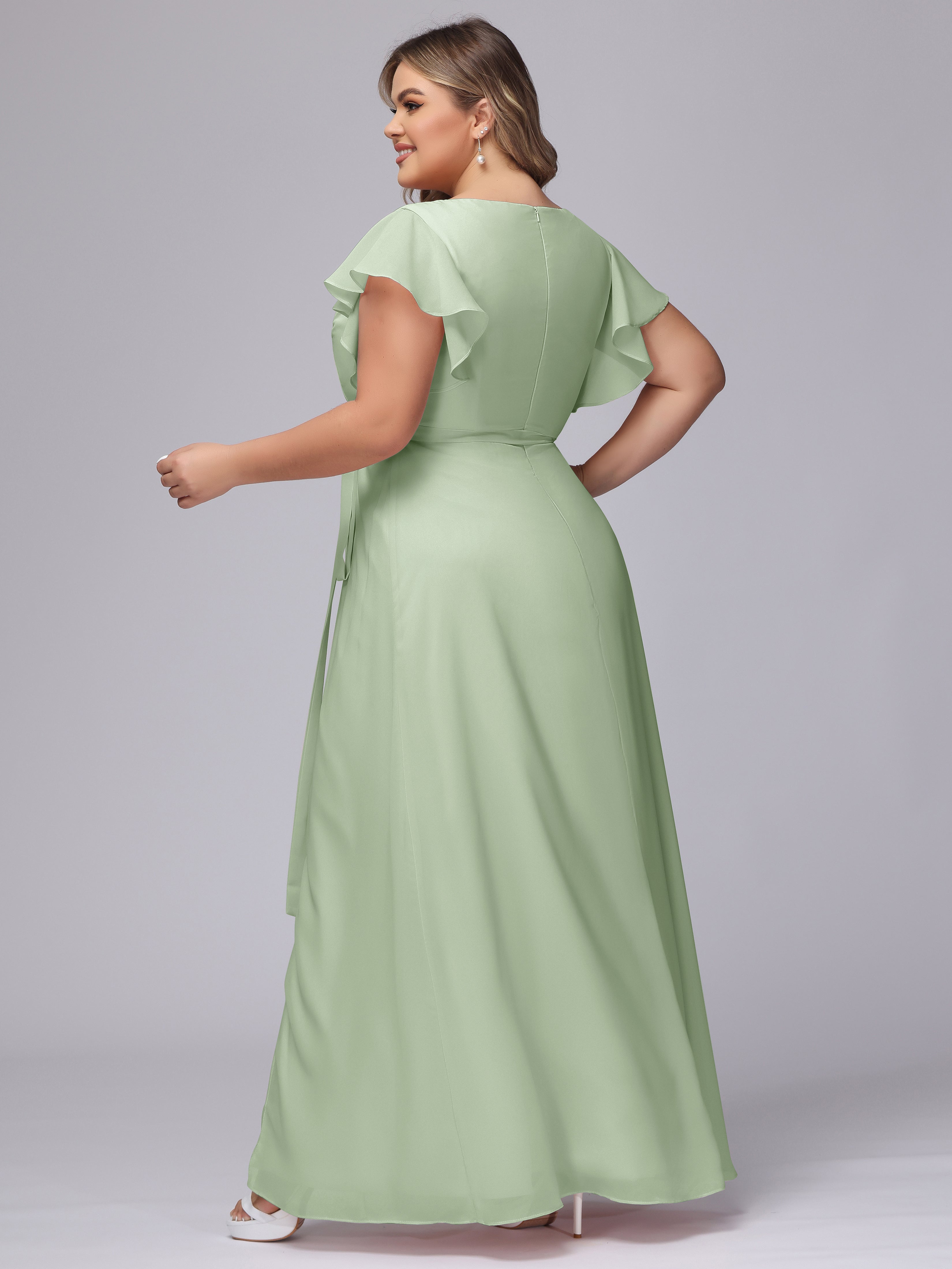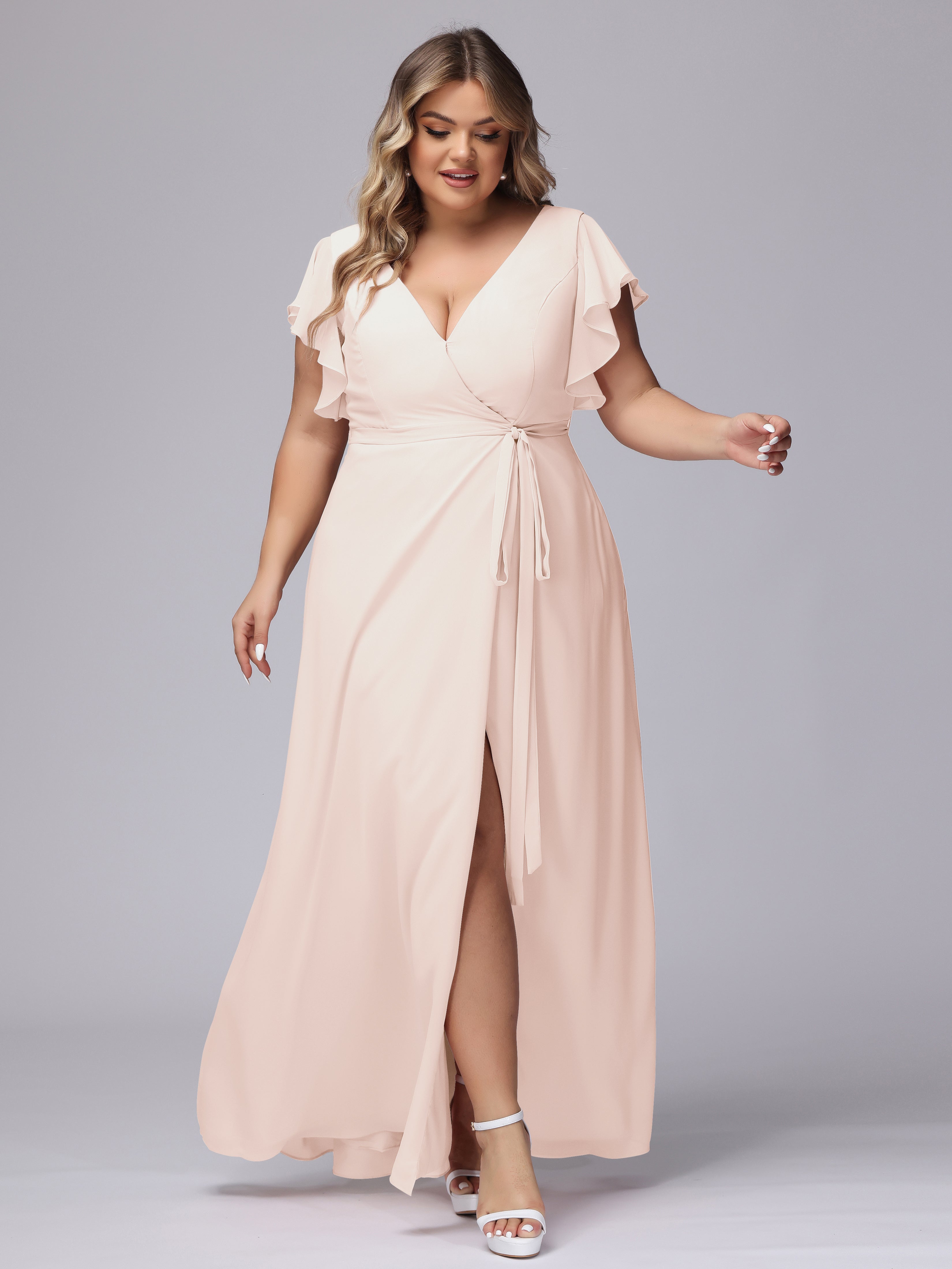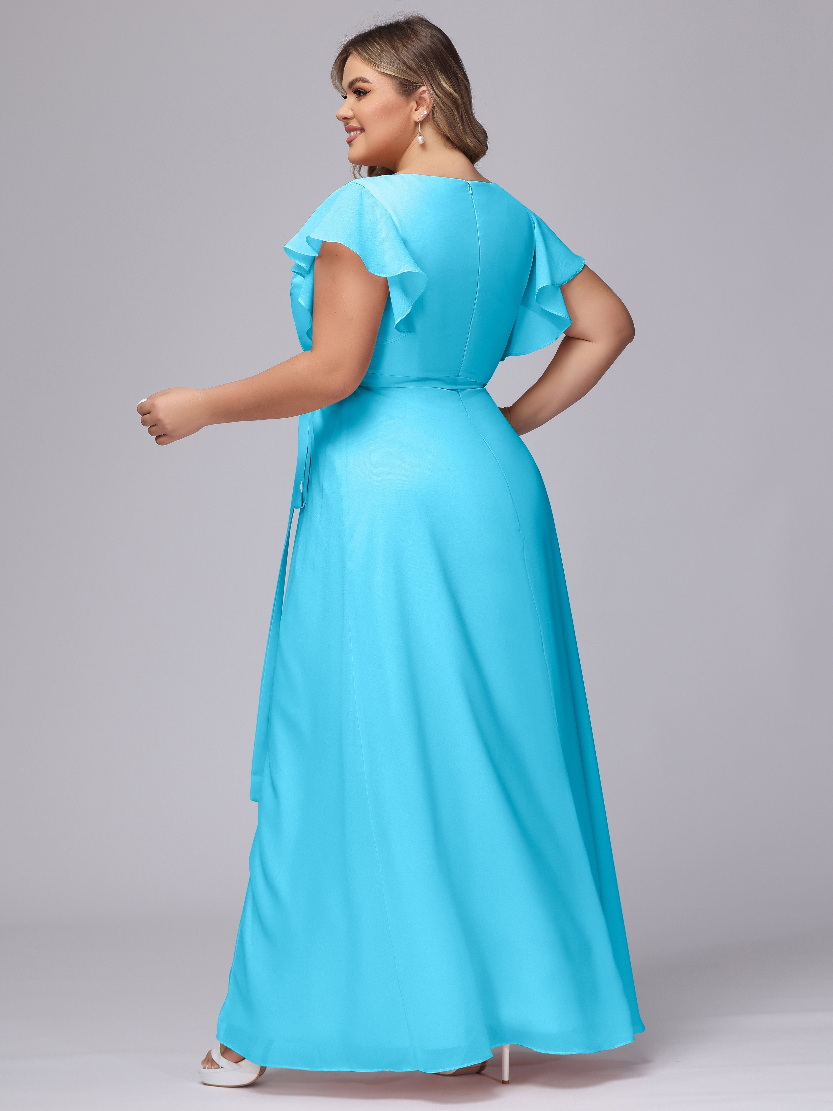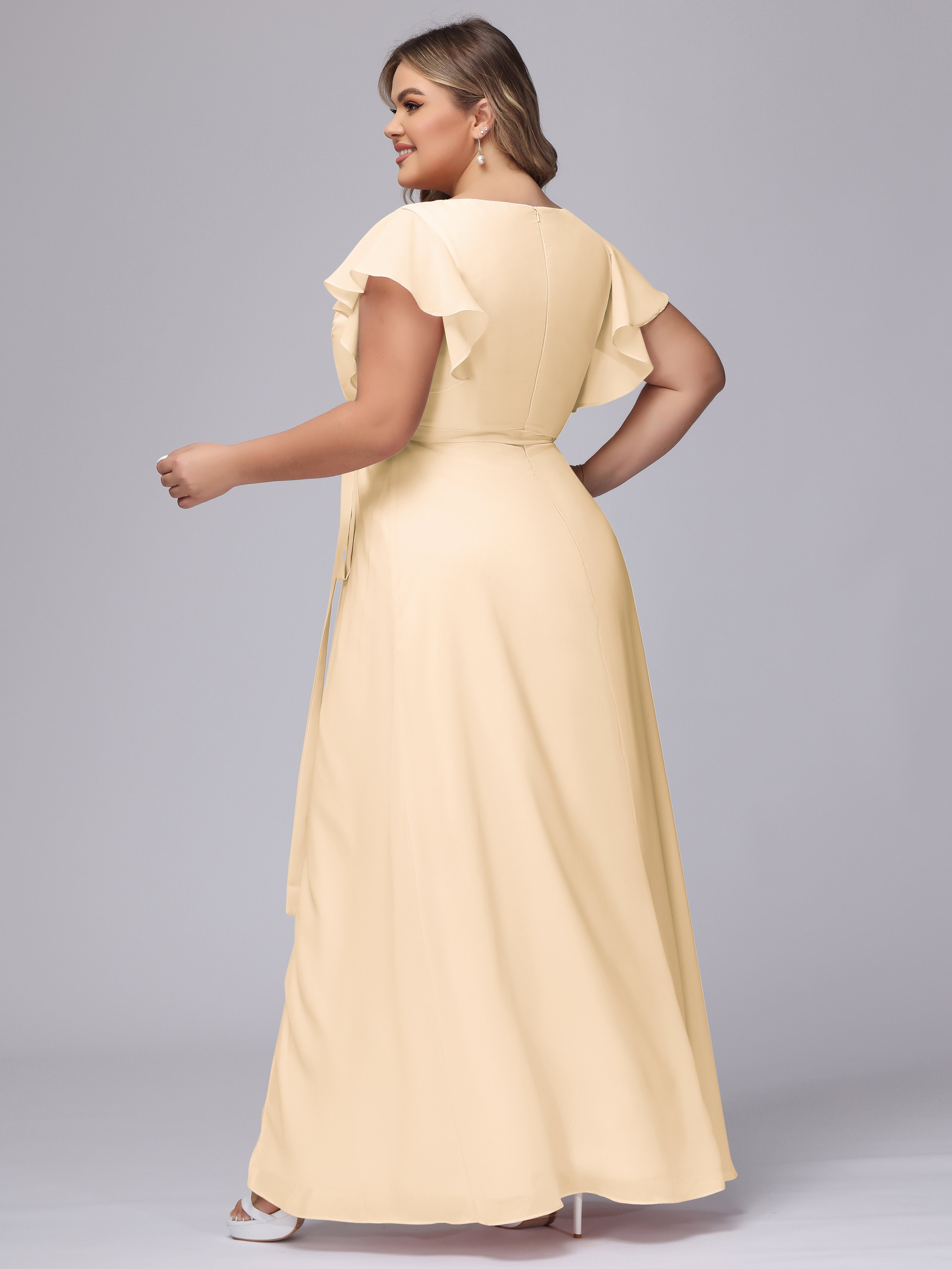 This V-neck & Ruffled Sleeves Chiffon Dress is perfect for the plus size bridesmaid. Crafted from lightweight chiffon, it features a flattering V-neck and ruffled sleeves for timeless elegance. Its waist-defining bodice ensures a comfortable and stylish fit.