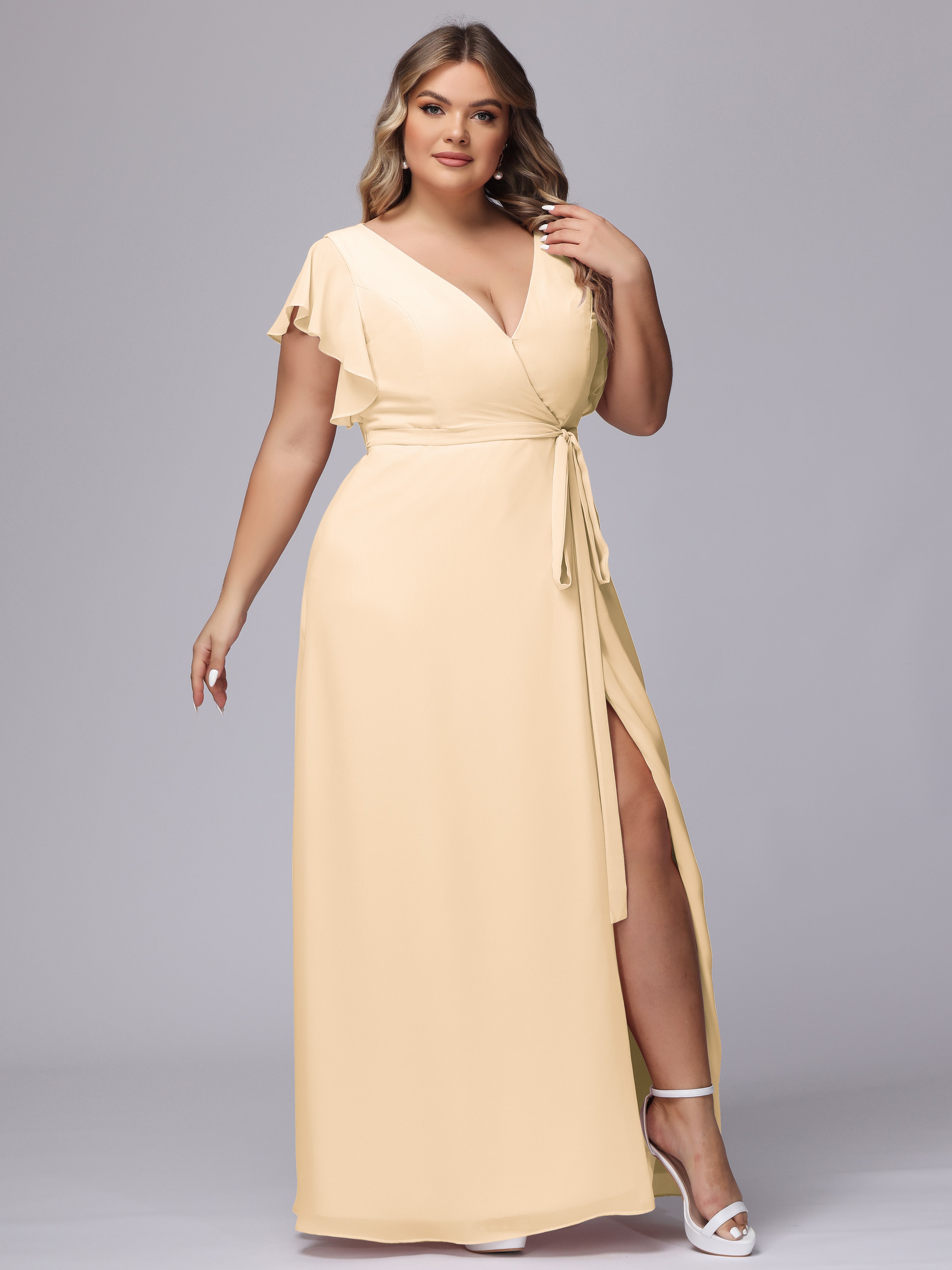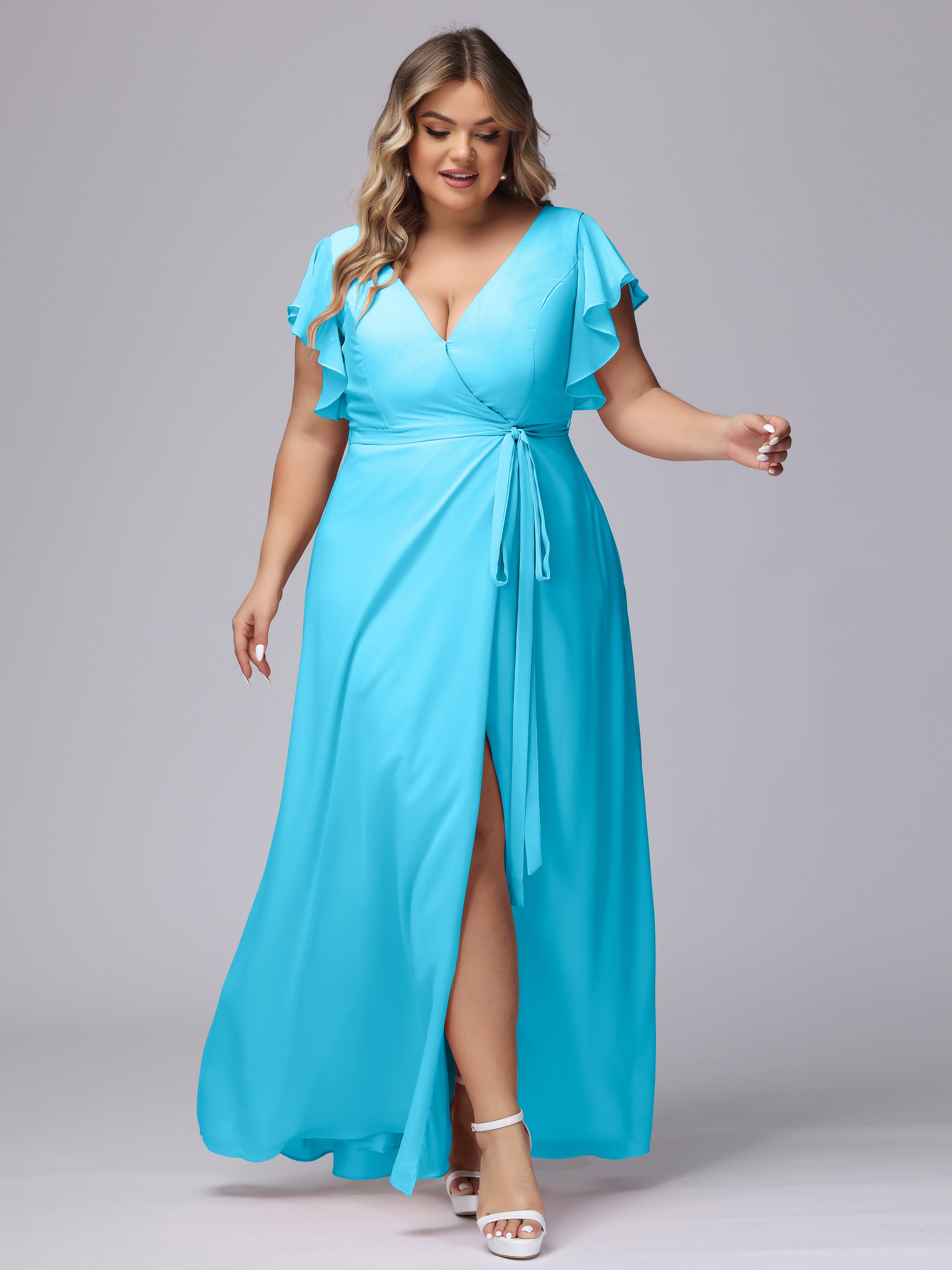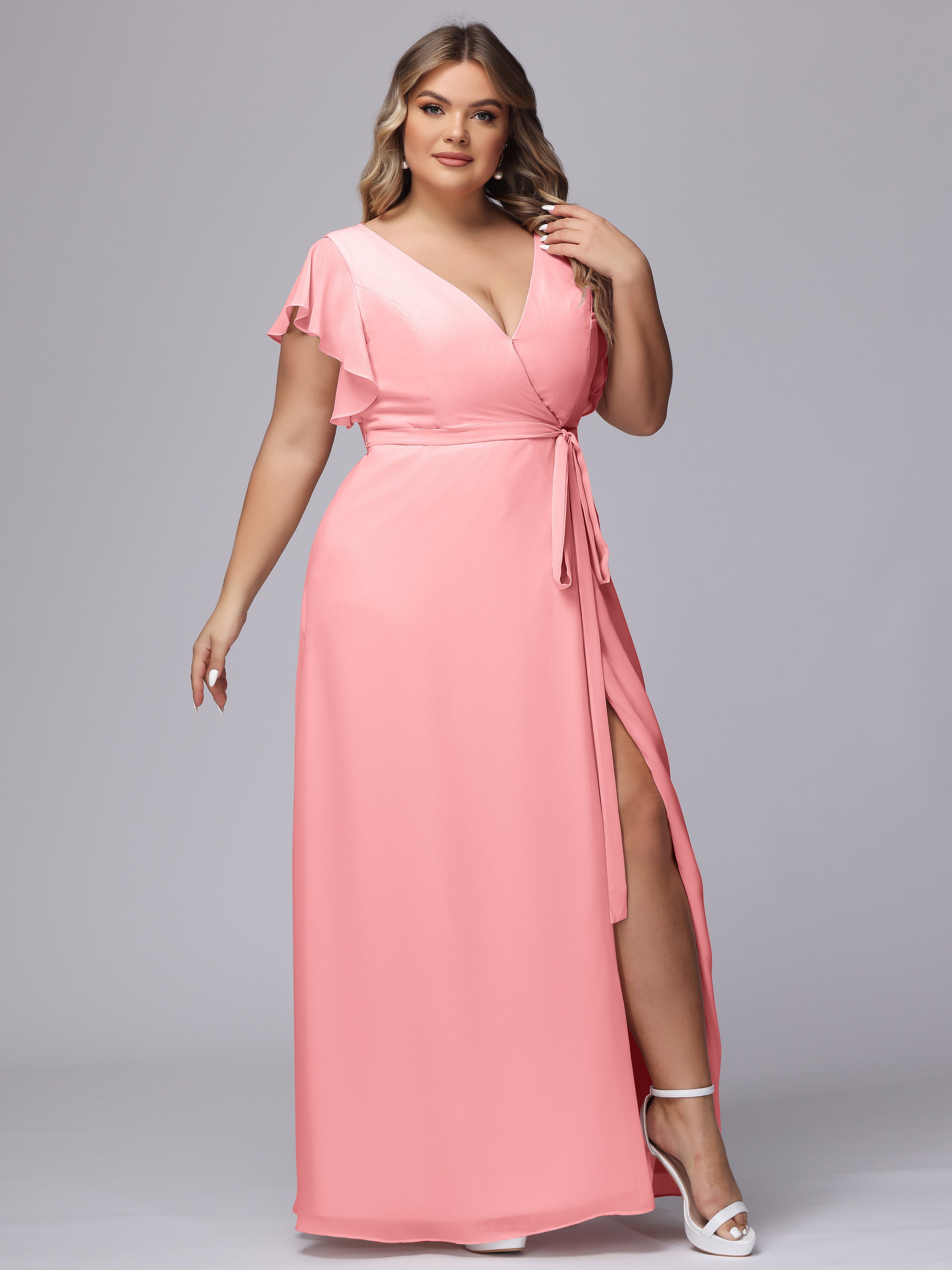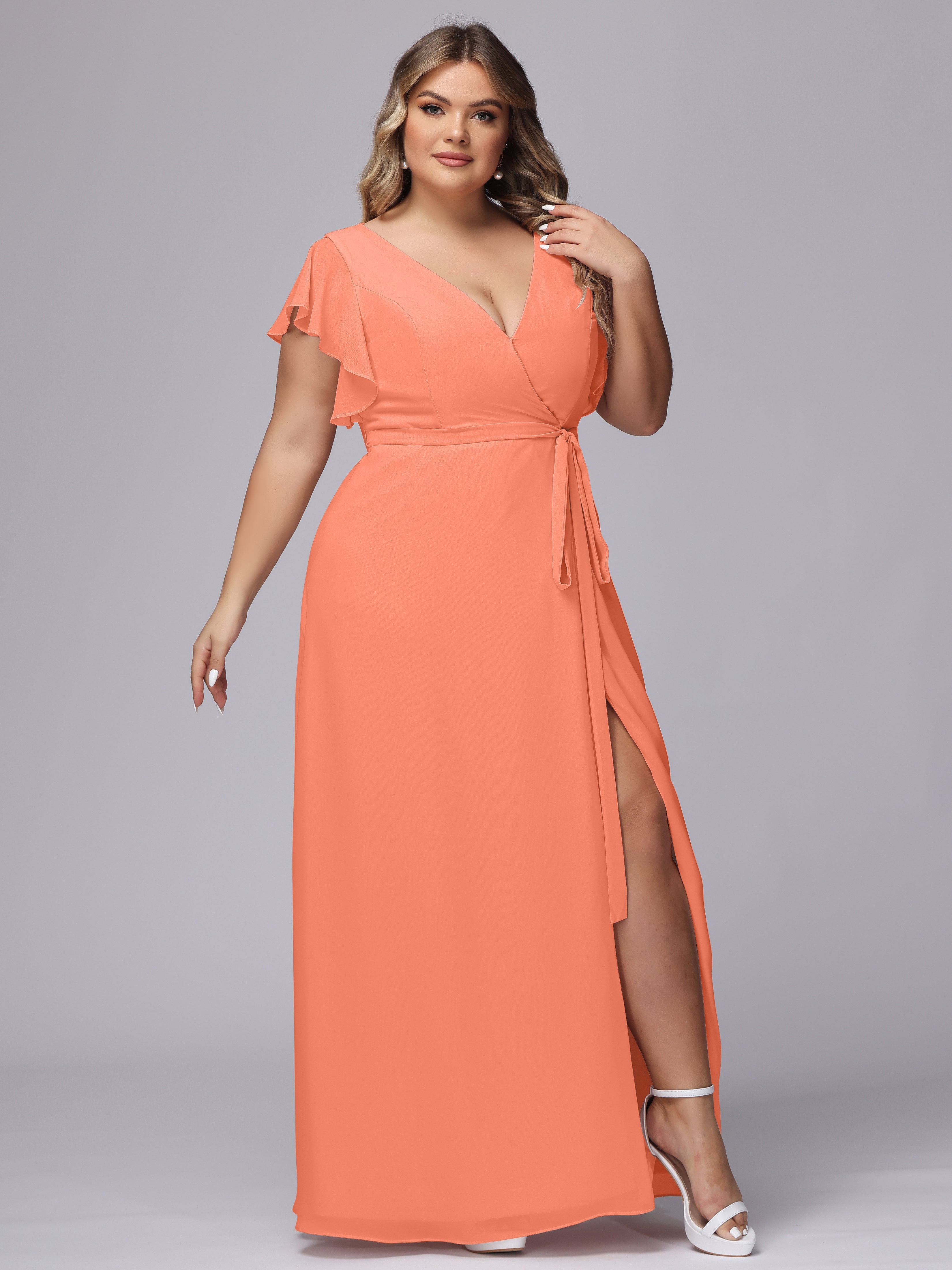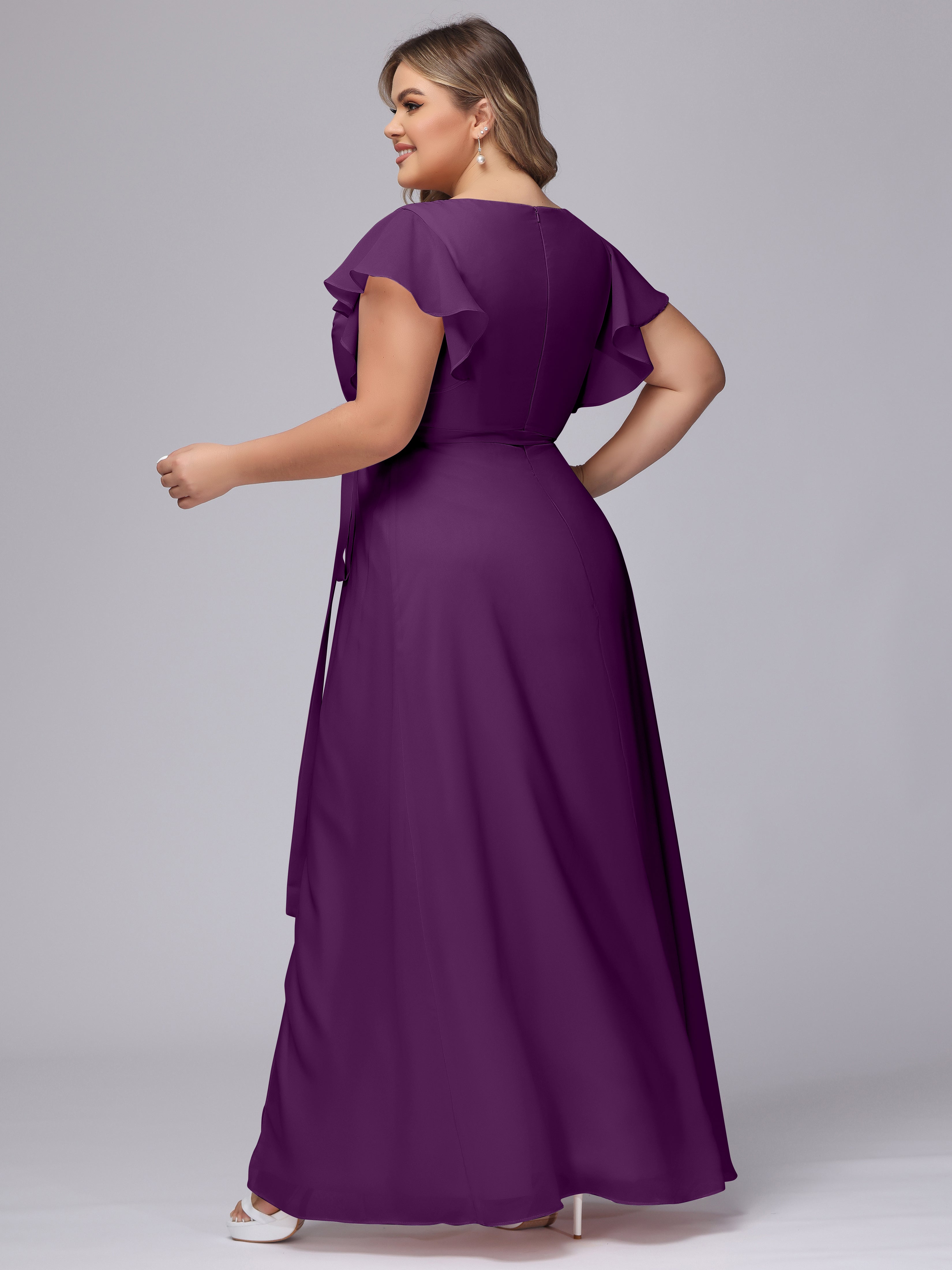 This V-neck & Ruffled Sleeves Chiffon Dress is perfect for the plus size bridesmaid. Crafted from lightweight chiffon, it features a flattering V-neck and ruffled sleeves for timeless elegance. Its waist-defining bodice ensures a comfortable and stylish fit.