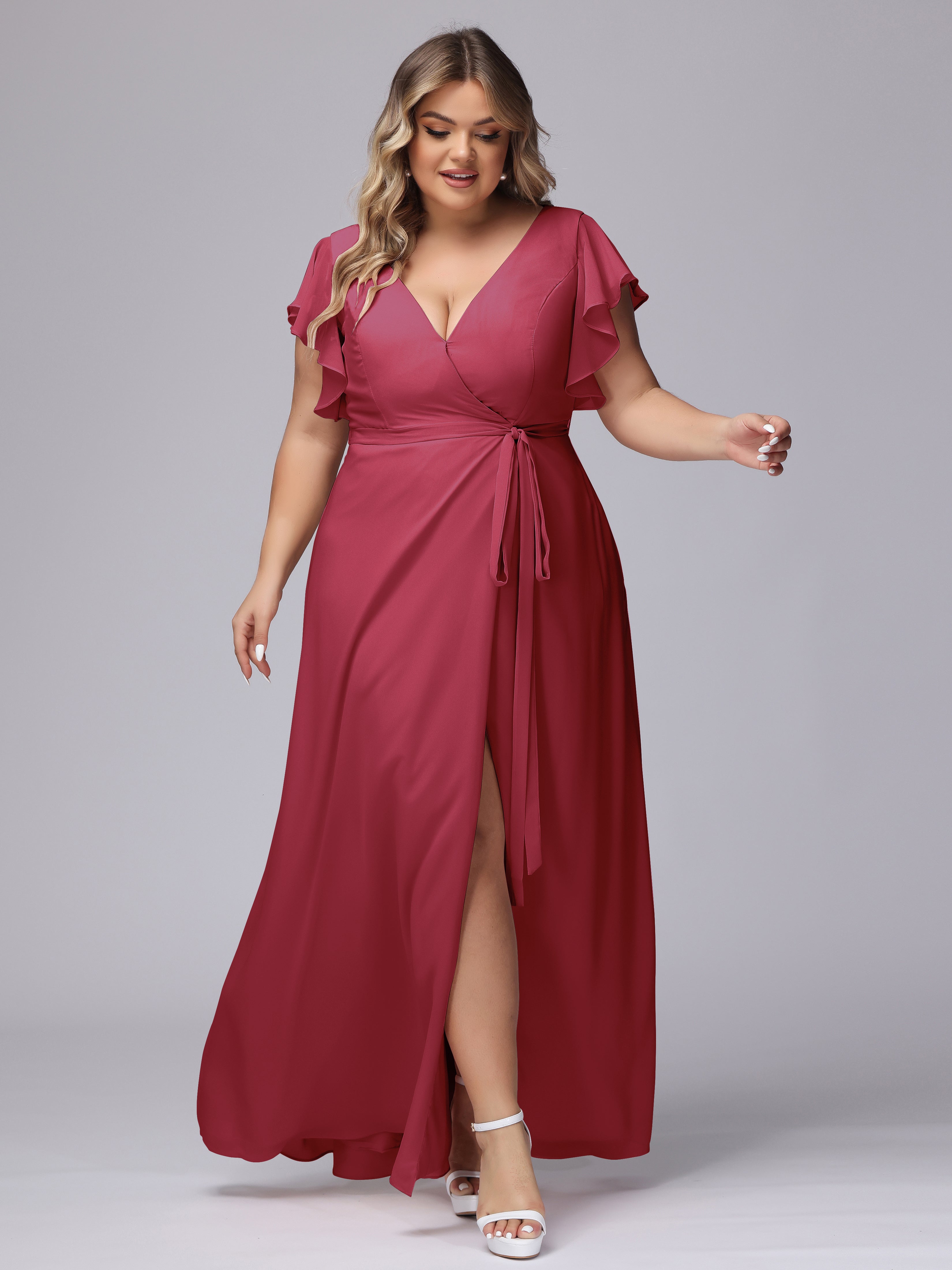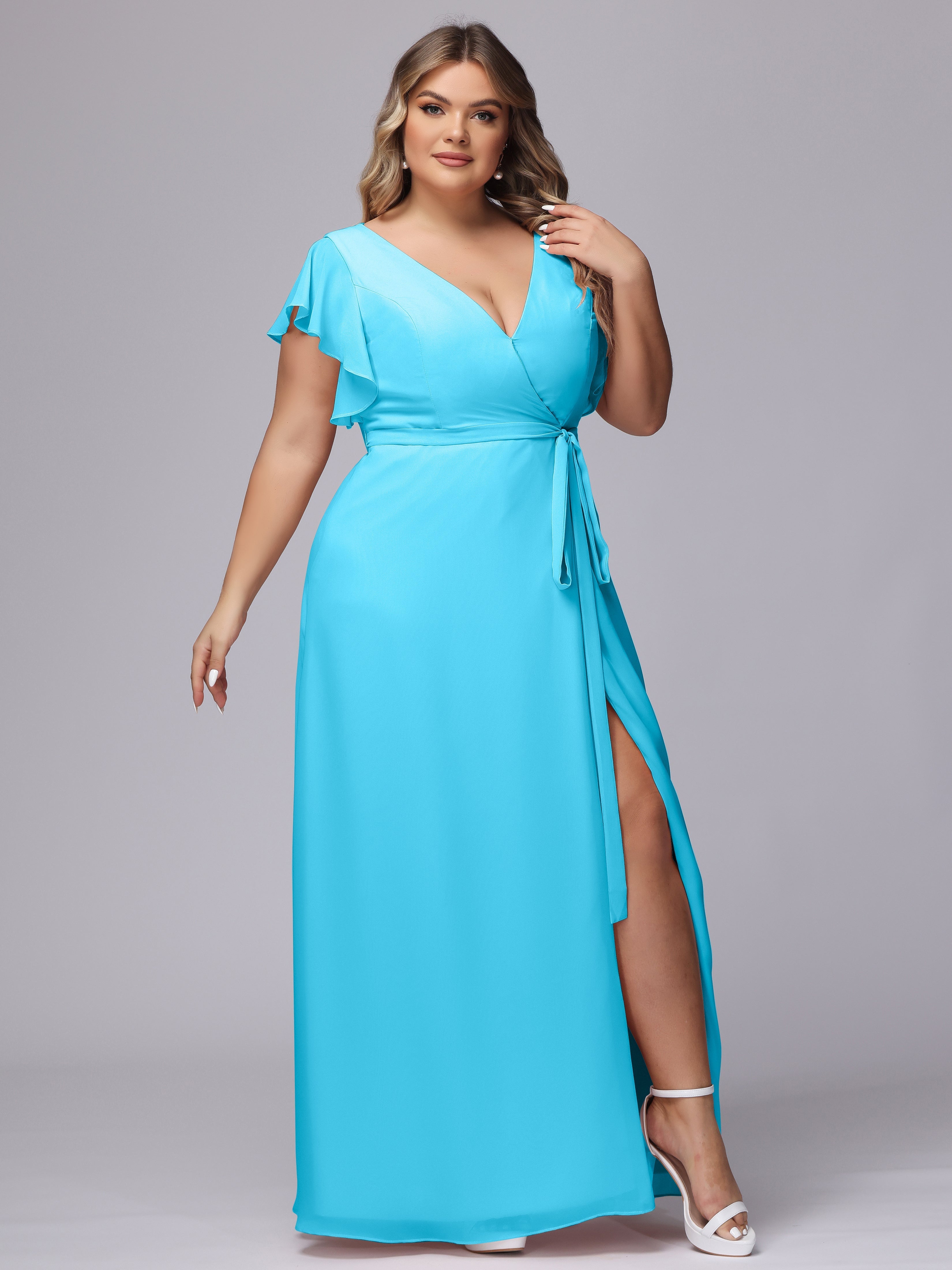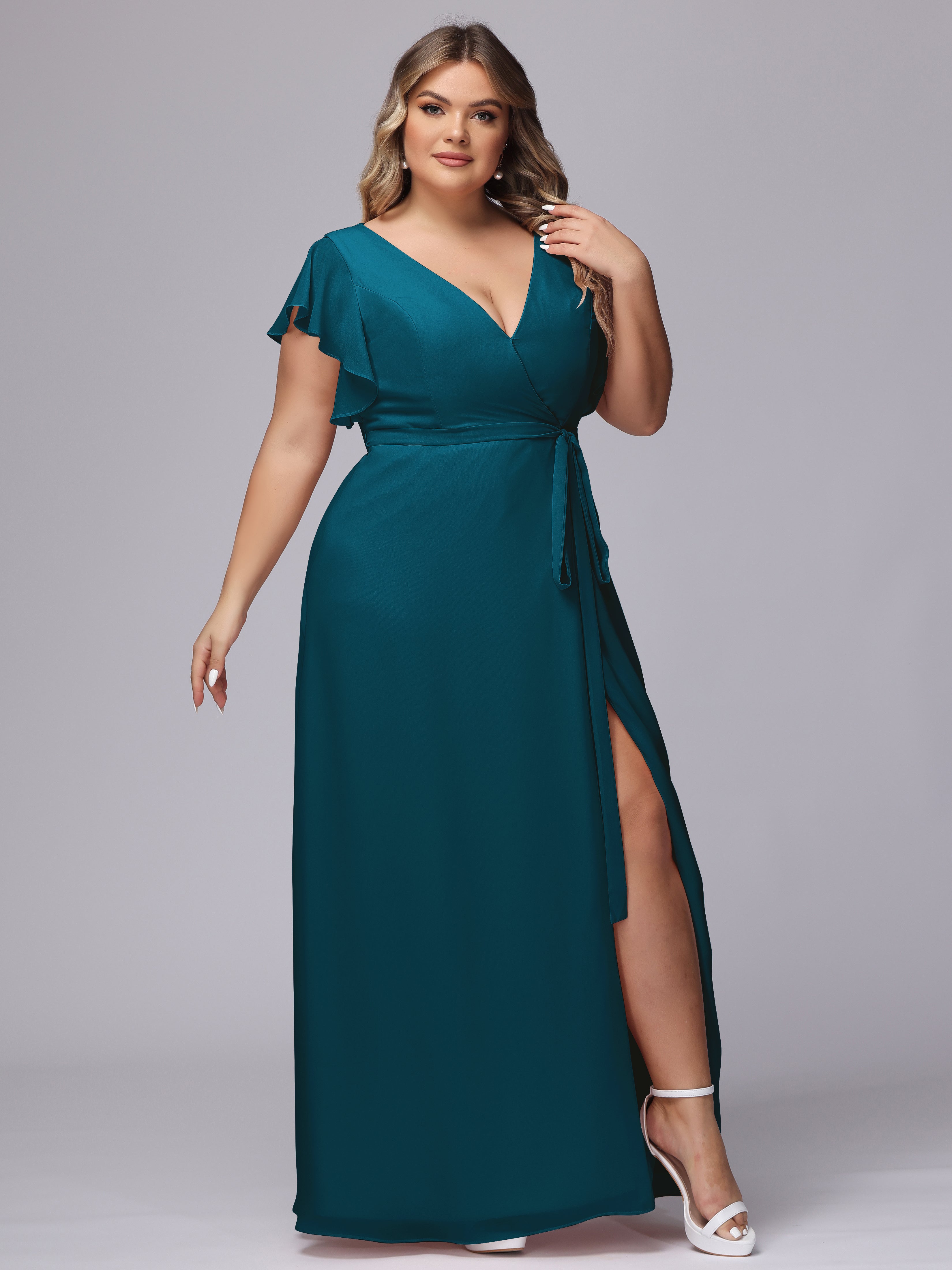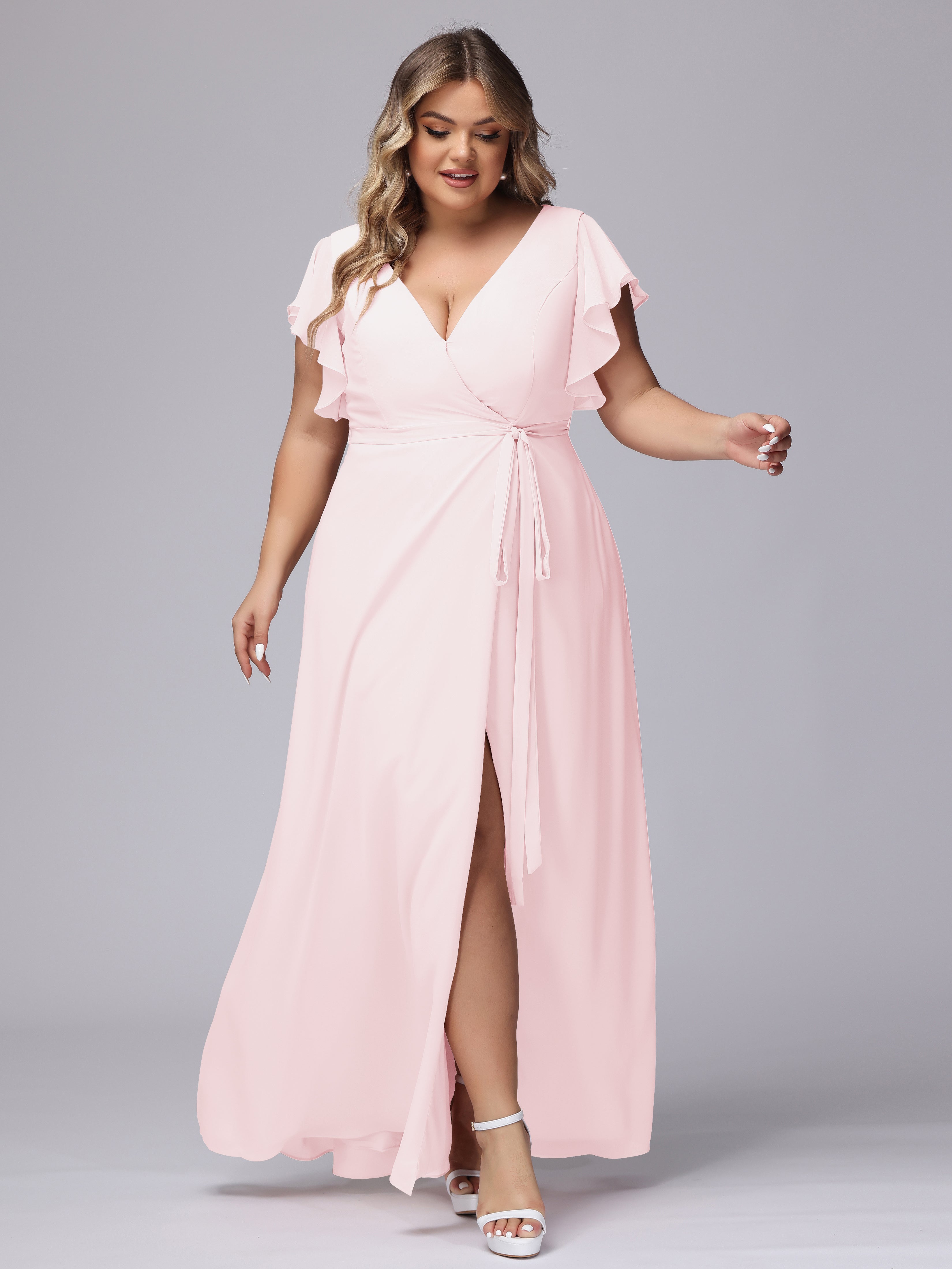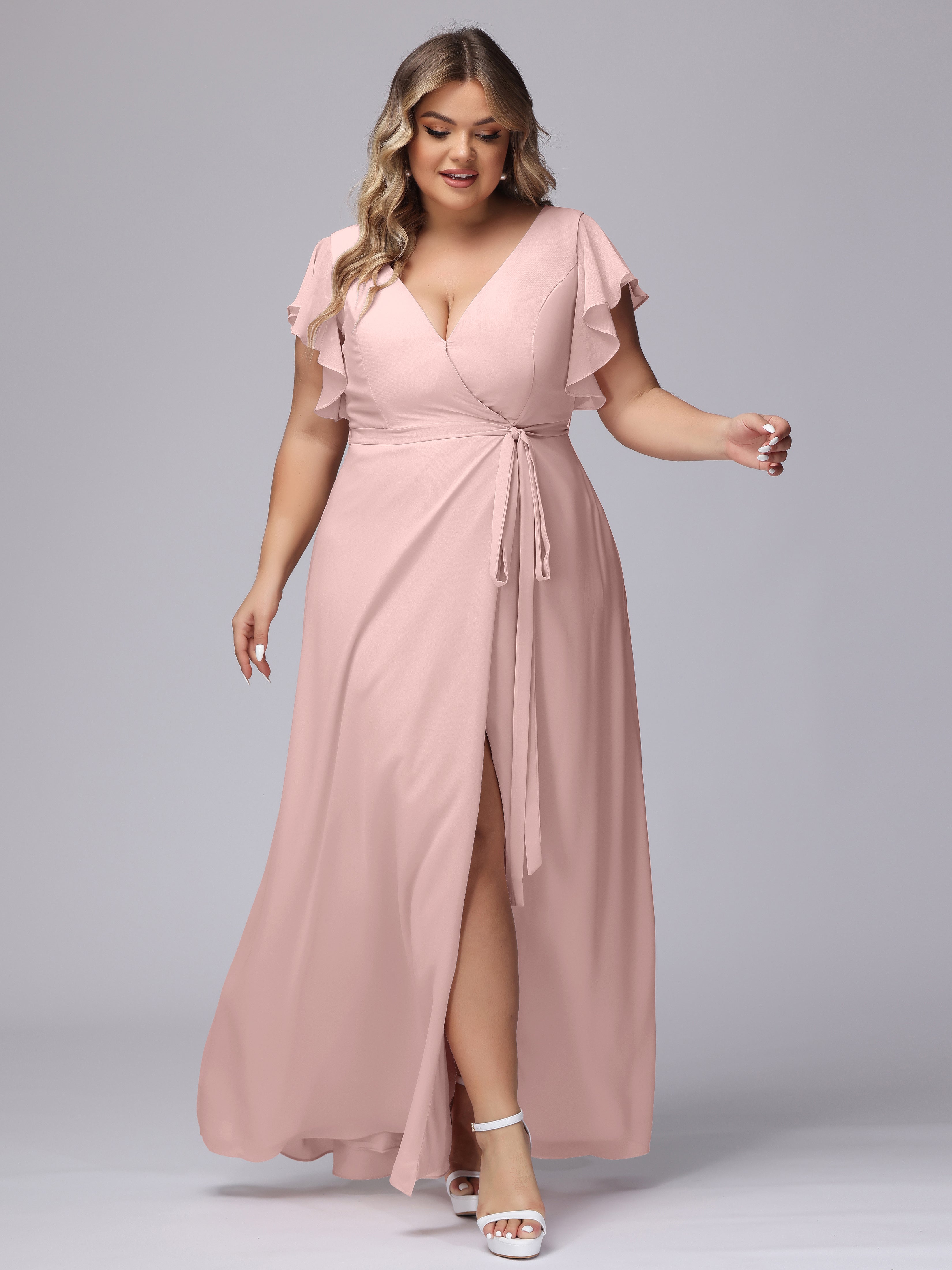 This V-neck & Ruffled Sleeves Chiffon Dress is perfect for the plus size bridesmaid. Crafted from lightweight chiffon, it features a flattering V-neck and ruffled sleeves for timeless elegance. Its waist-defining bodice ensures a comfortable and stylish fit.