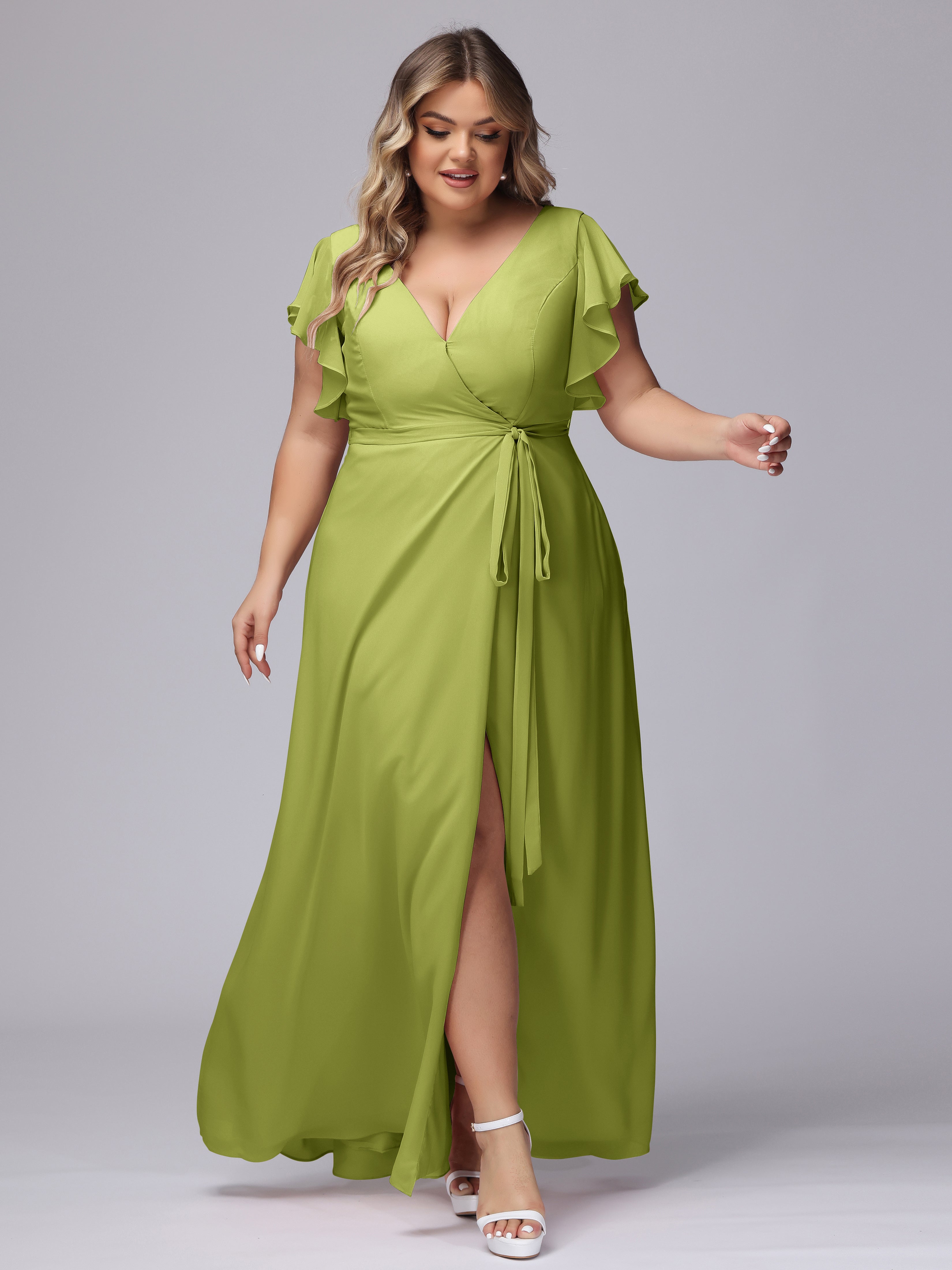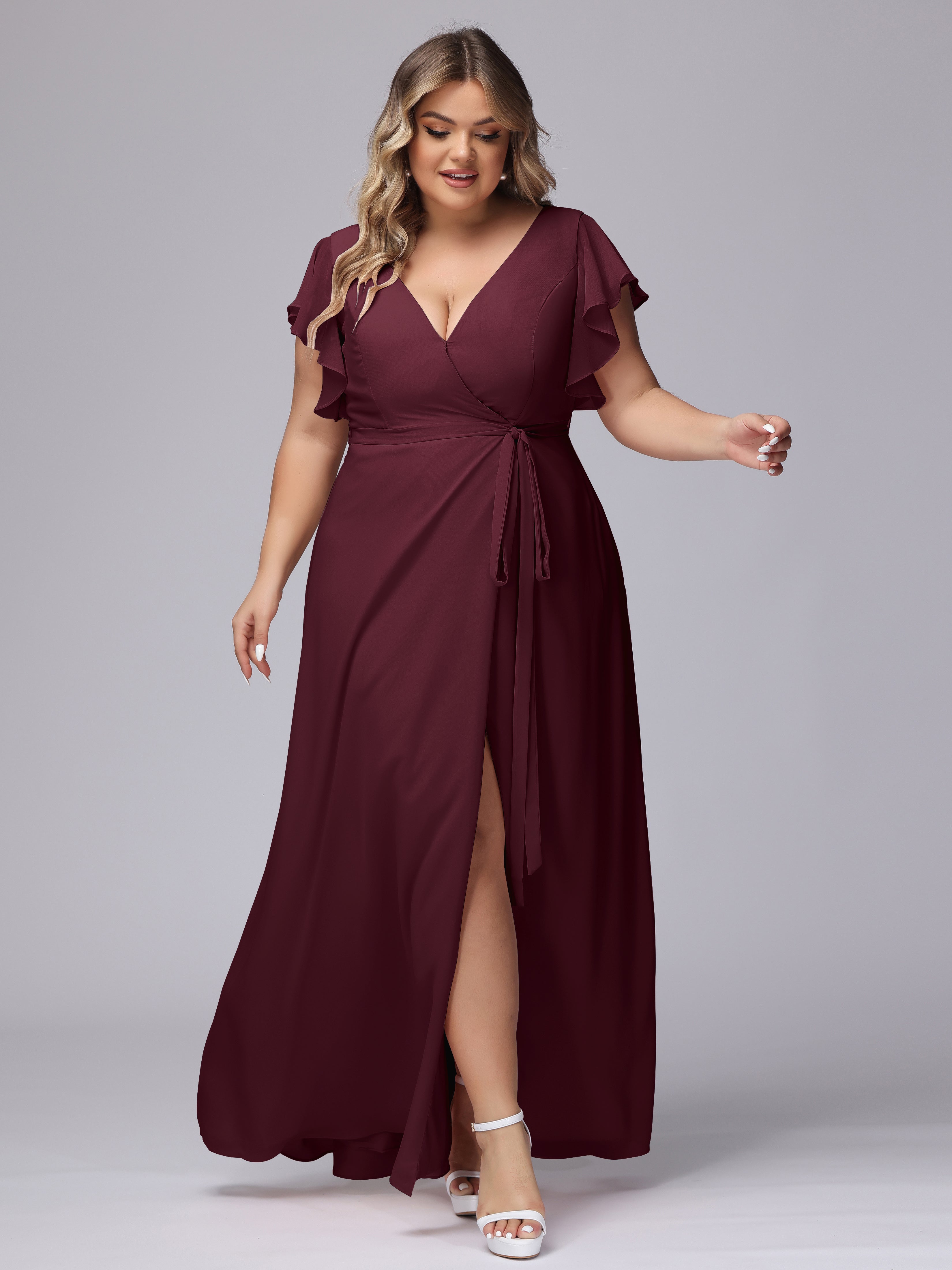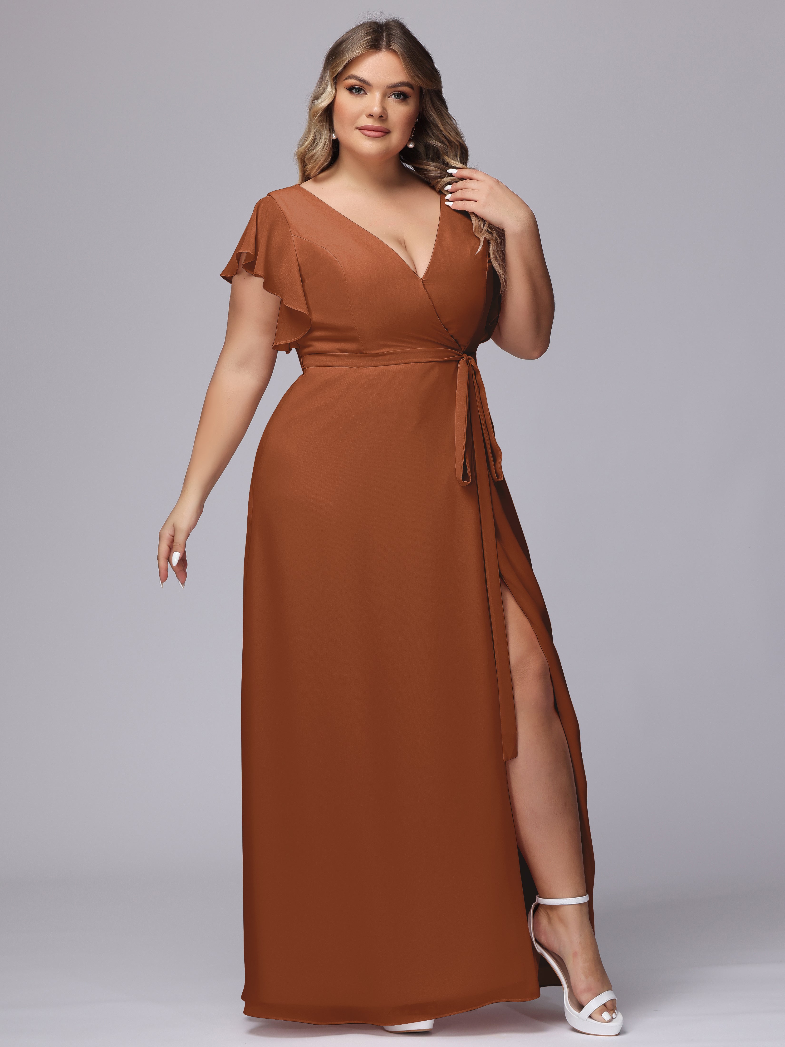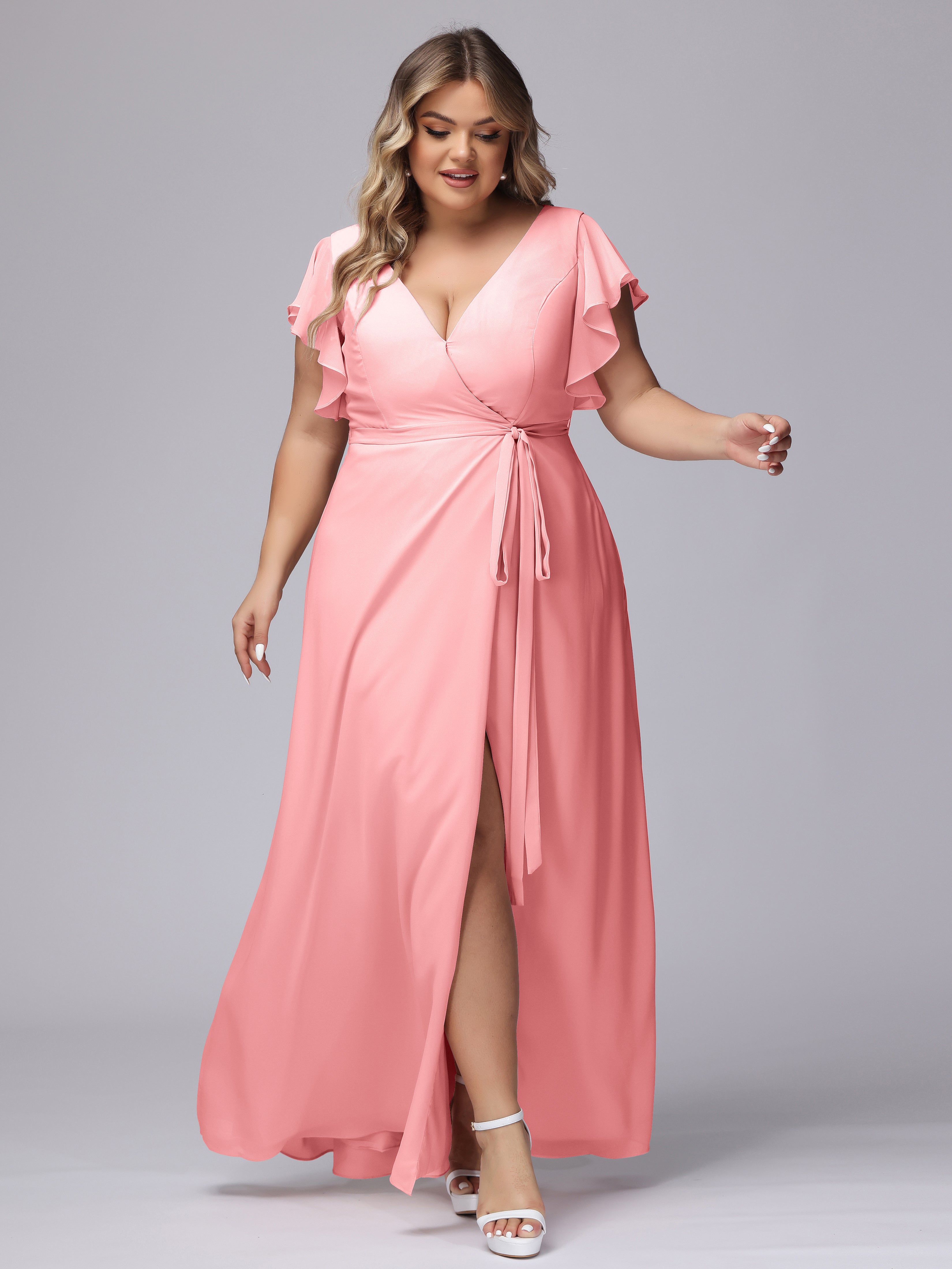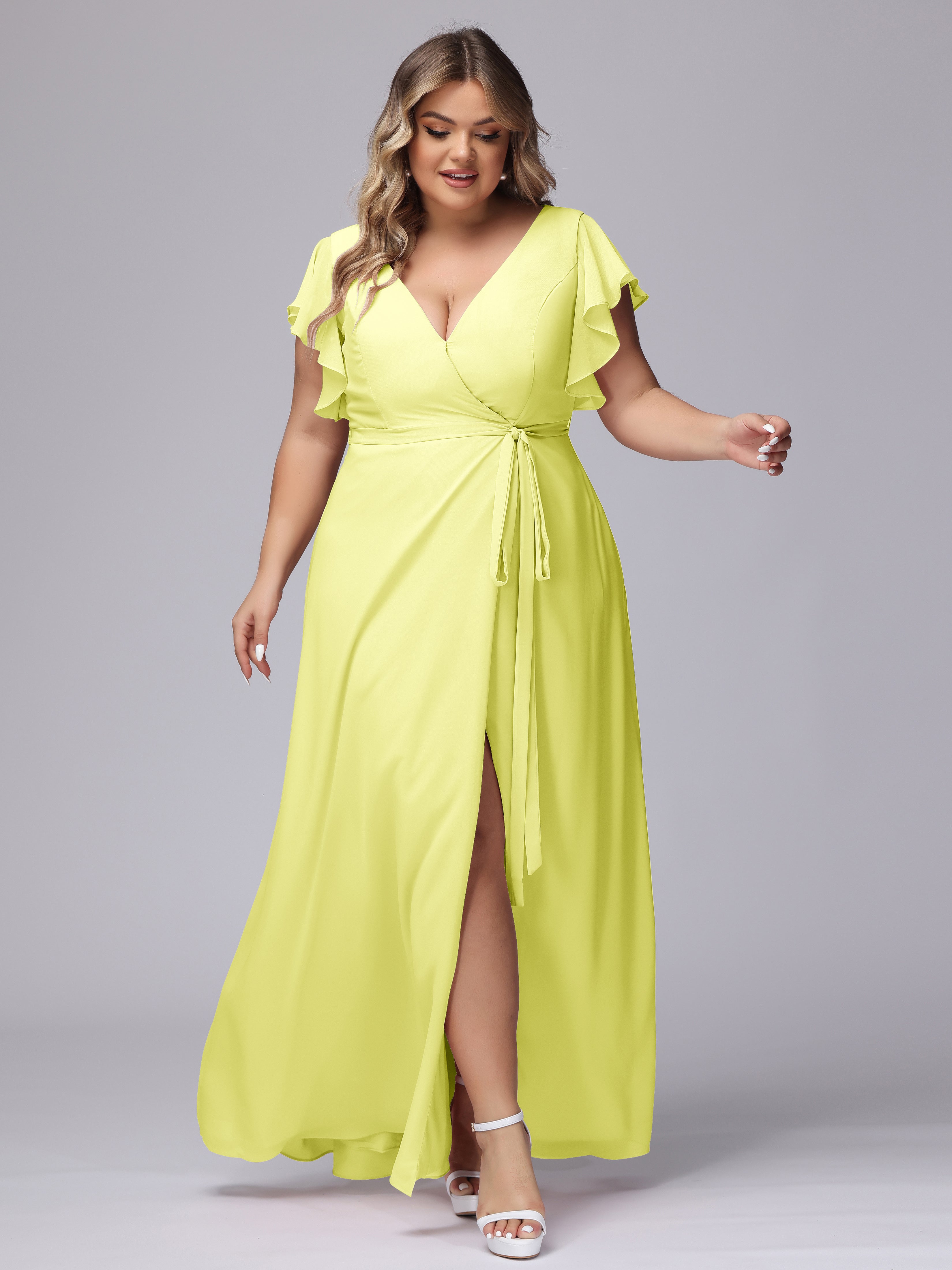 This V-neck & Ruffled Sleeves Chiffon Dress is perfect for the plus size bridesmaid. Crafted from lightweight chiffon, it features a flattering V-neck and ruffled sleeves for timeless elegance. Its waist-defining bodice ensures a comfortable and stylish fit.