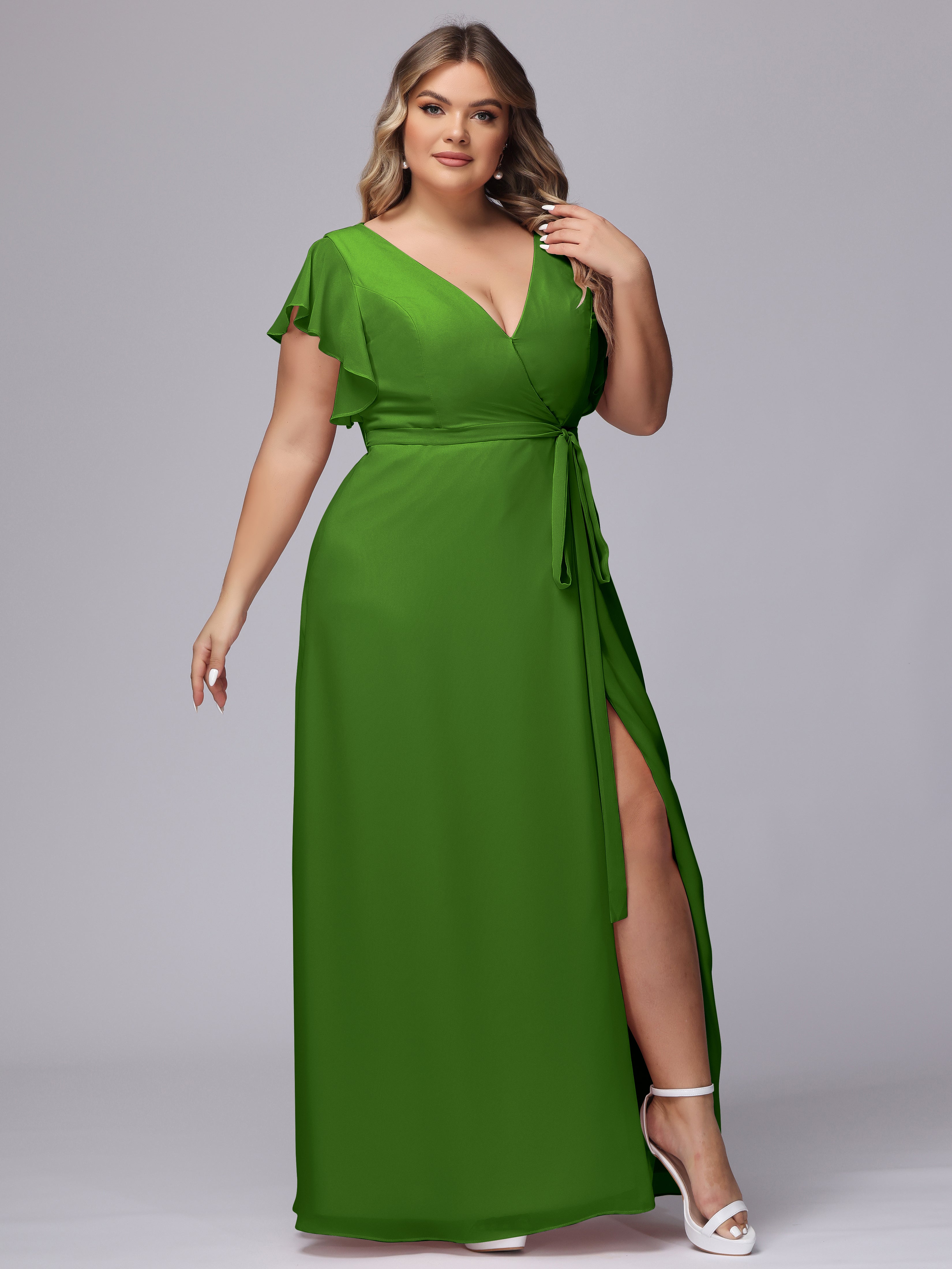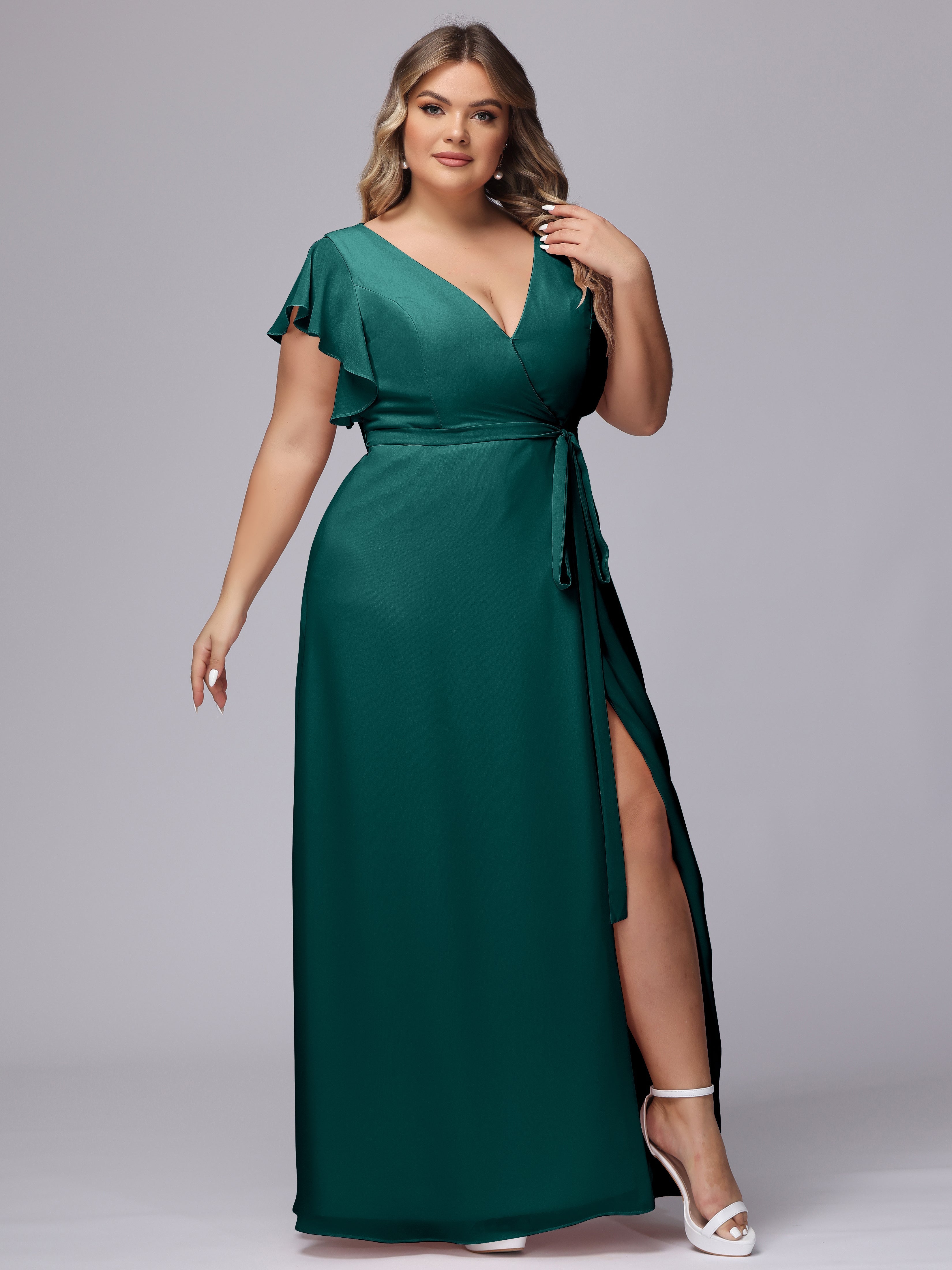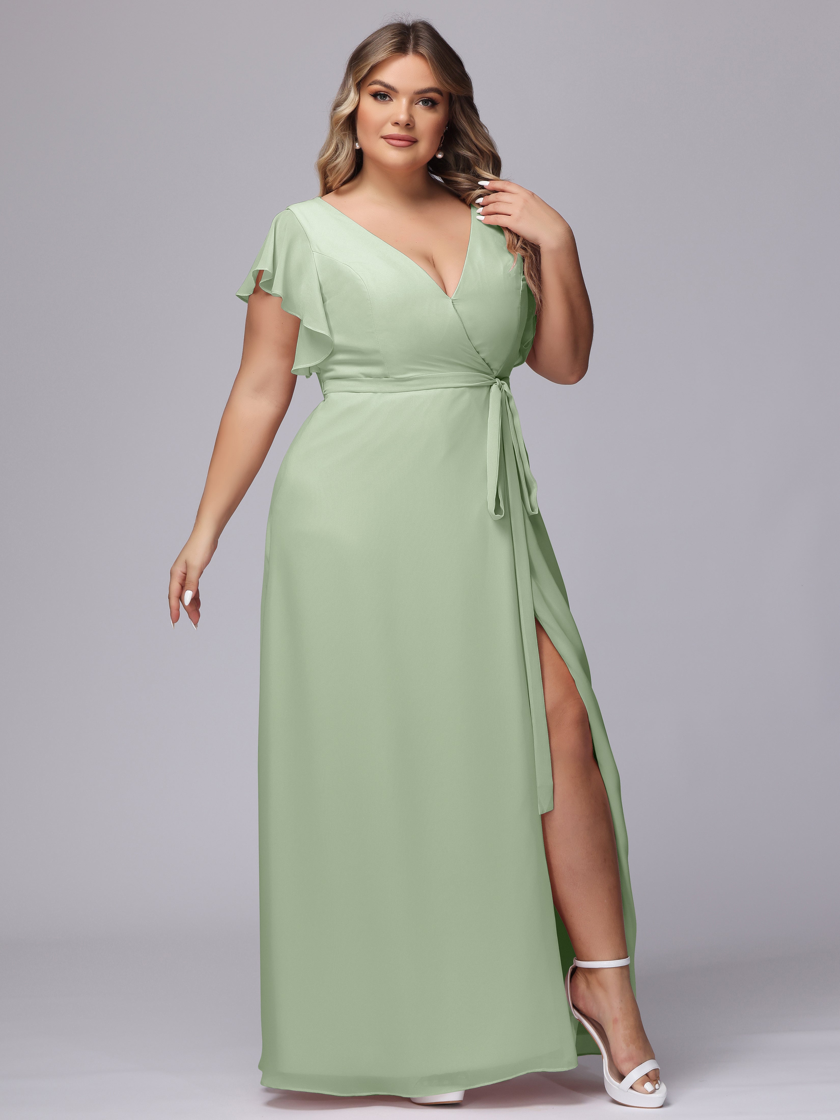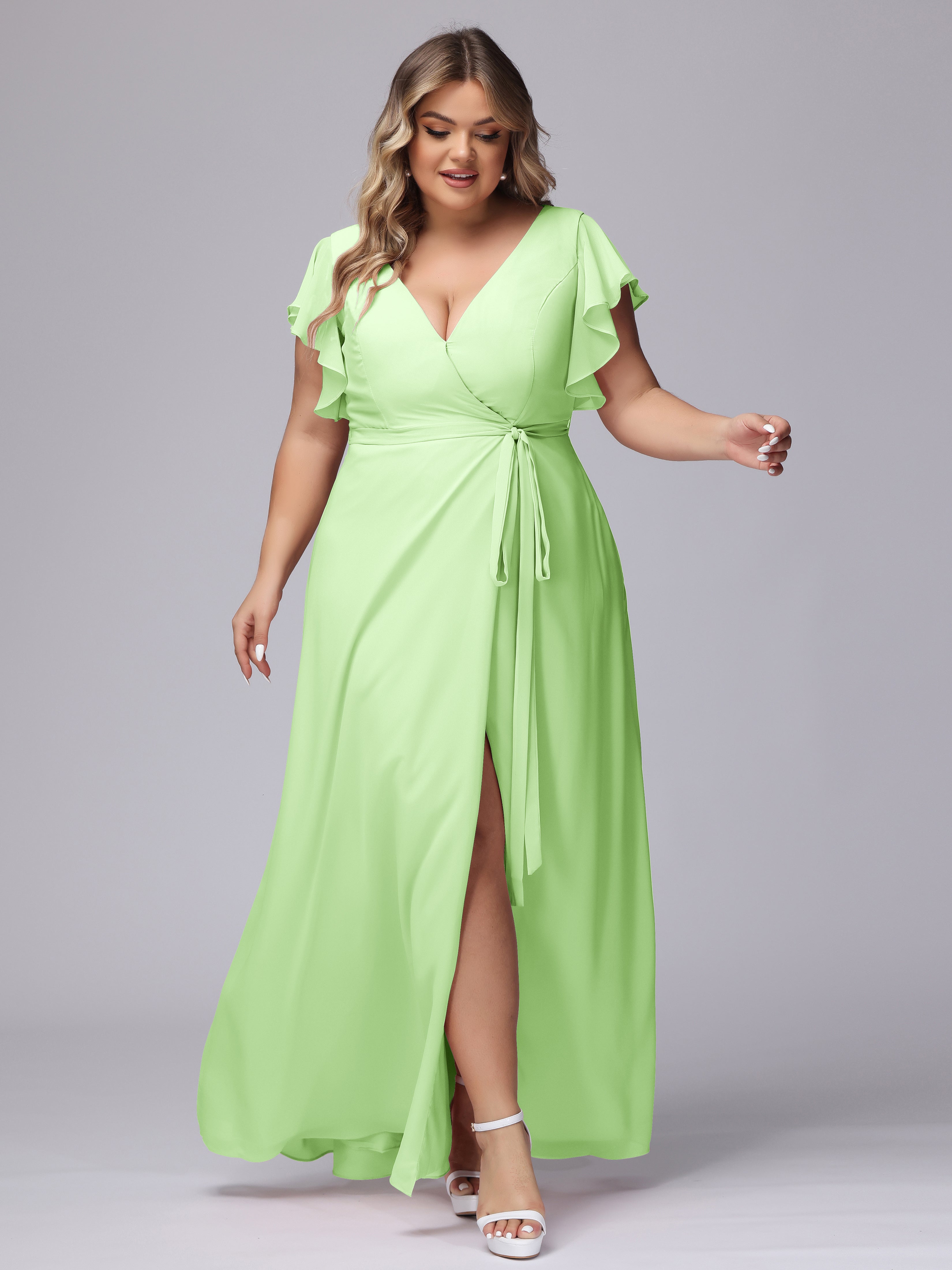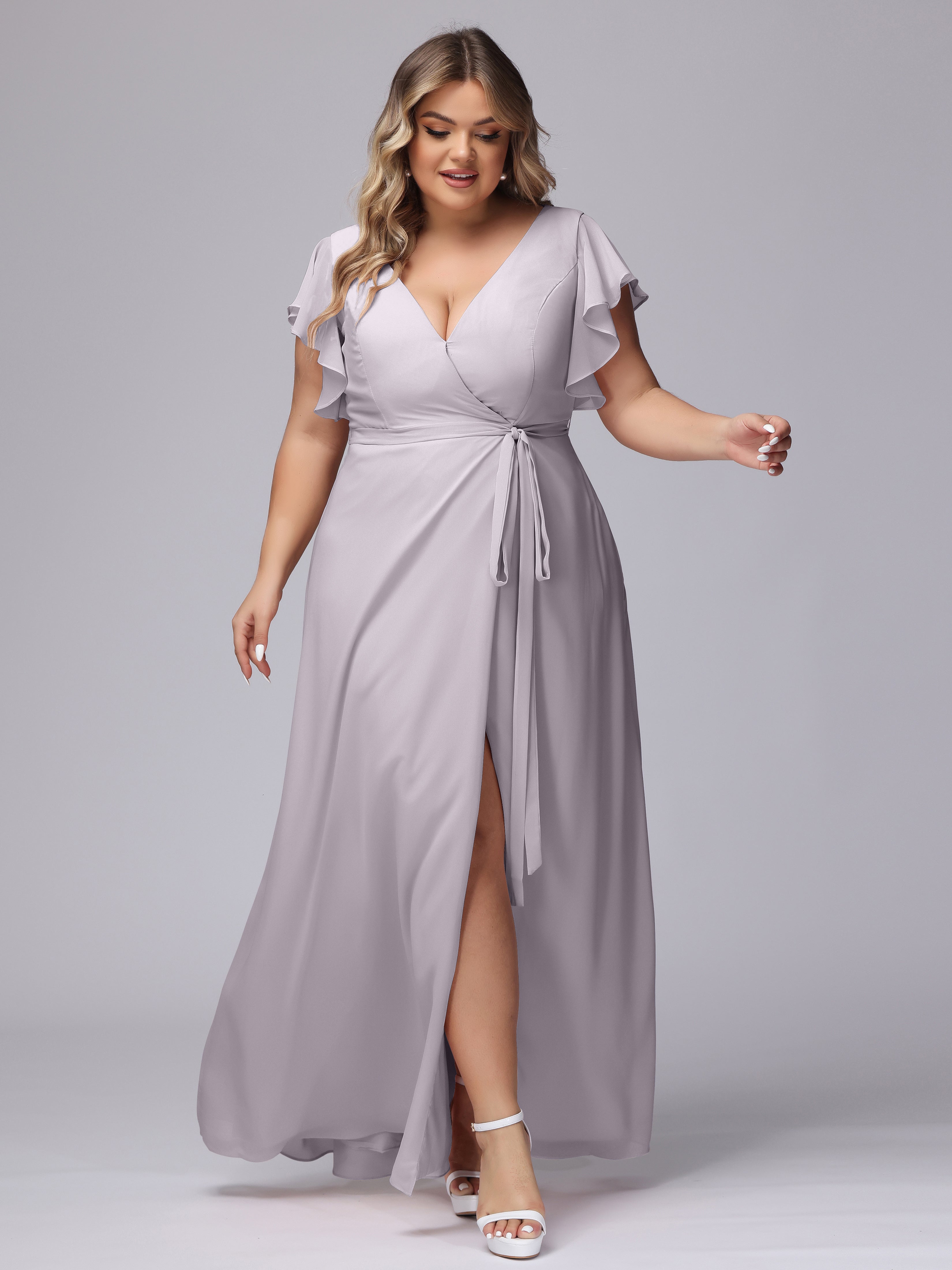 This V-neck & Ruffled Sleeves Chiffon Dress is perfect for the plus size bridesmaid. Crafted from lightweight chiffon, it features a flattering V-neck and ruffled sleeves for timeless elegance. Its waist-defining bodice ensures a comfortable and stylish fit.