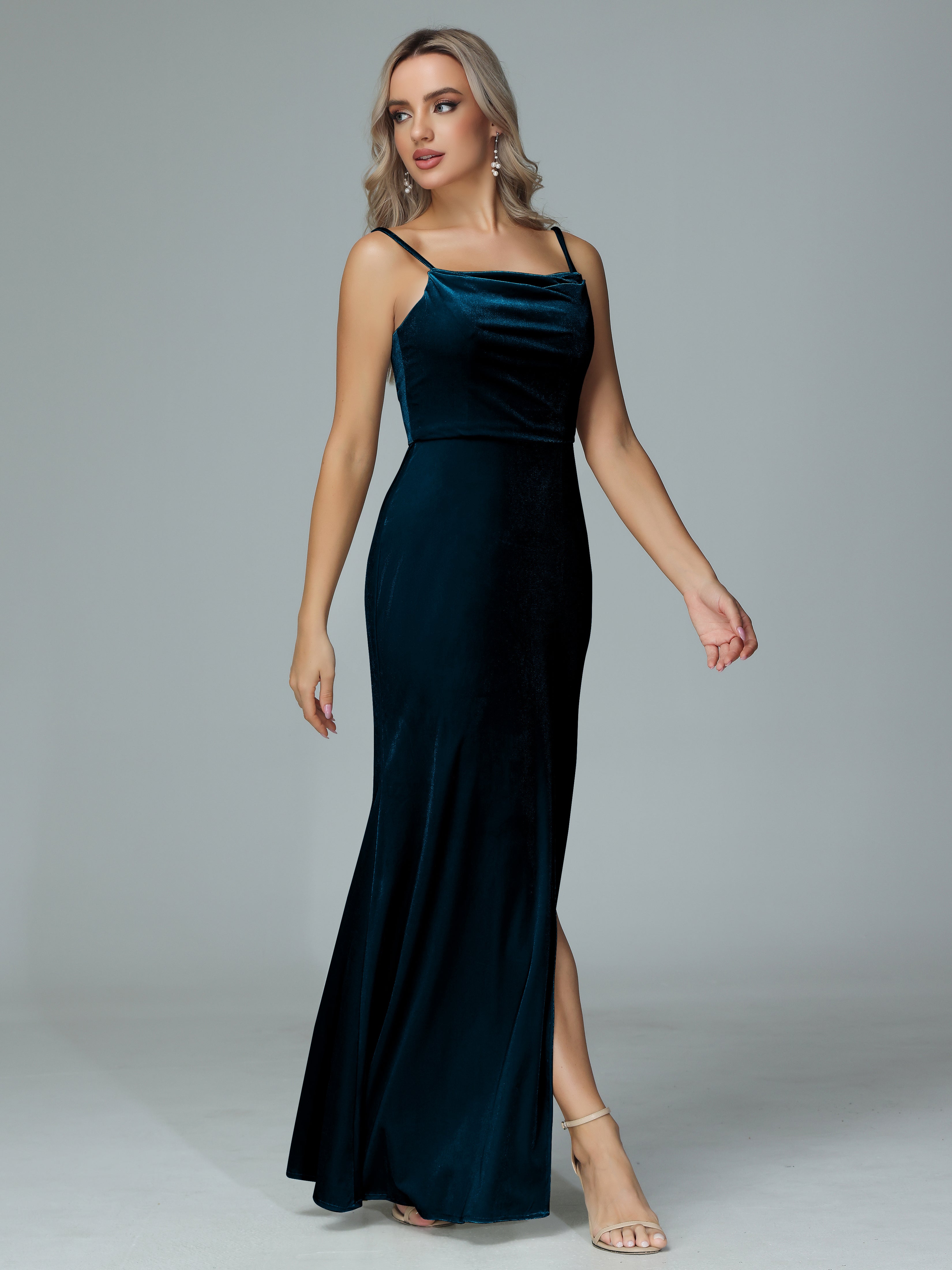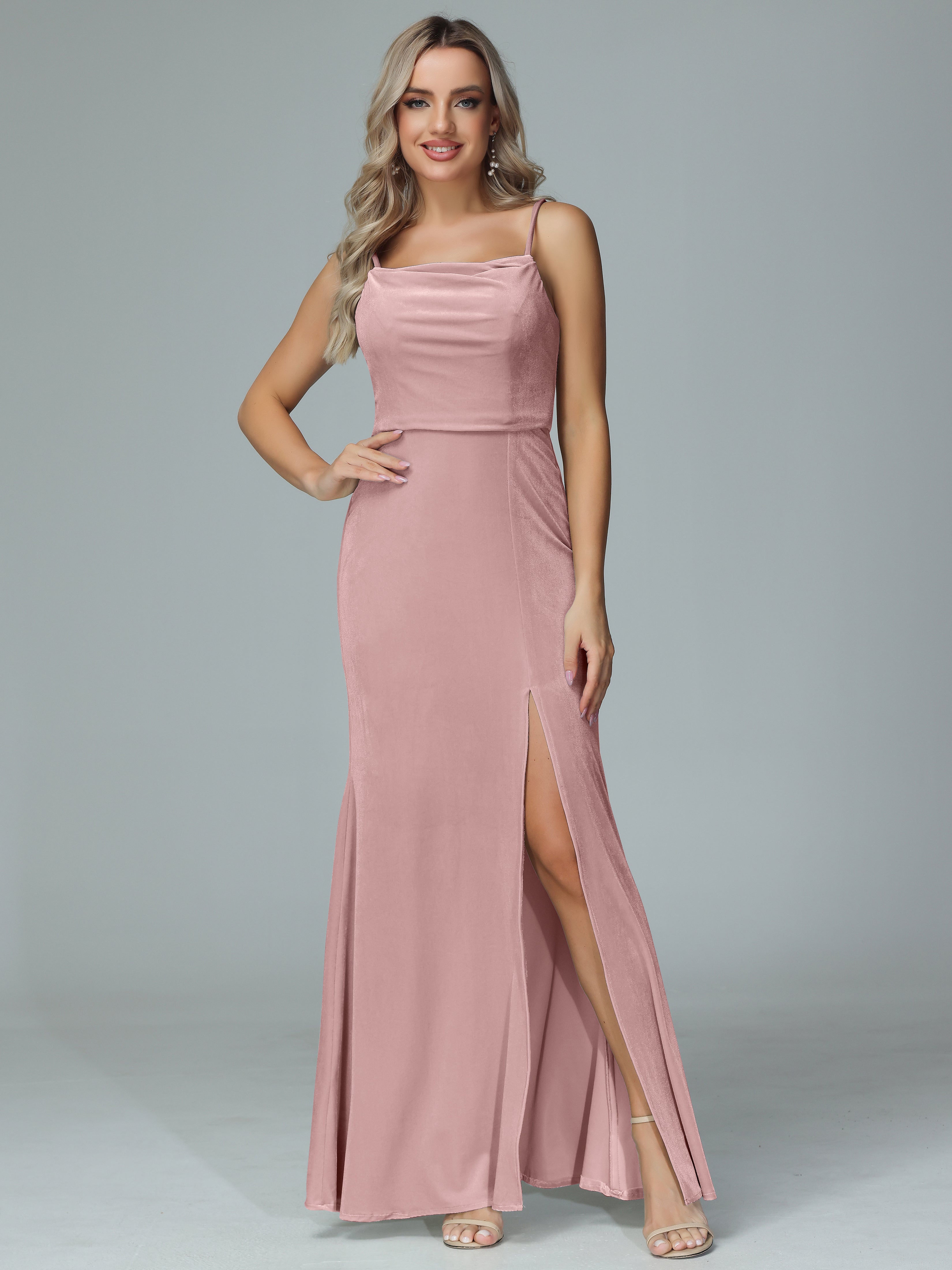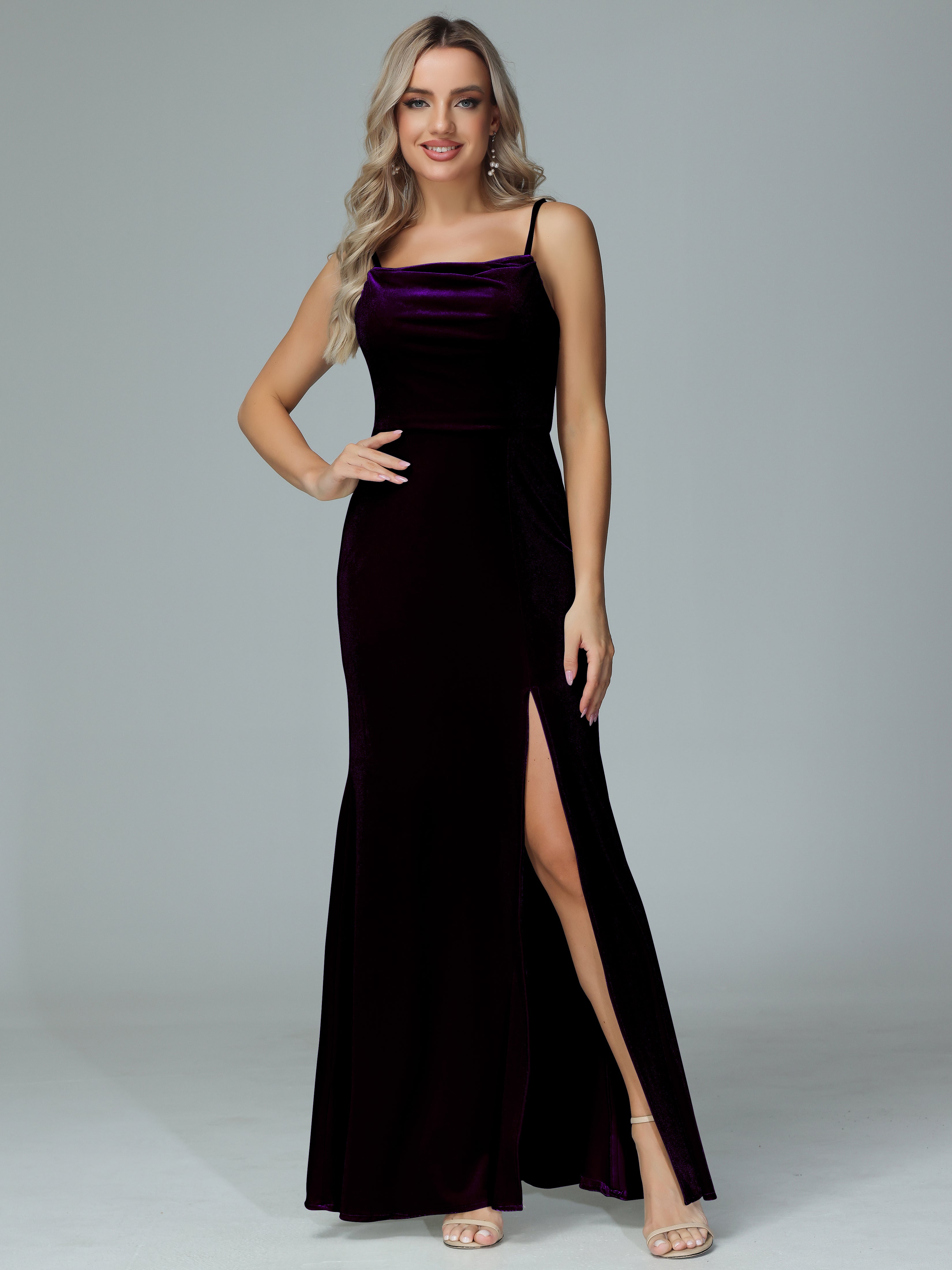 Add a touch of elegance to any bridal party with our Spaghetti Straps Velvet Bridesmaid Dresses. The luxurious velvet material and chic spaghetti straps will make any bridesmaid feel stylish and sophisticated. With a flattering slit, this dress is the perfect combination of comfort and glamour.