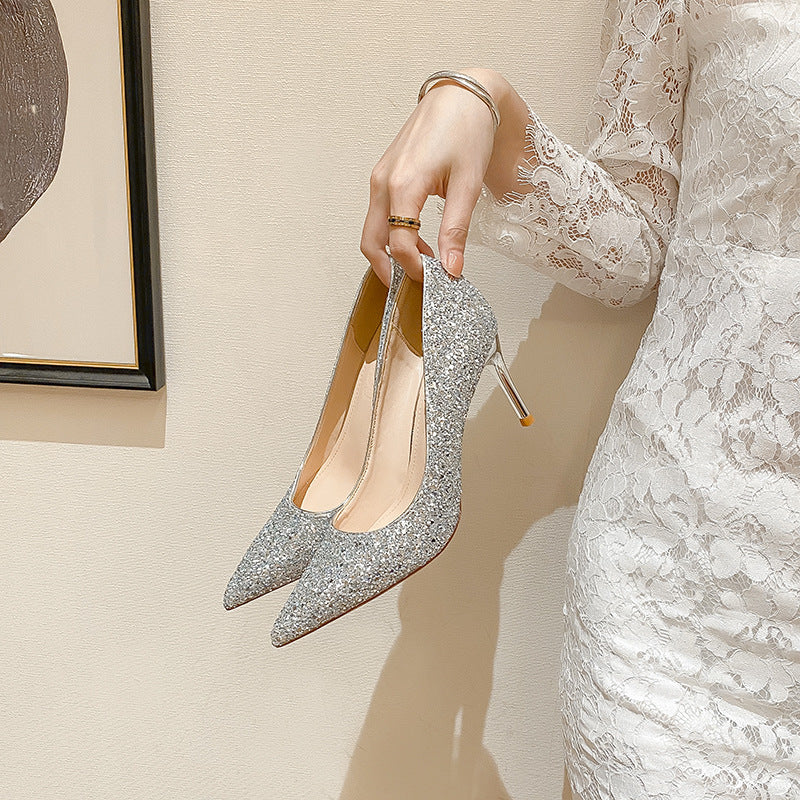 Turn heads with these stunning sequin high-heeled wedding shoes. Featuring a sparkly sequin fabric and a sturdy heel, you’ll be supported and stylish for any occasion. Whether dancing the night away or saying “I do”, these shoes will make a statement.