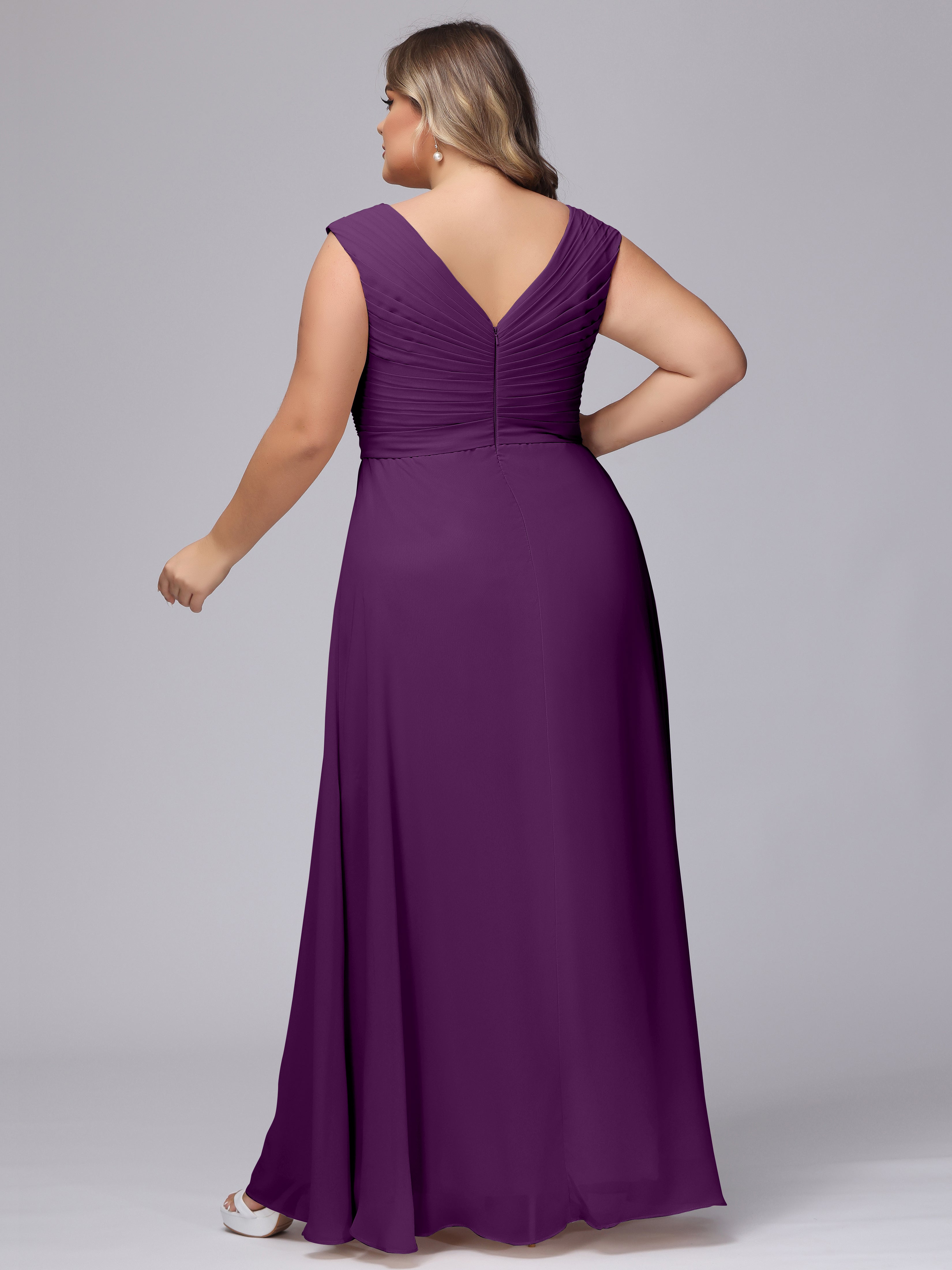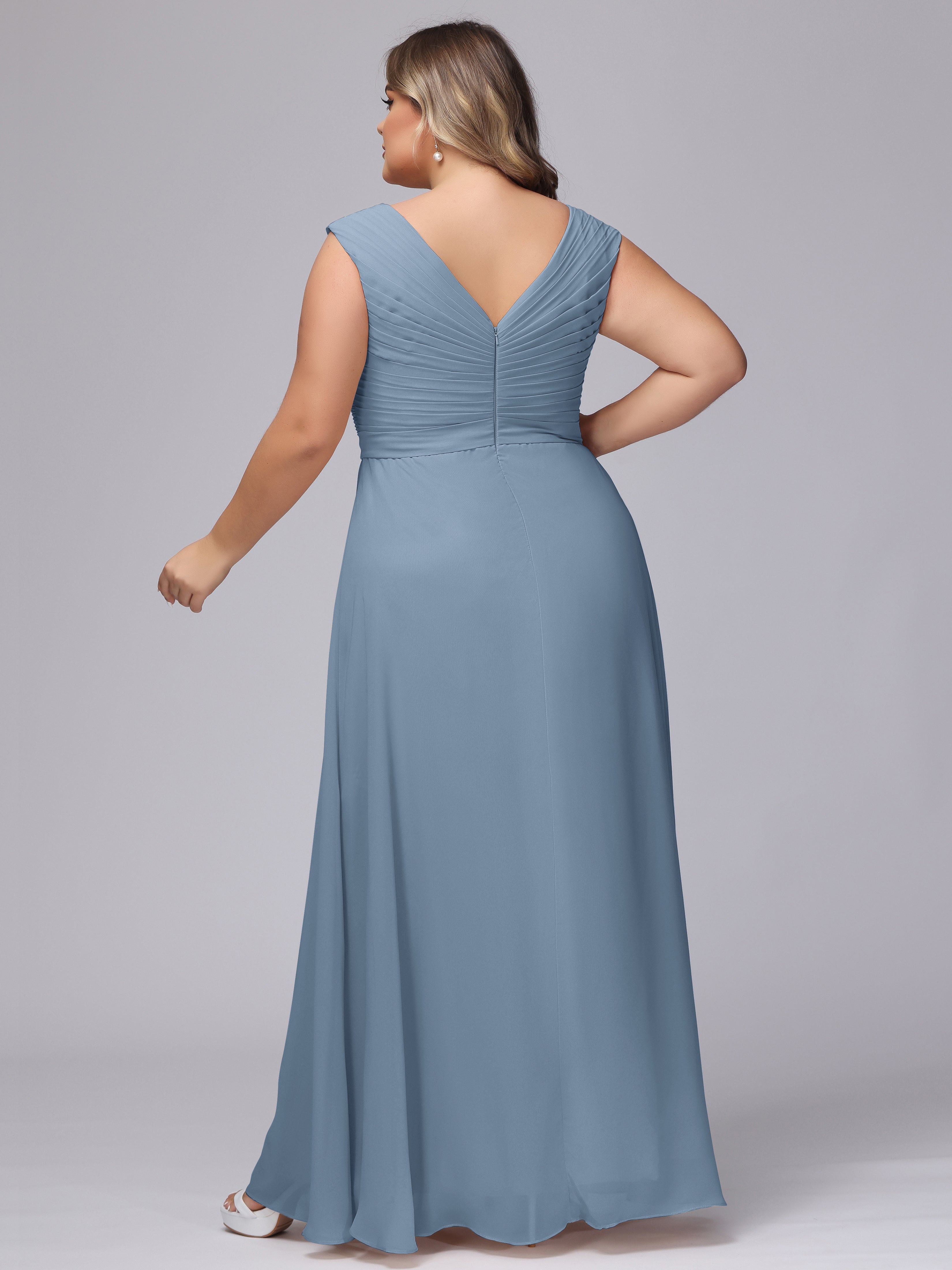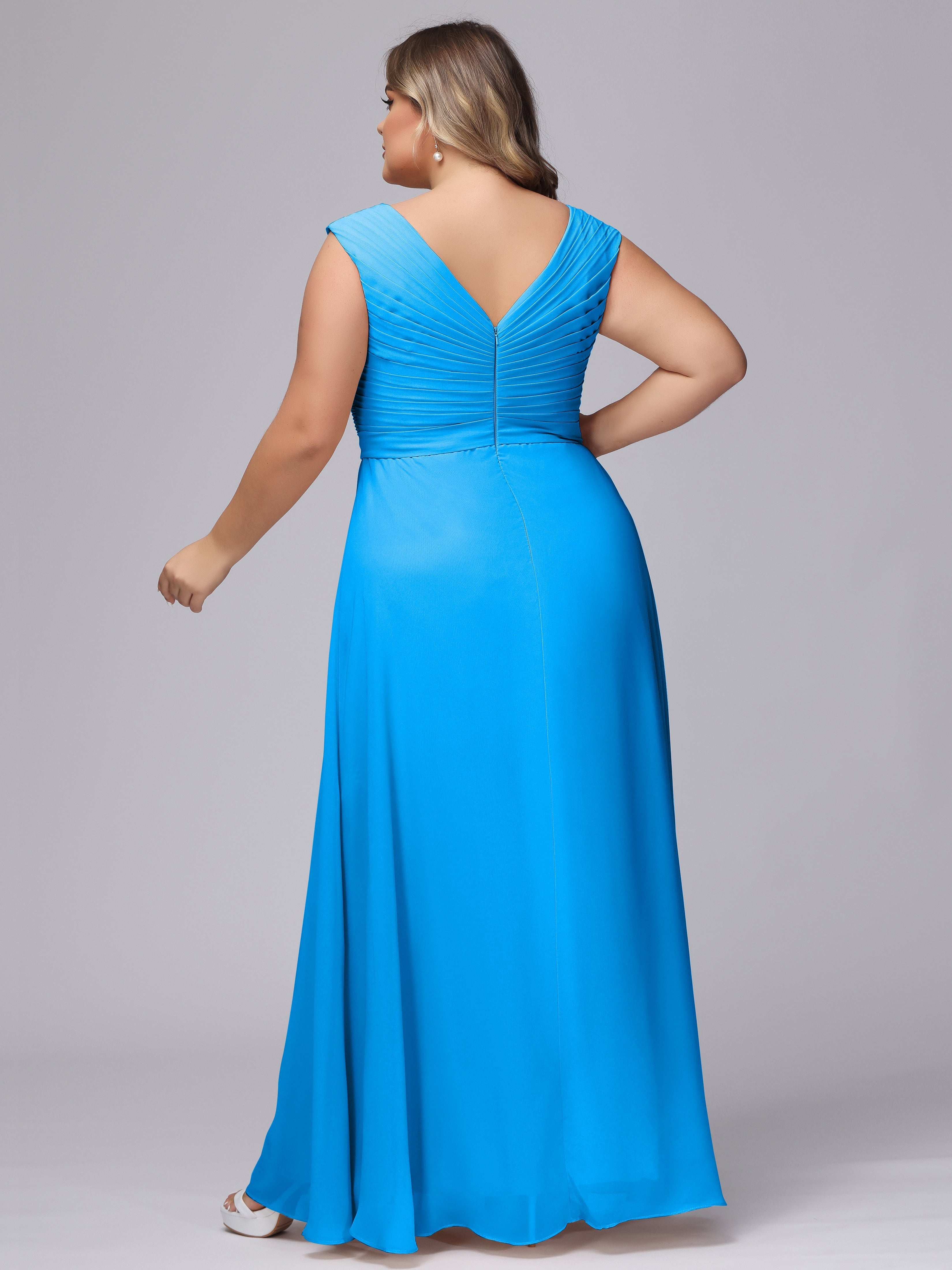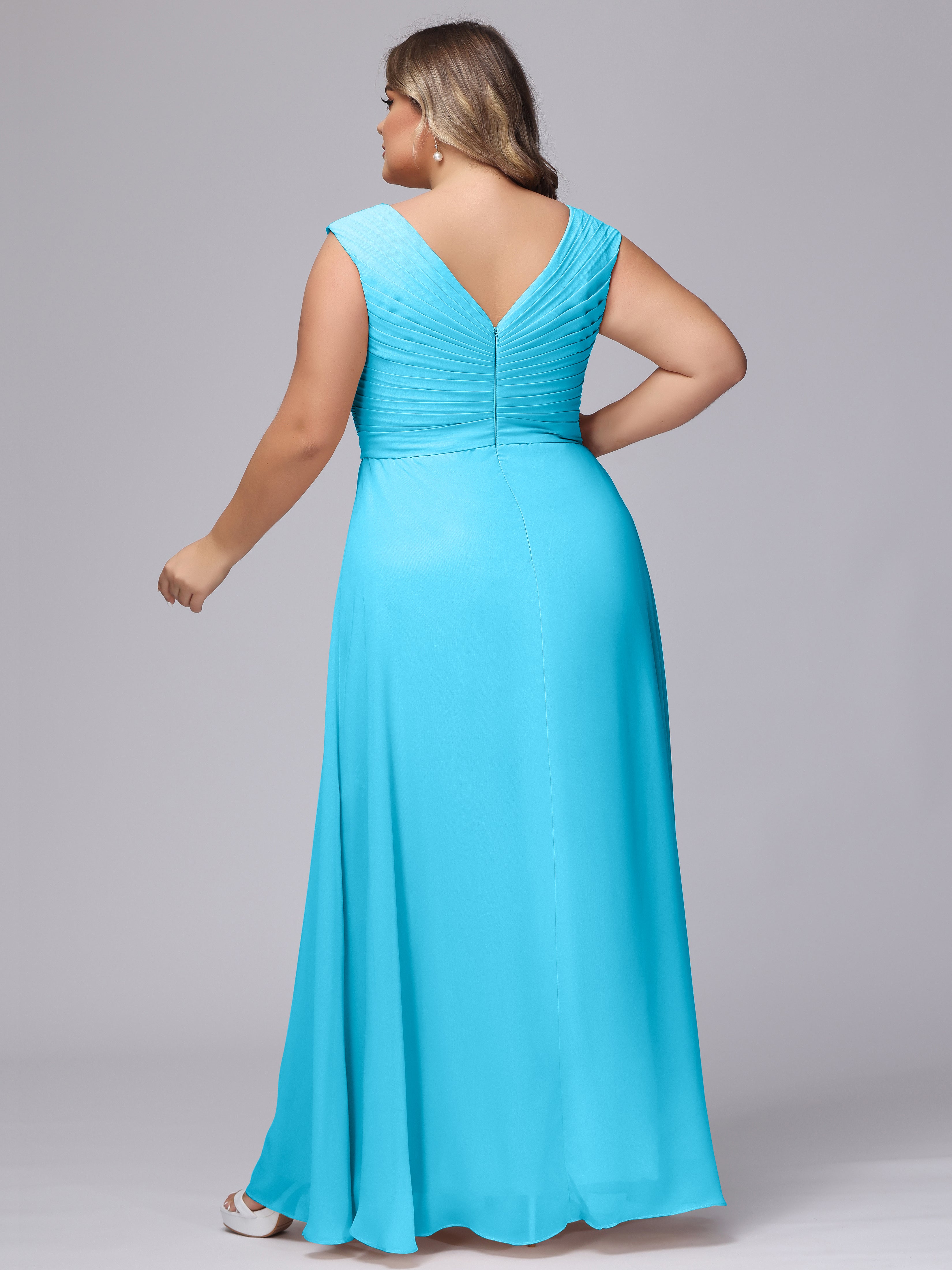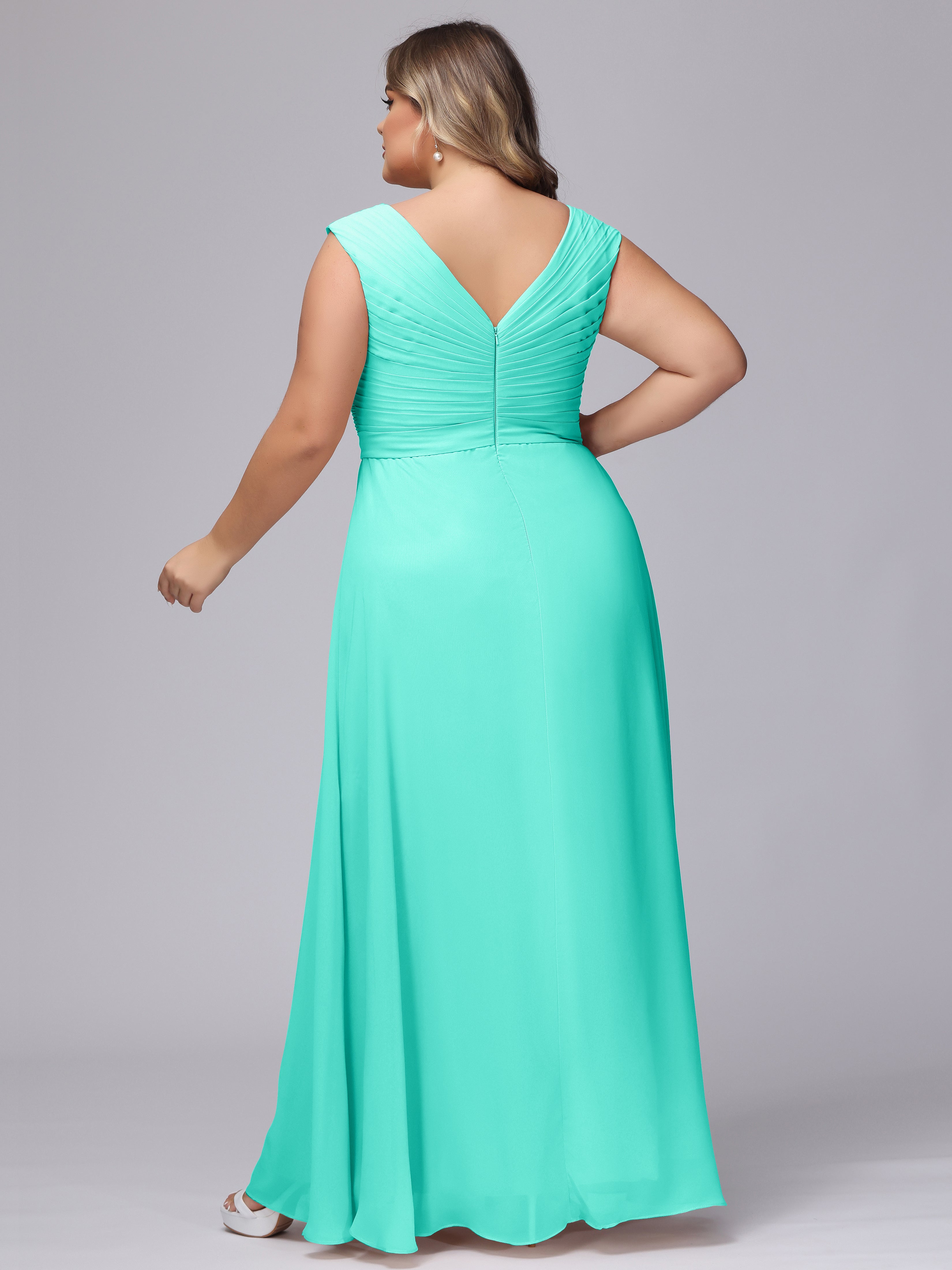 This V-back chiffon bridesmaid dress is available in plus sizes. It features a flattering, elegant V-back design, as well as a lightweight and exquisite chiffon material for a comfortable wearing experience. With its timeless and classic look, this dress will surely make you the center of attention at any wedding.
