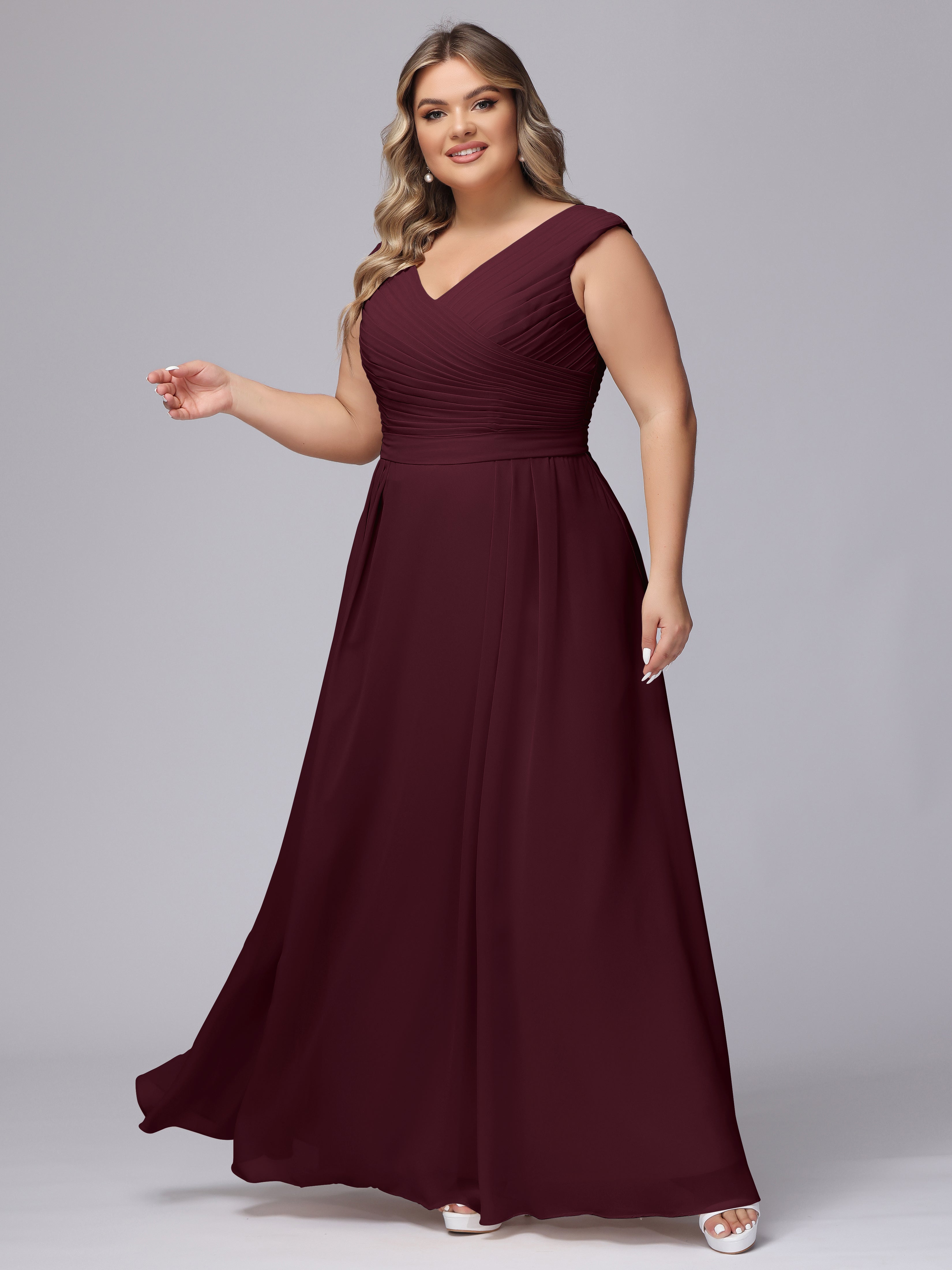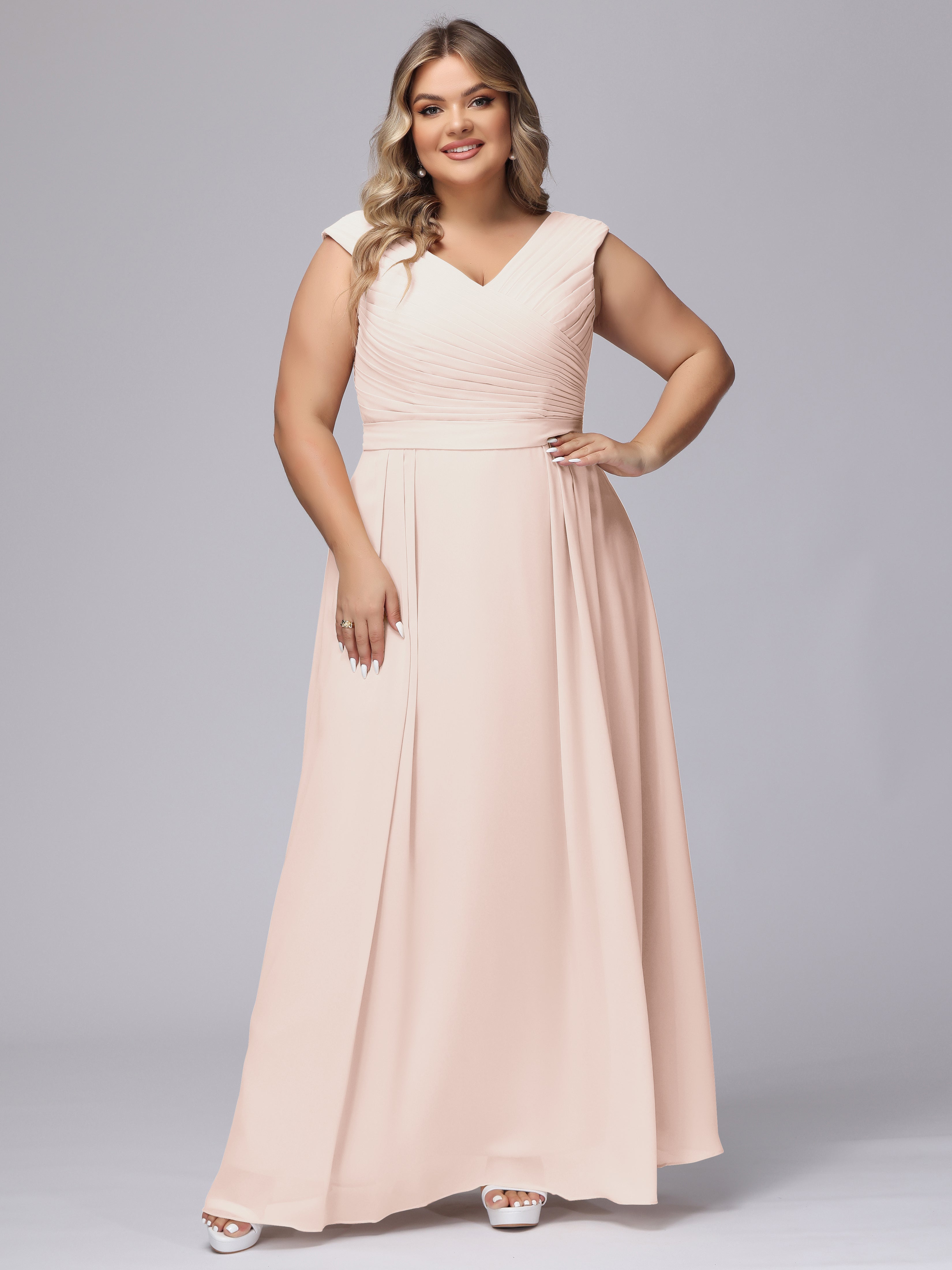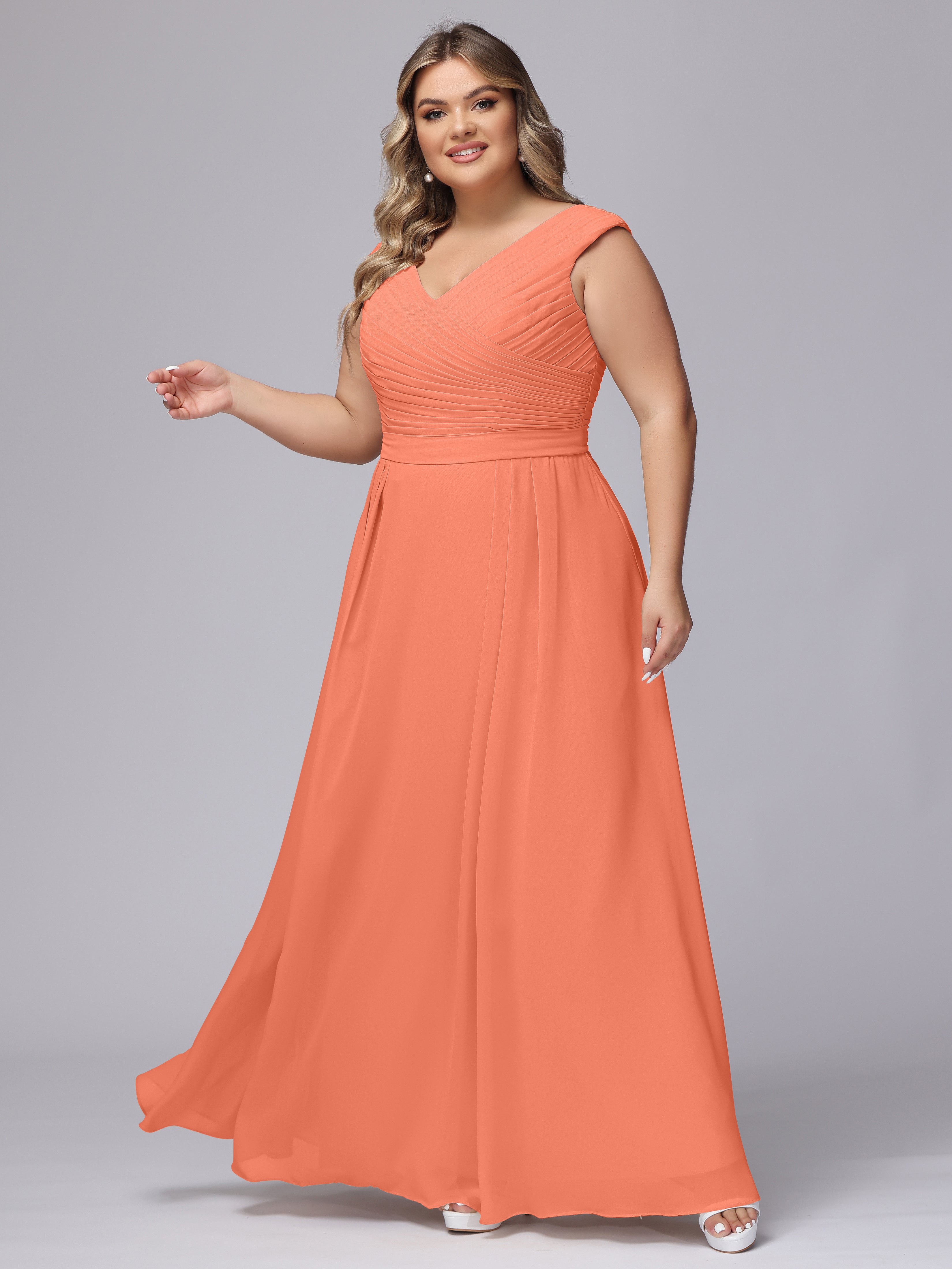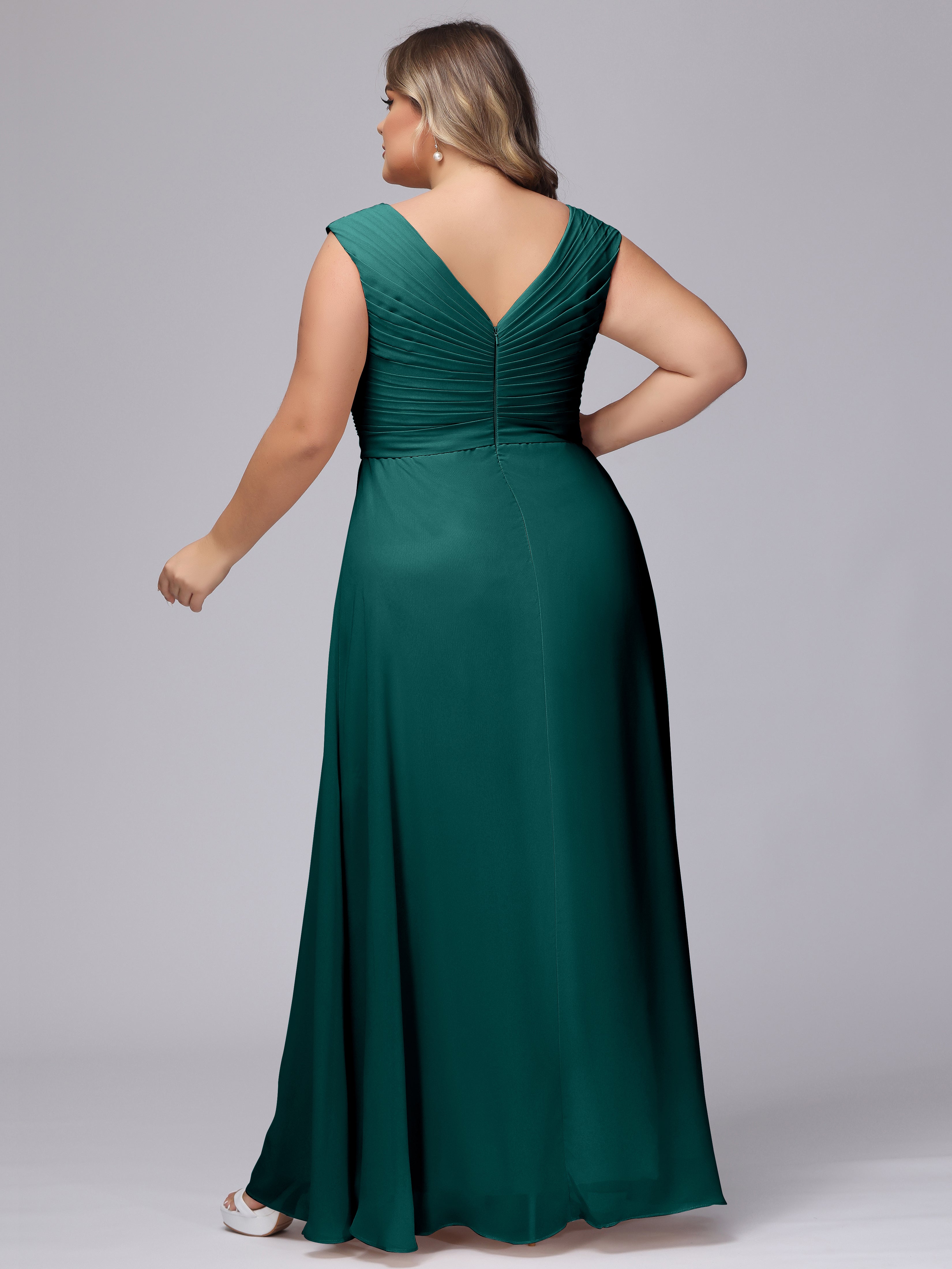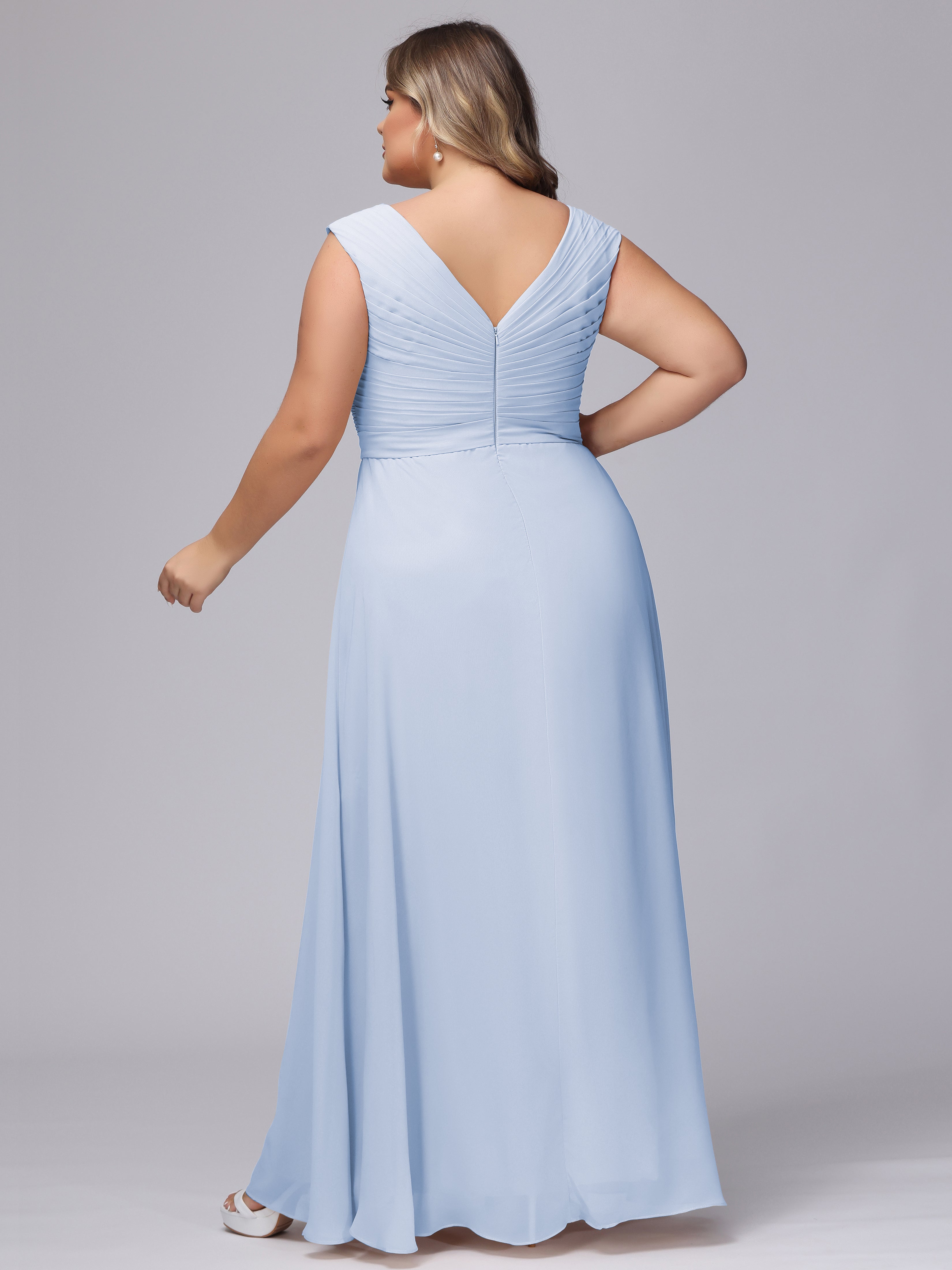 This V-back chiffon bridesmaid dress is available in plus sizes. It features a flattering, elegant V-back design, as well as a lightweight and exquisite chiffon material for a comfortable wearing experience. With its timeless and classic look, this dress will surely make you the center of attention at any wedding.