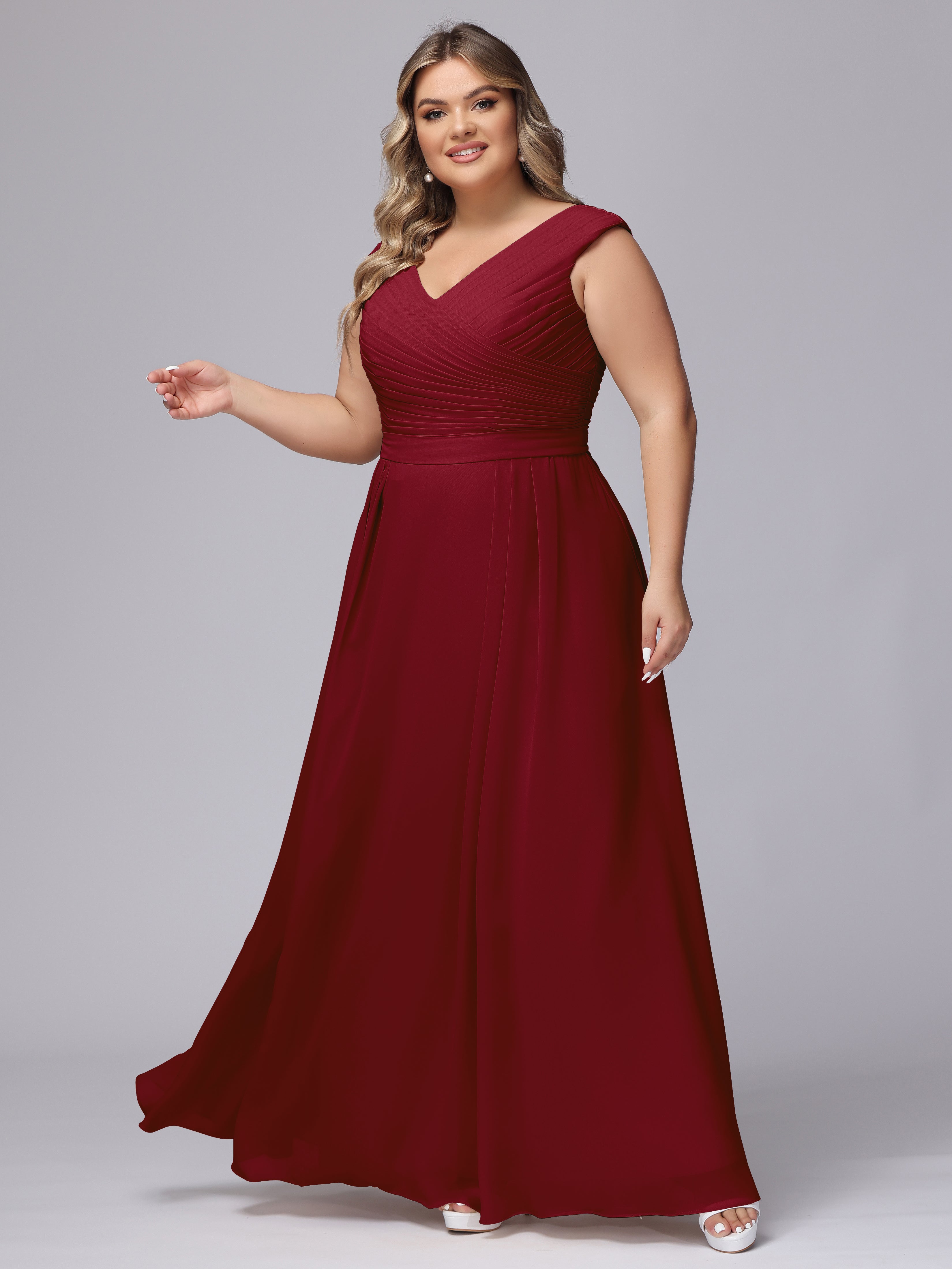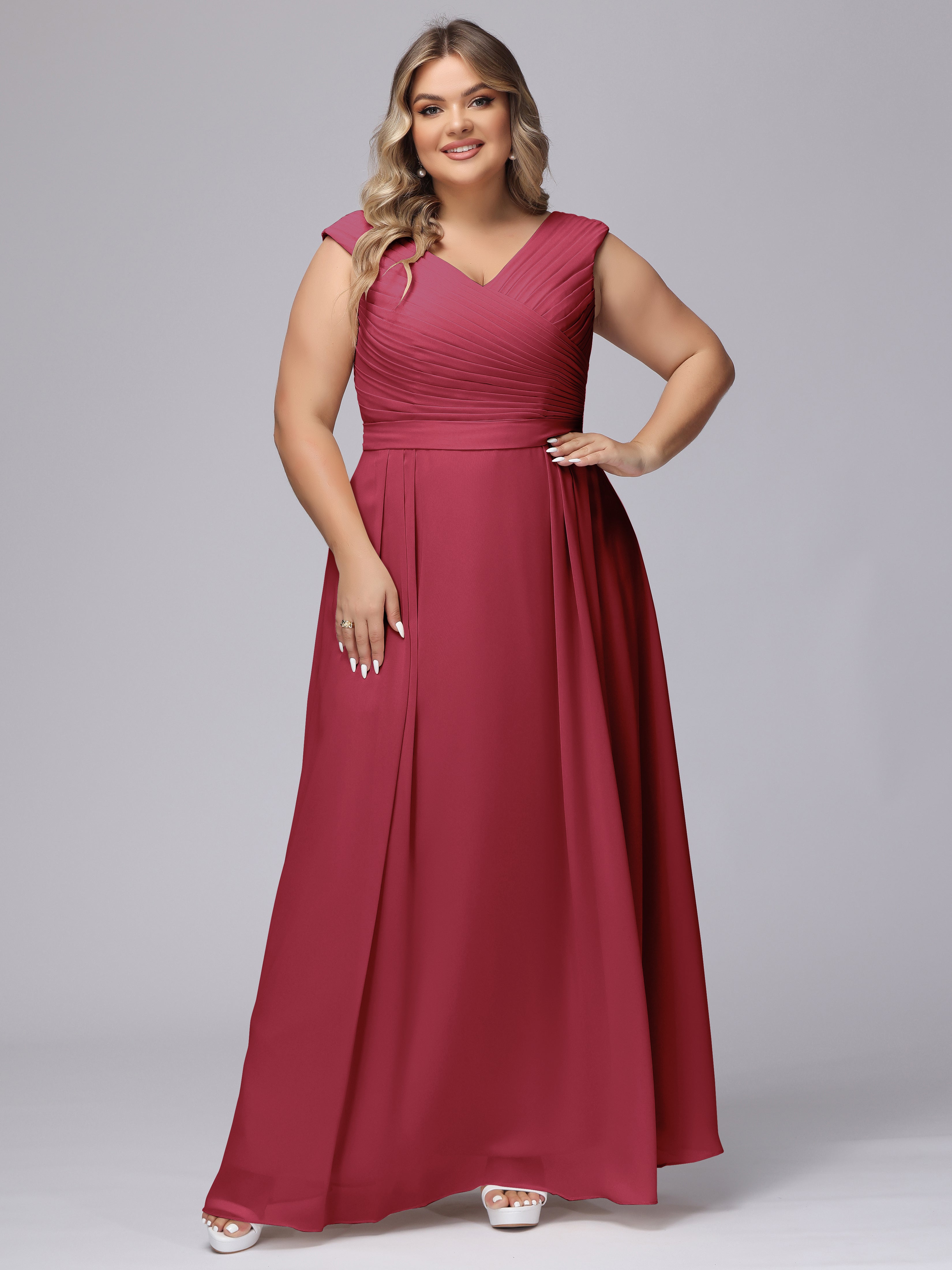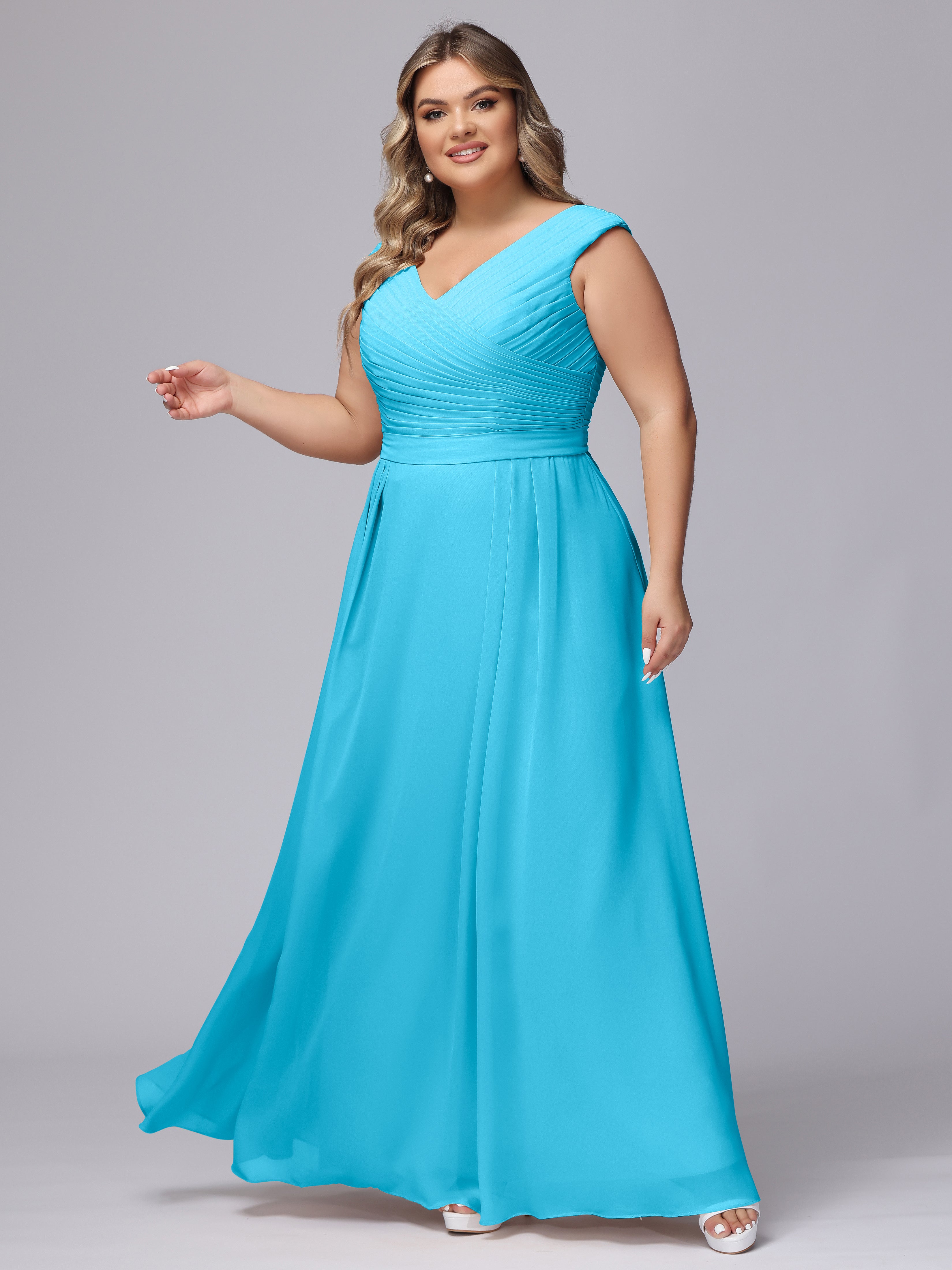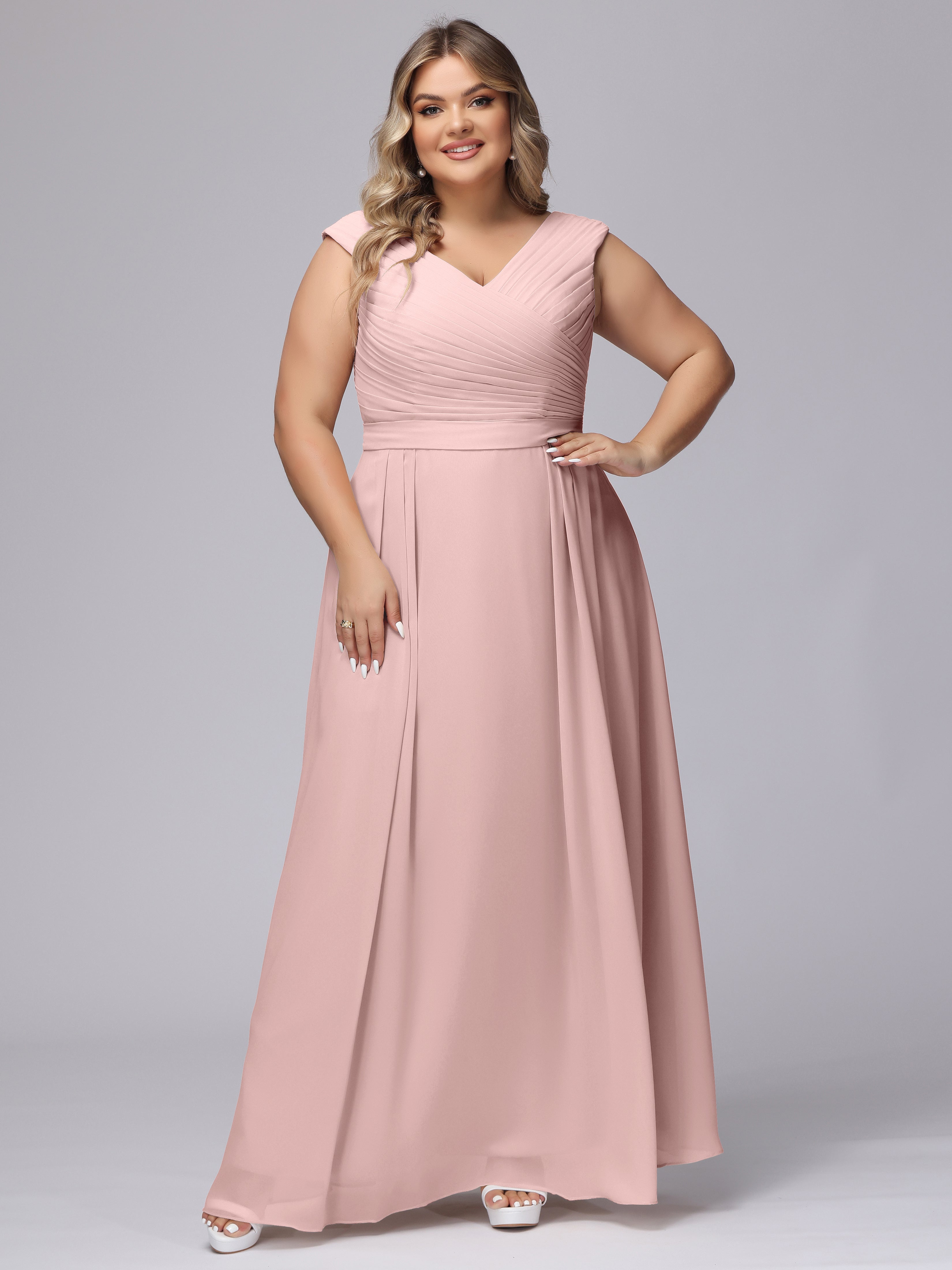 This V-back chiffon bridesmaid dress is available in plus sizes. It features a flattering, elegant V-back design, as well as a lightweight and exquisite chiffon material for a comfortable wearing experience. With its timeless and classic look, this dress will surely make you the center of attention at any wedding.