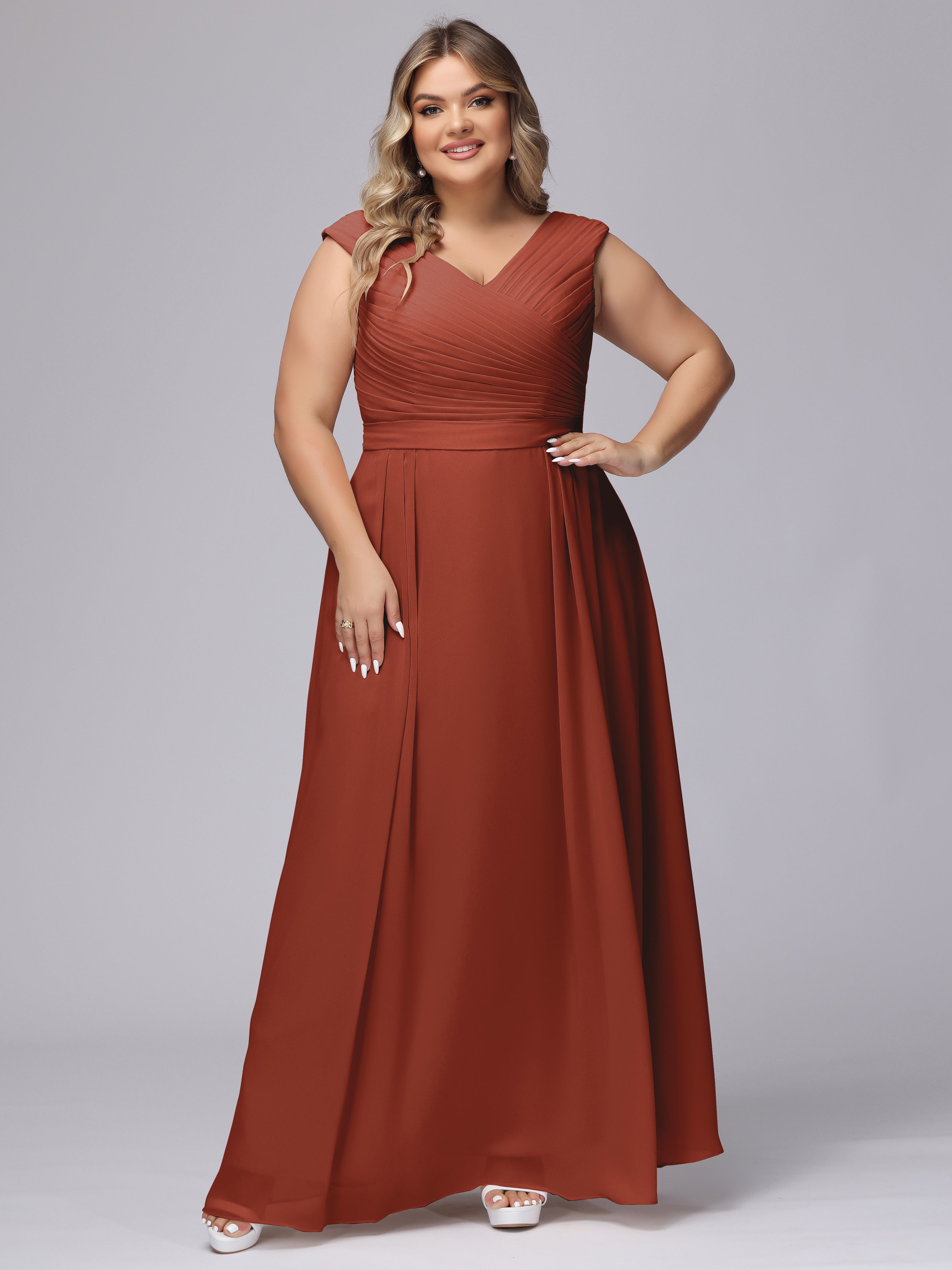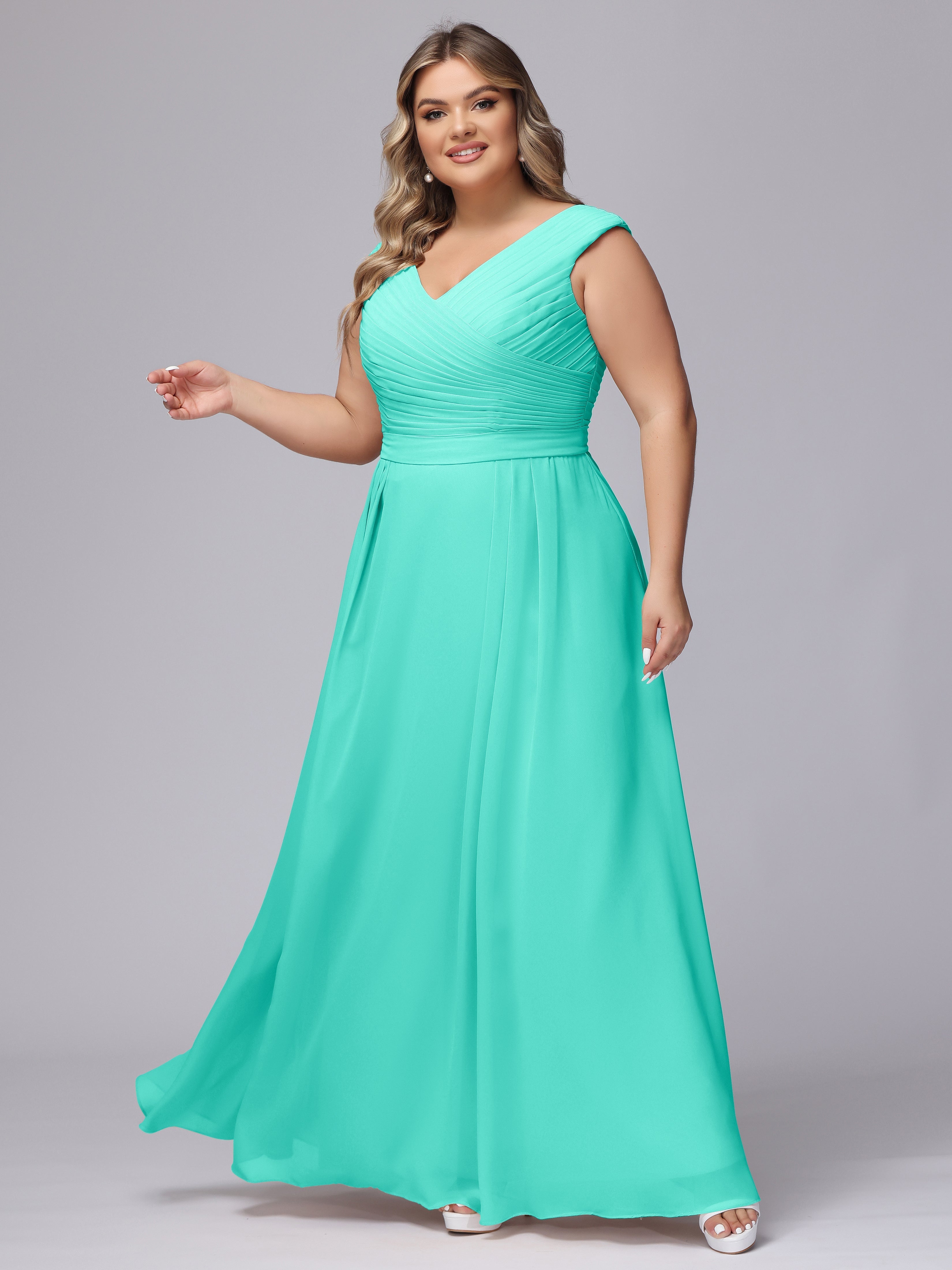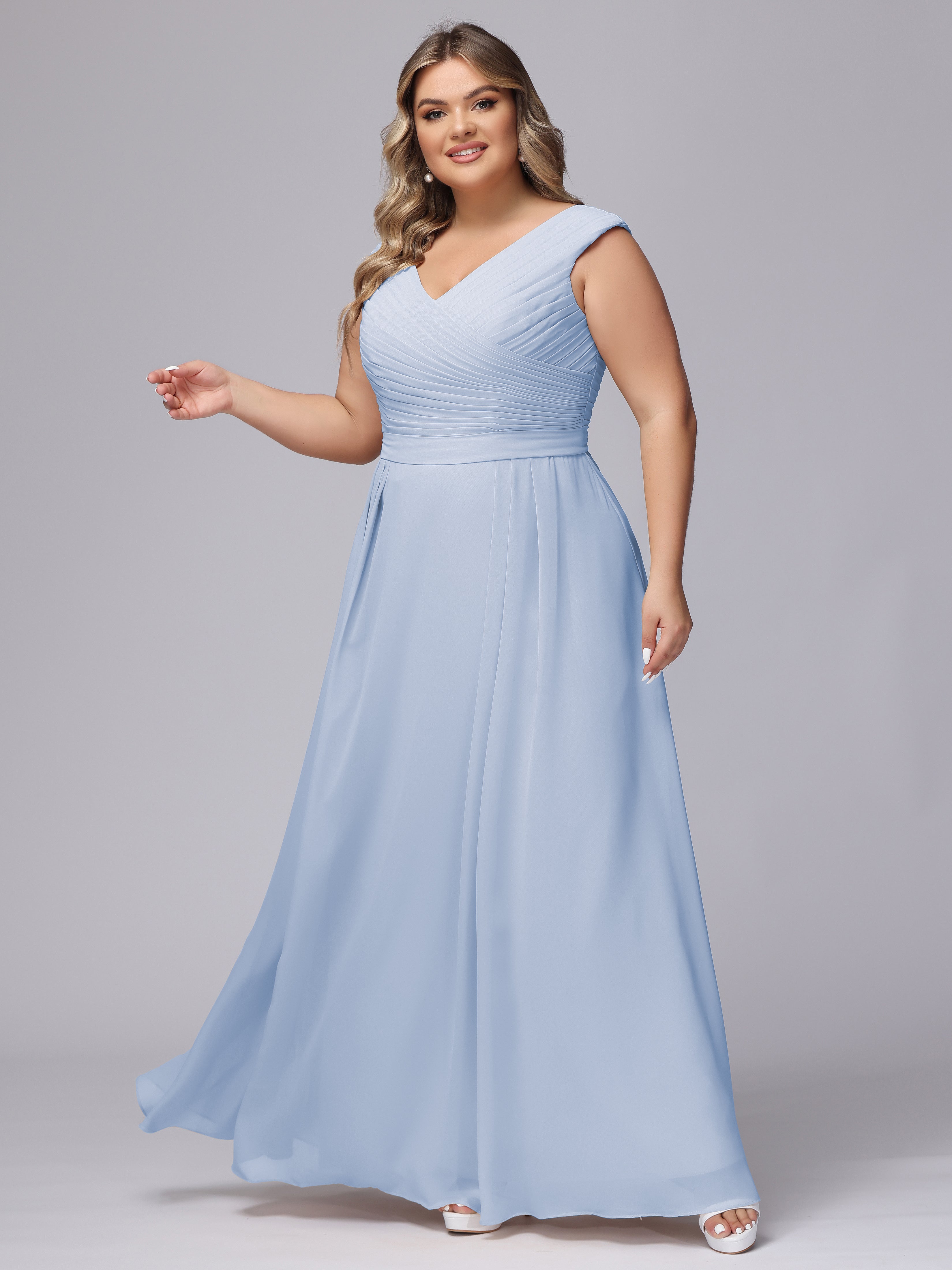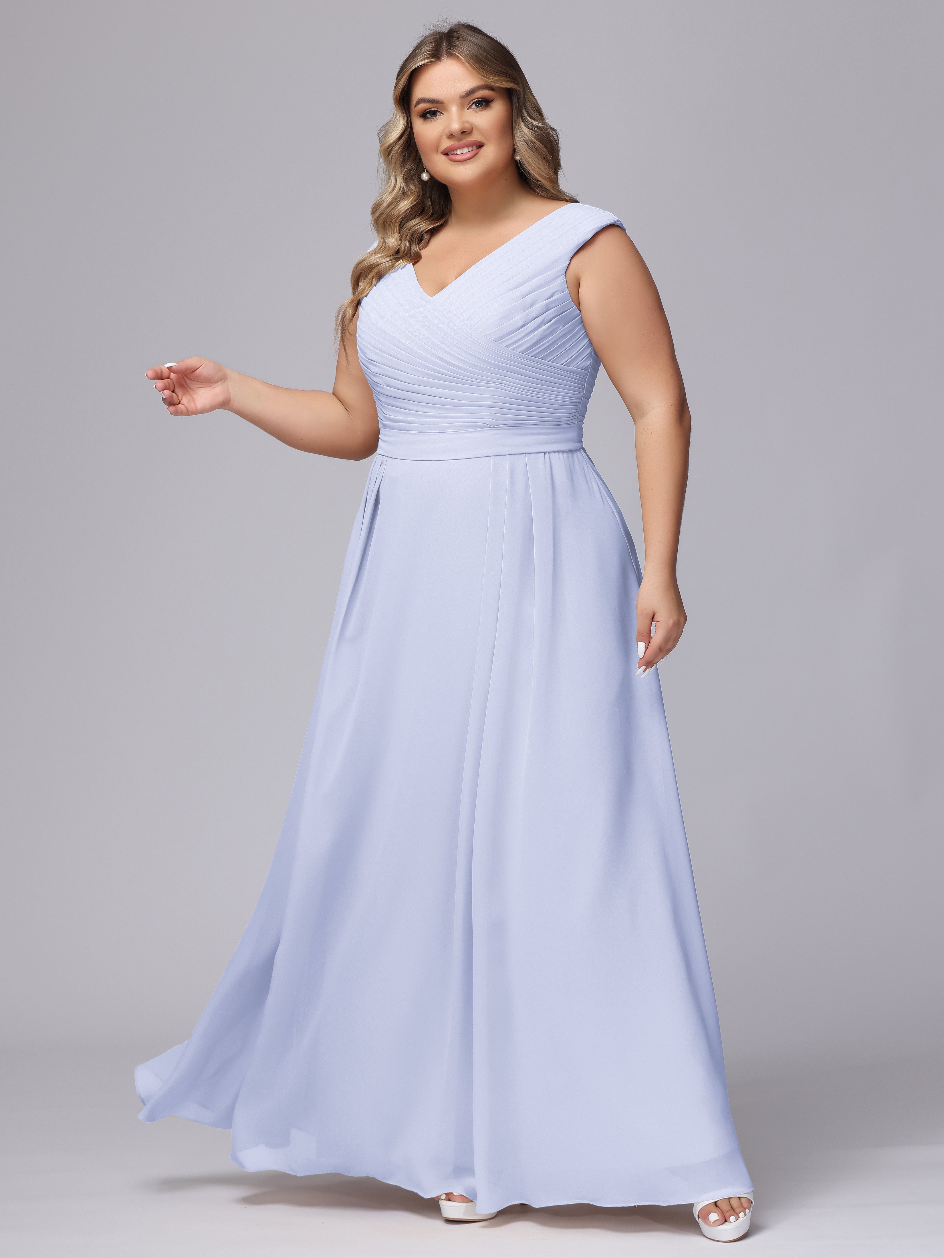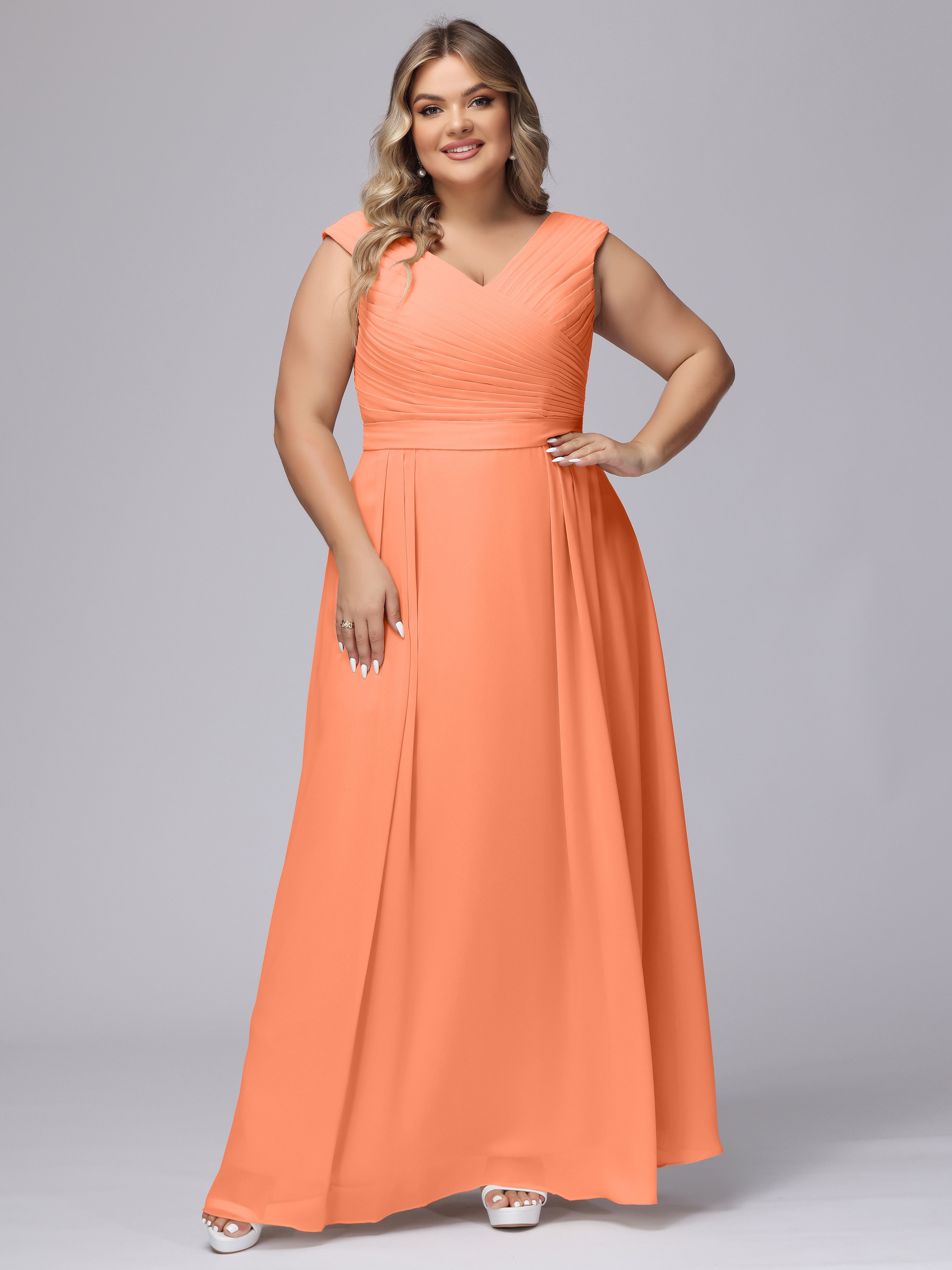 This V-back chiffon bridesmaid dress is available in plus sizes. It features a flattering, elegant V-back design, as well as a lightweight and exquisite chiffon material for a comfortable wearing experience. With its timeless and classic look, this dress will surely make you the center of attention at any wedding.