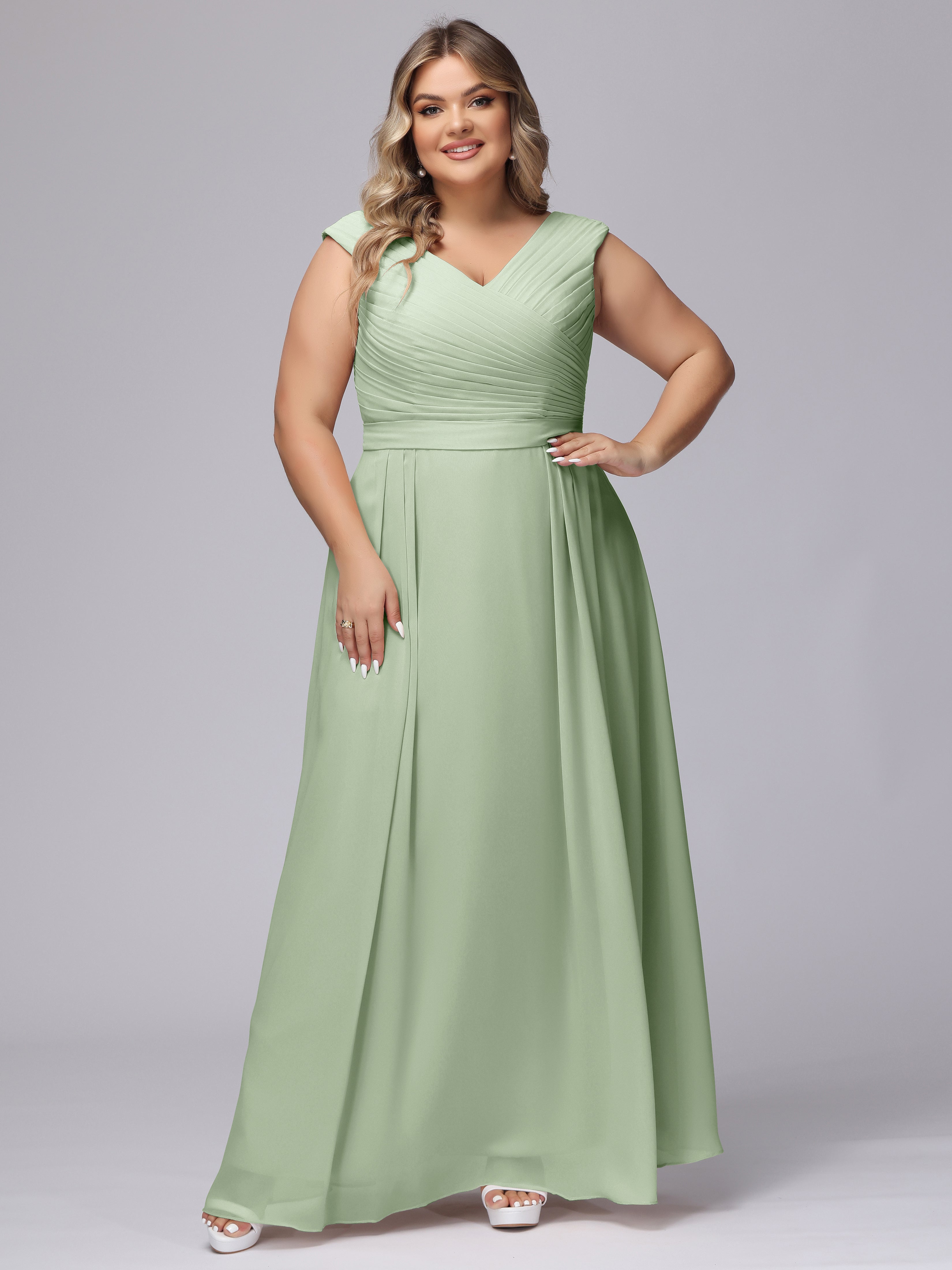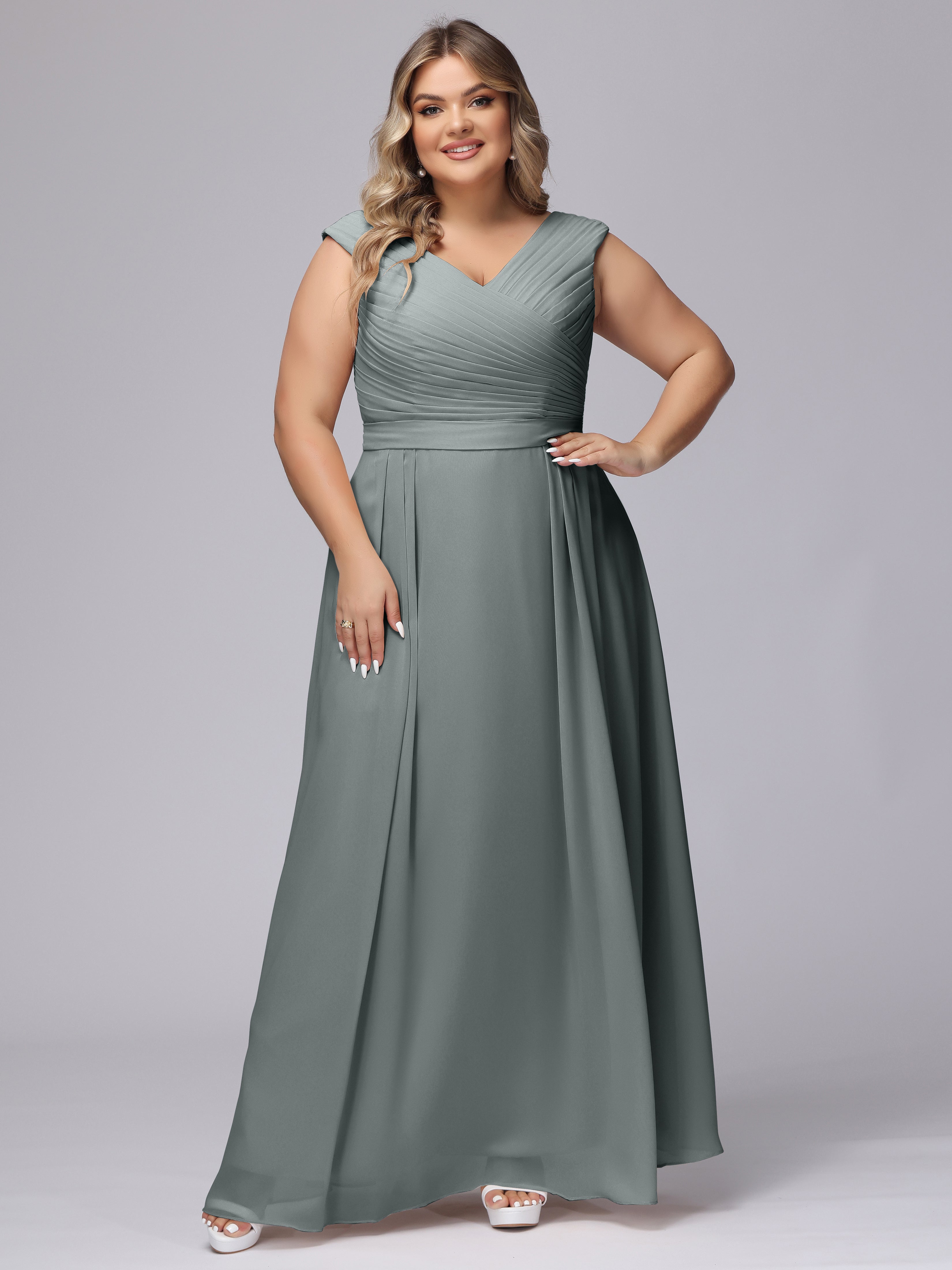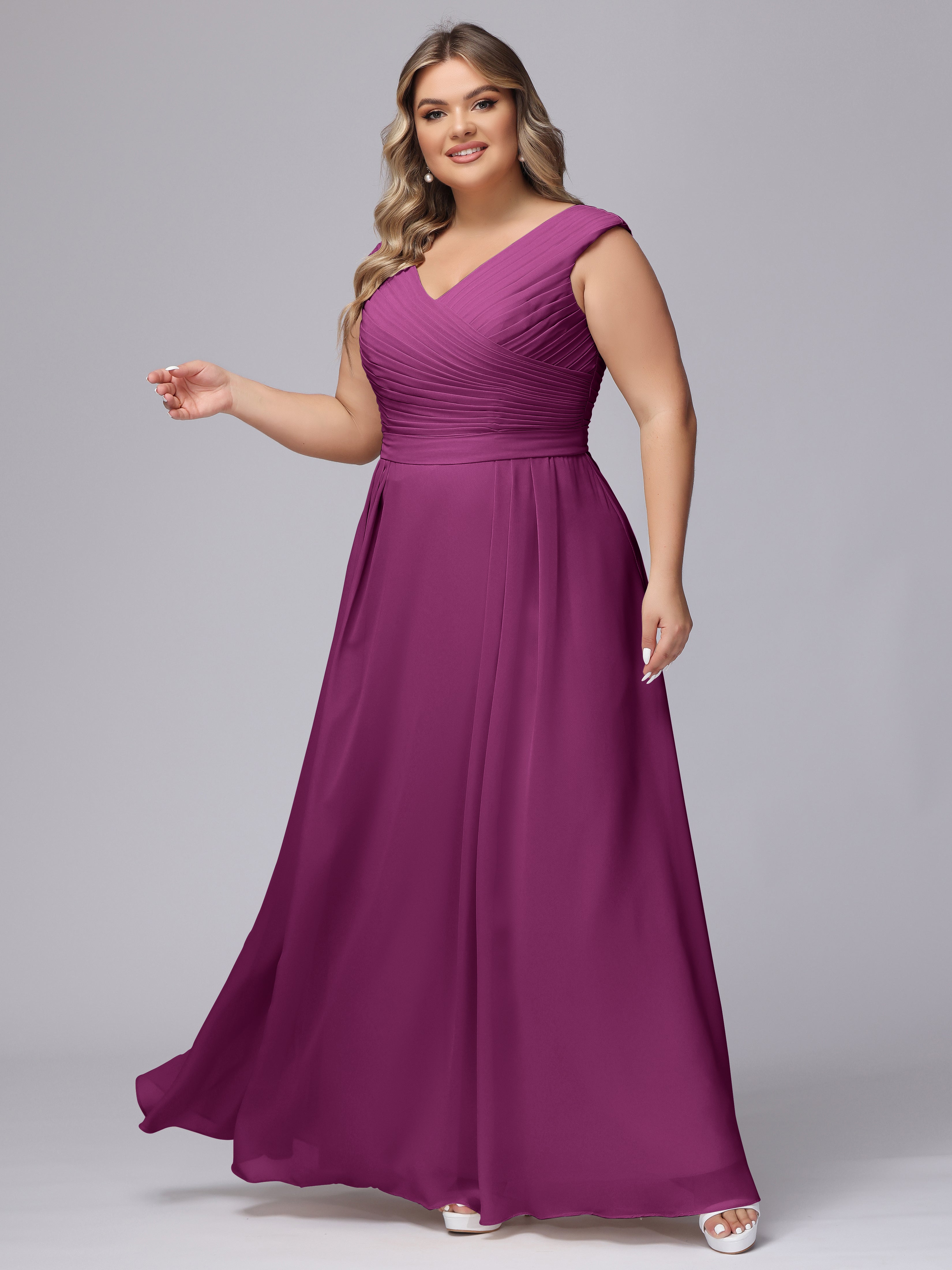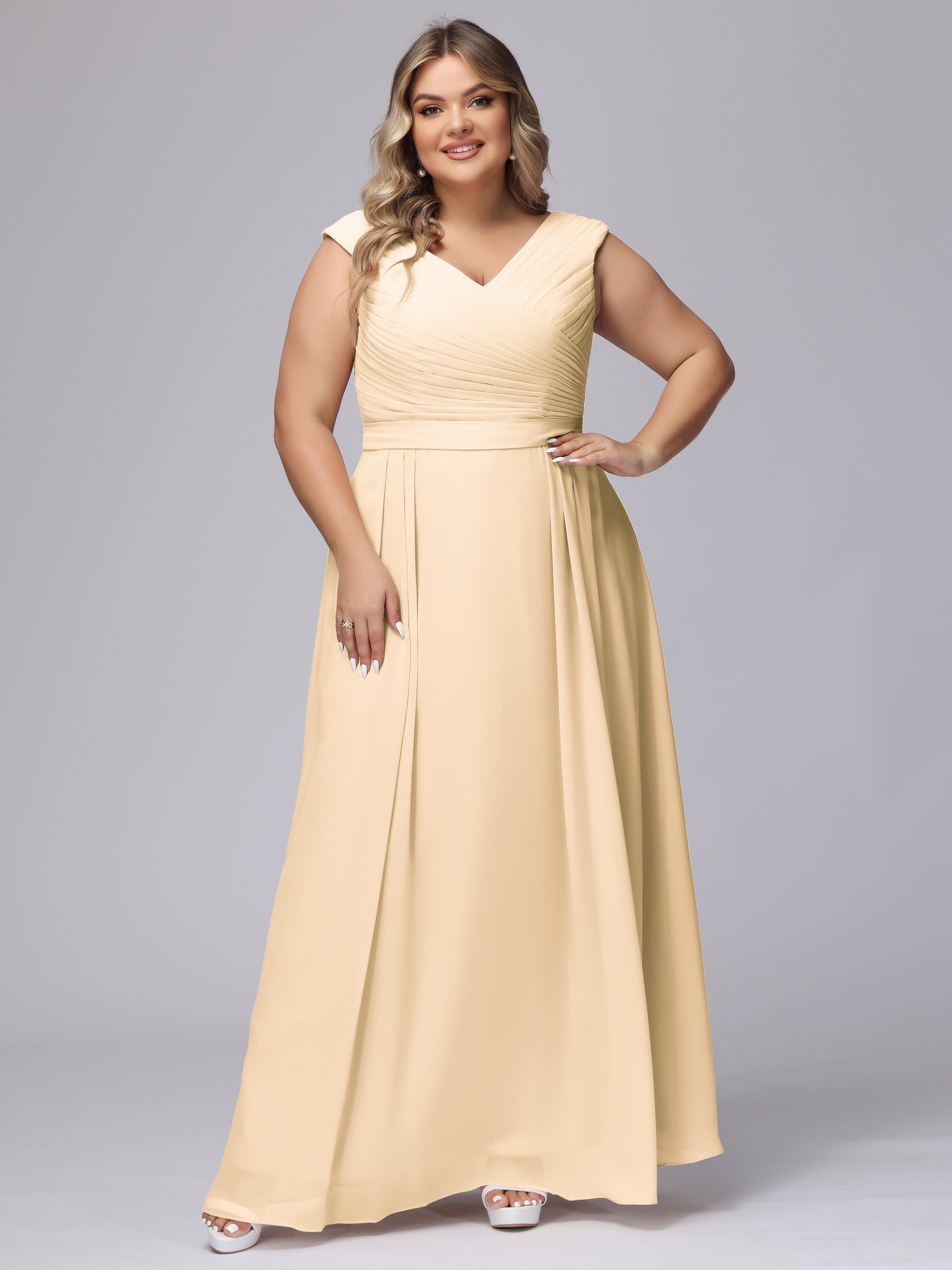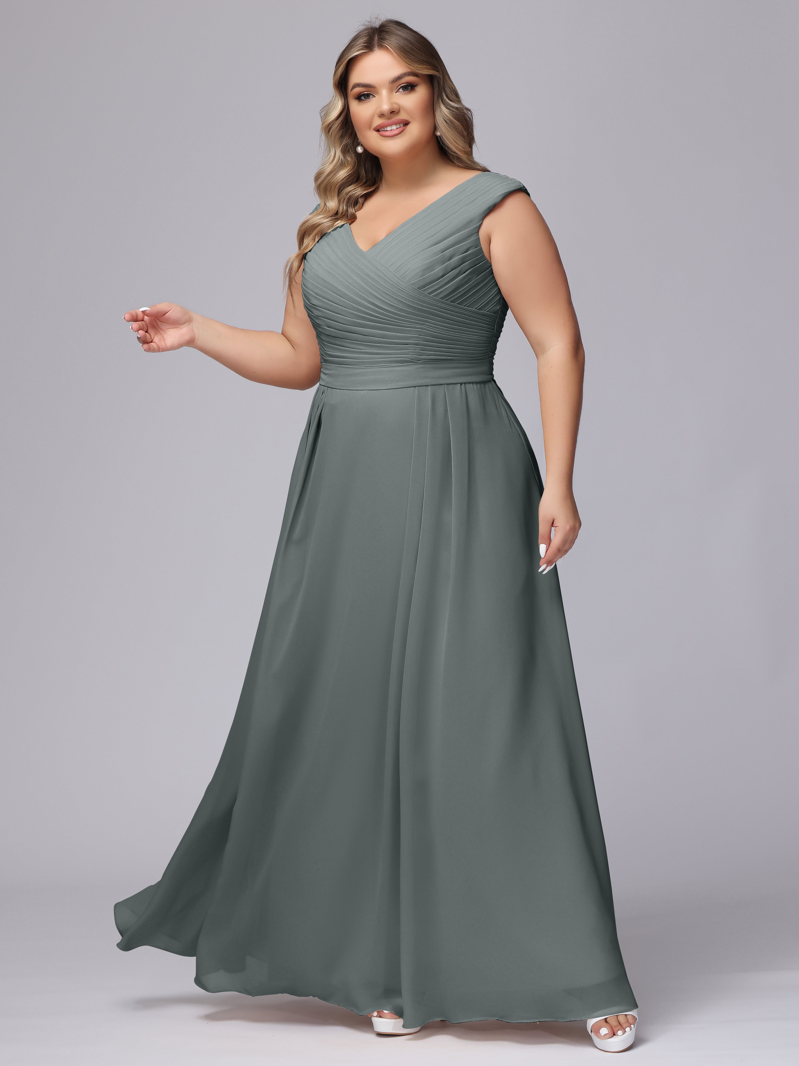 This V-back chiffon bridesmaid dress is available in plus sizes. It features a flattering, elegant V-back design, as well as a lightweight and exquisite chiffon material for a comfortable wearing experience. With its timeless and classic look, this dress will surely make you the center of attention at any wedding.