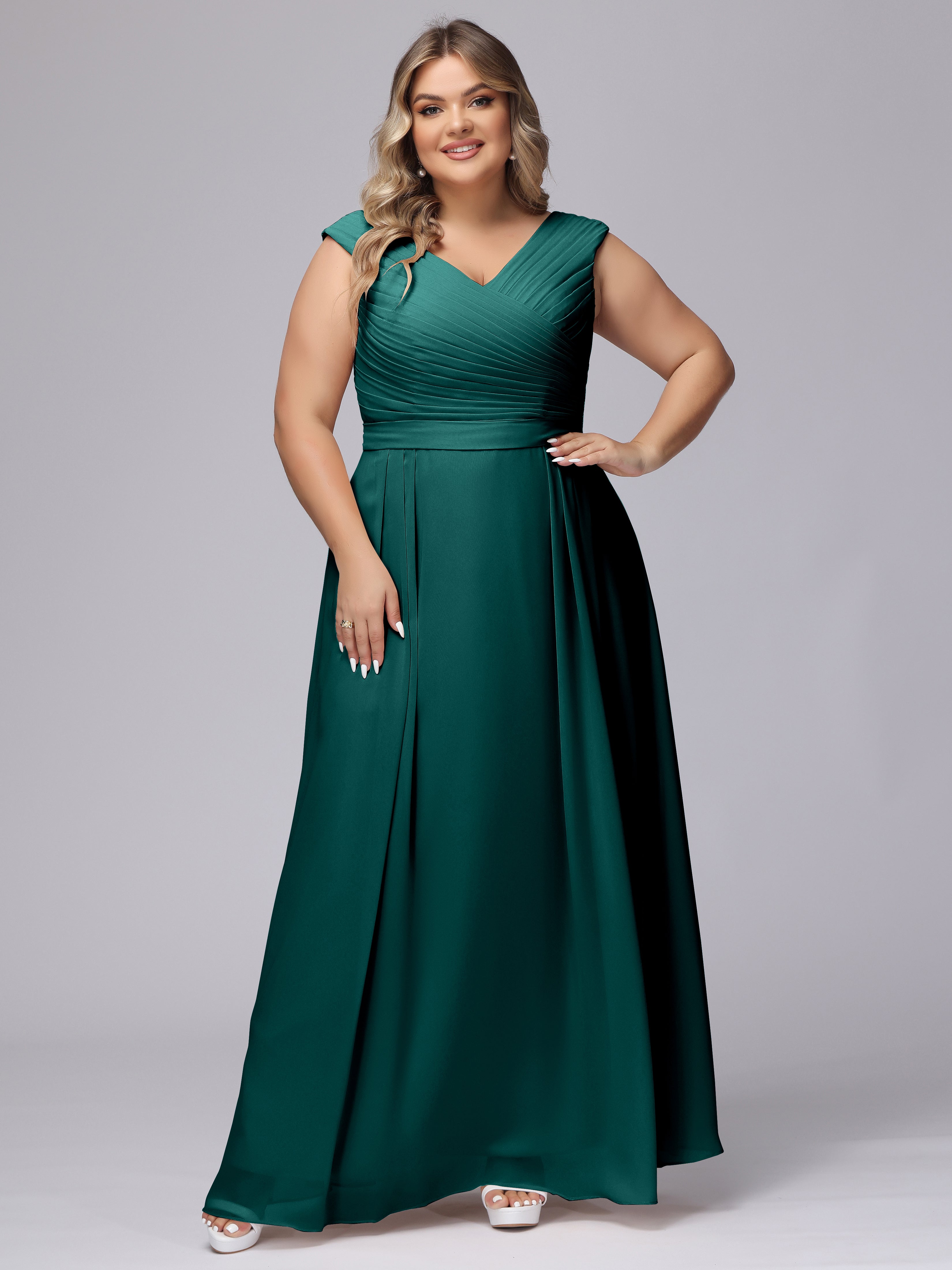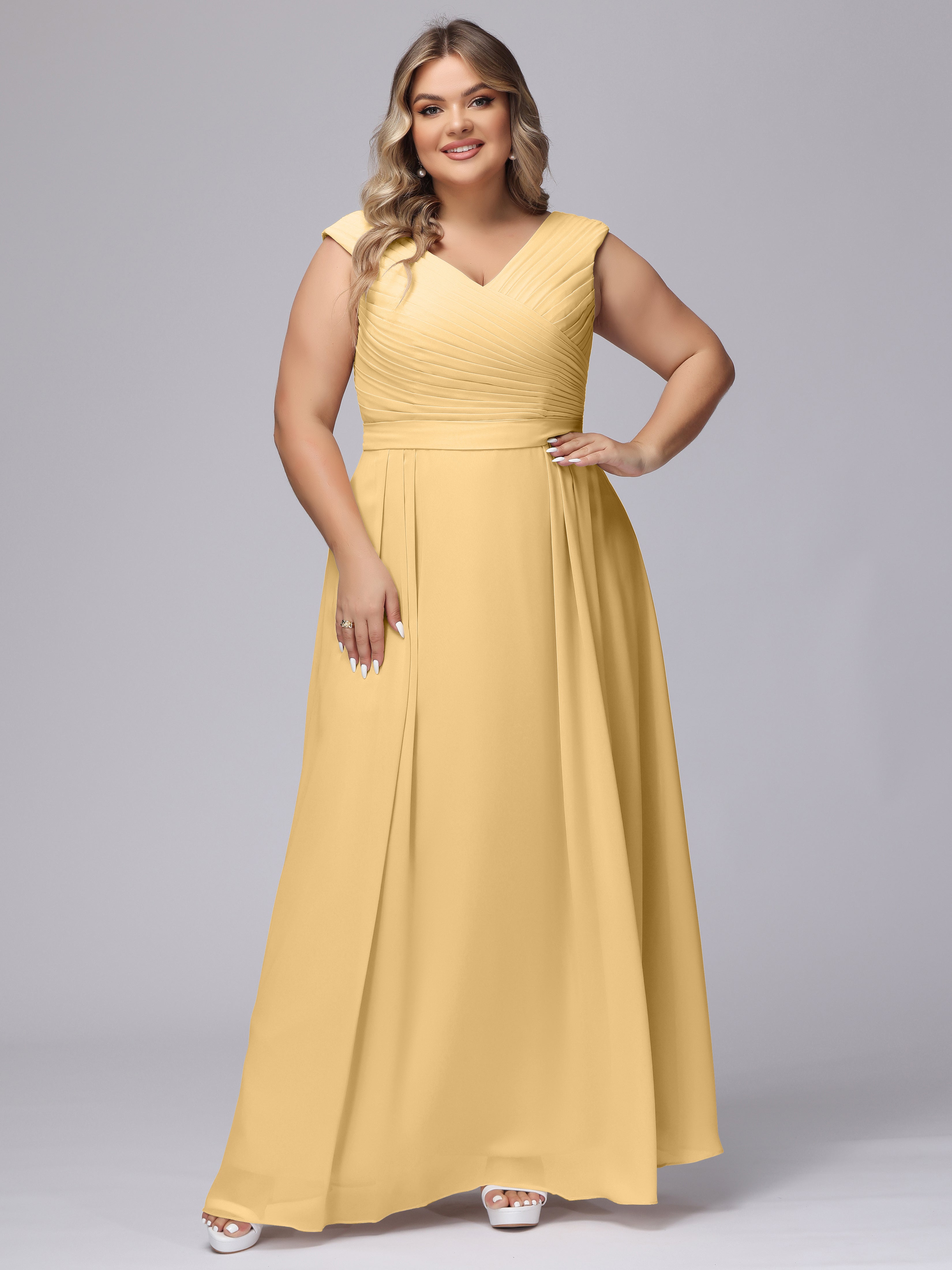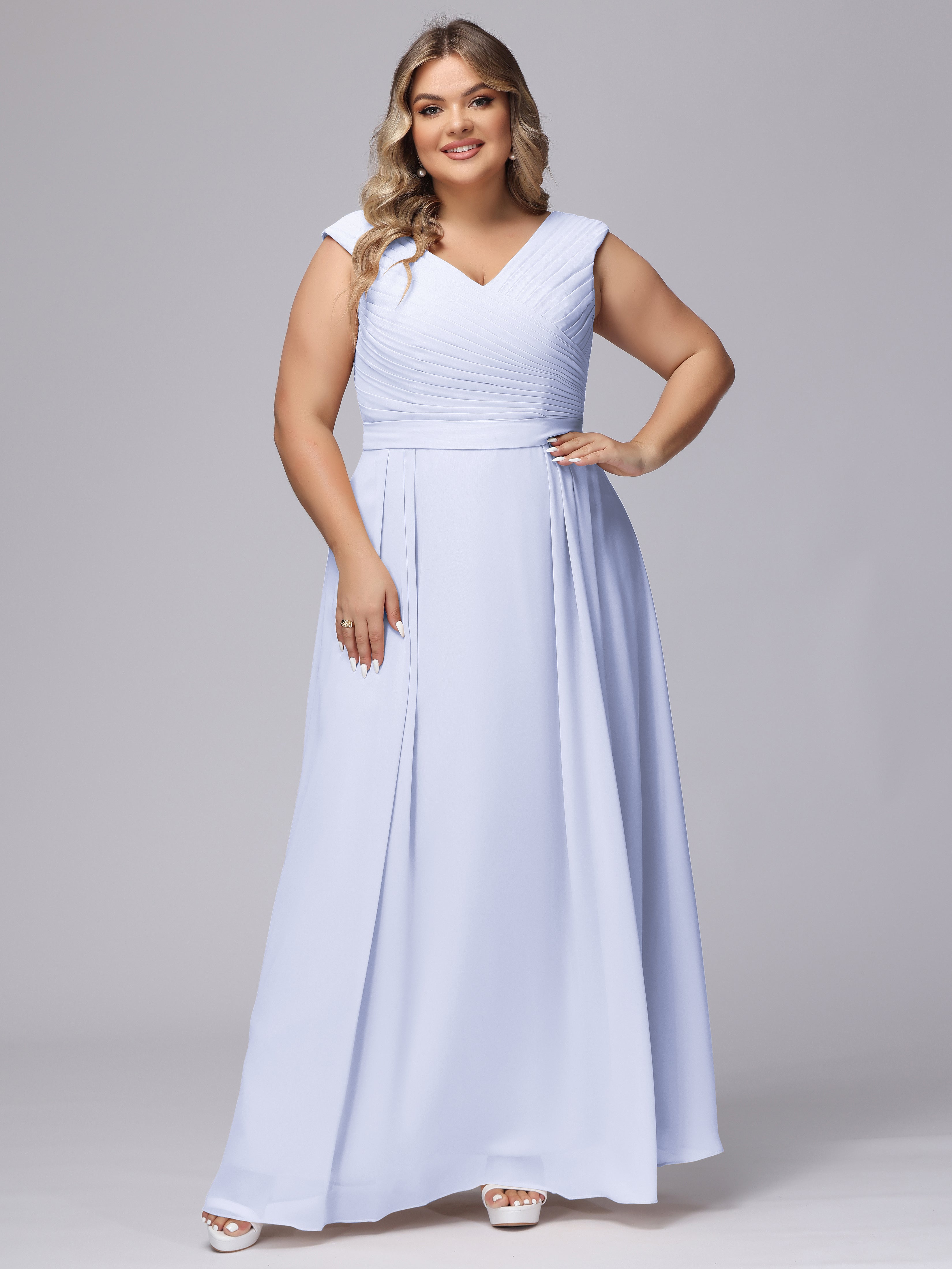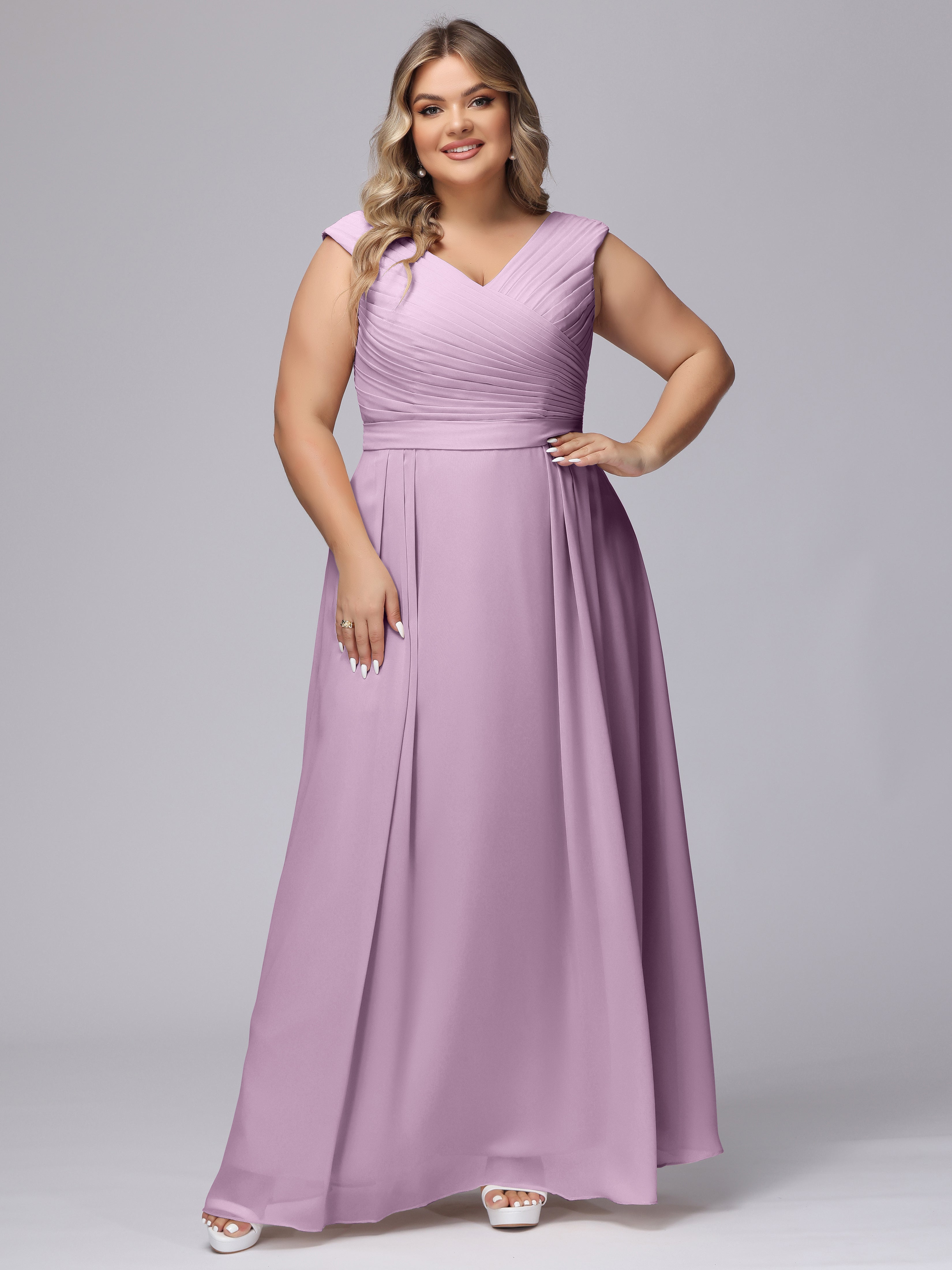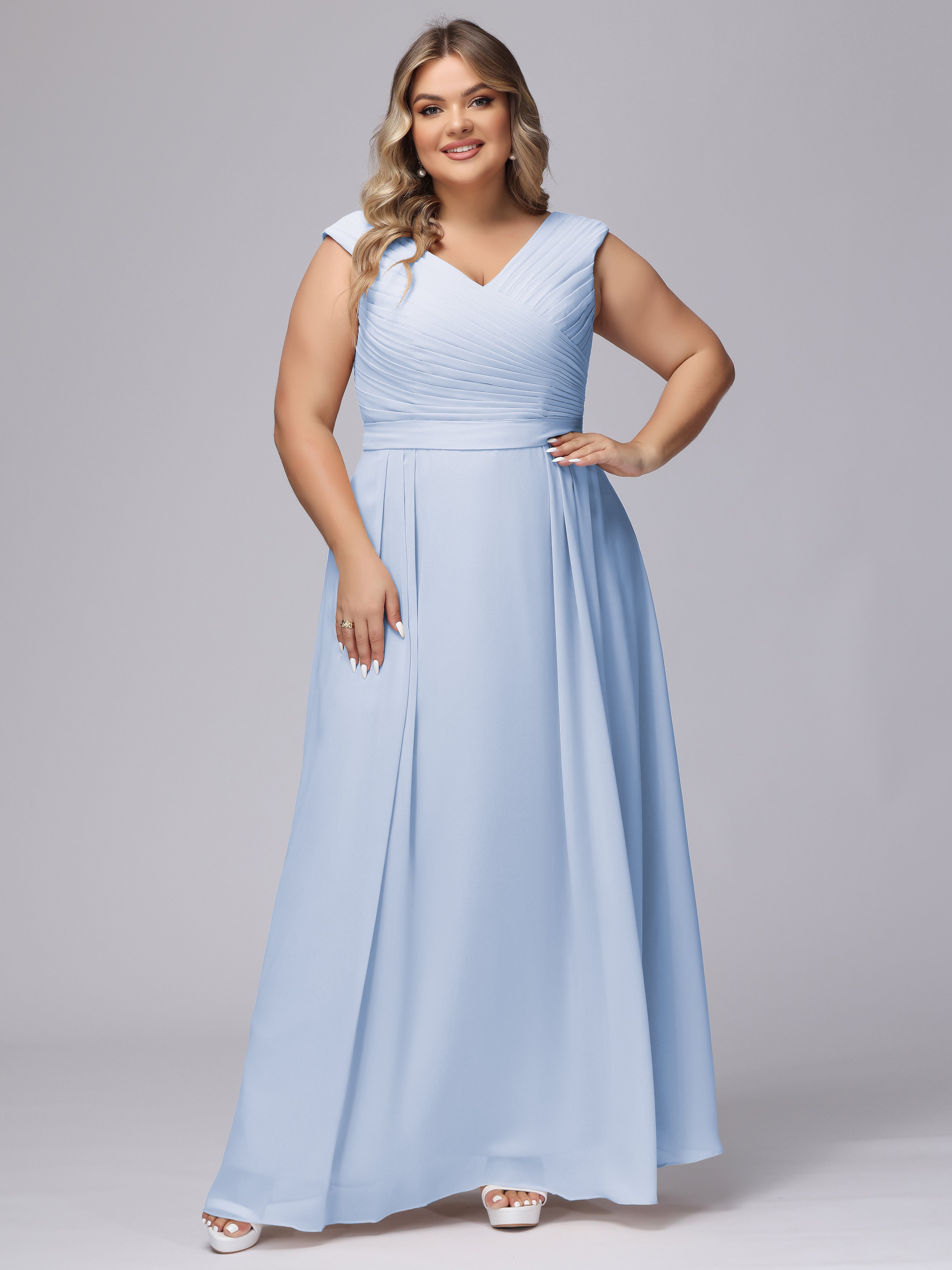 This V-back chiffon bridesmaid dress is available in plus sizes. It features a flattering, elegant V-back design, as well as a lightweight and exquisite chiffon material for a comfortable wearing experience. With its timeless and classic look, this dress will surely make you the center of attention at any wedding.