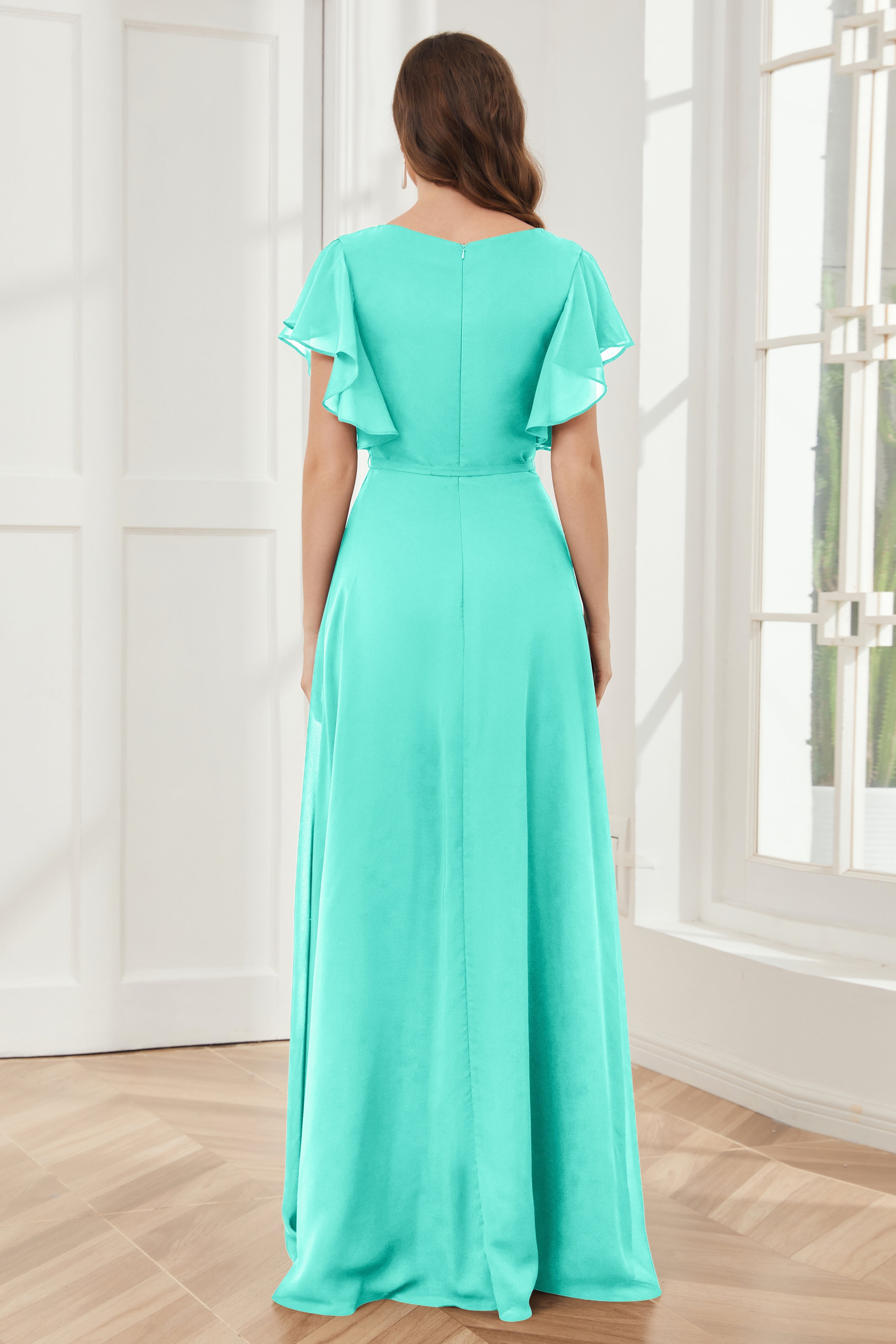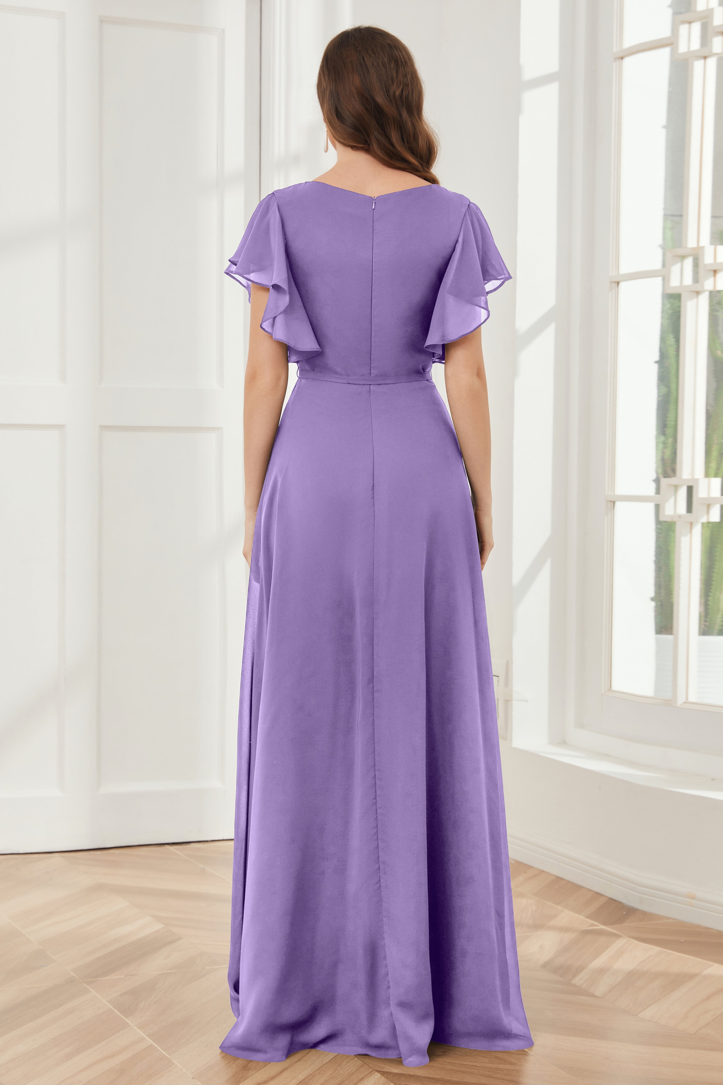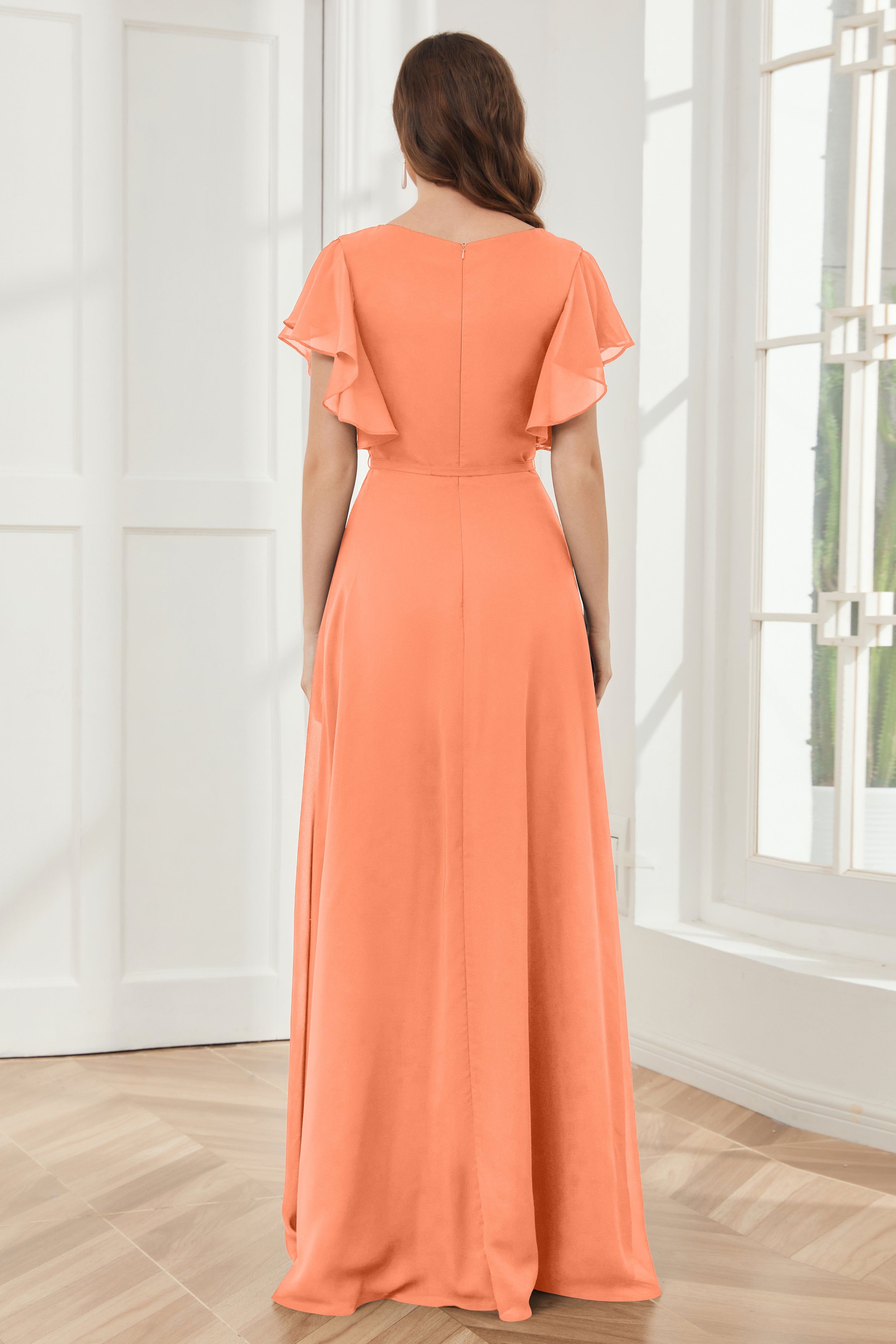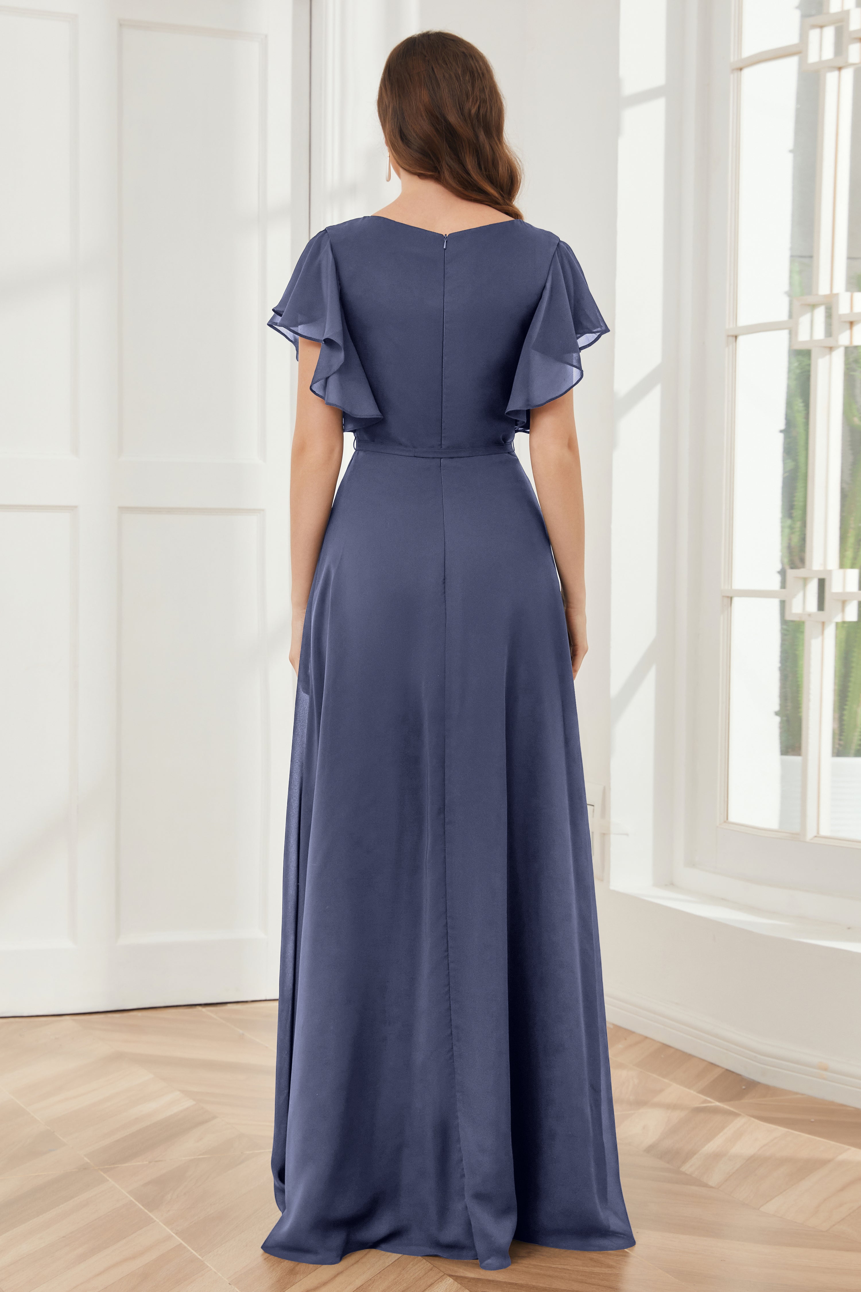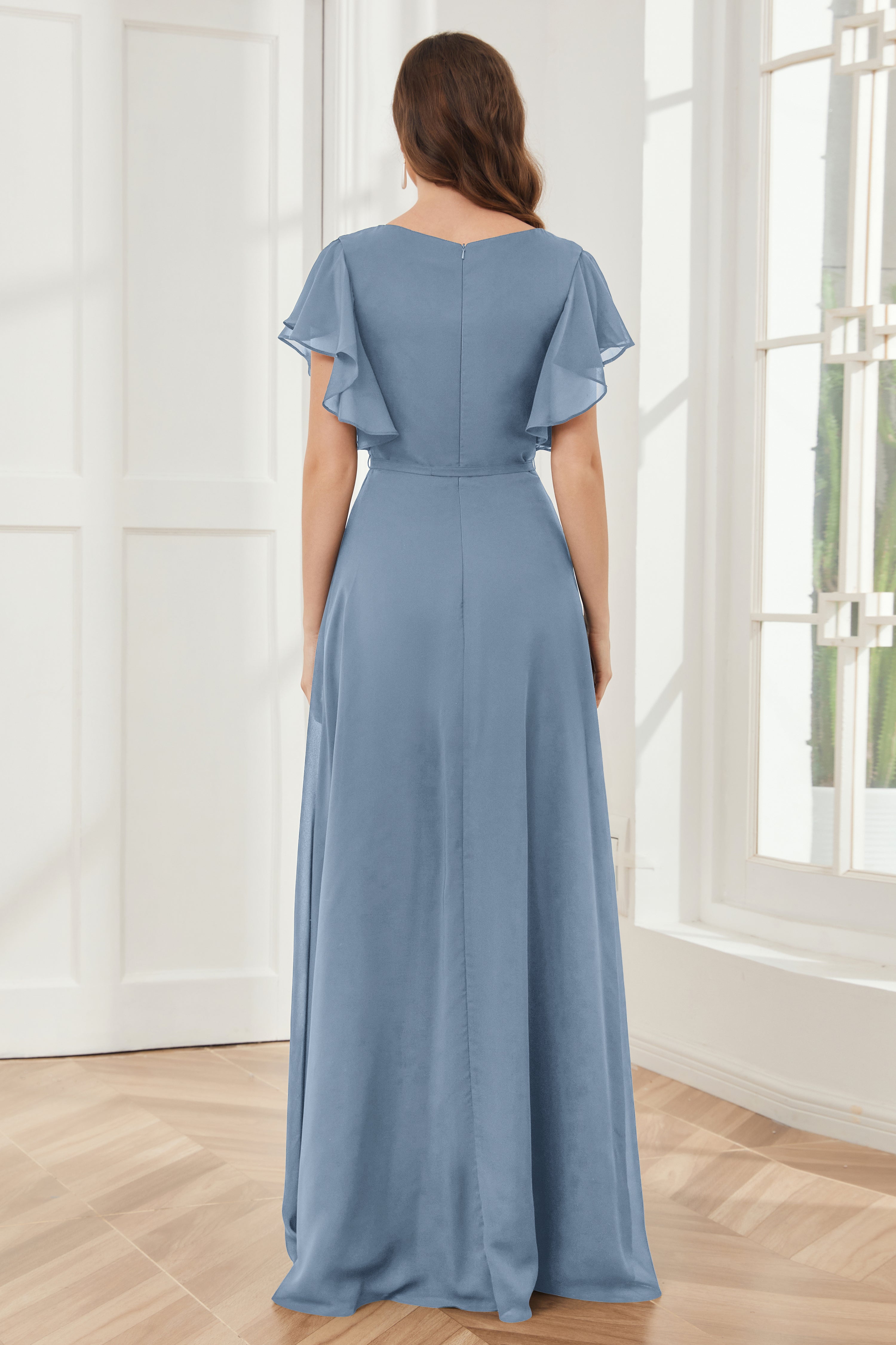 V-neck Ruffles Sleeves Chiffon Bridesmaid Dresses with Slit