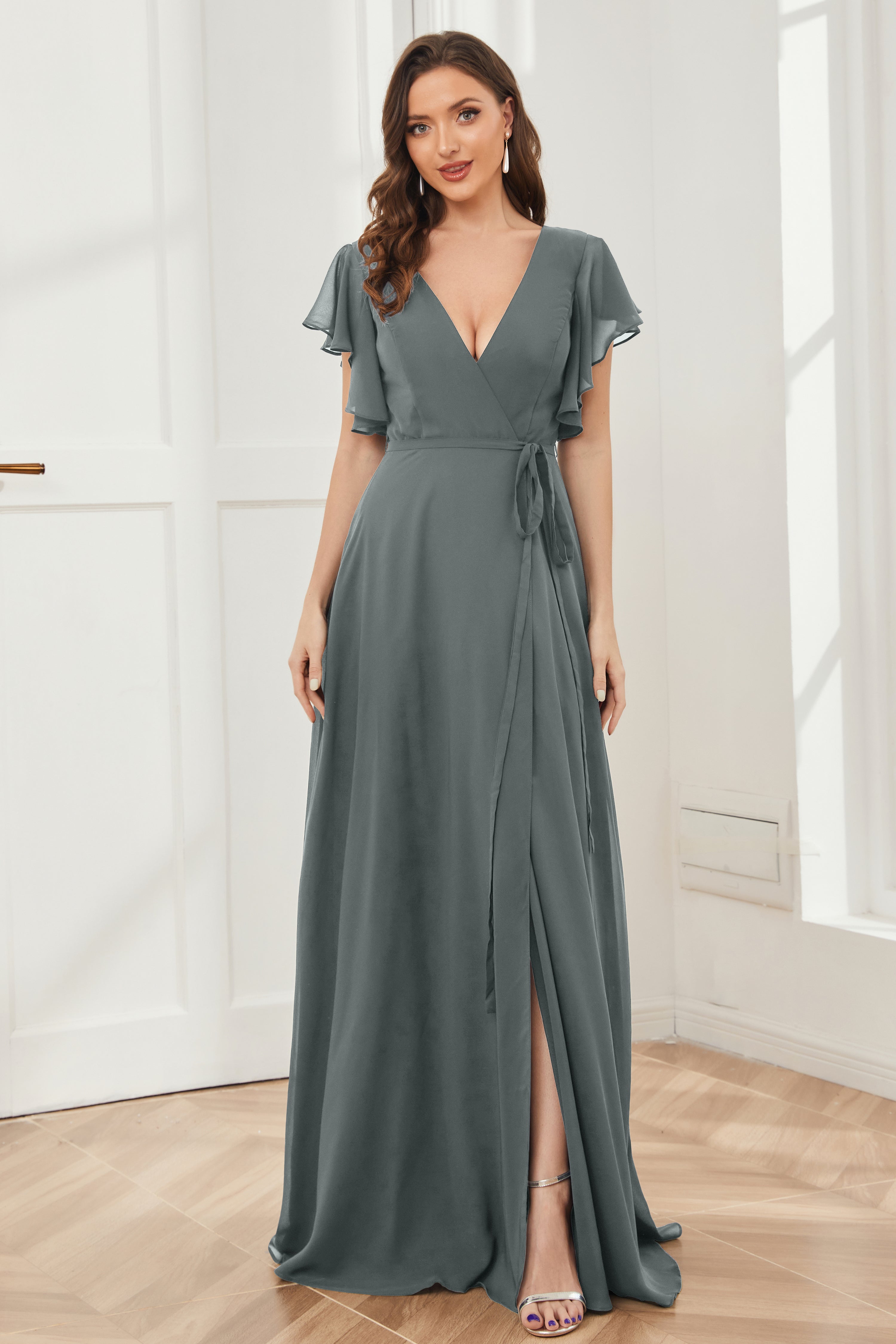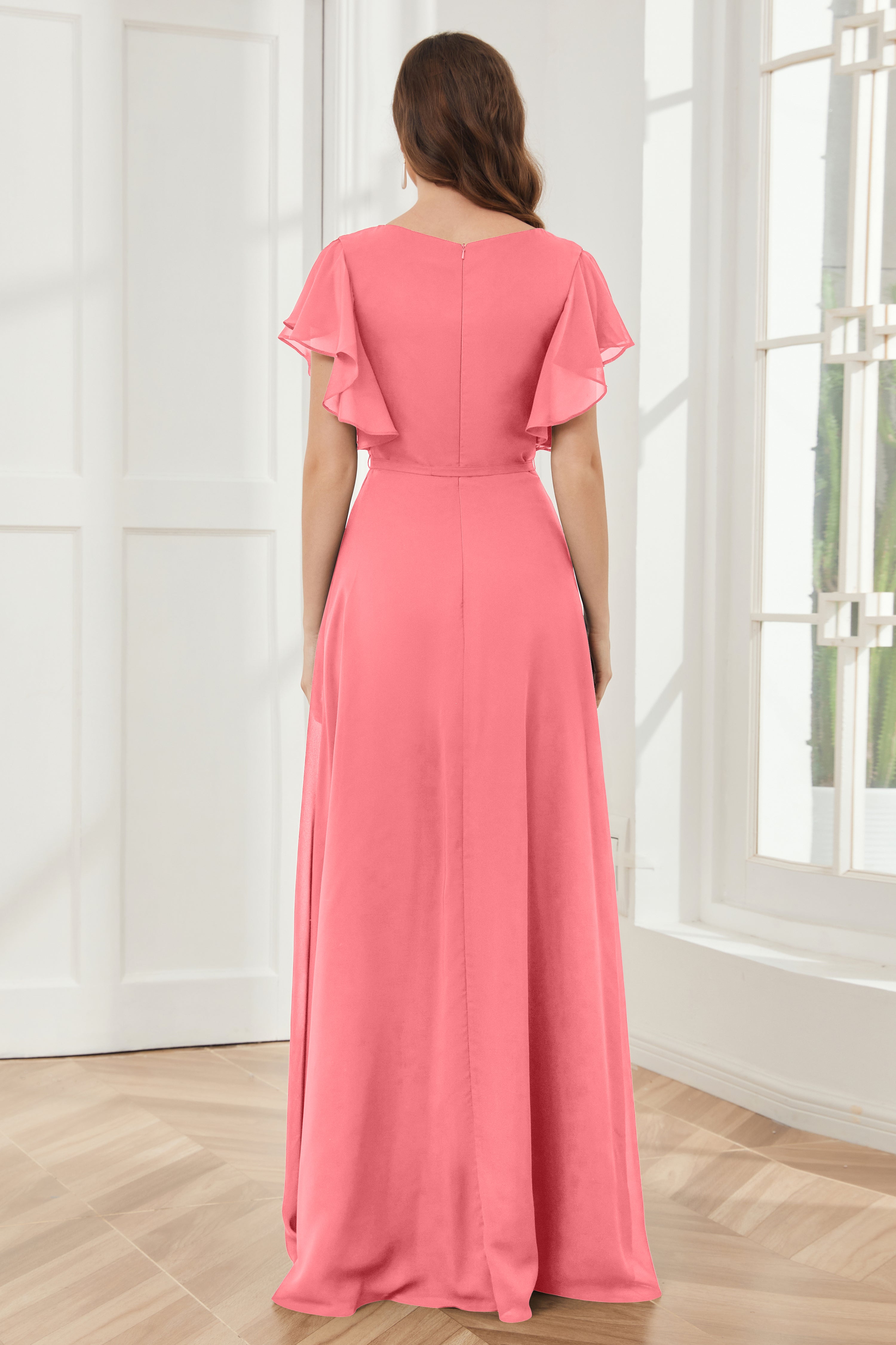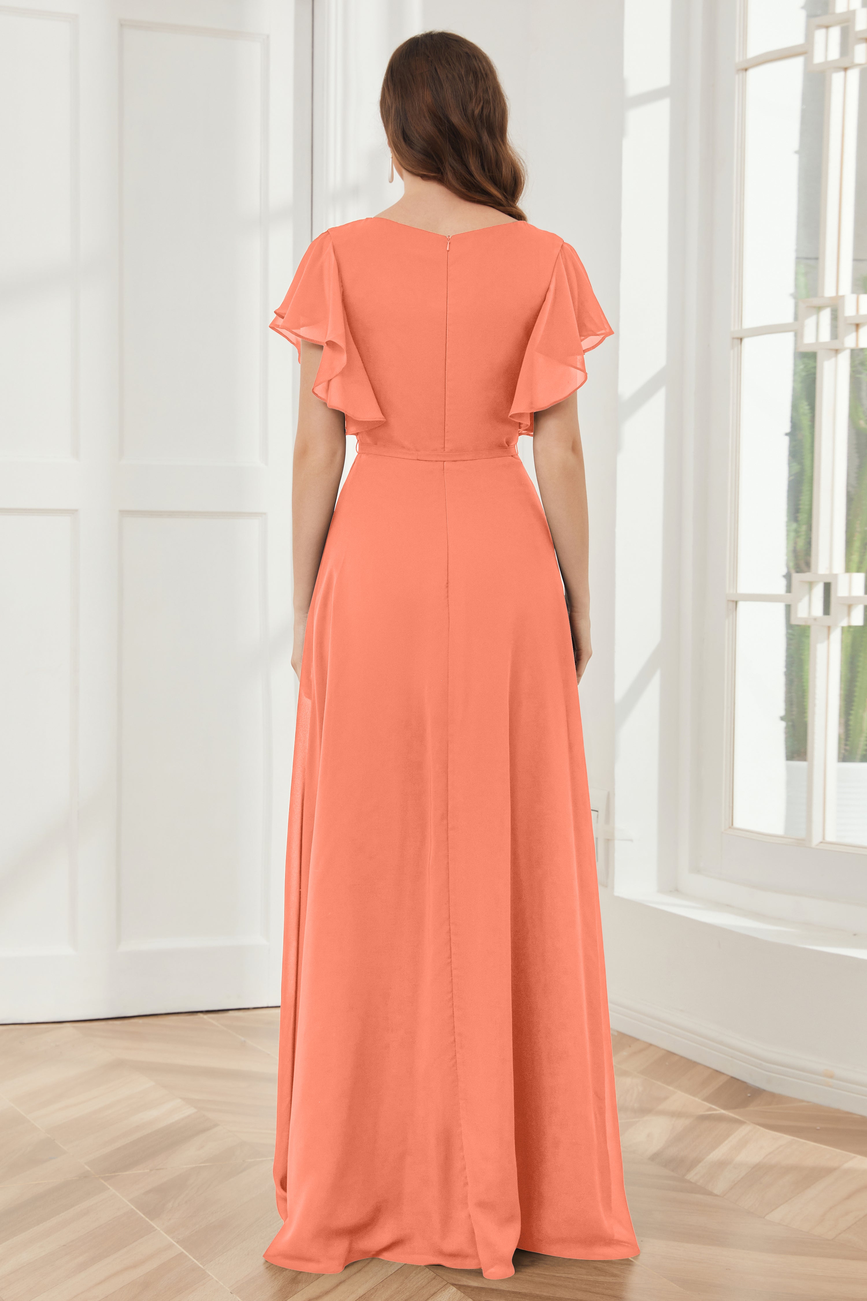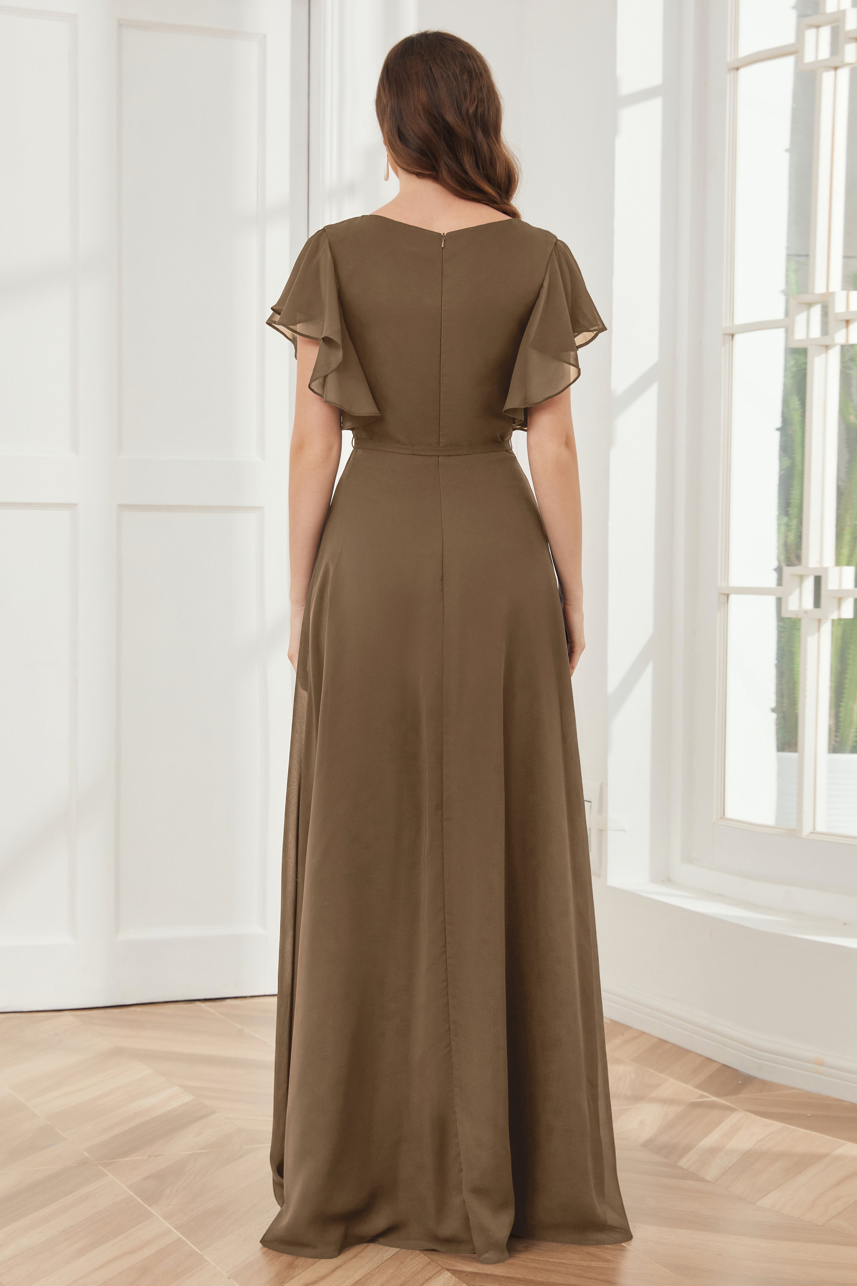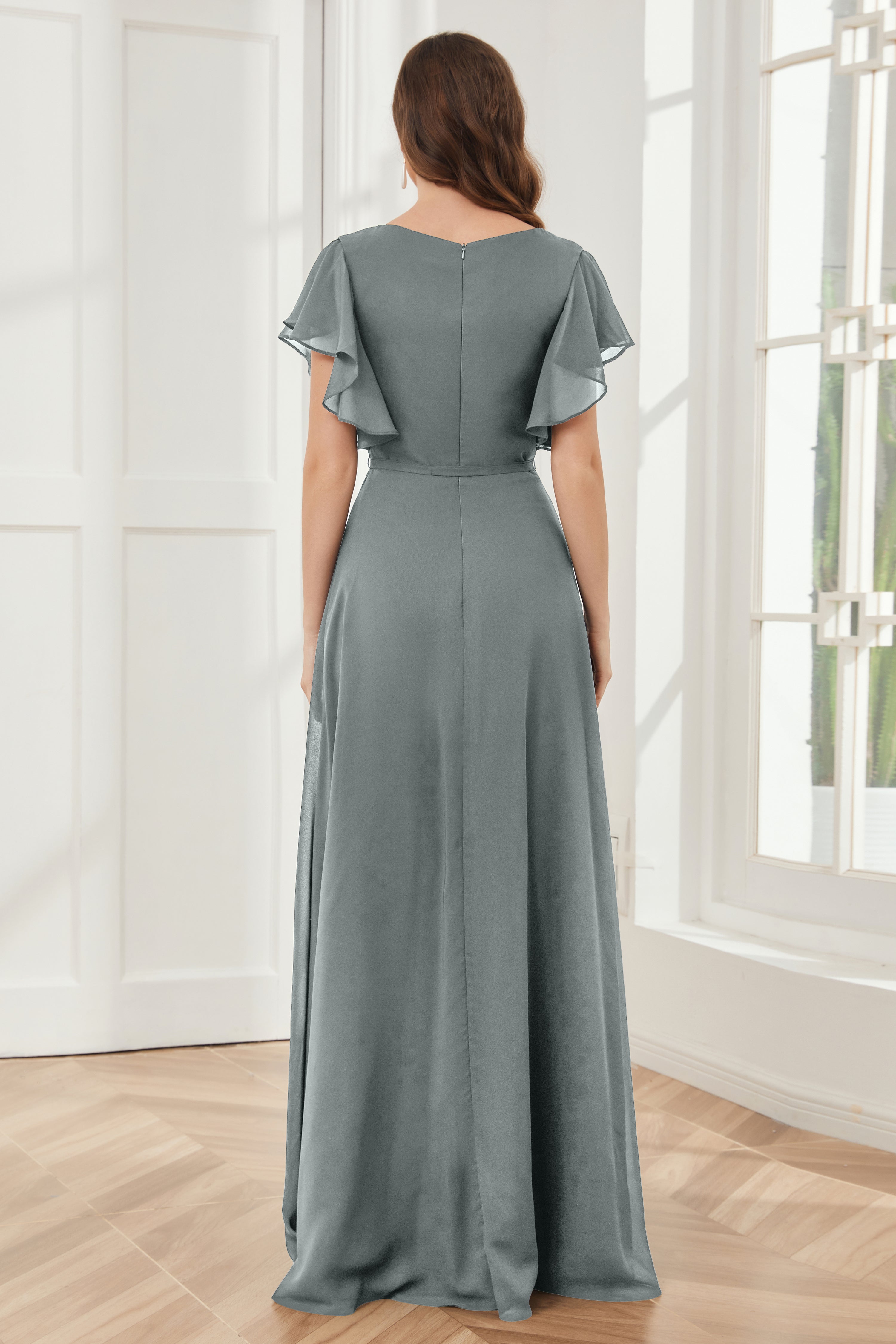 V-neck Ruffles Sleeves Chiffon Bridesmaid Dresses with Slit