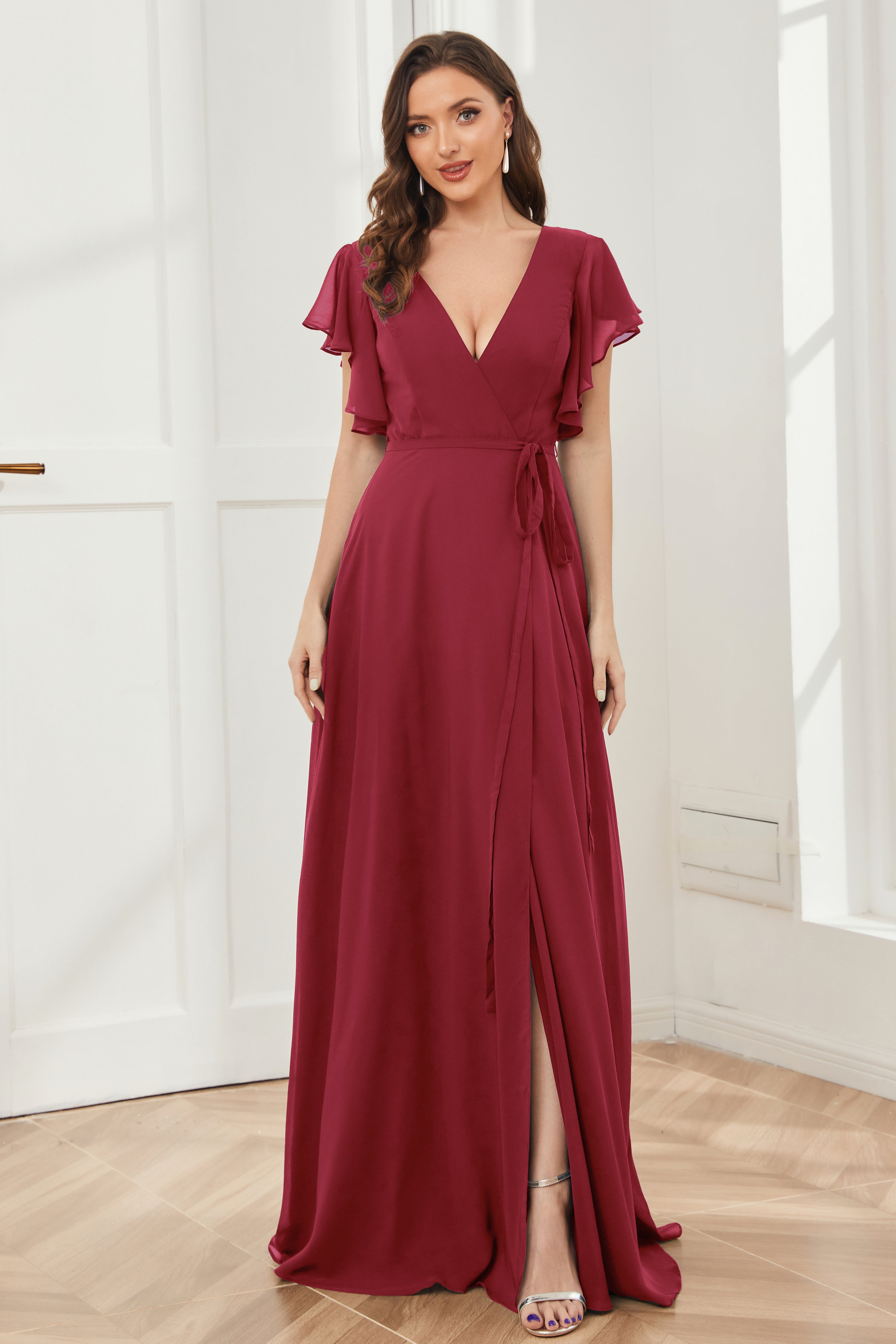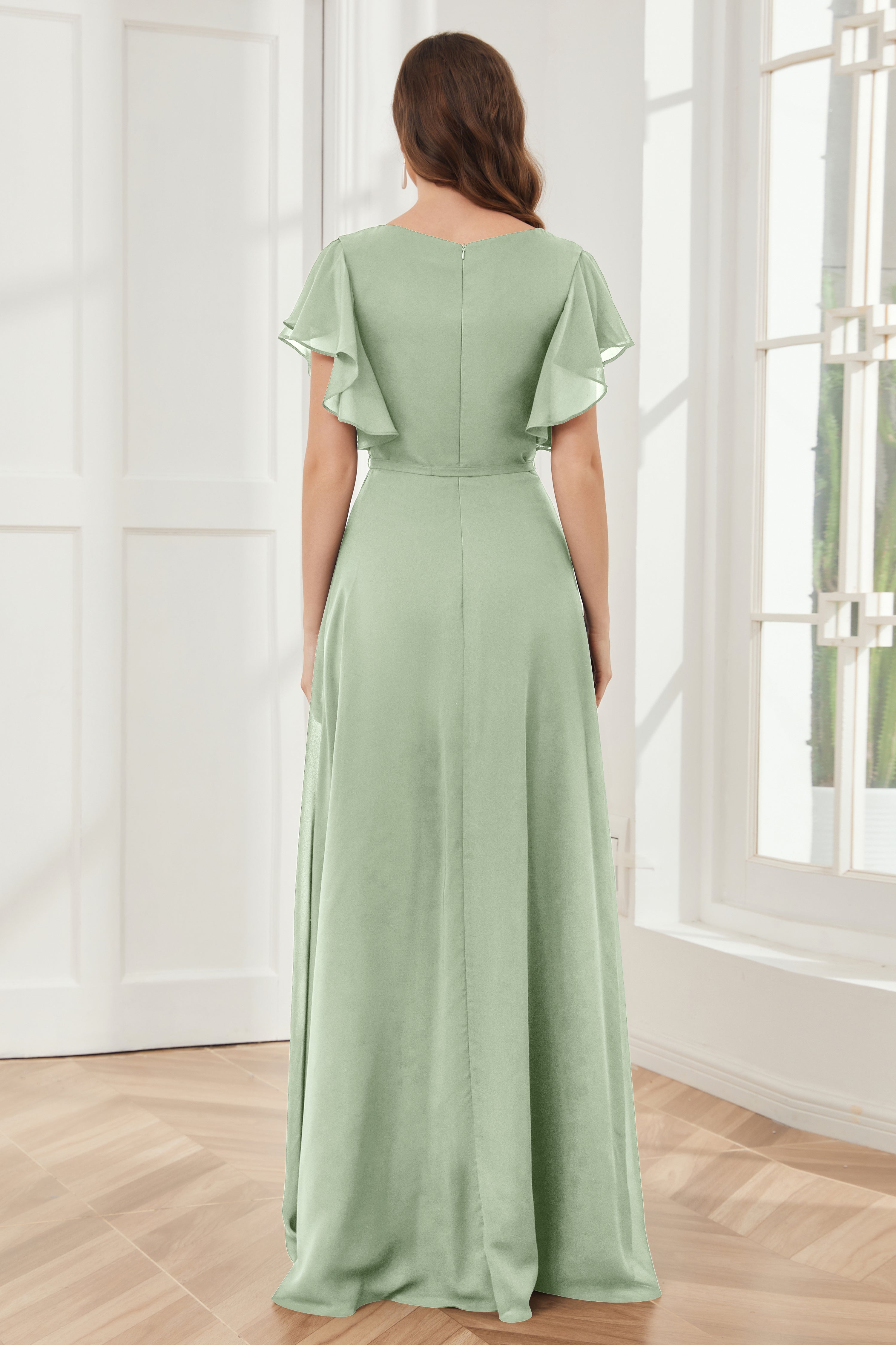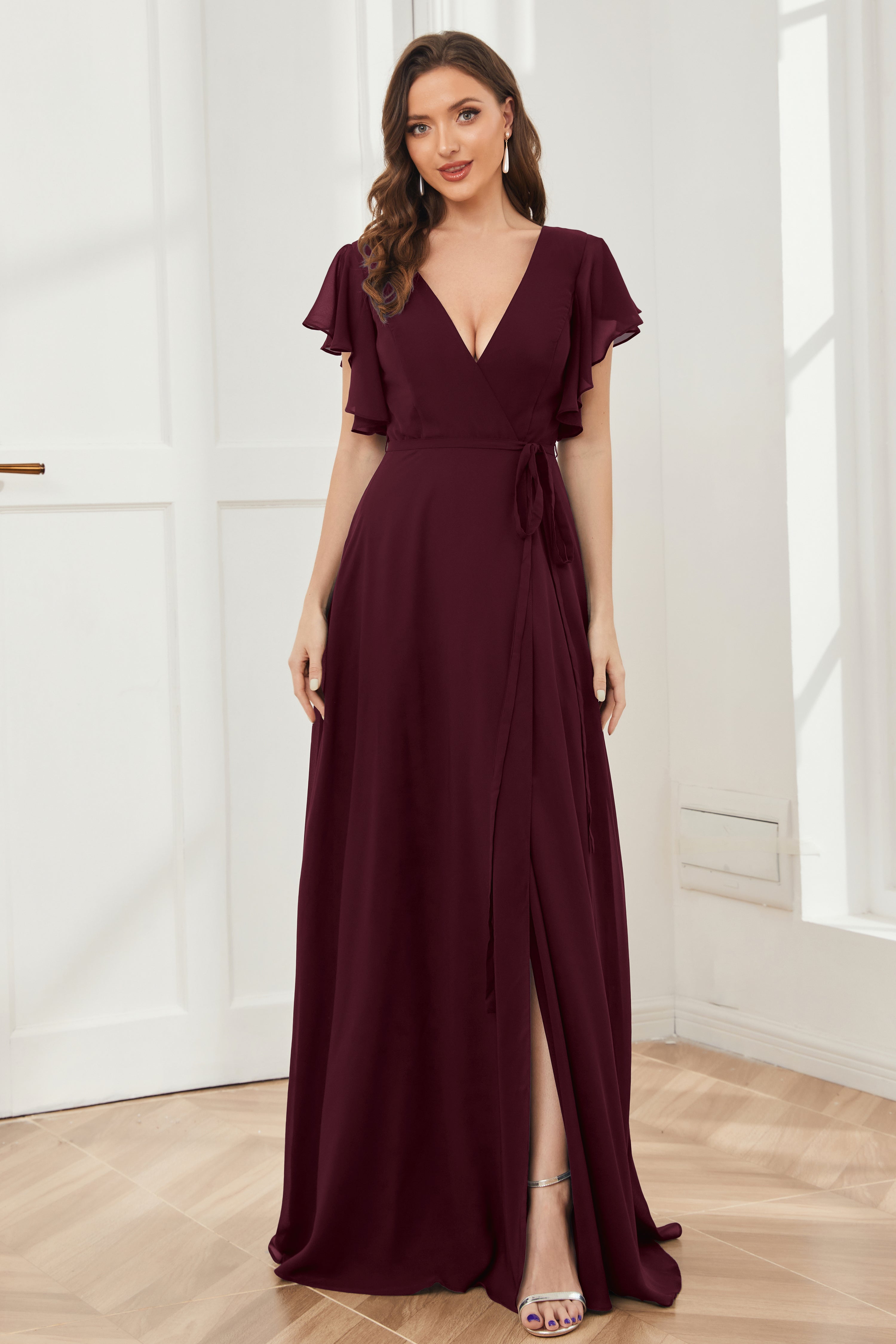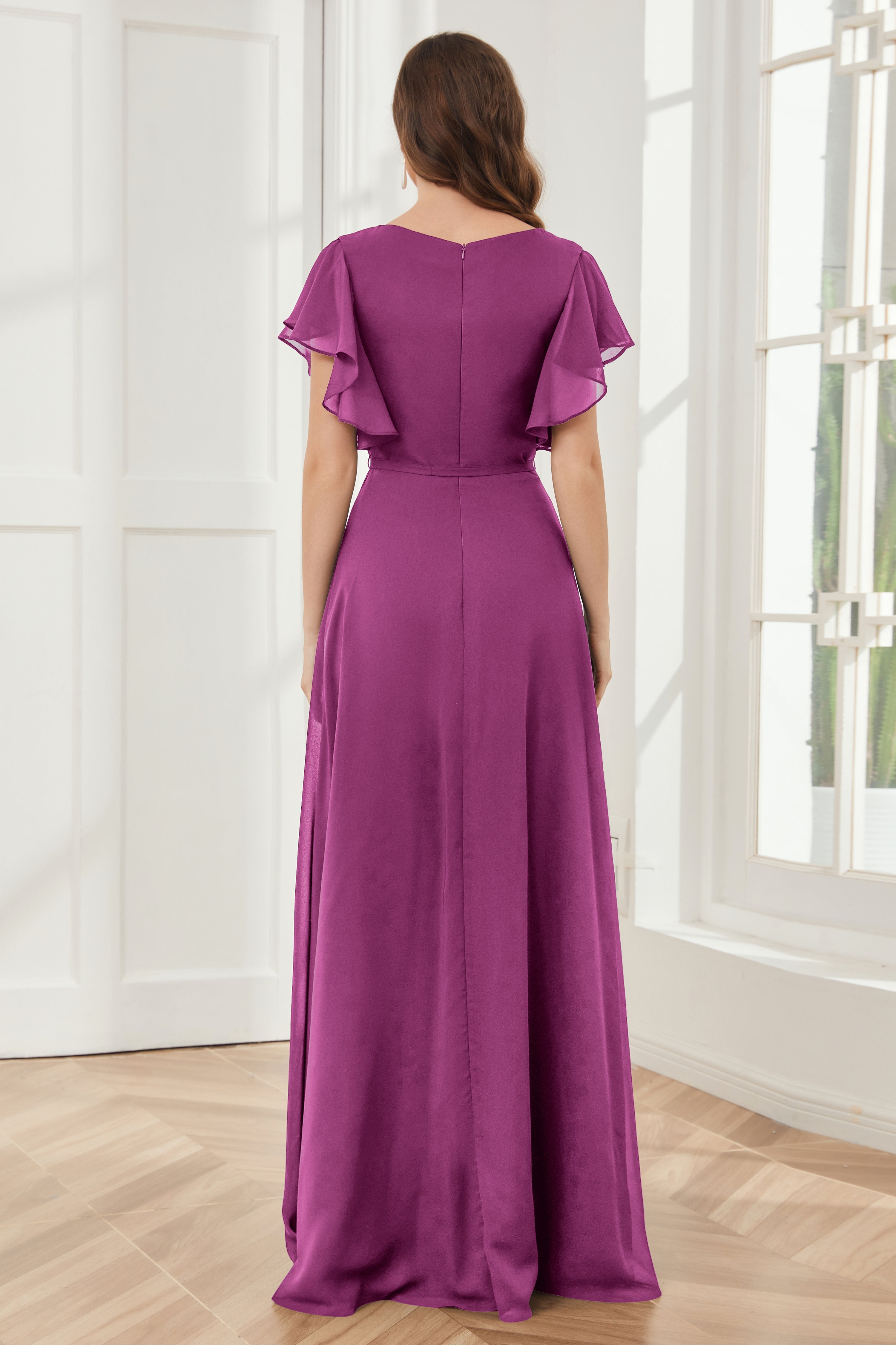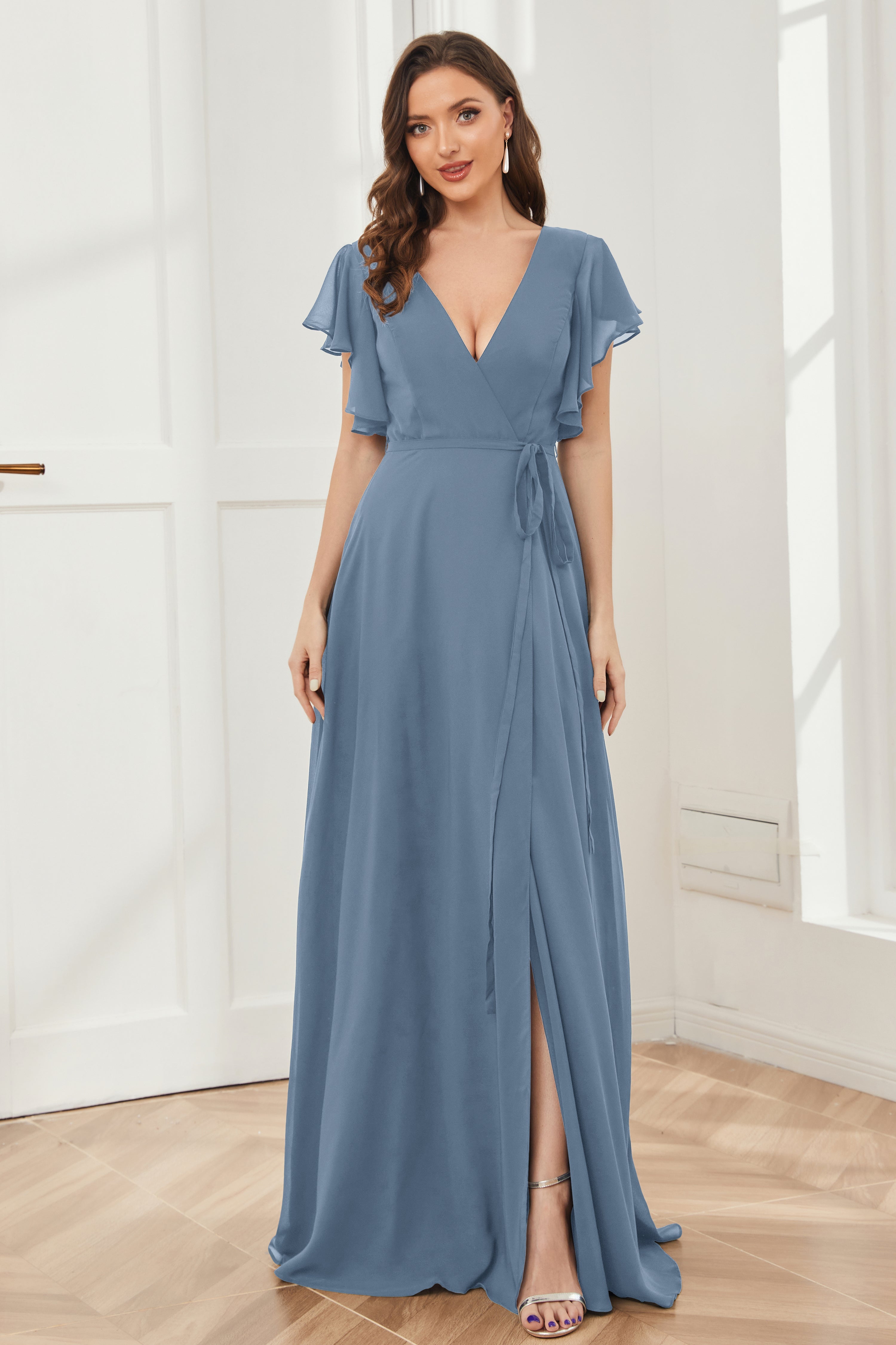 V-neck Ruffles Sleeves Chiffon Bridesmaid Dresses with Slit