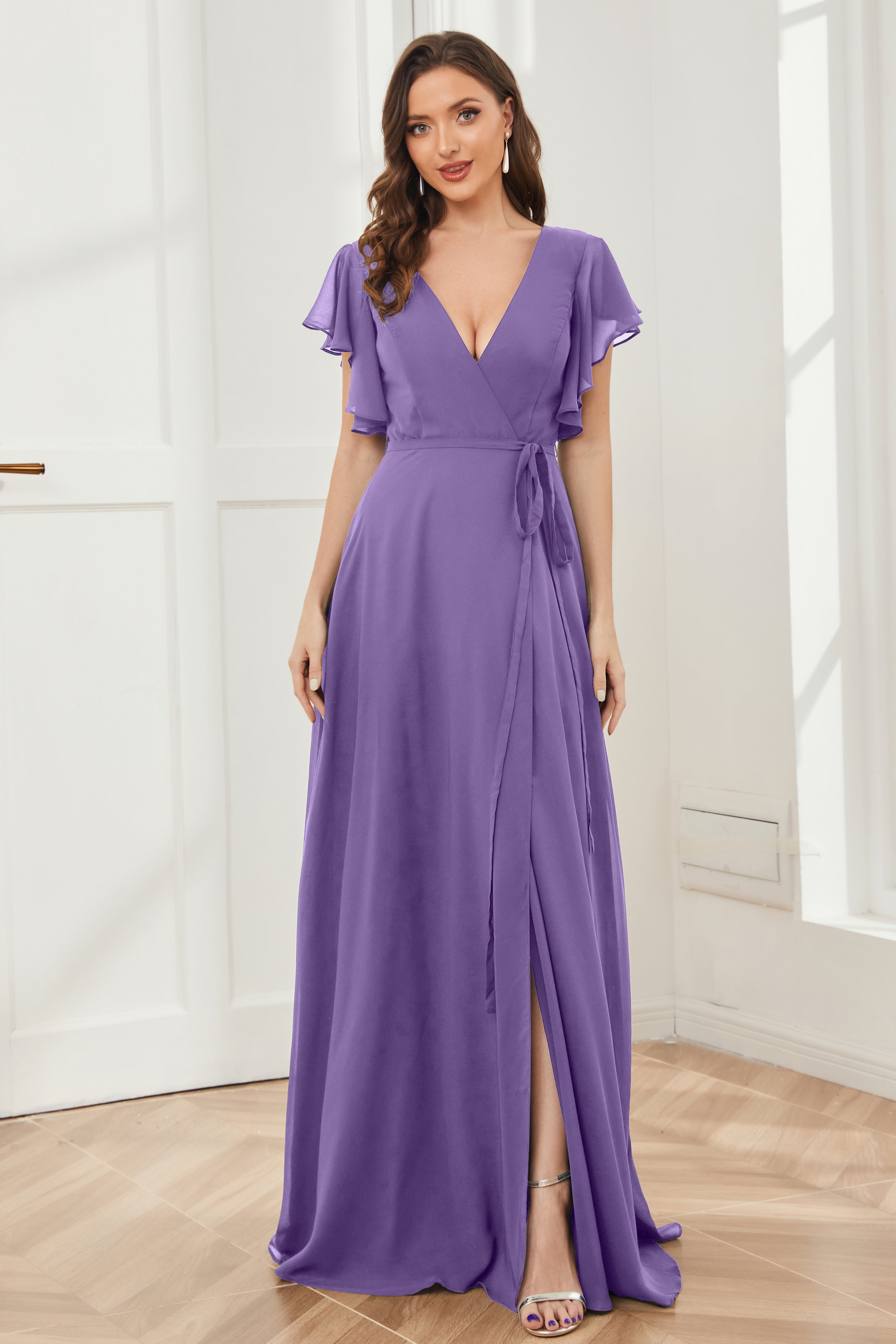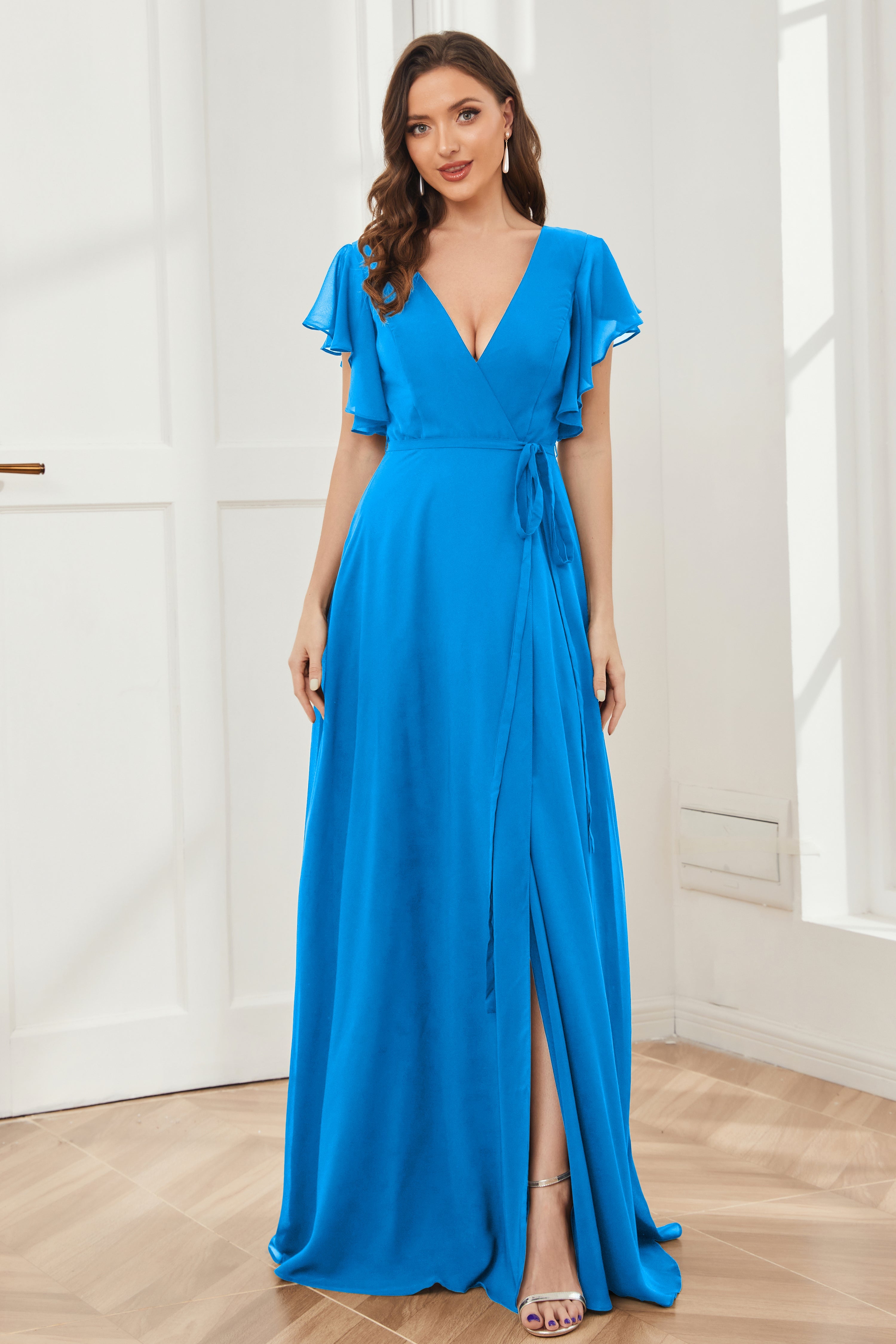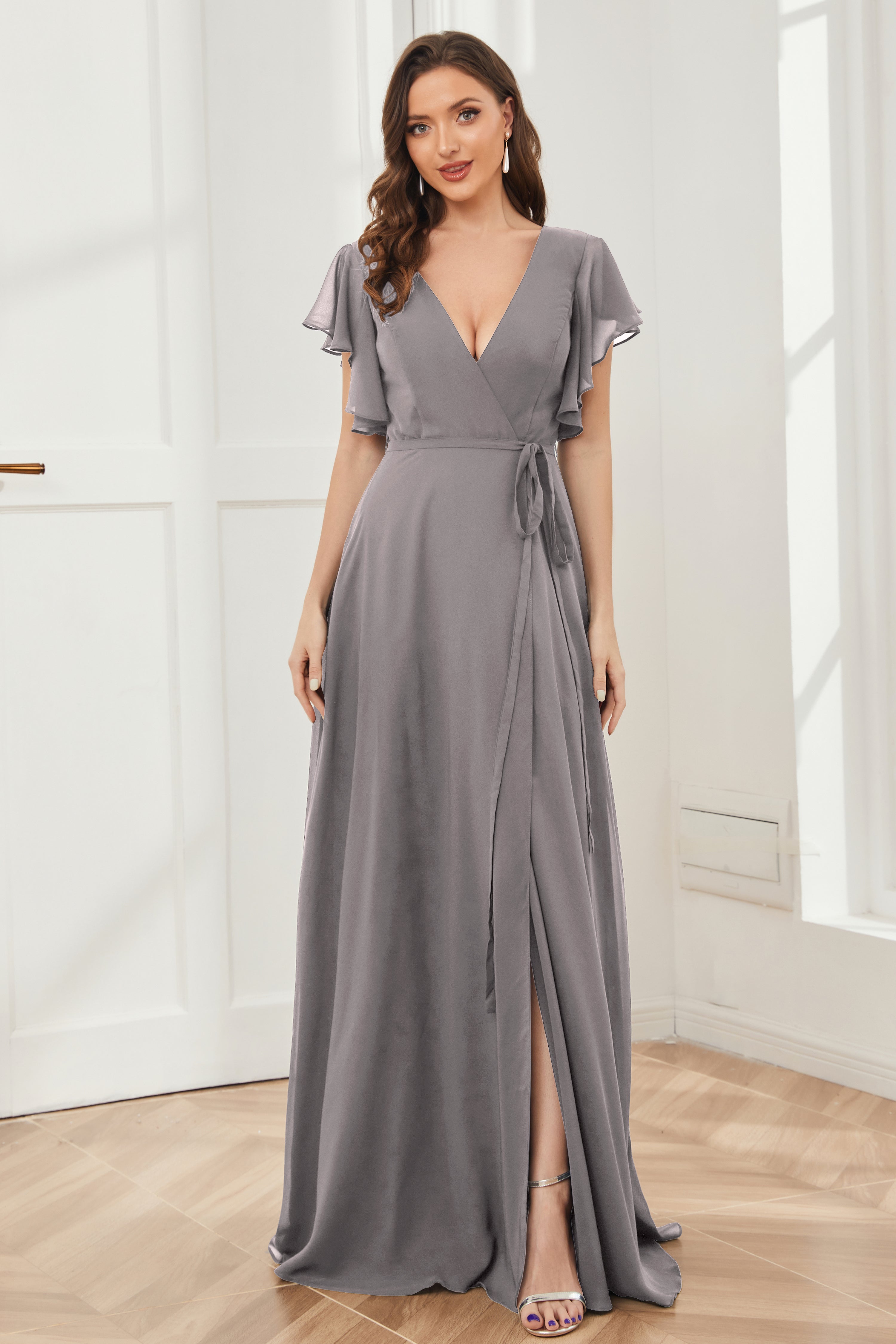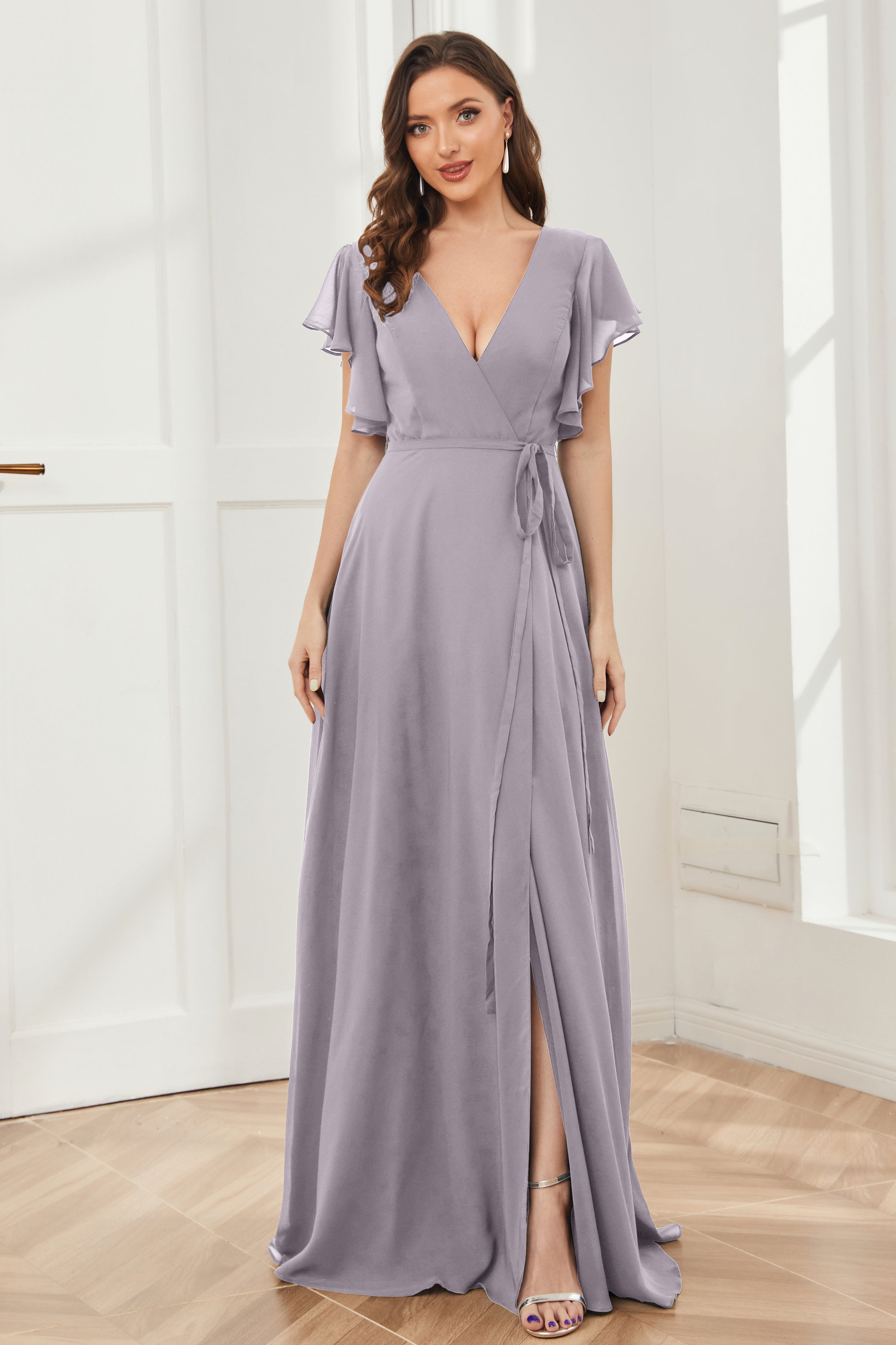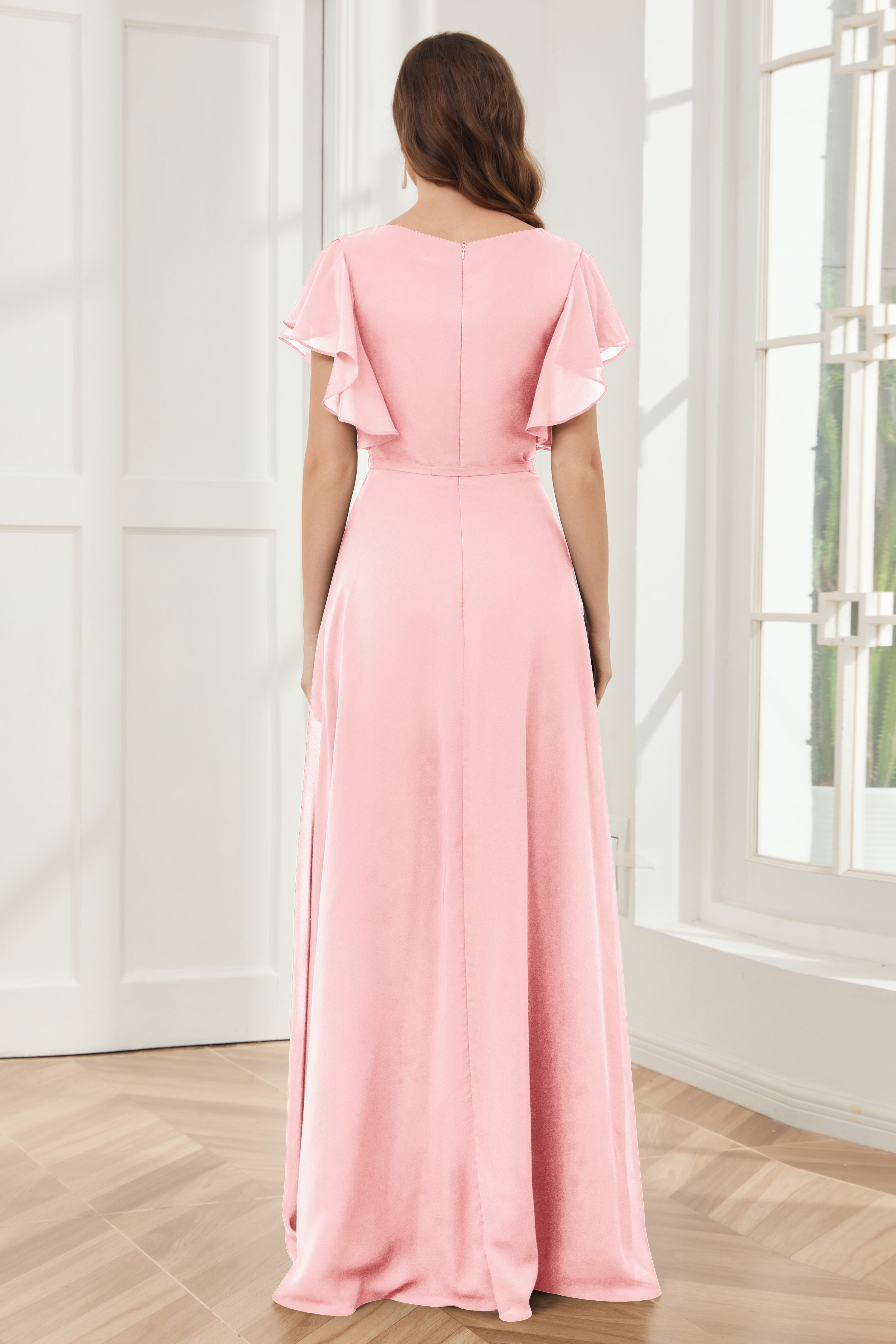 V-neck Ruffles Sleeves Chiffon Bridesmaid Dresses with Slit