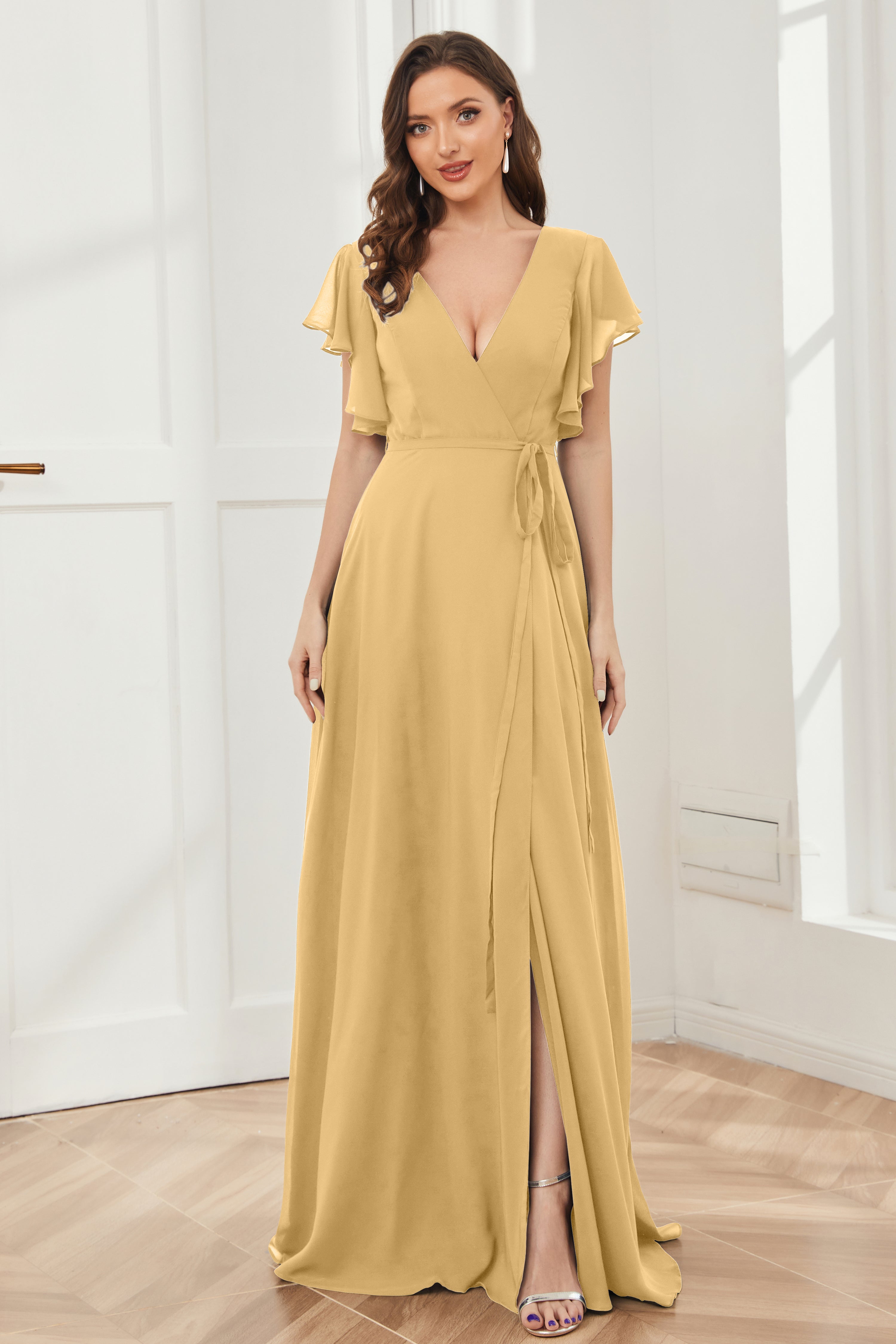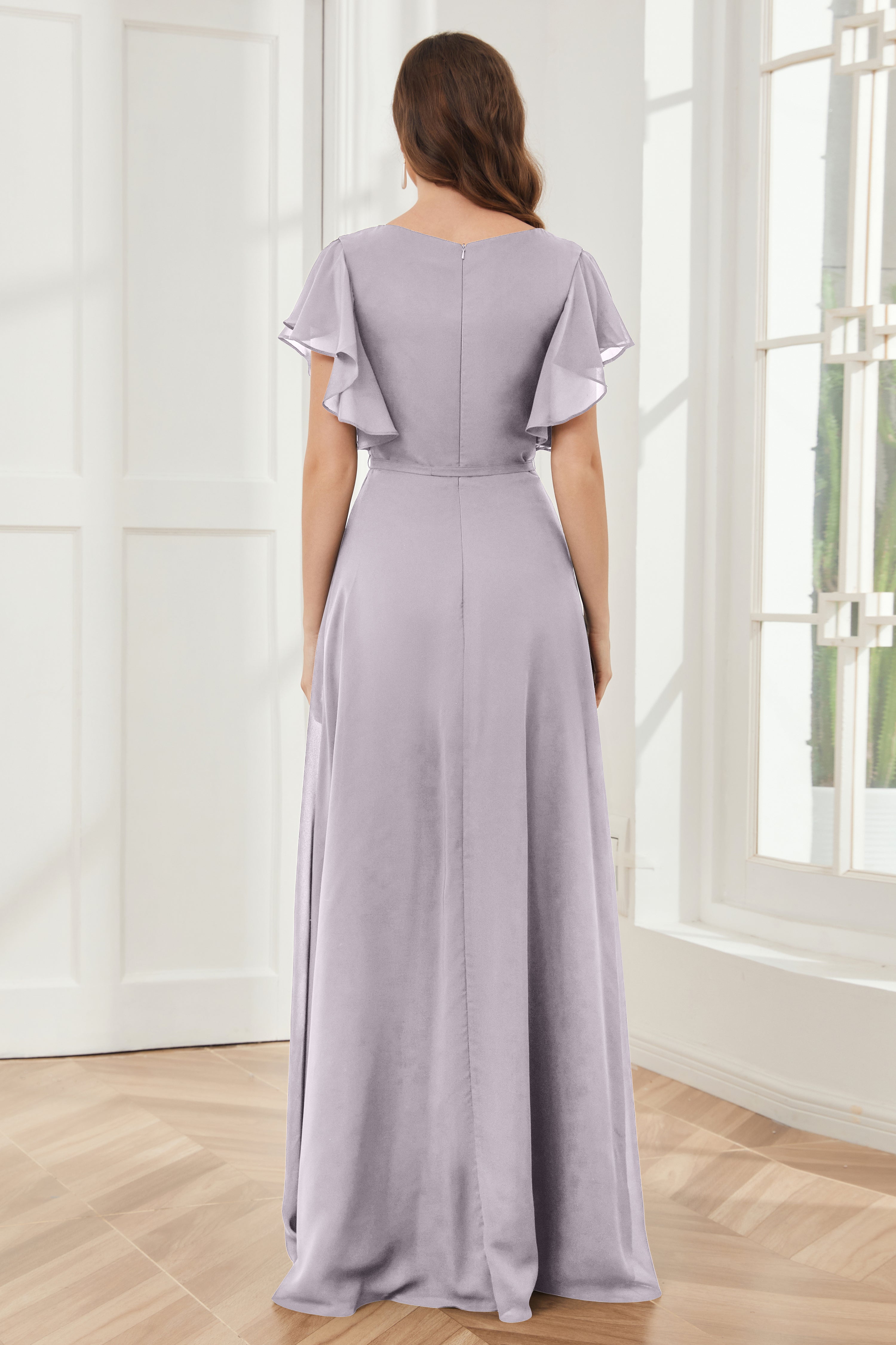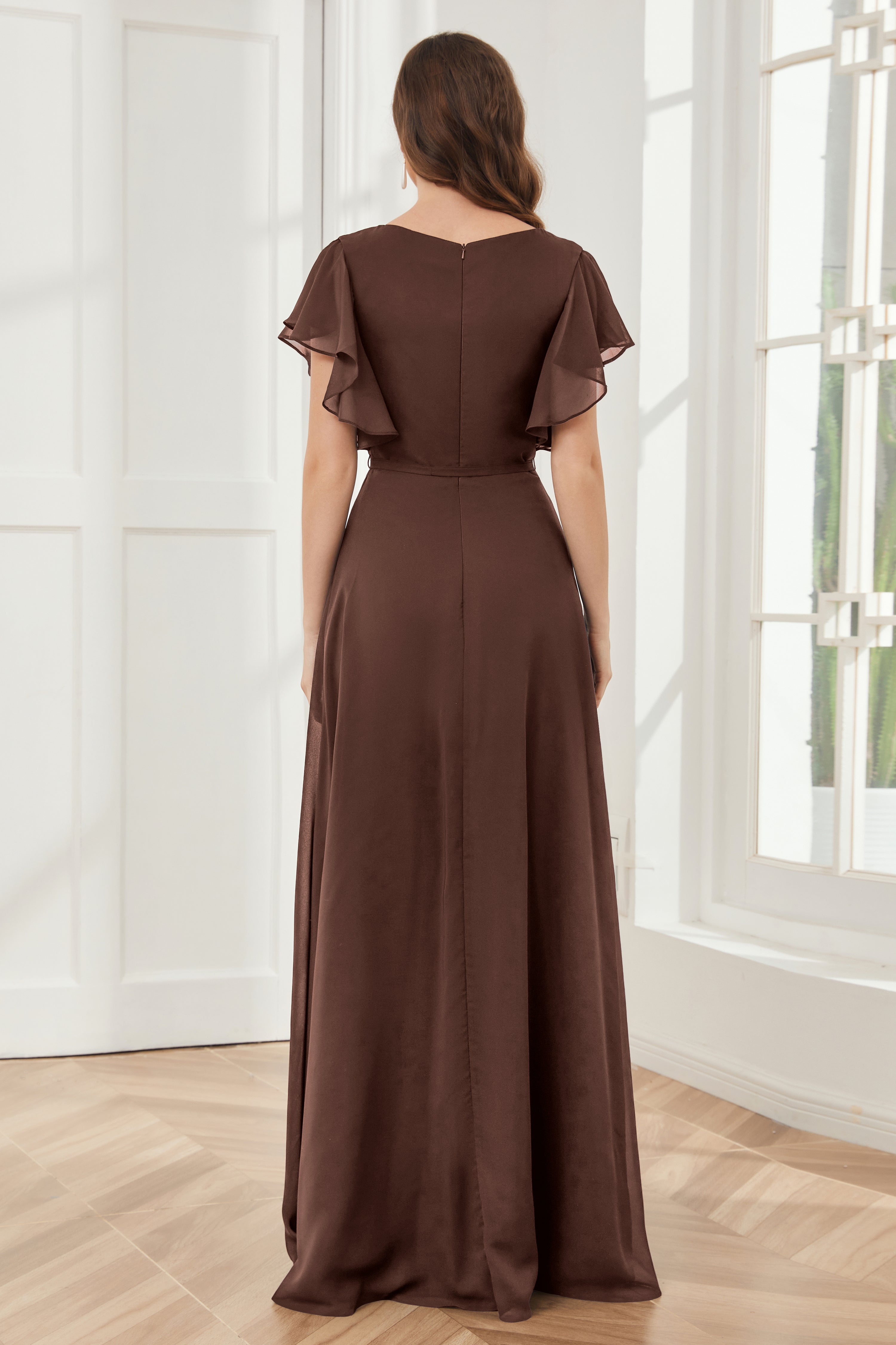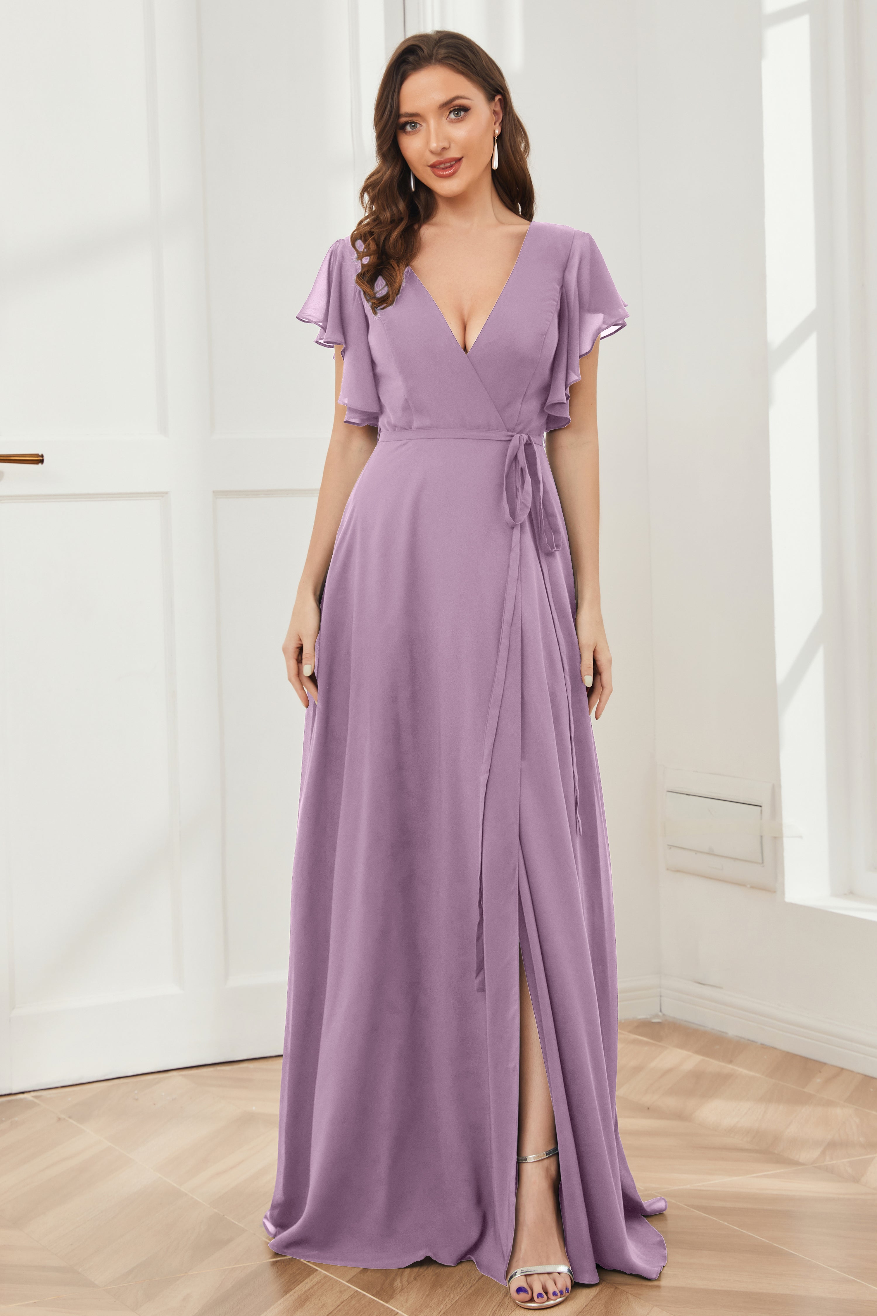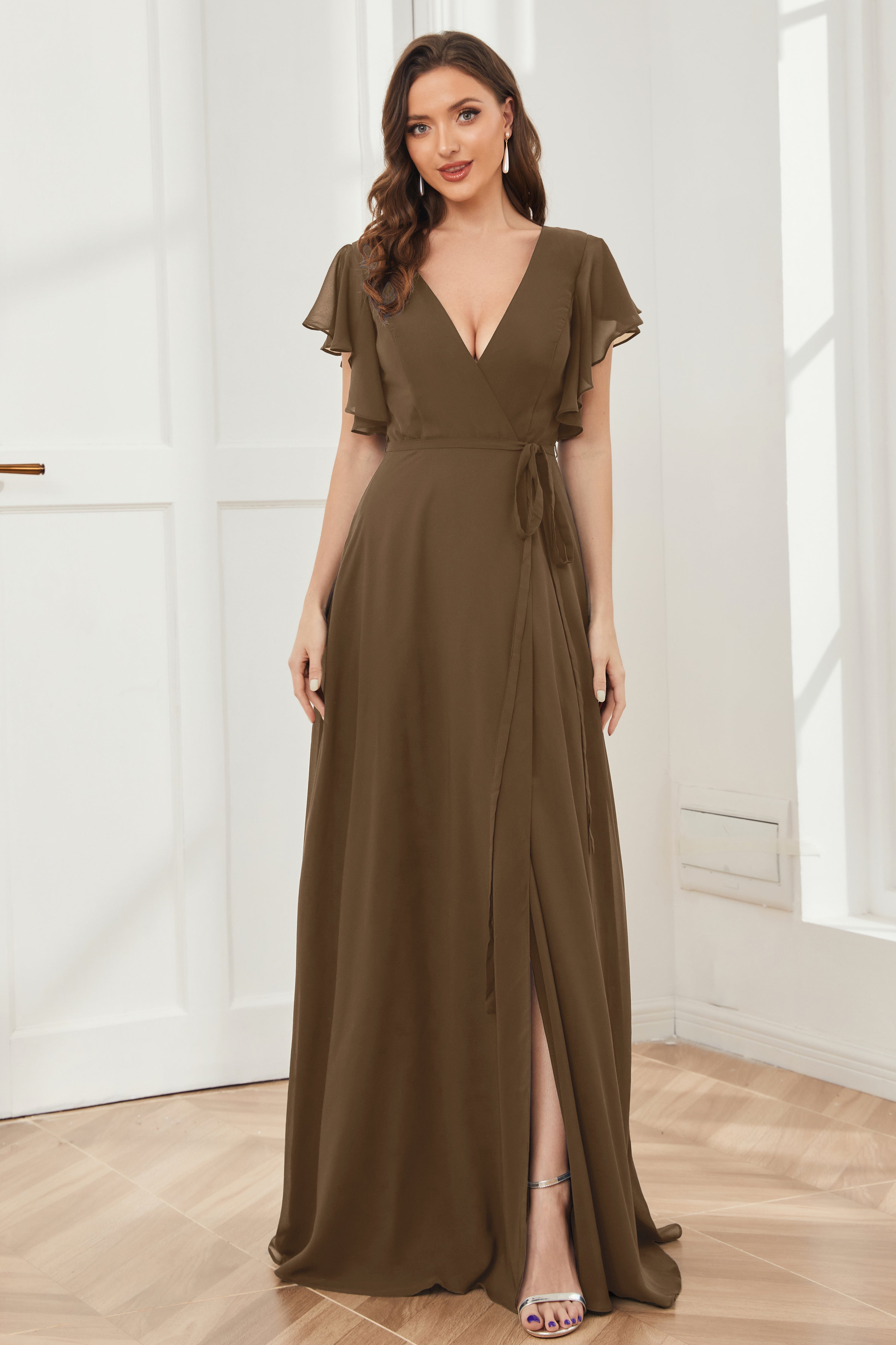 V-neck Ruffles Sleeves Chiffon Bridesmaid Dresses with Slit