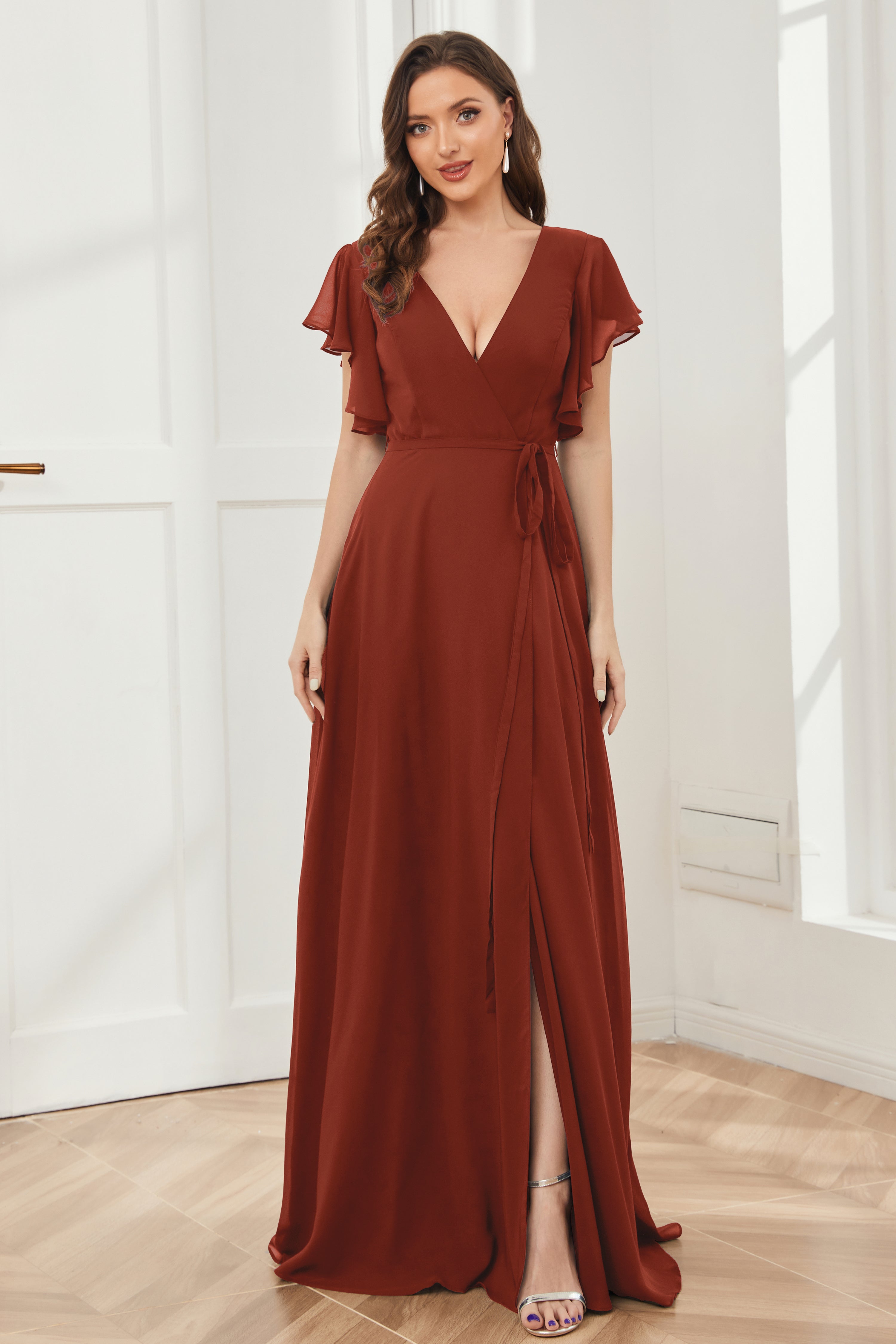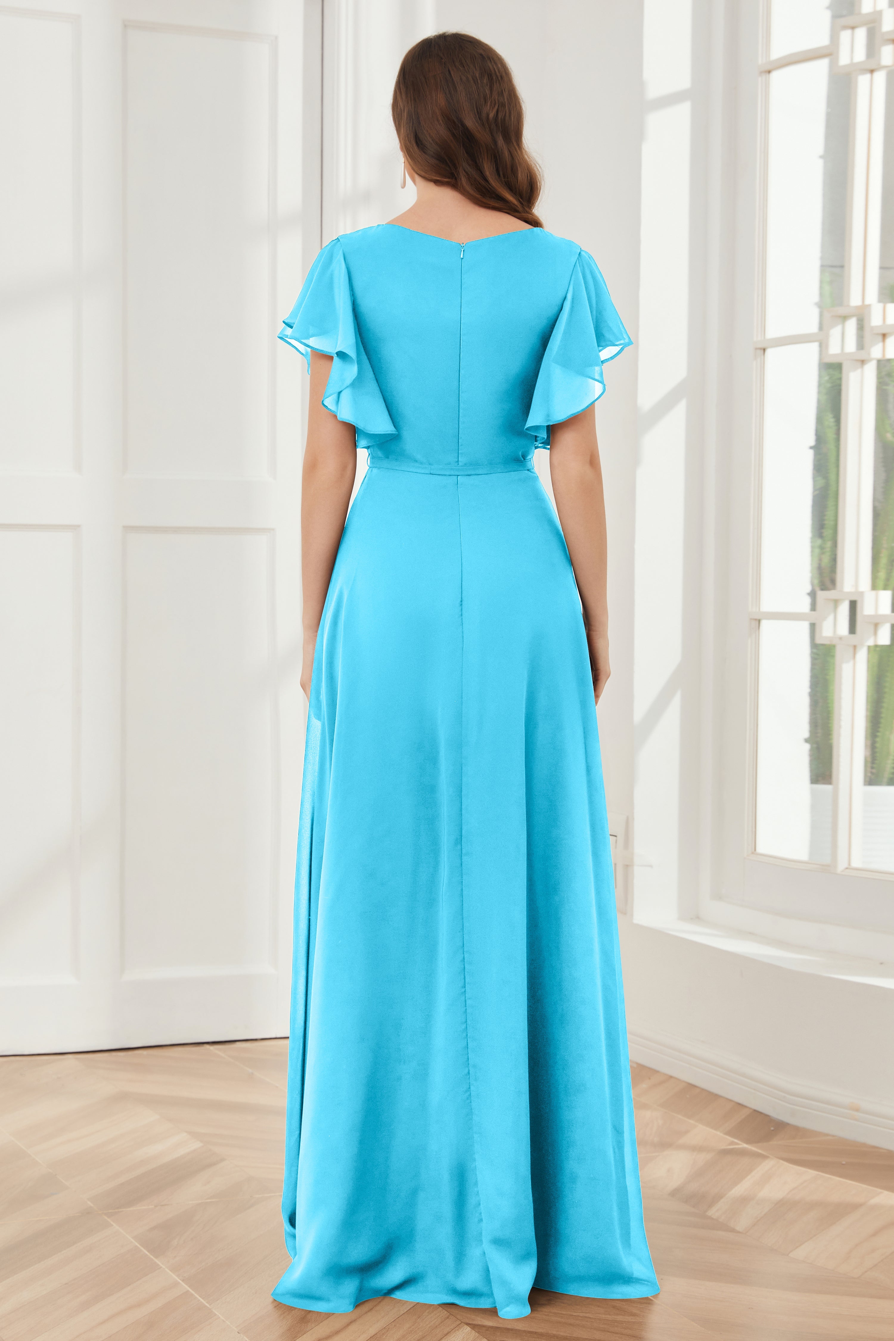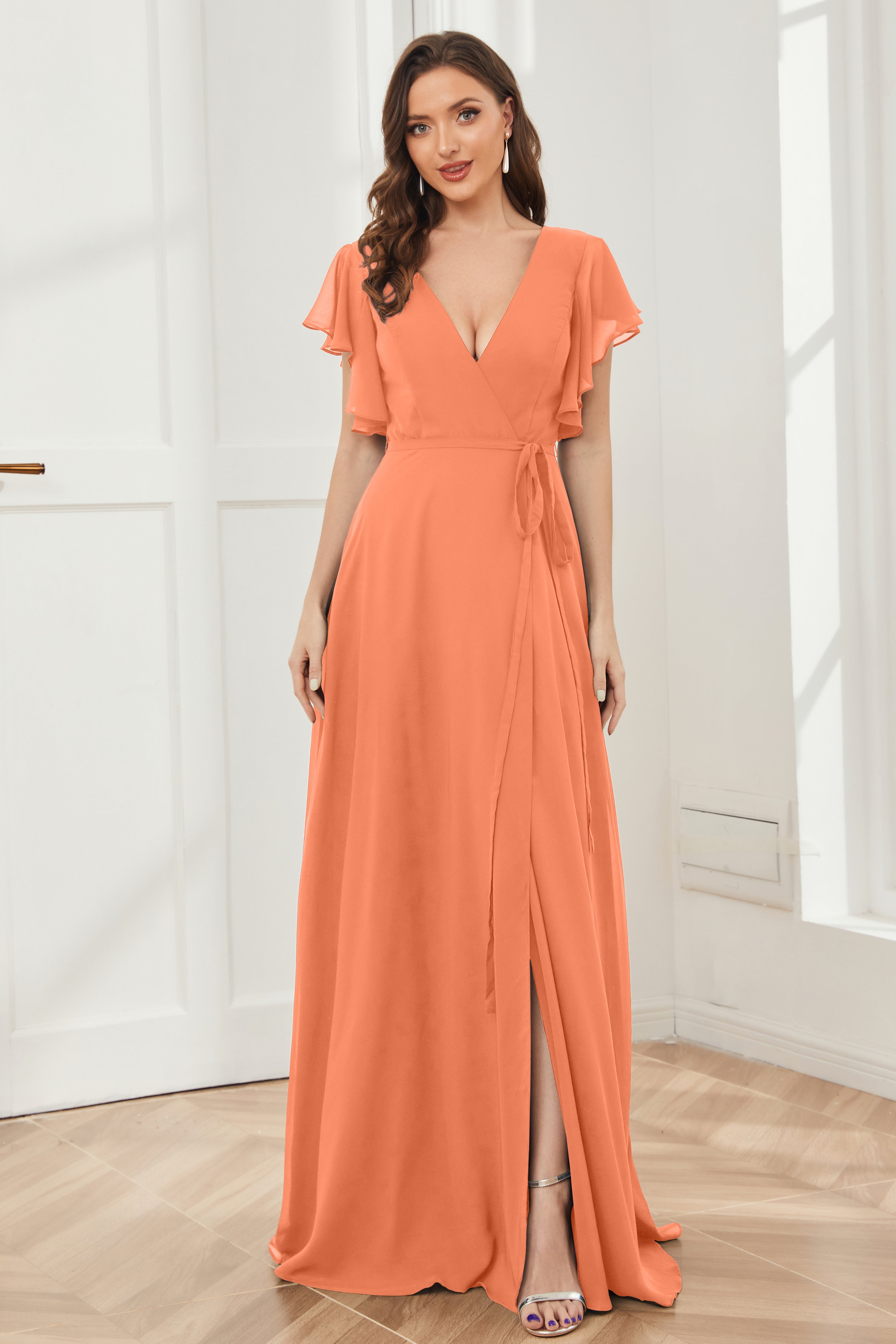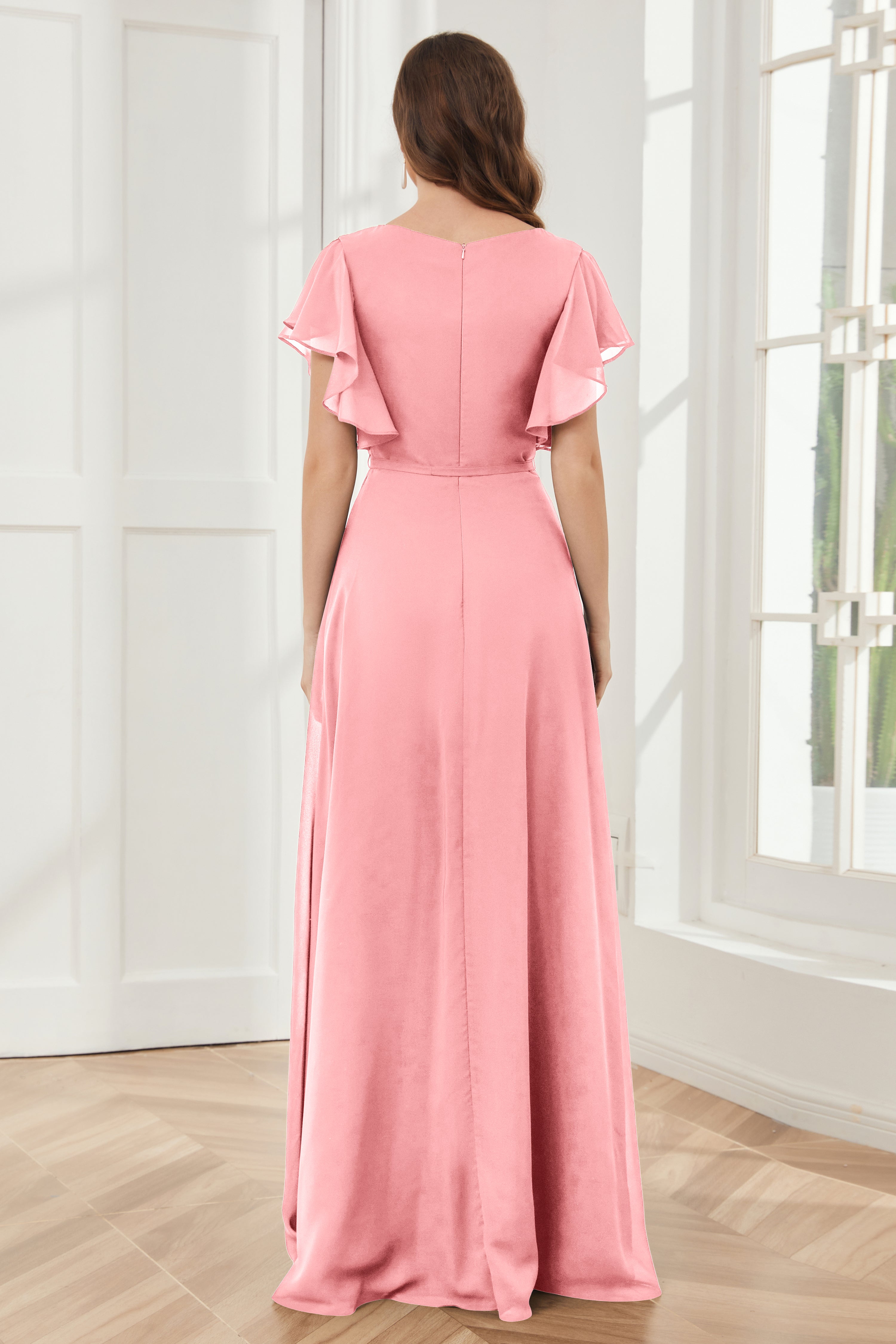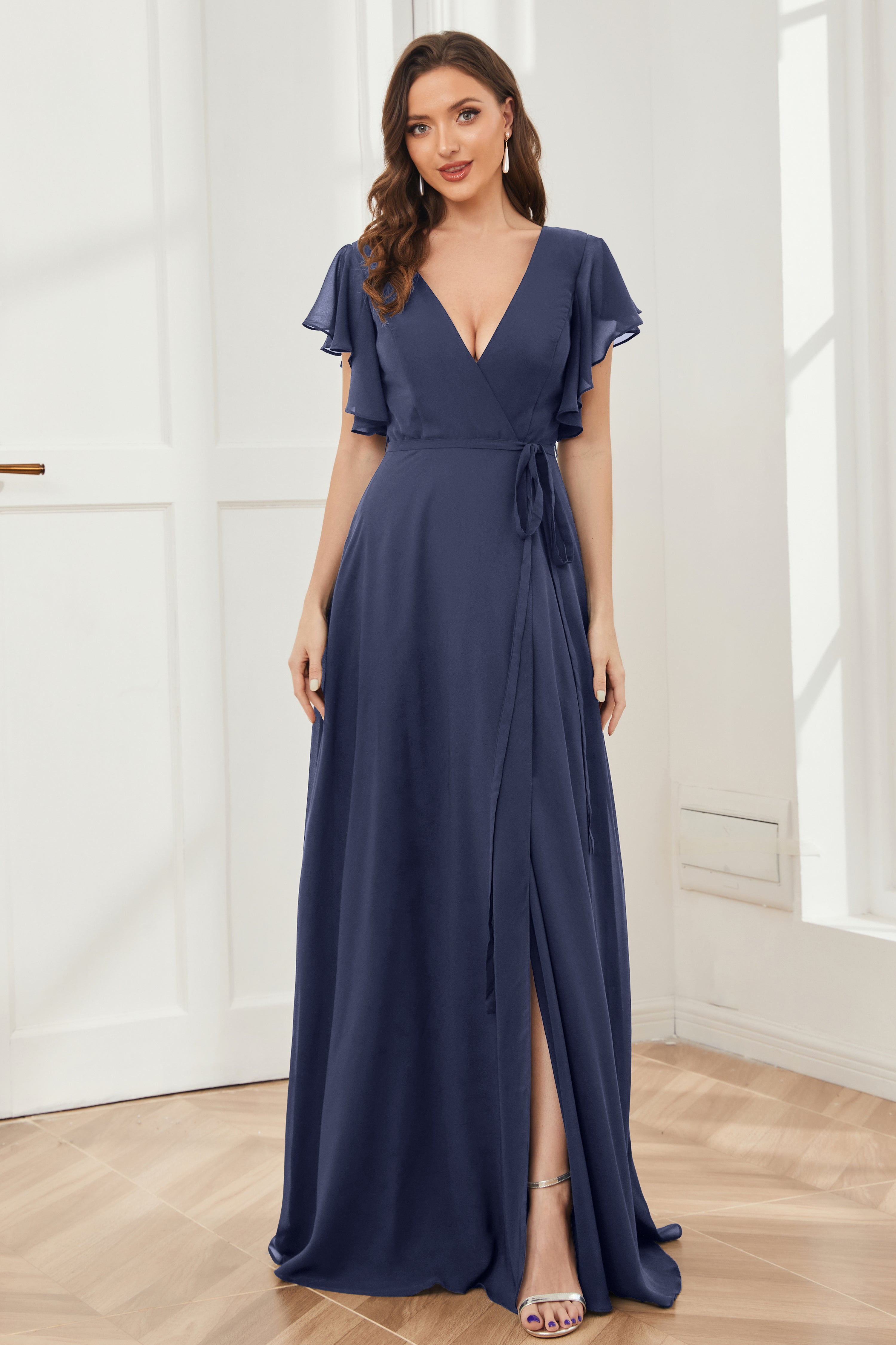 V-neck Ruffles Sleeves Chiffon Bridesmaid Dresses with Slit